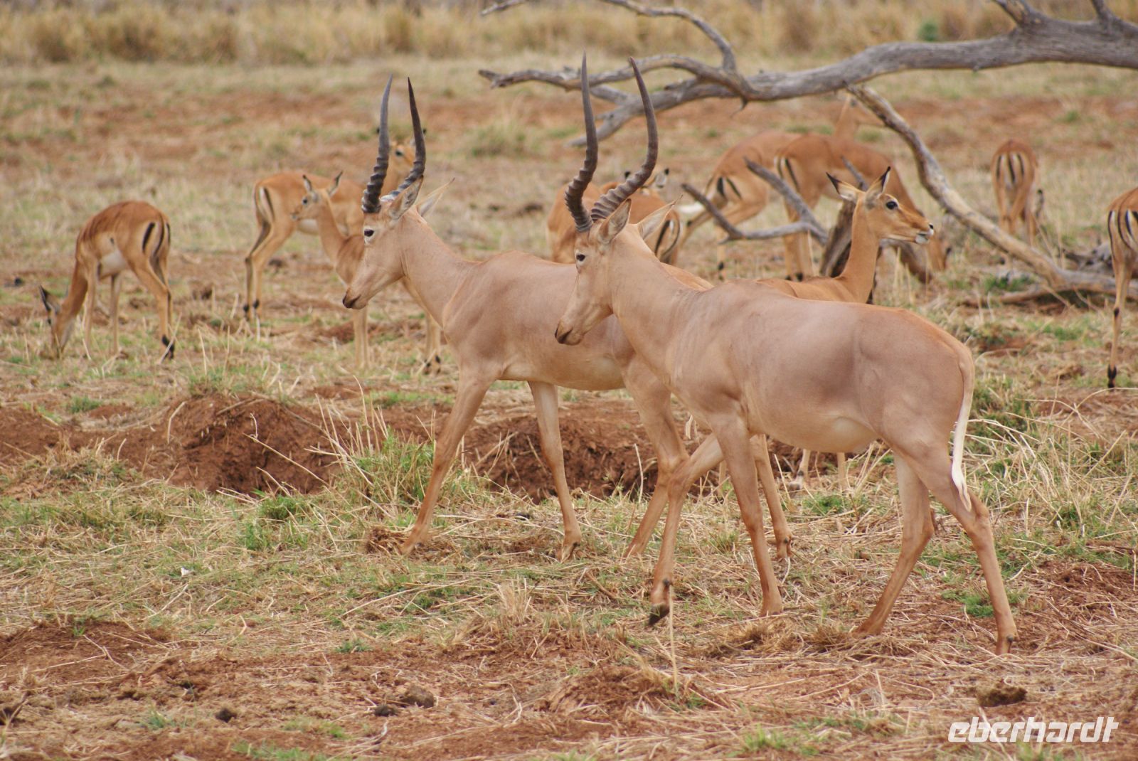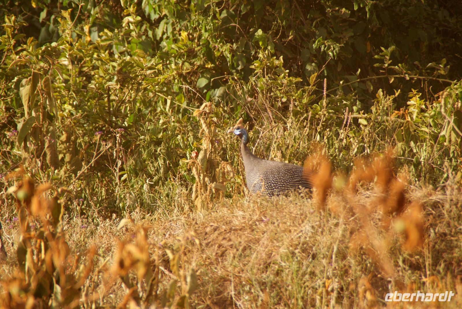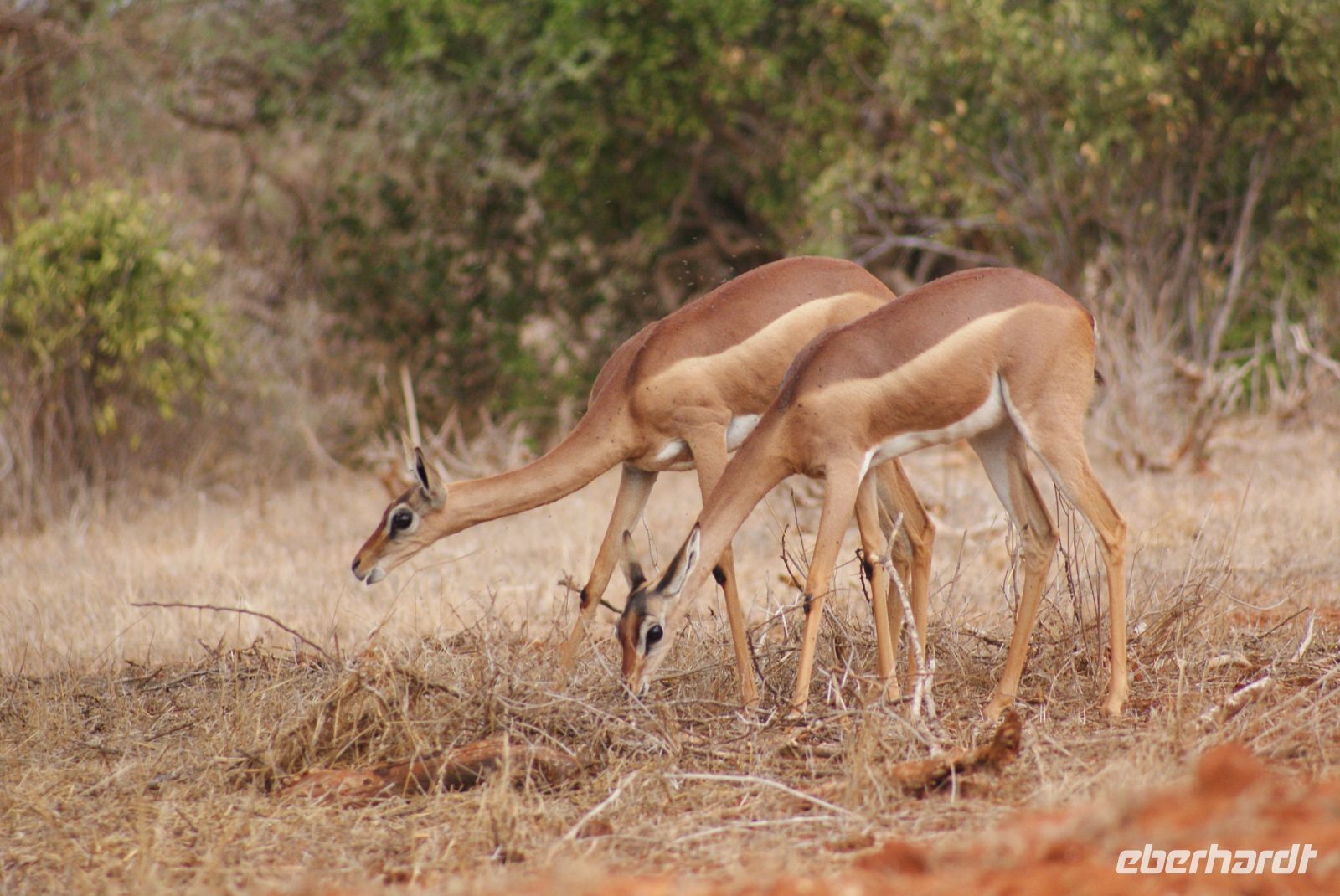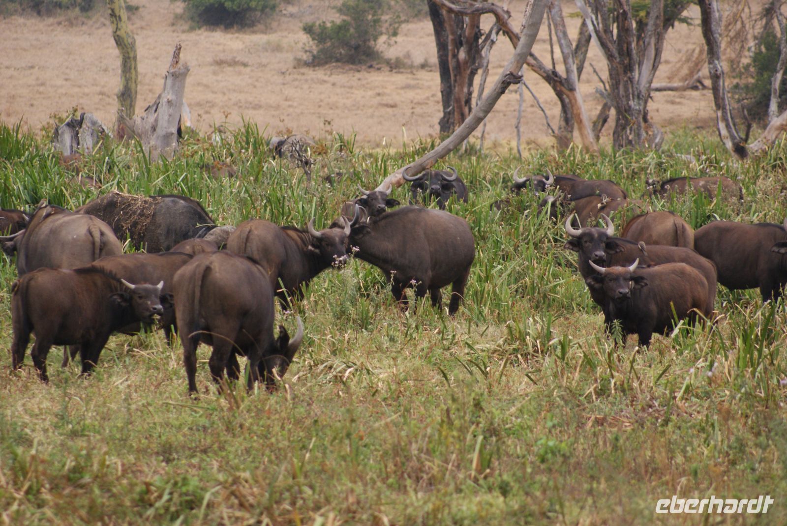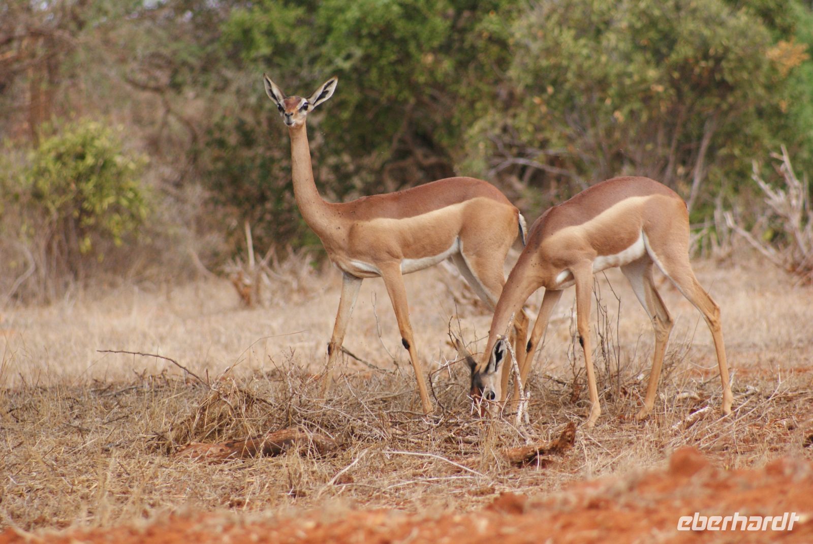 Nach einer unerwartet ruhigen Nacht (kaum Tiere am Wasserloch) und einem guten Frühstück, verlassen wir nur sehr ungern dieses afrikanische Paradies. Ein letztes Mal lassen wir den Blick auf dieses unglaubliche Panorama schweifen. Am Wasserloch finden sich nun nach den Marabus die ersten Zebras und Perlhühner ein. Bevor die Elefantenherden eintreffen, ziehen wir lieber schnell weiter, da wir diesen Platz hier sonst nicht mehr verlassen möchten. Die heutige Tour führt uns zum 12.000 Km² großen Tsavo Ost Nationalpark, der gemeinsam mit Tsavo West den größten Nationalpark Kenias bildet. West und Ost trennt nur eine Transitstraße, die größtenteils ohne Zaun verläuft. Daher sehen wir am Straßenrand so manches Elefanten-Warnschild, was auf die frei laufenden Kolosse hinweist. Tsavo wurde 1948 gegründet und ein Jahr später in West und Ost geteilt. Wir finden nun ein wiederum anderes Landschaftsbild vor. Die Hügellandschaft von West weicht inzwischen wieder einer weiten Savanne mit herrlichen Schirmakazien und teils ebenfalls roter Erde. Nachdem wir die quirlige Stadt Voi mit gleichnamigem Gate passiert haben, hat uns die Natur wieder und schon kurz darauf, werden wir von der ersten Elefantenherde mit Jungtieren begrüßt und eindringlich begutachtet. Masaigiraffen am Wegesrand, dazu Impalas und Thompson Gazellen säumen unseren Weg, bis wir mittags in der Ashnil Aruba Lodge einchecken. Der Tsavo Ost Nationalpark ist im Winter recht windig und so empfängt uns auch hier in frisches Lüftchen. Nach dem Mittagessen und ein bisschen Ausruhen von der heutigen Anreise starten wir zur Nachmittagssafari. Erneut sehen wir unzählige Elefanten nah und fern, dazu die seltenen Gerenuks (Giraffenhalsantilopen), Kudus, Hornraben, Geierperlhühner, etc. Als abschließendes Highlight führt uns Guide Caleb, einem Geheimtipp folgend, zu einem Rudel Löwinnen, die genüsslich im Dickicht Siesta halten. Welch ein toller Augenblick, fünf Löwinnen und wir ganz alleine in der Savanne… Abends kehren wir zurück und so mancher Elefant findet noch den Weg zu unserem Wasserloch an der Ashnil Aruba Lodge.