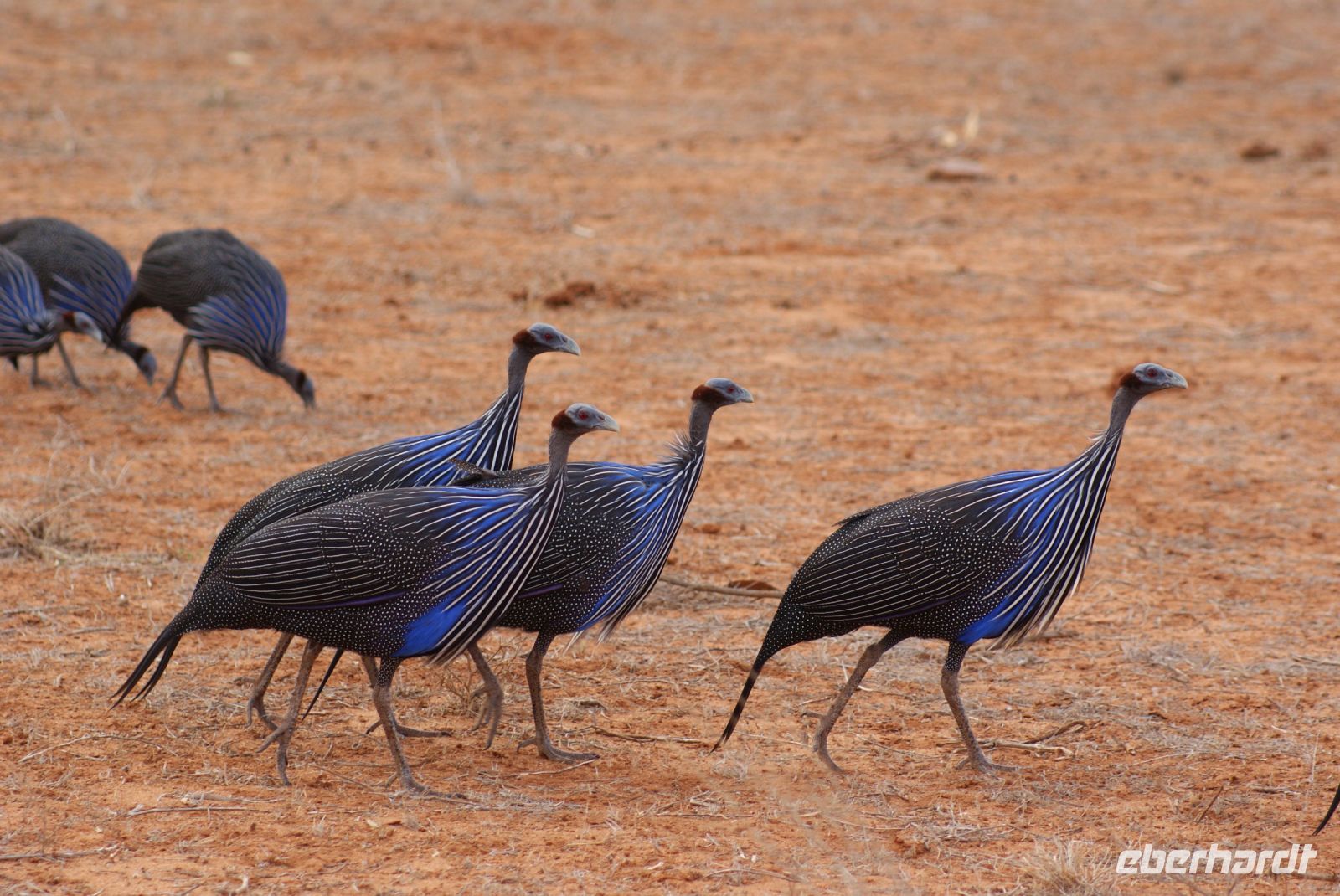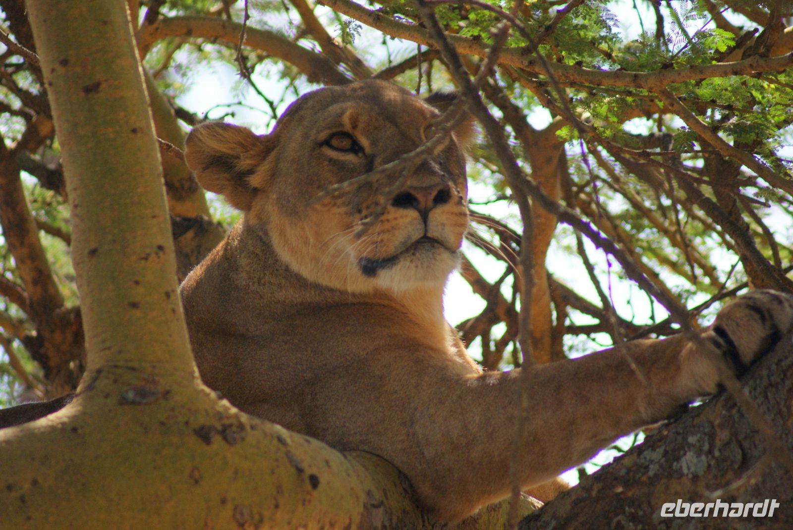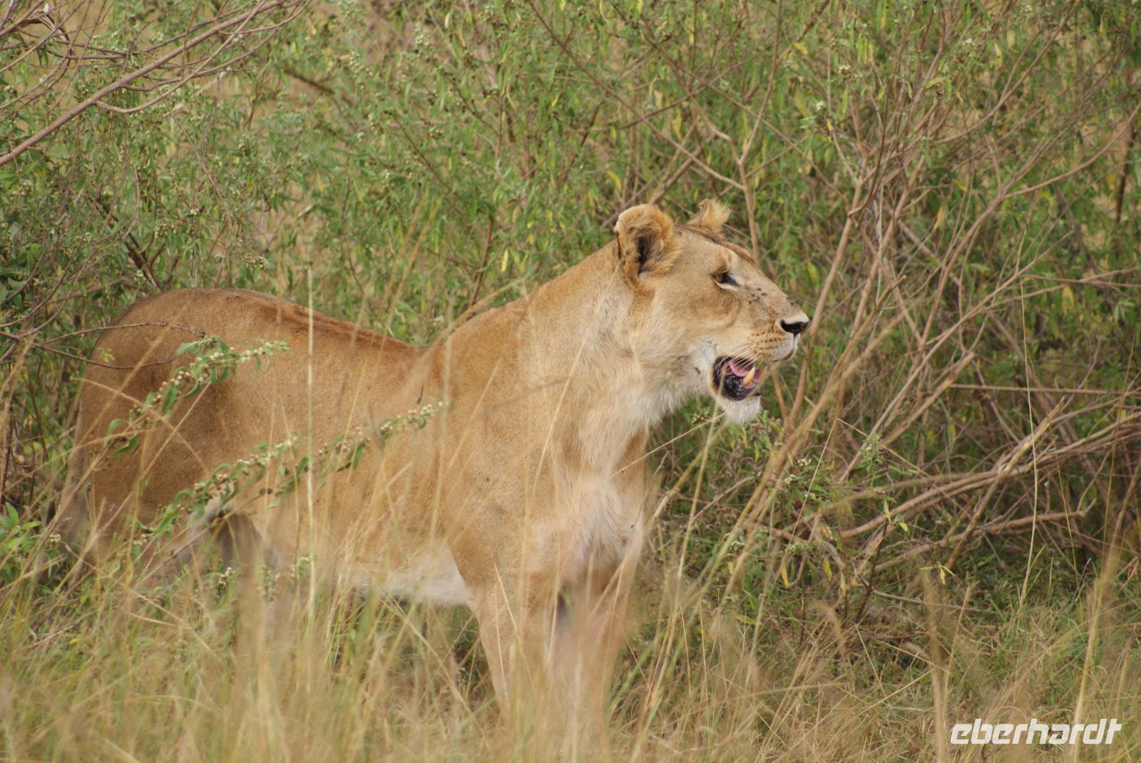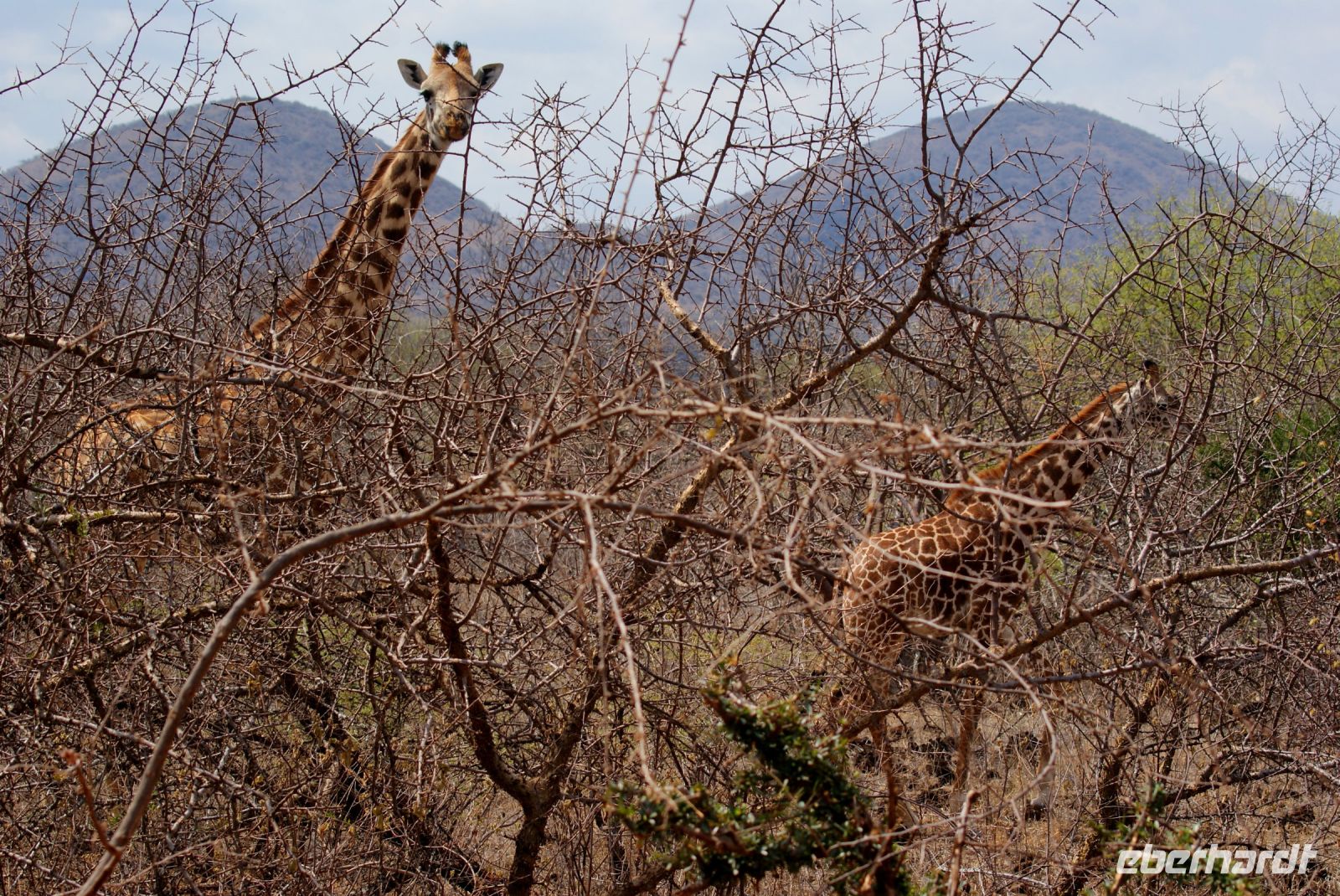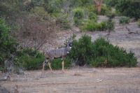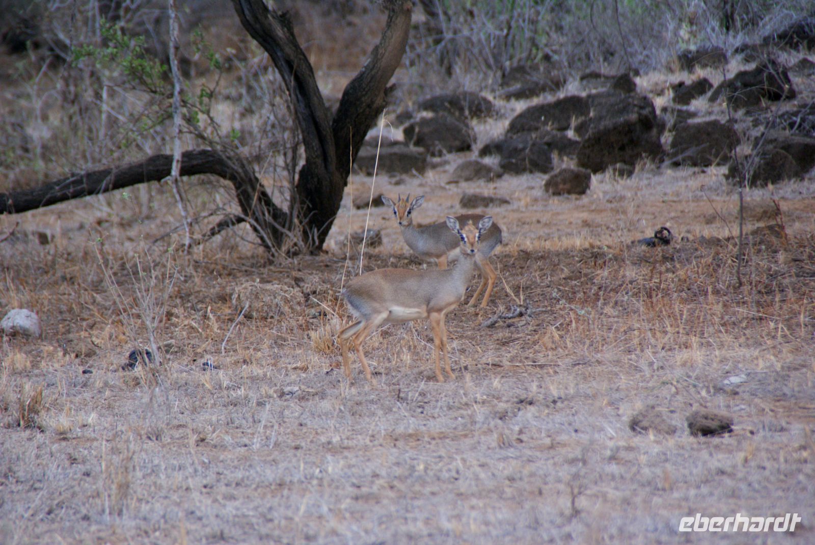 Nach einer unerwartet ruhigen Nacht (kaum Tiere am Wasserloch) und einem guten Frühstück, verlassen wir nur sehr ungern dieses afrikanische Paradies. Ein letztes Mal lassen wir den Blick auf dieses unglaubliche Panorama schweifen. Am Wasserloch finden sich nun nach den Marabus die ersten Zebras und Perlhühner ein. Bevor die Elefantenherden eintreffen, ziehen wir lieber schnell weiter, da wir diesen Platz hier sonst nicht mehr verlassen möchten. Die heutige Tour führt uns zum 12.000 Km² großen Tsavo Ost Nationalpark, der gemeinsam mit Tsavo West den größten Nationalpark Kenias bildet. West und Ost trennt nur eine Transitstraße, die größtenteils ohne Zaun verläuft. Daher sehen wir am Straßenrand so manches Elefanten-Warnschild, was auf die frei laufenden Kolosse hinweist. Tsavo wurde 1948 gegründet und ein Jahr später in West und Ost geteilt. Wir finden nun ein wiederum anderes Landschaftsbild vor. Die Hügellandschaft von West weicht inzwischen wieder einer weiten Savanne mit herrlichen Schirmakazien und teils ebenfalls roter Erde. Nachdem wir die quirlige Stadt Voi mit gleichnamigem Gate passiert haben, hat uns die Natur wieder und schon kurz darauf, werden wir von der ersten Elefantenherde mit Jungtieren begrüßt und eindringlich begutachtet. Masaigiraffen am Wegesrand, dazu Impalas und Thompson Gazellen säumen unseren Weg, bis wir mittags in der Ashnil Aruba Lodge einchecken. Der Tsavo Ost Nationalpark ist im Winter recht windig und so empfängt uns auch hier in frisches Lüftchen. Nach dem Mittagessen und ein bisschen Ausruhen von der heutigen Anreise starten wir zur Nachmittagssafari. Erneut sehen wir unzählige Elefanten nah und fern, dazu die seltenen Gerenuks (Giraffenhalsantilopen), Kudus, Hornraben, Geierperlhühner, etc. Als abschließendes Highlight führt uns Guide Caleb, einem Geheimtipp folgend, zu einem Rudel Löwinnen, die genüsslich im Dickicht Siesta halten. Welch ein toller Augenblick, fünf Löwinnen und wir ganz alleine in der Savanne… Abends kehren wir zurück und so mancher Elefant findet noch den Weg zu unserem Wasserloch an der Ashnil Aruba Lodge.