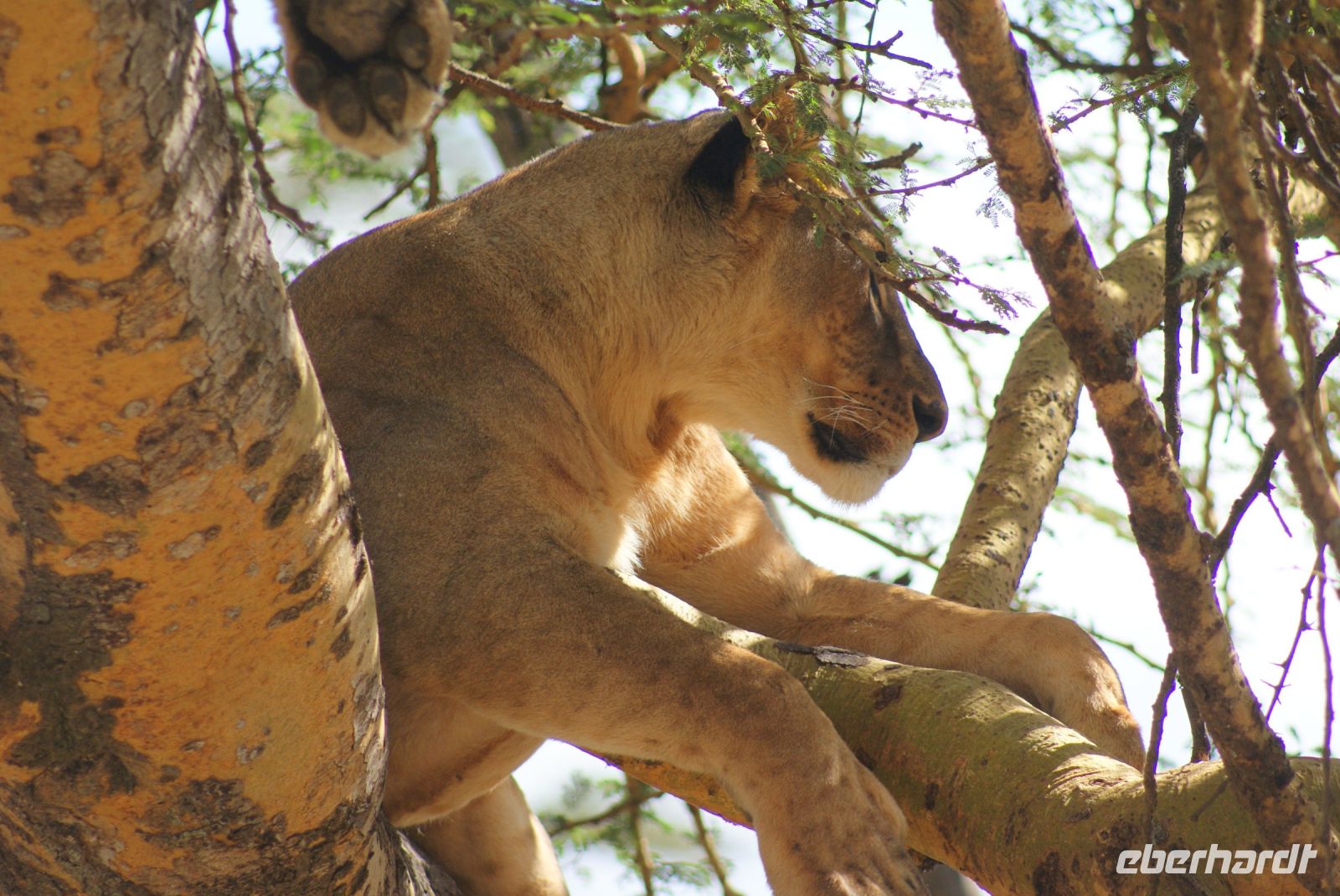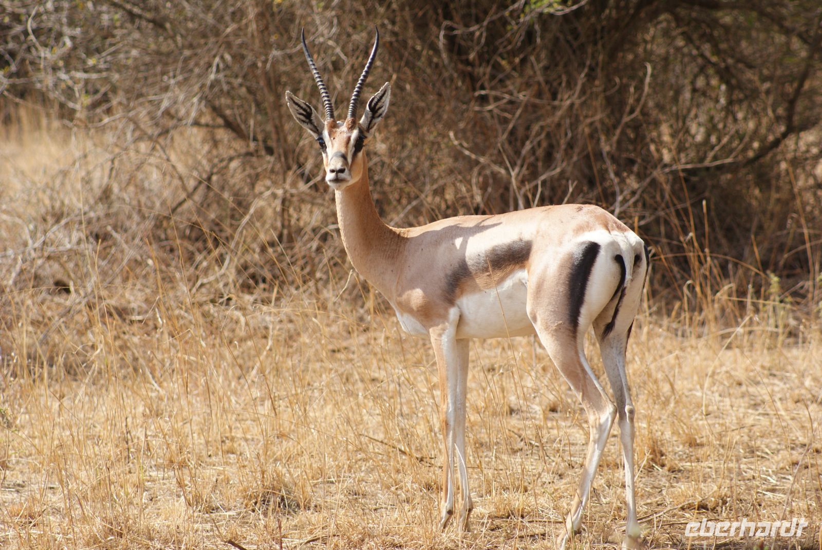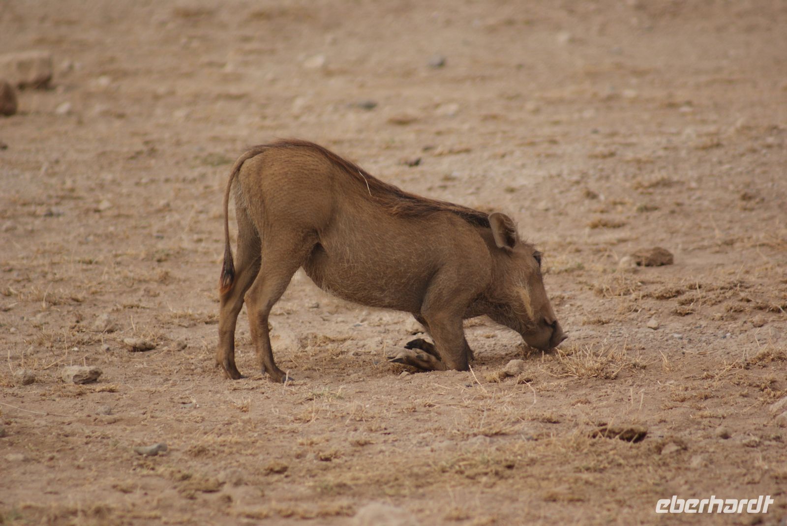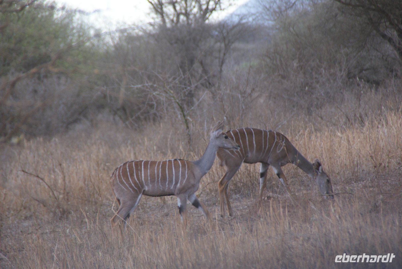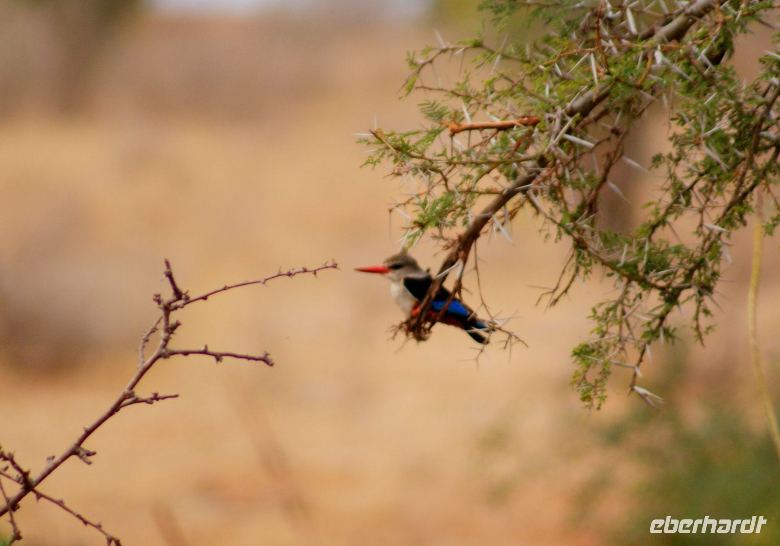 Nach einer unerwartet ruhigen Nacht (kaum Tiere am Wasserloch) und einem guten Frühstück, verlassen wir nur sehr ungern dieses afrikanische Paradies. Ein letztes Mal lassen wir den Blick auf dieses unglaubliche Panorama schweifen. Am Wasserloch finden sich nun nach den Marabus die ersten Zebras und Perlhühner ein. Bevor die Elefantenherden eintreffen, ziehen wir lieber schnell weiter, da wir diesen Platz hier sonst nicht mehr verlassen möchten. Die heutige Tour führt uns zum 12.000 Km² großen Tsavo Ost Nationalpark, der gemeinsam mit Tsavo West den größten Nationalpark Kenias bildet. West und Ost trennt nur eine Transitstraße, die größtenteils ohne Zaun verläuft. Daher sehen wir am Straßenrand so manches Elefanten-Warnschild, was auf die frei laufenden Kolosse hinweist. Tsavo wurde 1948 gegründet und ein Jahr später in West und Ost geteilt. Wir finden nun ein wiederum anderes Landschaftsbild vor. Die Hügellandschaft von West weicht inzwischen wieder einer weiten Savanne mit herrlichen Schirmakazien und teils ebenfalls roter Erde. Nachdem wir die quirlige Stadt Voi mit gleichnamigem Gate passiert haben, hat uns die Natur wieder und schon kurz darauf, werden wir von der ersten Elefantenherde mit Jungtieren begrüßt und eindringlich begutachtet. Masaigiraffen am Wegesrand, dazu Impalas und Thompson Gazellen säumen unseren Weg, bis wir mittags in der Ashnil Aruba Lodge einchecken. Der Tsavo Ost Nationalpark ist im Winter recht windig und so empfängt uns auch hier in frisches Lüftchen. Nach dem Mittagessen und ein bisschen Ausruhen von der heutigen Anreise starten wir zur Nachmittagssafari. Erneut sehen wir unzählige Elefanten nah und fern, dazu die seltenen Gerenuks (Giraffenhalsantilopen), Kudus, Hornraben, Geierperlhühner, etc. Als abschließendes Highlight führt uns Guide Caleb, einem Geheimtipp folgend, zu einem Rudel Löwinnen, die genüsslich im Dickicht Siesta halten. Welch ein toller Augenblick, fünf Löwinnen und wir ganz alleine in der Savanne… Abends kehren wir zurück und so mancher Elefant findet noch den Weg zu unserem Wasserloch an der Ashnil Aruba Lodge.
