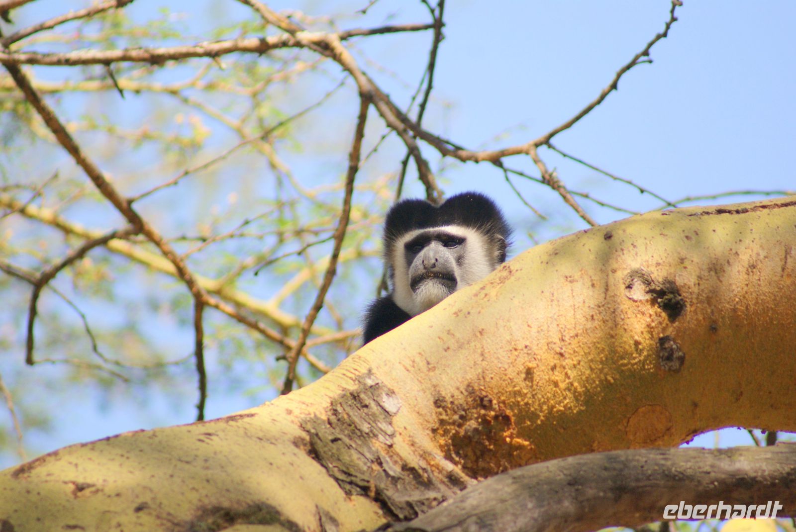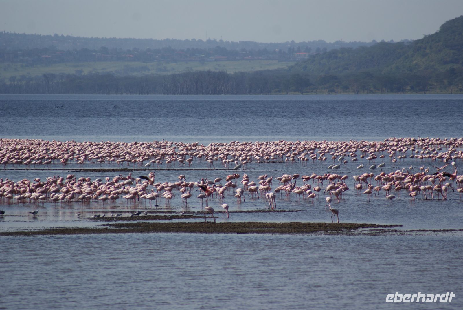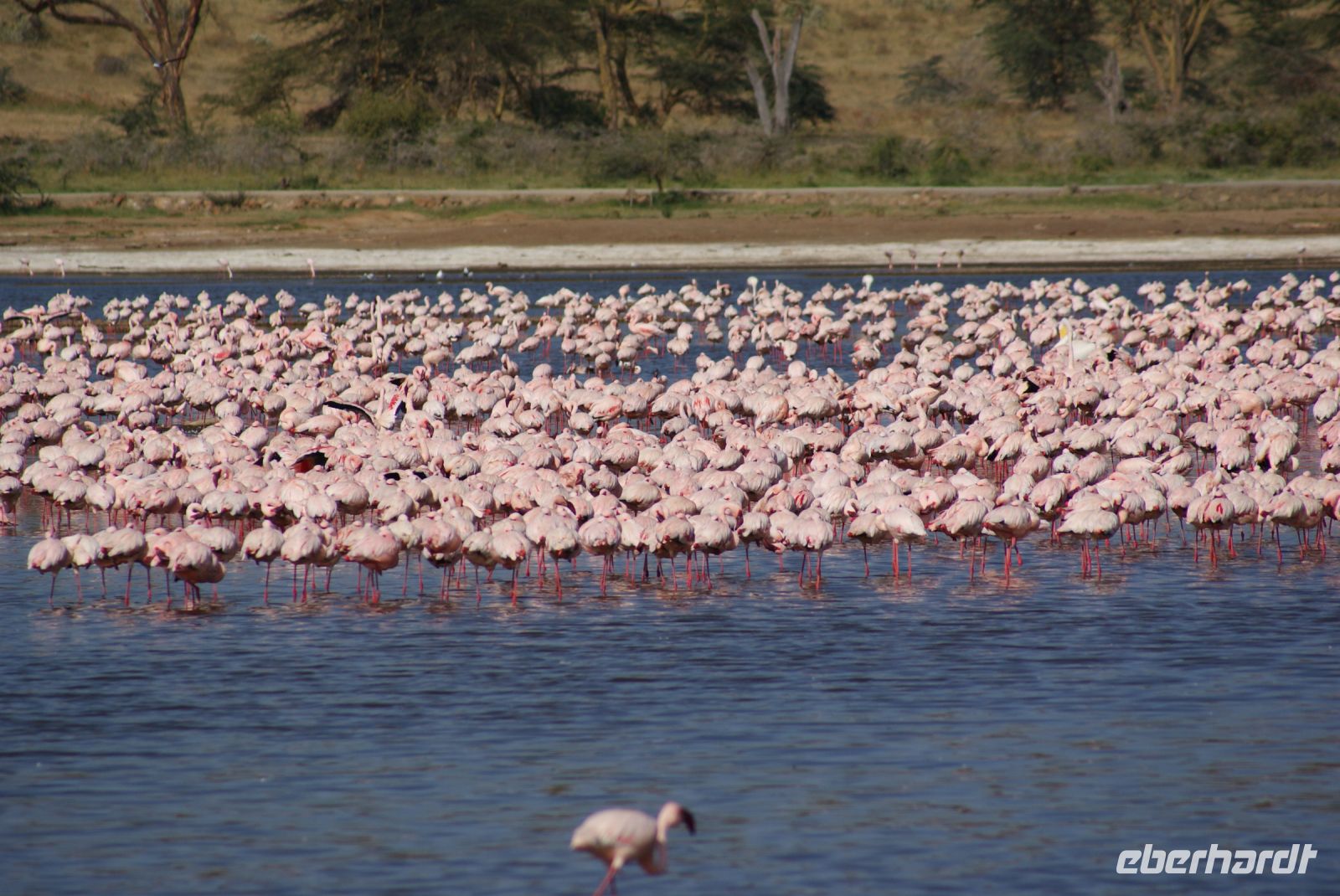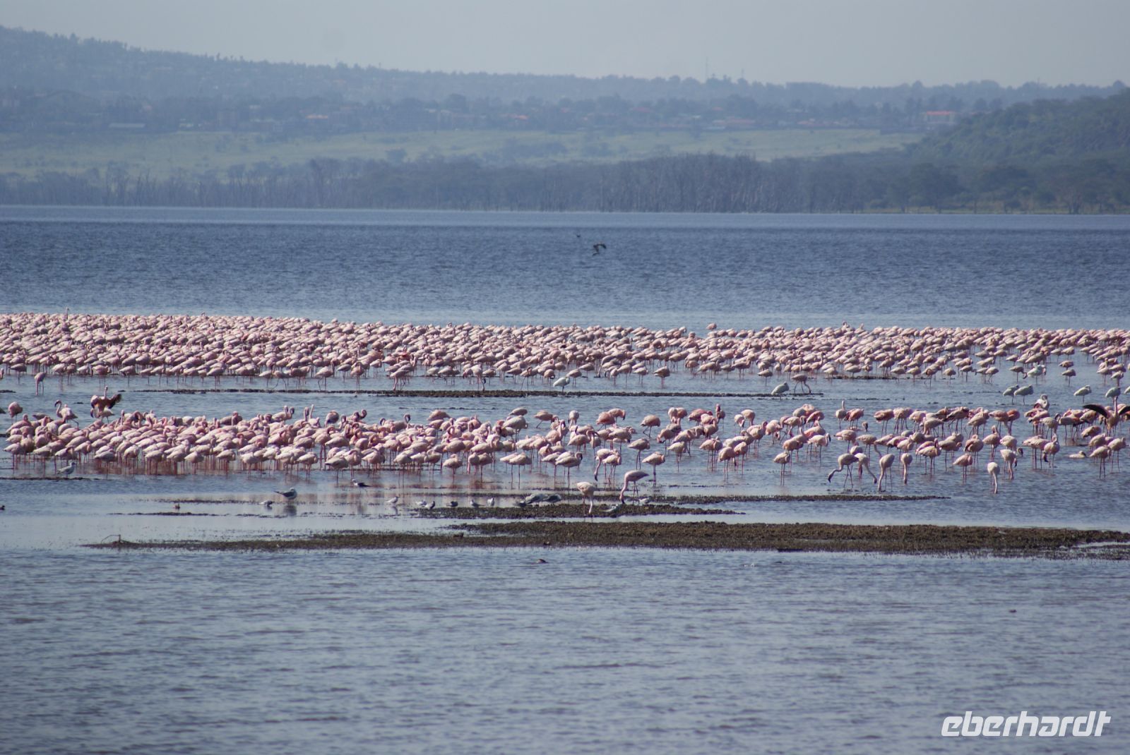 Nach einer geruhsamen Nacht und Frühstück verlassen wir die Region des Aberdere Nationalparks und ziehen weiter Richtung Lake Nakuru unserem heutigen Tagesziel. Wir fahren nun durch die Region der Kikuju, eine der vielen Volksgruppen Kenias. Hügelige Landschaft, Marktstände mit vielen Wassermelonen und roten Zwiebeln, die hier angebaut werden, kleinere Orte mit jeglichen Besonderheiten ziehen an uns vorbei, bis wir schließlich den Äquator passieren. Hier erfolgt ein Stopp am berühmten Äquatorschild, was natürlich nicht fehlen darf. So entstehen schöne Aufnahmen, ein erster Kampf mit geschäftstüchtigen Händlern und der bekannten Wasser-Zeremonie. Wie unterschiedlich sich der Wasserstrudel jeweils auf der Nord-und Südkugel der Erde verhält, wird uns nun veranschaulicht. Staunend sehen wir, wie sich dieser im Norden im Uhrzeigersinn und im Süden gegen den Uhrzeigersinn dreht. Genau auf dem Äquator dreht sich gar nichts. Sehr imposant, wie auch immer das in diesen kurzen Abständen hier funktioniert. Abschließend erhalten wir noch ein schönes Zertifikat, dass wir am Äquator waren und können uns dieses gegen eine kleine Gebühr ausstellen und stempeln lassen. Pünktlich zur Mittagszeit erreichen wir den auf 1700 m gelegenen Nakuru See und gleichnamigen Nationalpark. Der bis zu vier Meter tiefe alkalische und abflusslose See im östlichen Ostafrikanischen Grabenbruch, dem Rift Valley, ist besonders wegen seiner zahlreichen Flamingos weltberühmt. Die zeitweise bis zu zwei Millionen Flamingos ernähren sich von Blaualgen oder Kleinkrebsen, wodurch die eigentlich weißen Tiere erst ihre rosa Farbe erhalten. Schon von weitem kann man ein rosa Band erkennen, das sich am Seeufer meist um den ganzen See herumzieht. In der wunderschönen Savora Lions Hill Game Lodge werden wir freudig erwartet. Wir beziehen zunächst unsere Zimmer und nehmen dann ein herrliches Mittagessen auf der Terrasse ein. Zunächst beobachten wir jedoch noch die Fütterung unzähliger Webervögel. Bis zur Safari am Nachmittag haben wir noch ausreichend Zeit, die Anlage zu genießen, ein kühles Bad im blauen Pool zu nehmen oder einfach die Seele baumeln zu lassen. Es geht wieder los, unsere Safari am Nakuru See entlang beginnt. Wir sehen die ersten Flamingos, Kormorane, Fischadler und plötzlich: zwei Löwinnen beinahe direkt über uns schlafend im Geäst eines Baums. Was für ein Erlebnis, sie lassen sich nicht stören, schauen gelegentlich auf und wir können in Ruhe fotografieren. Ein absolut seltenes Bild, was sich uns bietet und wir sind begeistert. Am Kopfe des bis zu 4 m tiefen Sees sehen wir eine große Gruppe Flamingos, die hier zu Hochzeiten bis zu zwei Millionen Tiere werden können, womit der Nakuru See dann wie ein rosafarbener Teppich erscheint. Wir ziehen weiter zum Mahalia Wasserfall, wo wir zunächst die Colobus (auch schwarz-weiße Stummelaffen genannt) im Baum sitzen sehen und dann mit Vinceroy/kenianischer Brandy auf den bisherigen tollen Reiseverlauf und unser gutes Gelingen in allen Facetten anstoßen. Am frühen Abend zurückkehrend haben wir heute Nachmittag folgendes gesehen: Komorane, Pelikane, sehr viele Flamingos, Fischadler, Kronenkraniche, Sekretärvögel, Nashörner, Löwen, Büffel, Impalas, Zebras, Rotschildgiraffen, Warzenschweine, etc. Abschließend genießen wir nochmals das tolle Hotelbuffet und lassen den Abend am herrlichen Lagerfeuer ausklingen.