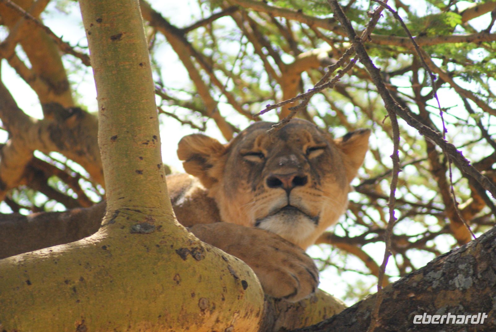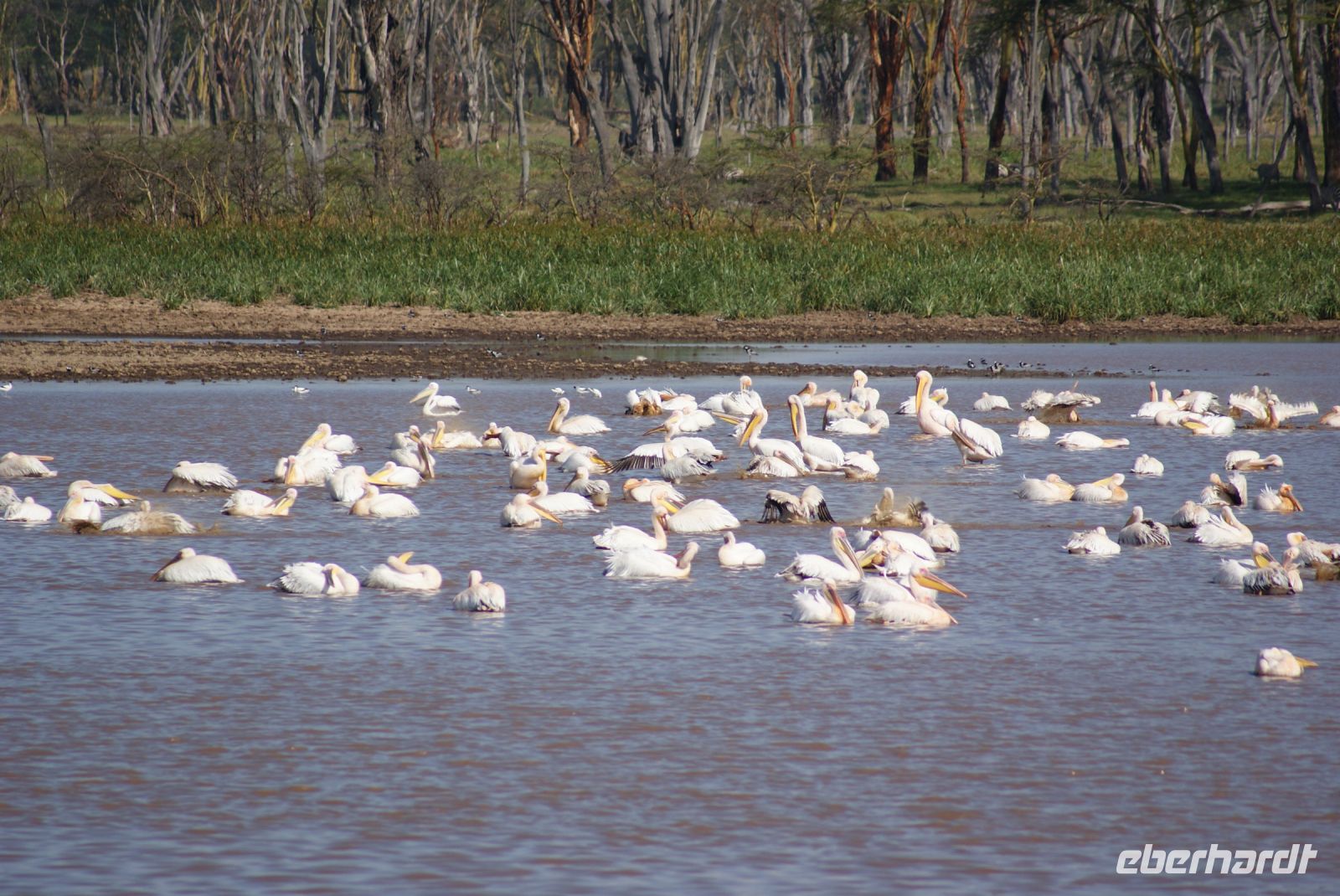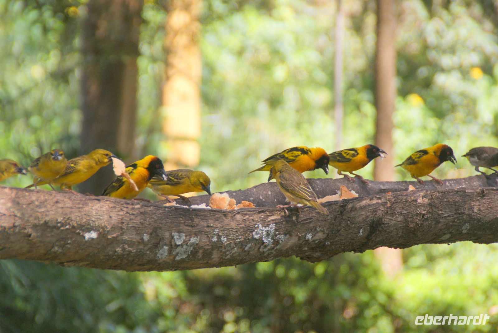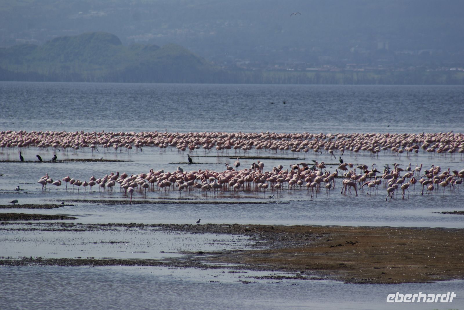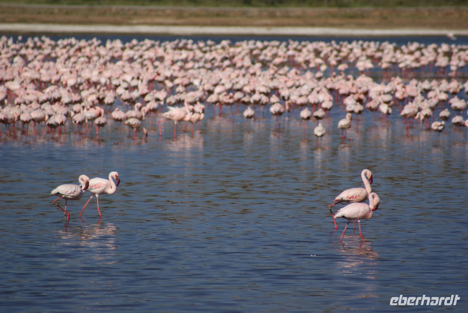 Nach einer geruhsamen Nacht und Frühstück verlassen wir die Region des Aberdere Nationalparks und ziehen weiter Richtung Lake Nakuru unserem heutigen Tagesziel. Wir fahren nun durch die Region der Kikuju, eine der vielen Volksgruppen Kenias. Hügelige Landschaft, Marktstände mit vielen Wassermelonen und roten Zwiebeln, die hier angebaut werden, kleinere Orte mit jeglichen Besonderheiten ziehen an uns vorbei, bis wir schließlich den Äquator passieren. Hier erfolgt ein Stopp am berühmten Äquatorschild, was natürlich nicht fehlen darf. So entstehen schöne Aufnahmen, ein erster Kampf mit geschäftstüchtigen Händlern und der bekannten Wasser-Zeremonie. Wie unterschiedlich sich der Wasserstrudel jeweils auf der Nord-und Südkugel der Erde verhält, wird uns nun veranschaulicht. Staunend sehen wir, wie sich dieser im Norden im Uhrzeigersinn und im Süden gegen den Uhrzeigersinn dreht. Genau auf dem Äquator dreht sich gar nichts. Sehr imposant, wie auch immer das in diesen kurzen Abständen hier funktioniert. Abschließend erhalten wir noch ein schönes Zertifikat, dass wir am Äquator waren und können uns dieses gegen eine kleine Gebühr ausstellen und stempeln lassen. Pünktlich zur Mittagszeit erreichen wir den auf 1700 m gelegenen Nakuru See und gleichnamigen Nationalpark. Der bis zu vier Meter tiefe alkalische und abflusslose See im östlichen Ostafrikanischen Grabenbruch, dem Rift Valley, ist besonders wegen seiner zahlreichen Flamingos weltberühmt. Die zeitweise bis zu zwei Millionen Flamingos ernähren sich von Blaualgen oder Kleinkrebsen, wodurch die eigentlich weißen Tiere erst ihre rosa Farbe erhalten. Schon von weitem kann man ein rosa Band erkennen, das sich am Seeufer meist um den ganzen See herumzieht. In der wunderschönen Savora Lions Hill Game Lodge werden wir freudig erwartet. Wir beziehen zunächst unsere Zimmer und nehmen dann ein herrliches Mittagessen auf der Terrasse ein. Zunächst beobachten wir jedoch noch die Fütterung unzähliger Webervögel. Bis zur Safari am Nachmittag haben wir noch ausreichend Zeit, die Anlage zu genießen, ein kühles Bad im blauen Pool zu nehmen oder einfach die Seele baumeln zu lassen. Es geht wieder los, unsere Safari am Nakuru See entlang beginnt. Wir sehen die ersten Flamingos, Kormorane, Fischadler und plötzlich: zwei Löwinnen beinahe direkt über uns schlafend im Geäst eines Baums. Was für ein Erlebnis, sie lassen sich nicht stören, schauen gelegentlich auf und wir können in Ruhe fotografieren. Ein absolut seltenes Bild, was sich uns bietet und wir sind begeistert. Am Kopfe des bis zu 4 m tiefen Sees sehen wir eine große Gruppe Flamingos, die hier zu Hochzeiten bis zu zwei Millionen Tiere werden können, womit der Nakuru See dann wie ein rosafarbener Teppich erscheint. Wir ziehen weiter zum Mahalia Wasserfall, wo wir zunächst die Colobus (auch schwarz-weiße Stummelaffen genannt) im Baum sitzen sehen und dann mit Vinceroy/kenianischer Brandy auf den bisherigen tollen Reiseverlauf und unser gutes Gelingen in allen Facetten anstoßen. Am frühen Abend zurückkehrend haben wir heute Nachmittag folgendes gesehen: Komorane, Pelikane, sehr viele Flamingos, Fischadler, Kronenkraniche, Sekretärvögel, Nashörner, Löwen, Büffel, Impalas, Zebras, Rotschildgiraffen, Warzenschweine, etc. Abschließend genießen wir nochmals das tolle Hotelbuffet und lassen den Abend am herrlichen Lagerfeuer ausklingen.