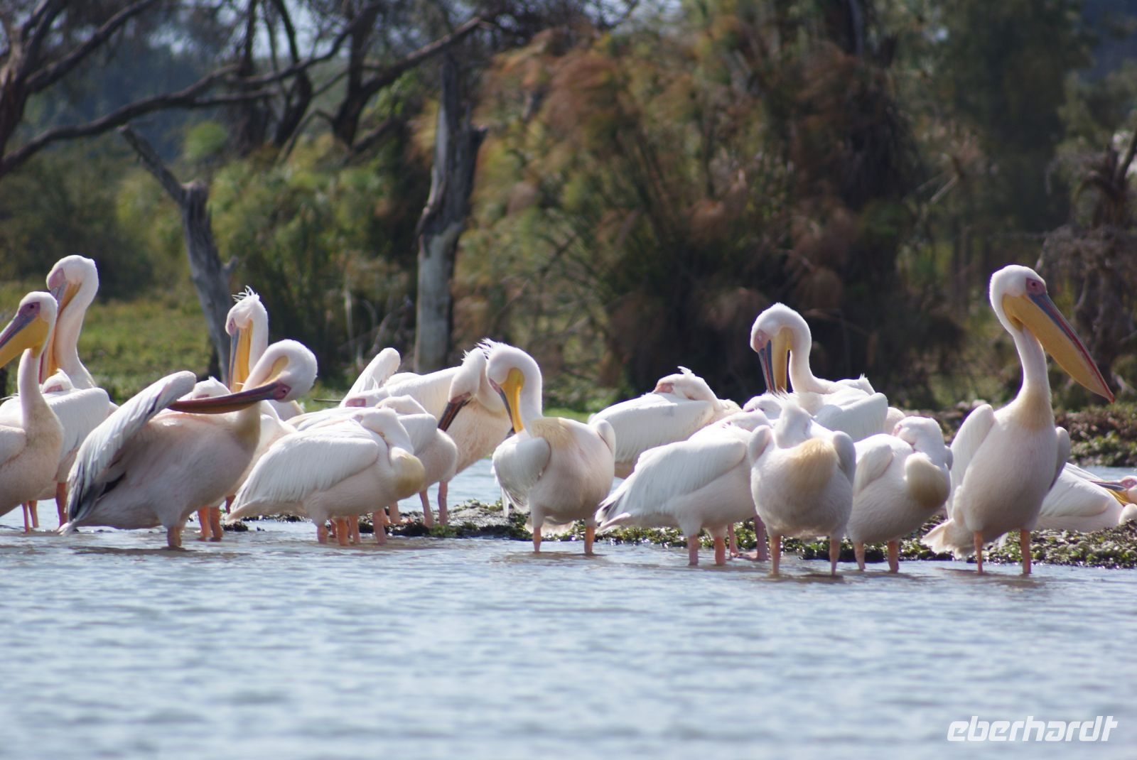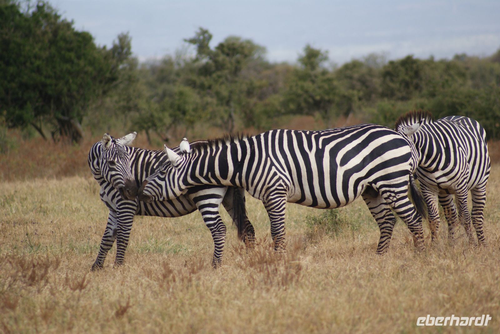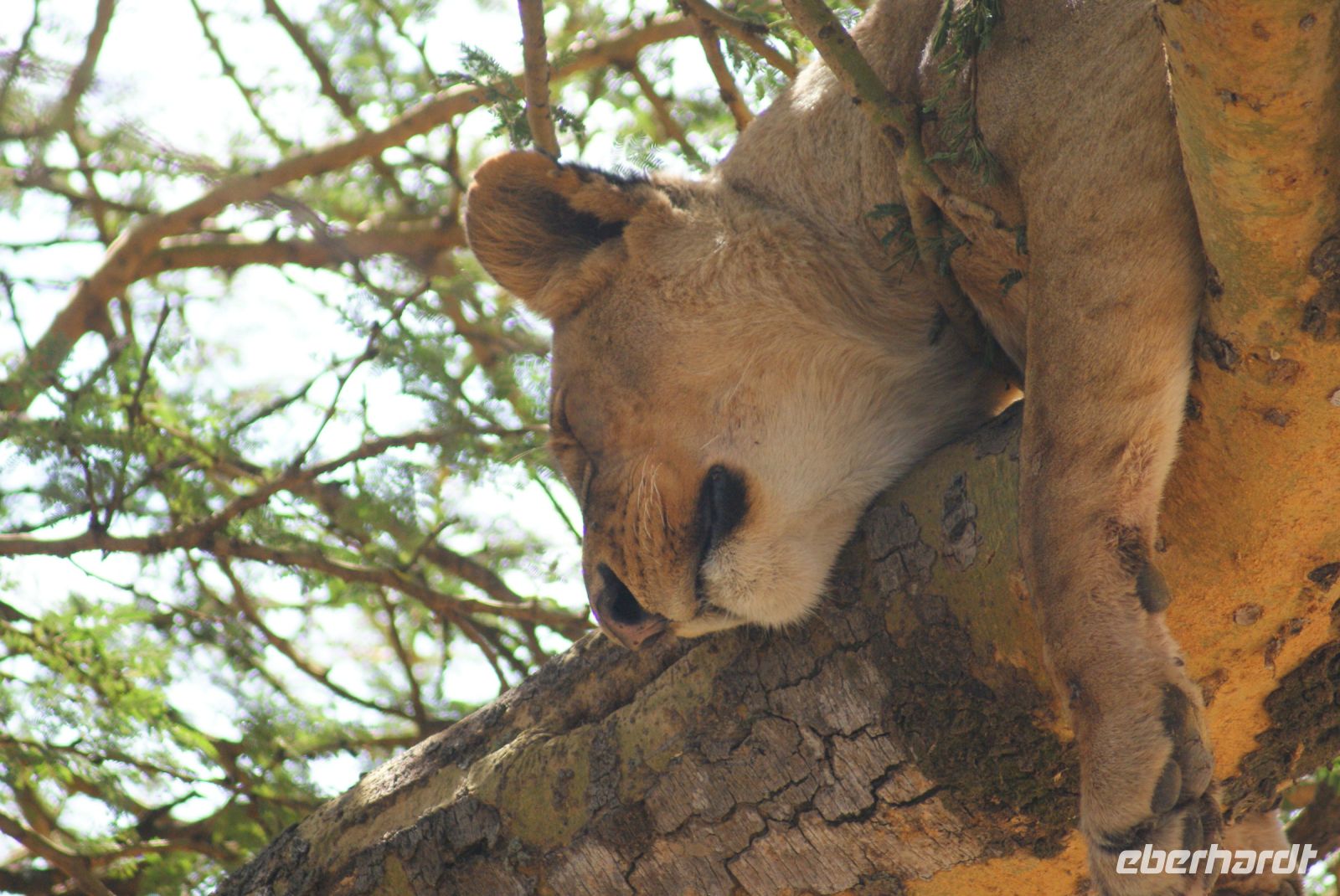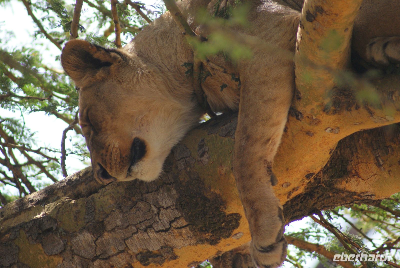 Nach einer geruhsamen Nacht und Frühstück verlassen wir die Region des Aberdere Nationalparks und ziehen weiter Richtung Lake Nakuru unserem heutigen Tagesziel. Wir fahren nun durch die Region der Kikuju, eine der vielen Volksgruppen Kenias. Hügelige Landschaft, Marktstände mit vielen Wassermelonen und roten Zwiebeln, die hier angebaut werden, kleinere Orte mit jeglichen Besonderheiten ziehen an uns vorbei, bis wir schließlich den Äquator passieren. Hier erfolgt ein Stopp am berühmten Äquatorschild, was natürlich nicht fehlen darf. So entstehen schöne Aufnahmen, ein erster Kampf mit geschäftstüchtigen Händlern und der bekannten Wasser-Zeremonie. Wie unterschiedlich sich der Wasserstrudel jeweils auf der Nord-und Südkugel der Erde verhält, wird uns nun veranschaulicht. Staunend sehen wir, wie sich dieser im Norden im Uhrzeigersinn und im Süden gegen den Uhrzeigersinn dreht. Genau auf dem Äquator dreht sich gar nichts. Sehr imposant, wie auch immer das in diesen kurzen Abständen hier funktioniert. Abschließend erhalten wir noch ein schönes Zertifikat, dass wir am Äquator waren und können uns dieses gegen eine kleine Gebühr ausstellen und stempeln lassen. Pünktlich zur Mittagszeit erreichen wir den auf 1700 m gelegenen Nakuru See und gleichnamigen Nationalpark. Der bis zu vier Meter tiefe alkalische und abflusslose See im östlichen Ostafrikanischen Grabenbruch, dem Rift Valley, ist besonders wegen seiner zahlreichen Flamingos weltberühmt. Die zeitweise bis zu zwei Millionen Flamingos ernähren sich von Blaualgen oder Kleinkrebsen, wodurch die eigentlich weißen Tiere erst ihre rosa Farbe erhalten. Schon von weitem kann man ein rosa Band erkennen, das sich am Seeufer meist um den ganzen See herumzieht. In der wunderschönen Savora Lions Hill Game Lodge werden wir freudig erwartet. Wir beziehen zunächst unsere Zimmer und nehmen dann ein herrliches Mittagessen auf der Terrasse ein. Zunächst beobachten wir jedoch noch die Fütterung unzähliger Webervögel. Bis zur Safari am Nachmittag haben wir noch ausreichend Zeit, die Anlage zu genießen, ein kühles Bad im blauen Pool zu nehmen oder einfach die Seele baumeln zu lassen. Es geht wieder los, unsere Safari am Nakuru See entlang beginnt. Wir sehen die ersten Flamingos, Kormorane, Fischadler und plötzlich: zwei Löwinnen beinahe direkt über uns schlafend im Geäst eines Baums. Was für ein Erlebnis, sie lassen sich nicht stören, schauen gelegentlich auf und wir können in Ruhe fotografieren. Ein absolut seltenes Bild, was sich uns bietet und wir sind begeistert. Am Kopfe des bis zu 4 m tiefen Sees sehen wir eine große Gruppe Flamingos, die hier zu Hochzeiten bis zu zwei Millionen Tiere werden können, womit der Nakuru See dann wie ein rosafarbener Teppich erscheint. Wir ziehen weiter zum Mahalia Wasserfall, wo wir zunächst die Colobus (auch schwarz-weiße Stummelaffen genannt) im Baum sitzen sehen und dann mit Vinceroy/kenianischer Brandy auf den bisherigen tollen Reiseverlauf und unser gutes Gelingen in allen Facetten anstoßen. Am frühen Abend zurückkehrend haben wir heute Nachmittag folgendes gesehen: Komorane, Pelikane, sehr viele Flamingos, Fischadler, Kronenkraniche, Sekretärvögel, Nashörner, Löwen, Büffel, Impalas, Zebras, Rotschildgiraffen, Warzenschweine, etc. Abschließend genießen wir nochmals das tolle Hotelbuffet und lassen den Abend am herrlichen Lagerfeuer ausklingen.