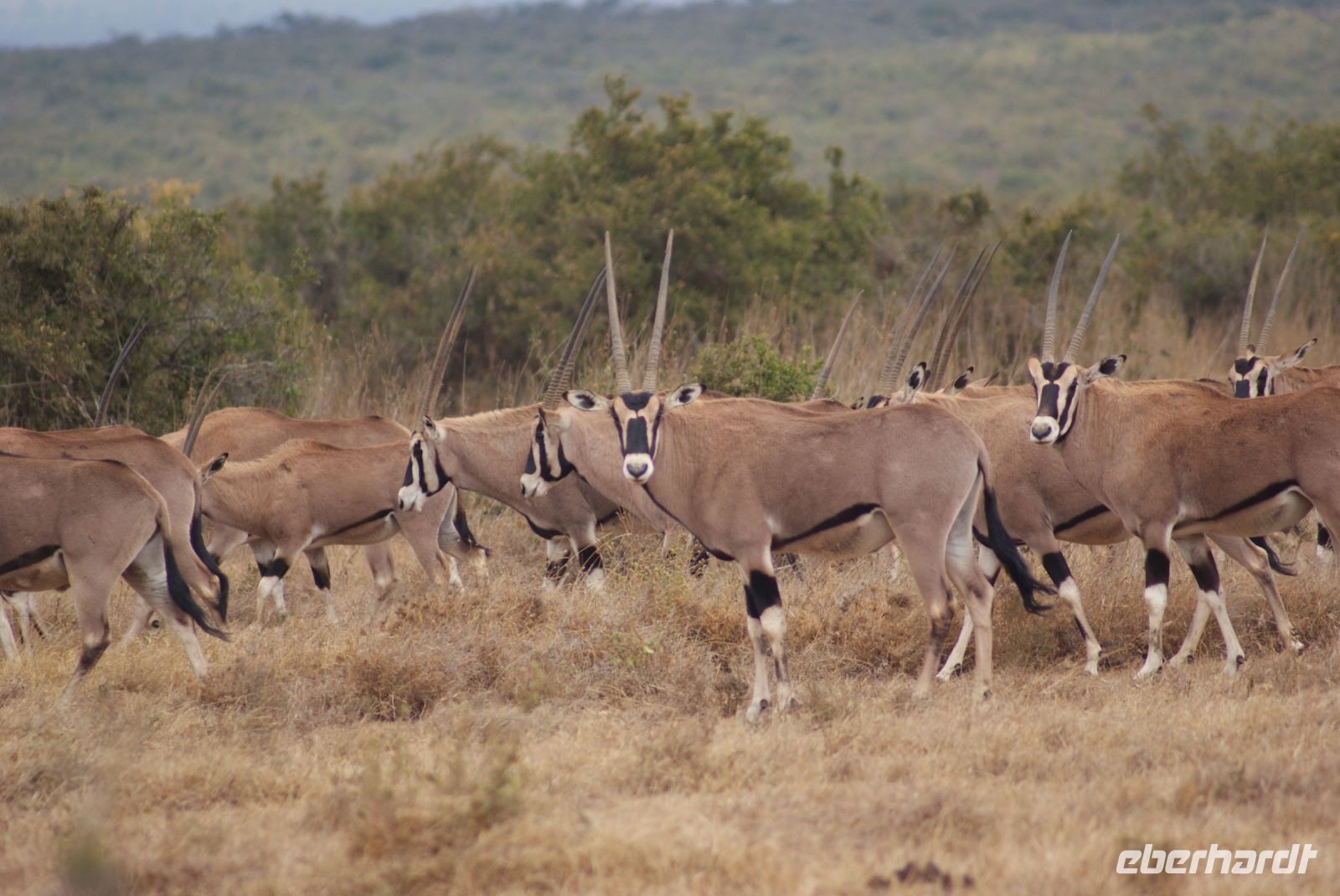 Dank Wärmflasche haben wir alle herrlich geschlafen und starten am frühen Morgen gut gestärkt vom leckeren Frühstücksbuffet zur ersten Safari unserer Keniareise in das Solio Reservat. Dieses fasst 17.500 Hektar und beherbergt die weltweit größte Population an Breitmaulnashörnern und ca. 100 Spitzmaulnashörnern. Nach 10 Min. Fahrt erreichen wir dieses und nun starten wir mit geöffnetem Dach und offenen Fenstern unseres Jeeps. Wir trauen unseren Augen nicht, welche Vielzahl an Nashörnern wir in den kommenden Stunden sehen, es sind sicher fünfzig an der Zahl. Von Guide Caleb erfahren wir, dass Breitmaulnashörner ihre Jungen immer vor sich, Spitzmaulnashörner immer hinter sich führen. Dies beruht darauf, dass Breitmaulnashörner in der offenen Savanne und Spitzmaulnashörner im dichten Busch unterwegs sind. Wir können uns nicht satt sehen… Eine herrliche kenianische Landschaft bietet sich uns mit wunderbar goldfarbenen Gelbrindenakazien. Wir lassen die neuen Eindrücke auf uns wirken und sehen folgende Tiere: Breitmaulnashörner mit Jungtieren, wunderschöne und besondere Rotschildgiraffen, Büffel, Oryxantilopen, Pumbas (Warzenschweine), Impalas, Thomson Gazellen, Elen Antilopen, Schabrakenschakale, Zebras, Paviane, grüne Meerkatzen, etliche Wasserböcke sowie diverse Vögel: Kronenkibitz, Ibis, Gabelracke, Weißrückengeier, Glanzstare und viele mehr. Guide Caleb erklärt uns so manch Besonderheiten zu den einzelnen Tieren… Ein toller Start unserer Keniareise mit bereits sehr vielen Tiersichtungen…auf die noch viele in den nächsten Tagen folgen sollen. Am frühen Nachmittag kehren wir zu einem späten Mittagessen zurück und können den restlichen Tag ein wenig ausruhen, die Fotoausbeute sichten und bis zum Abendessen unsere Freizeit genießen.