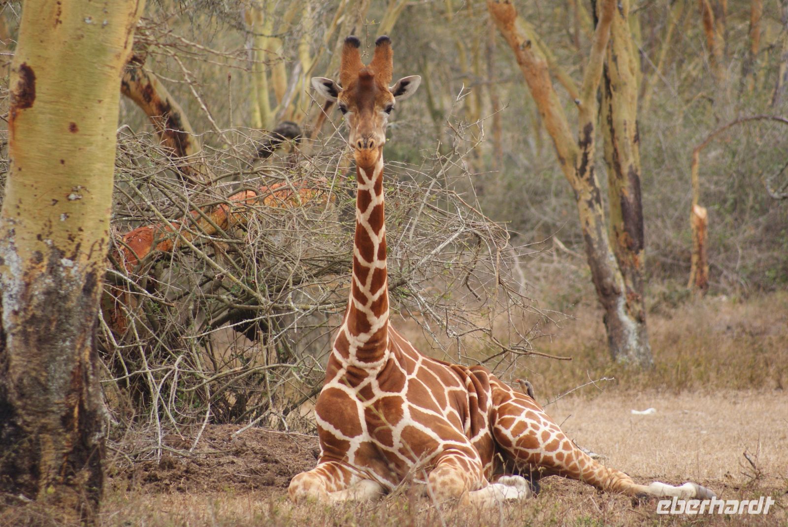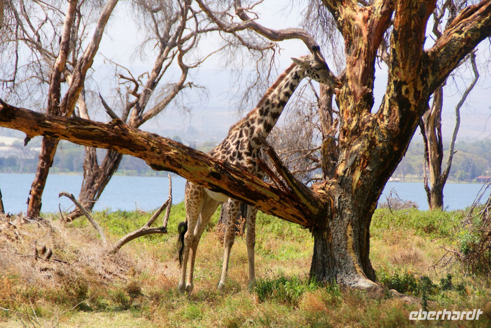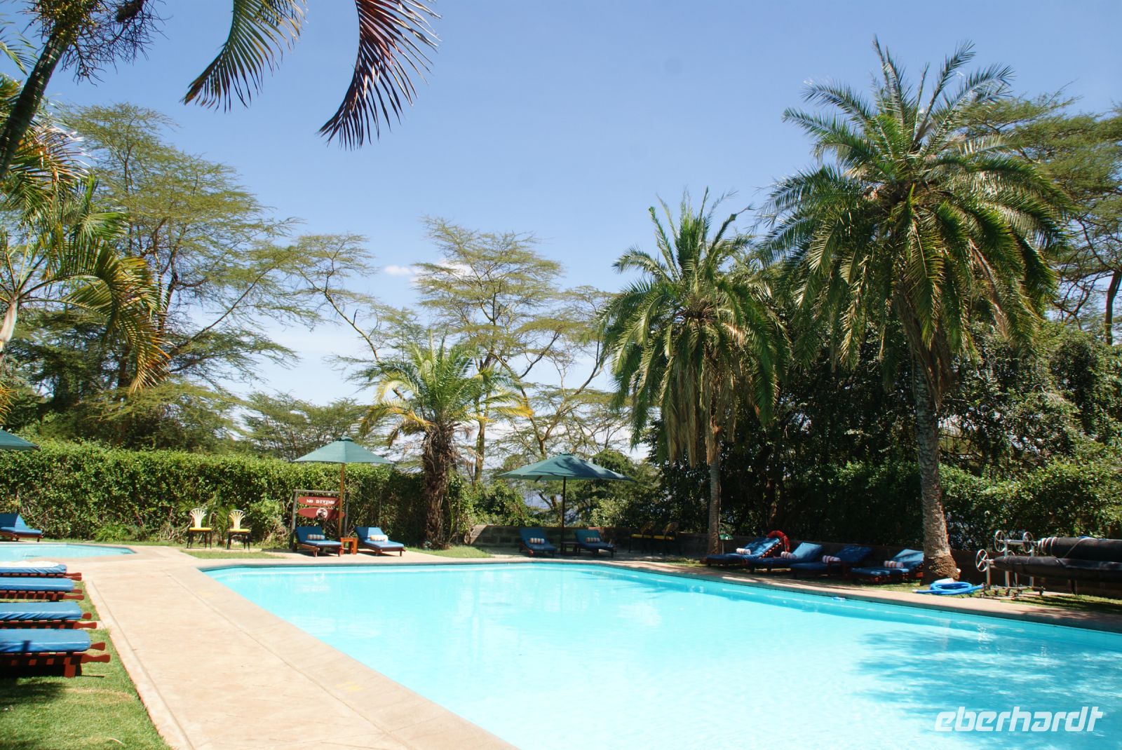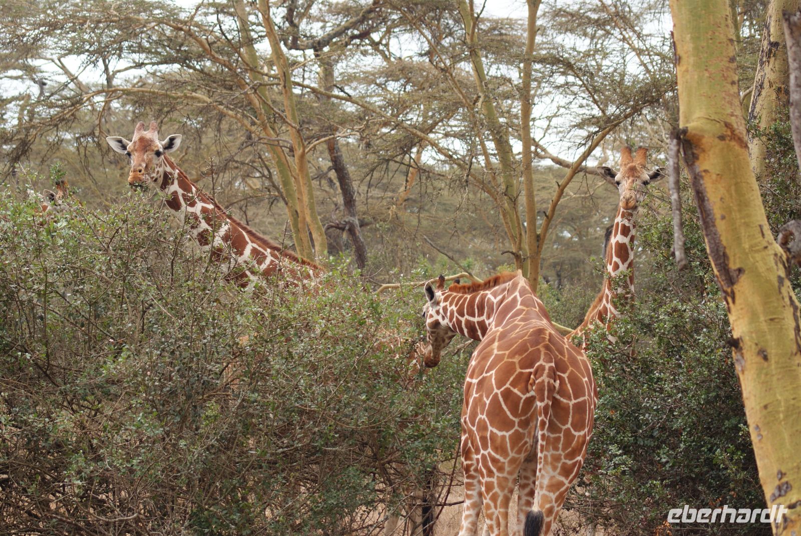 Vom reichhaltigen Buffet gestärkt, starten wir zunächst mit einer einstündigen Bootsfahrt, auf der uns unsere Bootsführer die Tiere der Umgebung näher bringen. Der Naivasha See fast 139 Km² und liegt auf 1880 m Höhe. Er ist einer der zwei höchsten Süßwasserseen Afrikas und im afrikanischen Grabenbruch gelegen. Neben vielen Vögeln und dem besonderen Goliath Reiher, sehen wir zahlreiche Hippos am Uferrand. Mit Erreichen der „Halbmondinsel“ Crescent Island, werden wir von einem örtlichen Guide in Empfang genommen, der uns nun zwei Stunden auf unserer Safari zu Fuß begleitet. Wir befinden uns hier an einem der original Drehplätze von Filmen wie „Jenseits von Afrika“, „Die Löwin Elsa“ oder „Tomb Raider“, deren Sequnenzen einst hier entstanden sind. Wir können uns unbeschwert bewegen, denn es gibt hier keine gefährlichen Tiere. So genießen wir die ruhige Atmosphäre und sind im Grunde alleine auf der knapp 40 Hektar großen Insel. Fünf Giraffen begegnen uns und sind völlig entspannt mit unserem nahen Herantreten. So entstehen herrliche Aufnahmen mit den Tieren und der schönen Kulisse. Unsere Bootsfahrer bringen uns wieder zurück zum Festland, nicht ohne vorher noch die schon wartenden Schreiseeadler zu füttern. Diese werden durch Pfeifen und werfen verschiedener Fische angelockt, was auch prompt gelingt. Zurück an Land geht es am frühen Nachmittag zurück in die Lodge zu einem späteren Mittagessen. Anschließend hat sich die Gruppe für einen freien Nachmittag entschieden, sodass jeder die Möglichkeit hat, die Anlage auf seine Art und Weise, sei es am Pool oder im Garten, mit den Tieren zu genießen. Abends finden wir uns zum Essen wieder ein und schließen unseren Aufenthalt hier am Lake Naivasha mit einem kühlen Getränk ab.