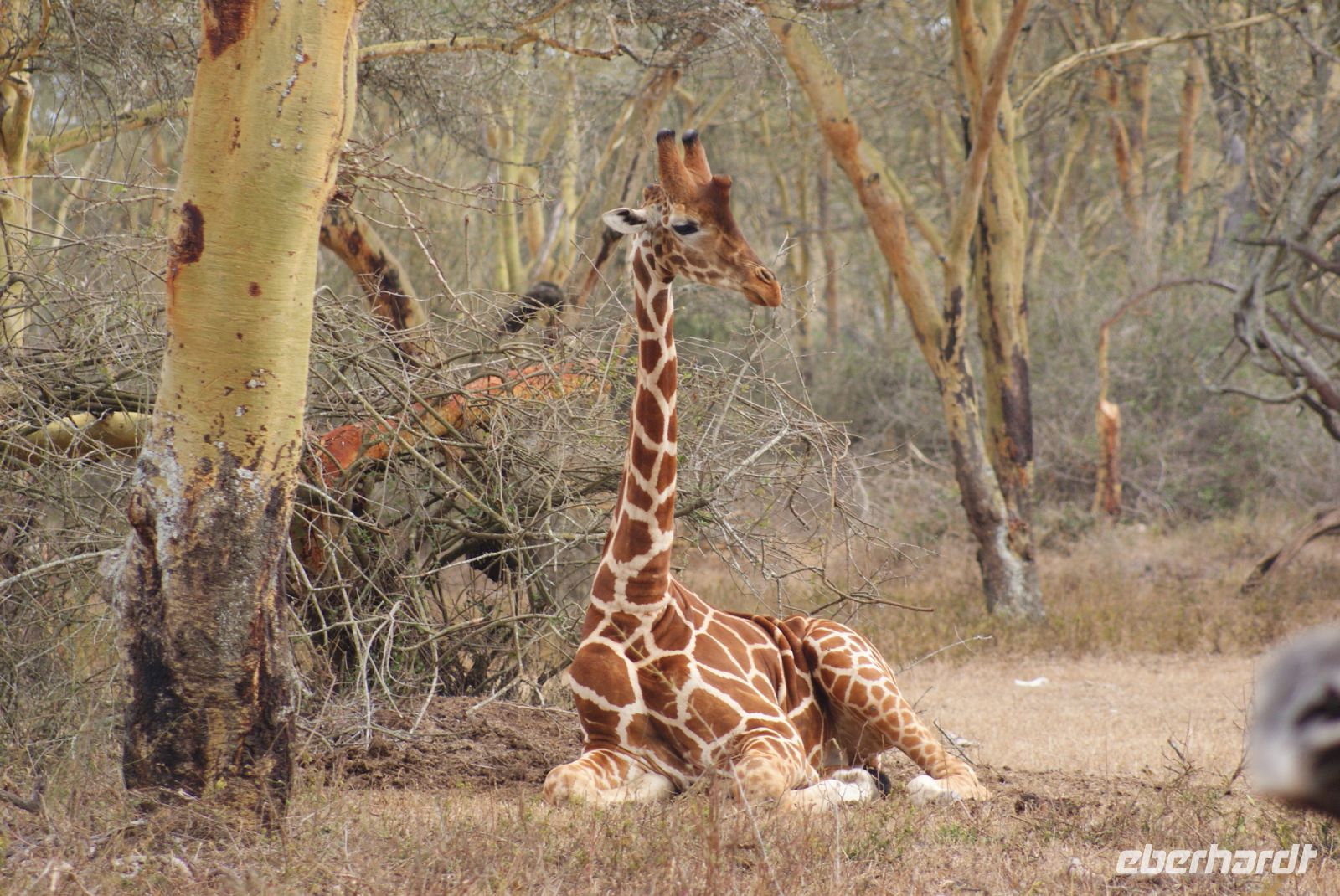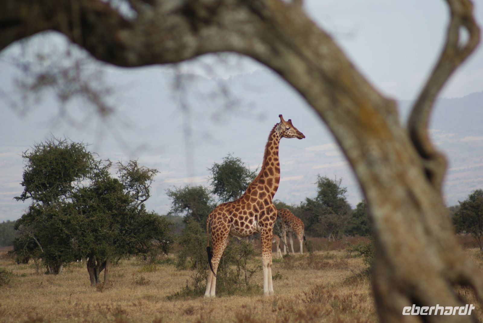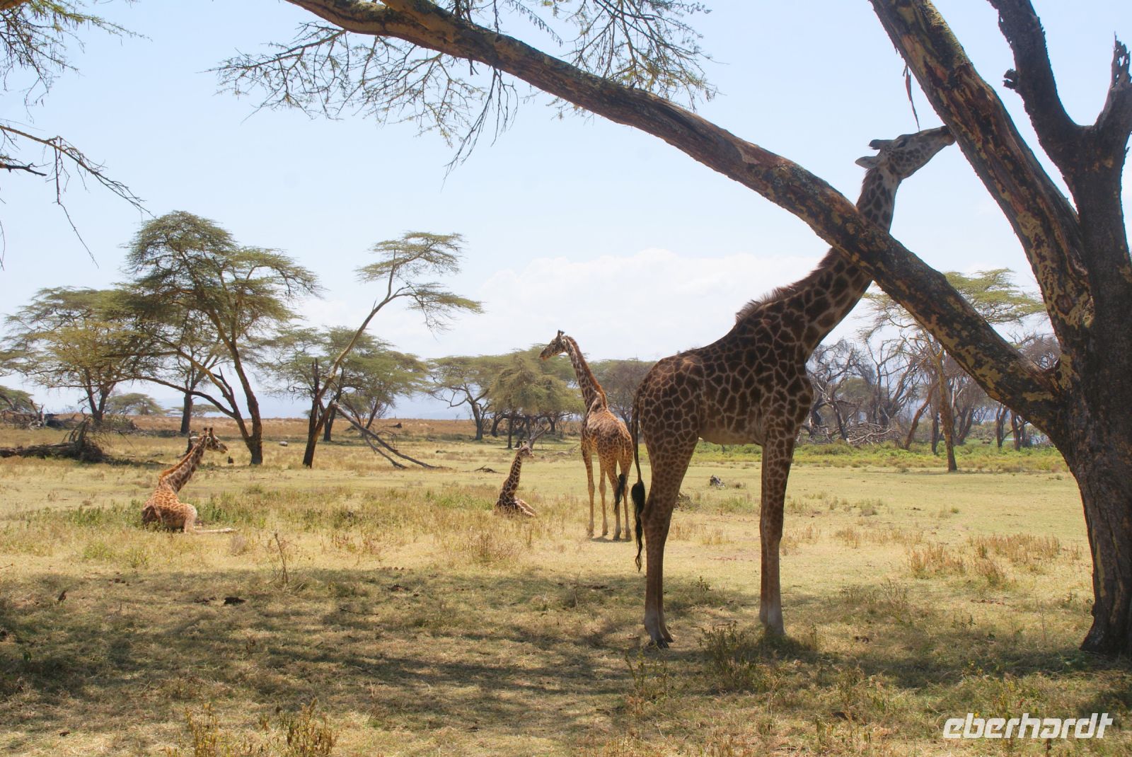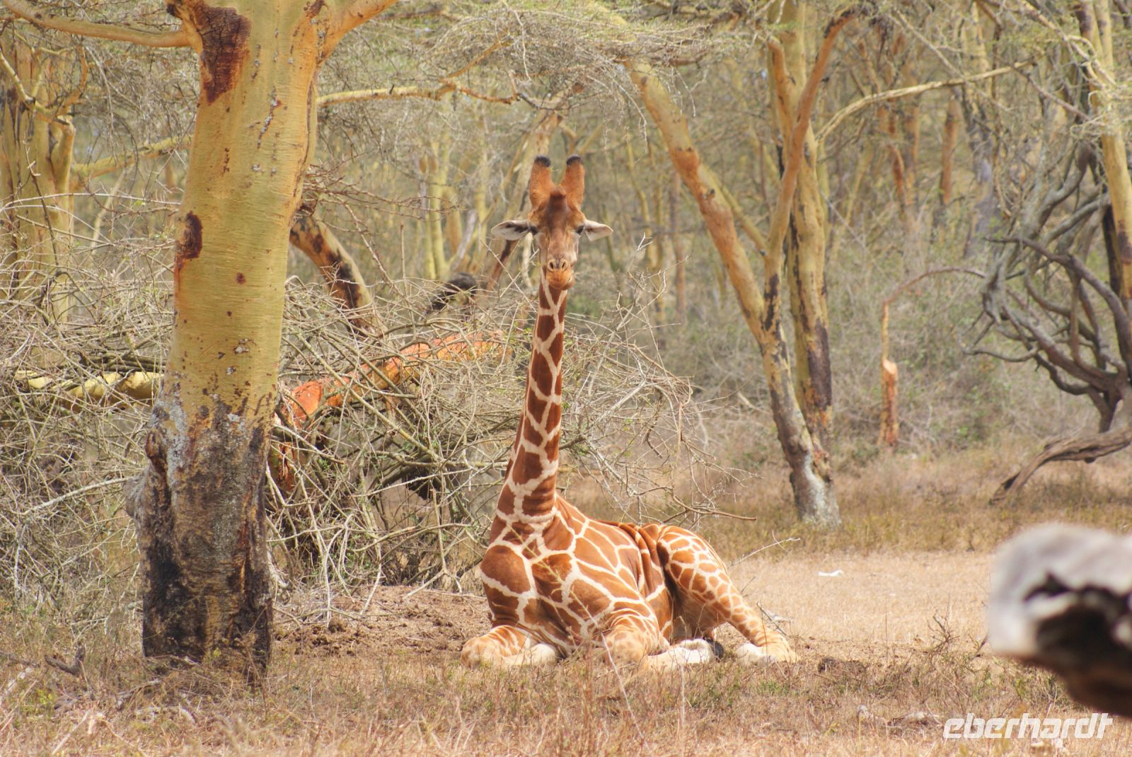 Vom reichhaltigen Buffet gestärkt, starten wir zunächst mit einer einstündigen Bootsfahrt, auf der uns unsere Bootsführer die Tiere der Umgebung näher bringen. Der Naivasha See fast 139 Km² und liegt auf 1880 m Höhe. Er ist einer der zwei höchsten Süßwasserseen Afrikas und im afrikanischen Grabenbruch gelegen. Neben vielen Vögeln und dem besonderen Goliath Reiher, sehen wir zahlreiche Hippos am Uferrand. Mit Erreichen der „Halbmondinsel“ Crescent Island, werden wir von einem örtlichen Guide in Empfang genommen, der uns nun zwei Stunden auf unserer Safari zu Fuß begleitet. Wir befinden uns hier an einem der original Drehplätze von Filmen wie „Jenseits von Afrika“, „Die Löwin Elsa“ oder „Tomb Raider“, deren Sequnenzen einst hier entstanden sind. Wir können uns unbeschwert bewegen, denn es gibt hier keine gefährlichen Tiere. So genießen wir die ruhige Atmosphäre und sind im Grunde alleine auf der knapp 40 Hektar großen Insel. Fünf Giraffen begegnen uns und sind völlig entspannt mit unserem nahen Herantreten. So entstehen herrliche Aufnahmen mit den Tieren und der schönen Kulisse. Unsere Bootsfahrer bringen uns wieder zurück zum Festland, nicht ohne vorher noch die schon wartenden Schreiseeadler zu füttern. Diese werden durch Pfeifen und werfen verschiedener Fische angelockt, was auch prompt gelingt. Zurück an Land geht es am frühen Nachmittag zurück in die Lodge zu einem späteren Mittagessen. Anschließend hat sich die Gruppe für einen freien Nachmittag entschieden, sodass jeder die Möglichkeit hat, die Anlage auf seine Art und Weise, sei es am Pool oder im Garten, mit den Tieren zu genießen. Abends finden wir uns zum Essen wieder ein und schließen unseren Aufenthalt hier am Lake Naivasha mit einem kühlen Getränk ab.