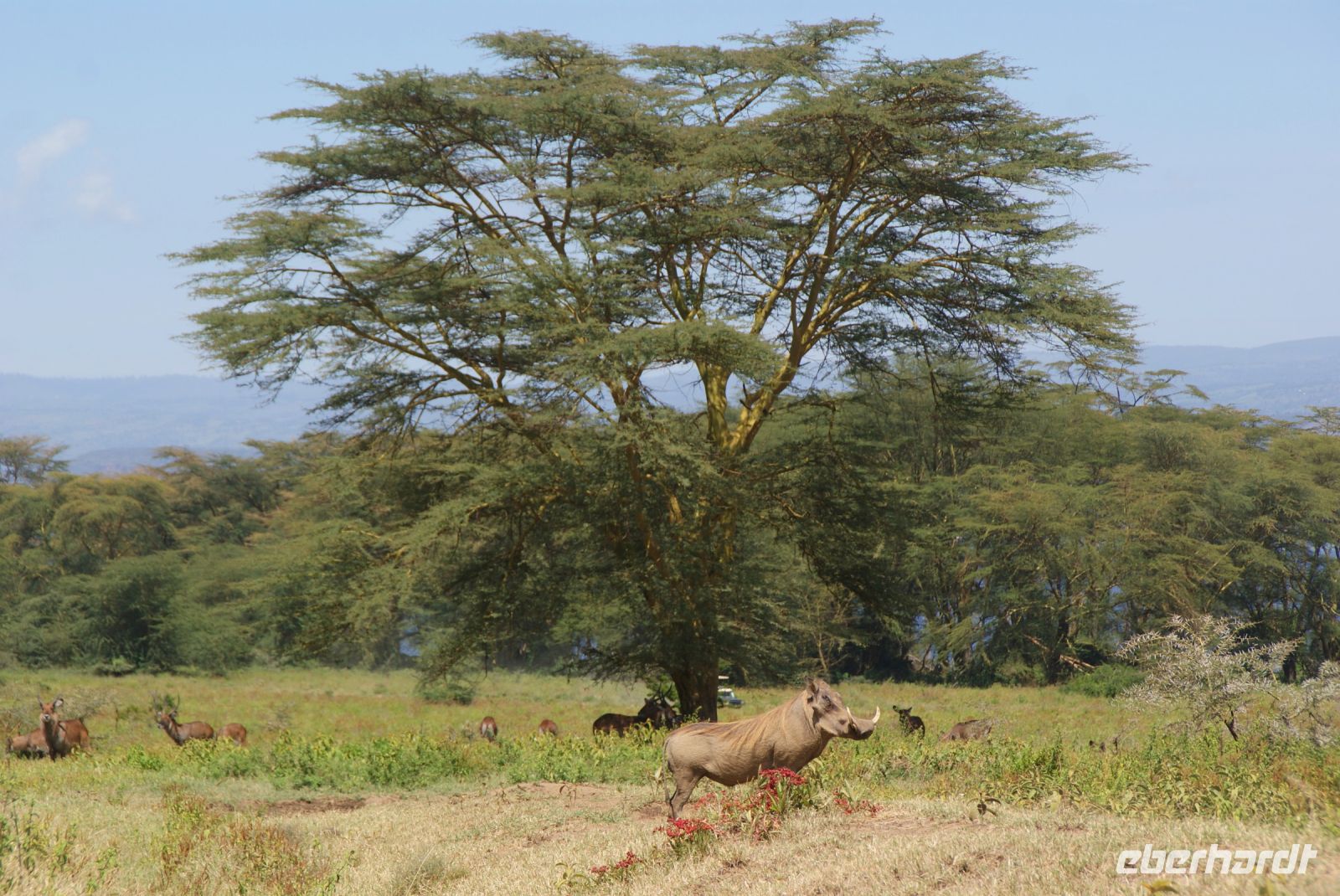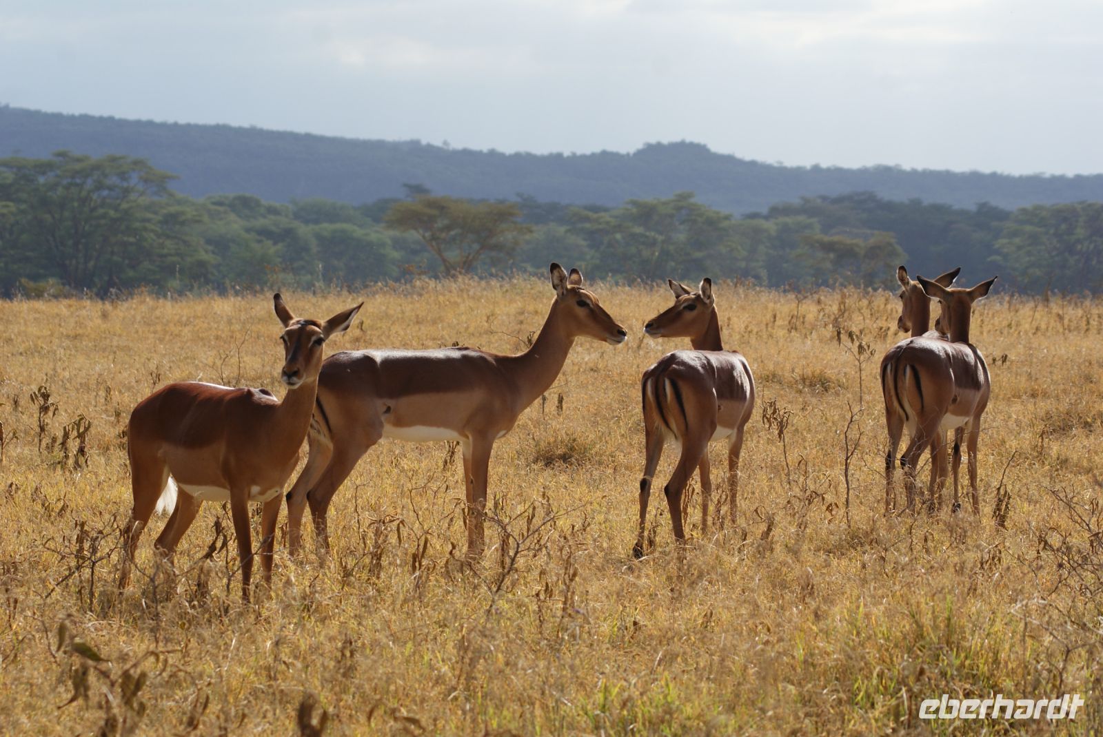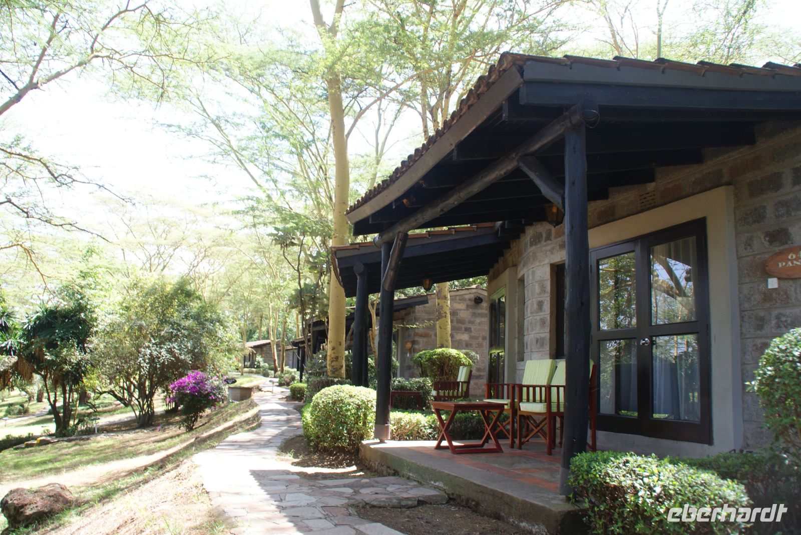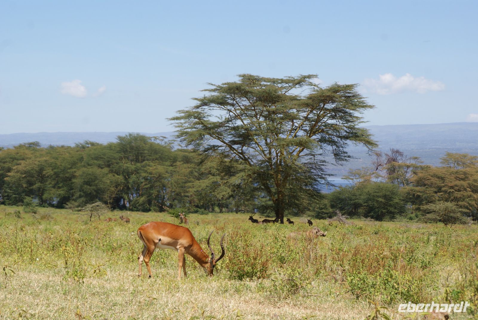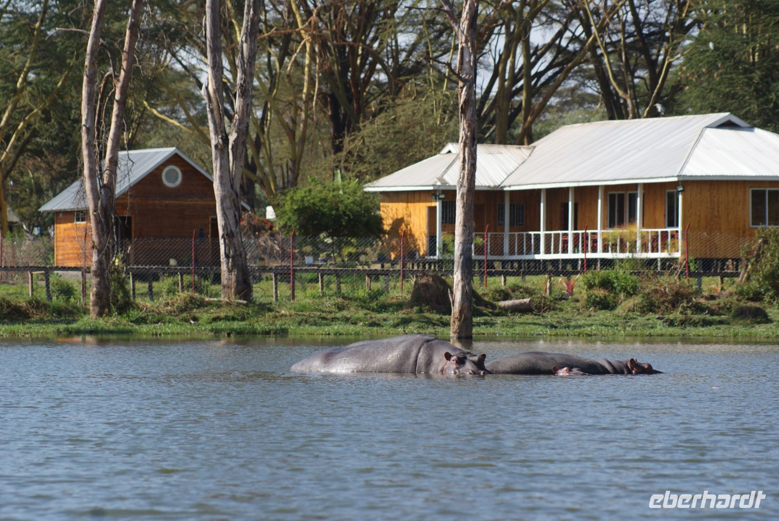 Nur ungern verlassen wir das schöne Camp, die unvergleichbare Masai Mara… Gut gestärkt geht es in Richtung Lake Naivasha. Kurz nach Verlassen des Camps treffen wir auf eine Elefantenherde mit Müttern und Jungtieren-eine wunderbar friedliche Morgenstimmung und ein gutes Omen für den Tag. Das Reservat verlassend sehen wir abschließend noch die drei Gepardenbrüder, die wir Eingangs schon getroffen haben. Diese liegen genüsslich im Schatten einer Akazie und lassen sich nicht aus der Ruhe bringen. Welch gelungener Abschluss unserer Zeit hier, die wir sicherlich nie vergessen werden. Unsere Reise führt uns nun zum 250 Km entfernten Lake Naivasha, wo wir mittags im Naturreservat ankommen. Welch tolle Kulisse uns empfängt. Tiere wie Topis, Wasserböcke, Zebras, grüne Meerkatzen laufen in der Anlage herum, in der wir und die Tiere sich frei bewegen können. Zum See werden wir jedoch begleitet, da auch Flusspferde unterwegs sein können und Sicherheit nun einmal vorgeht. Da wir zwei Nächte hier verbringen, können wir auch diese Anlage in Ruhe an unserem freien Nachmittag genießen und uns einleben. Vom leckeren Buffet greifen wir gerne zu, denn so viele Erlebnisse des Tages machen hungrig. Zu unseren Zimmern werden wir bei Dunkelheit durch Guides der Anlage gebracht, denn so manches Tier ist inzwischen schon nah der Häuser unterwegs.