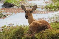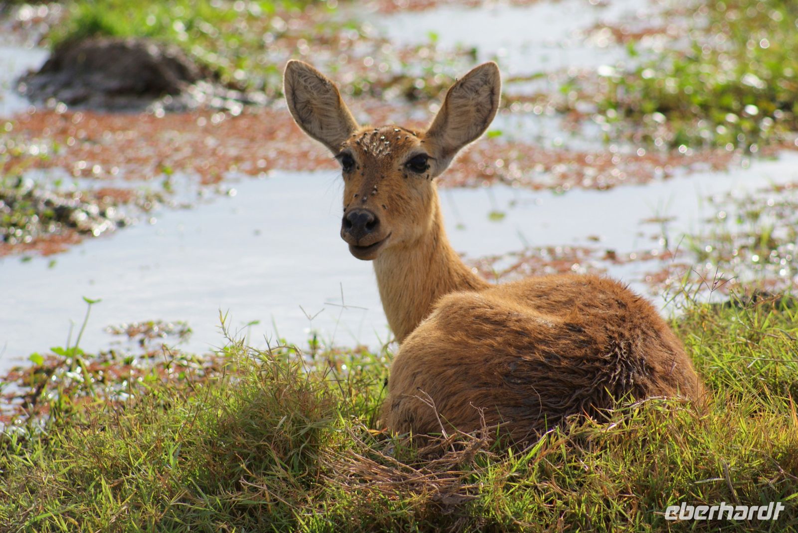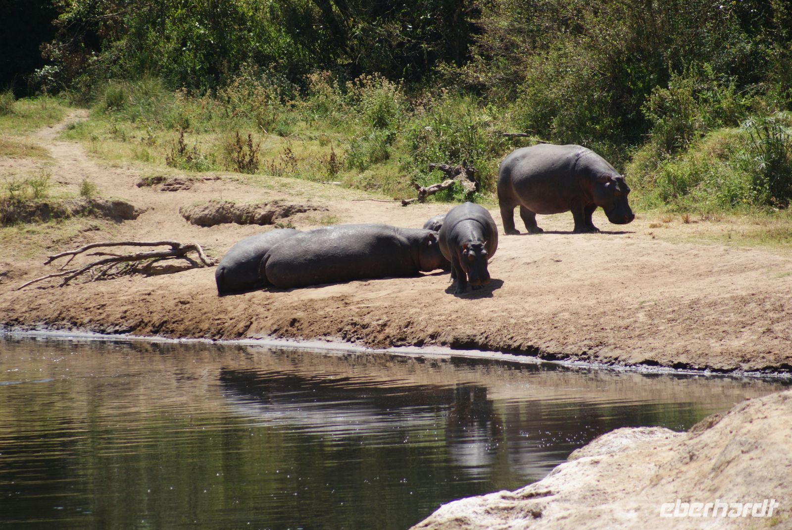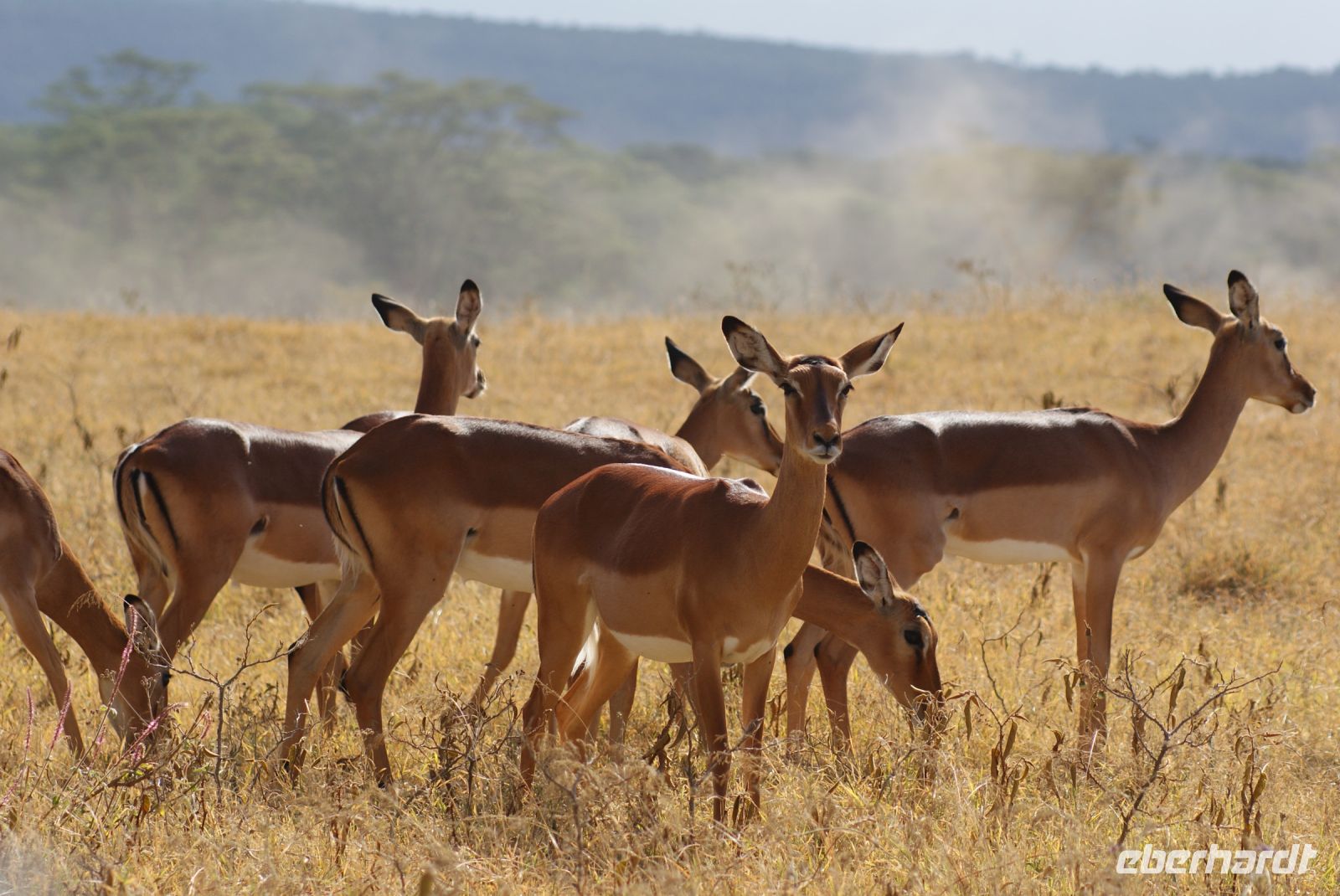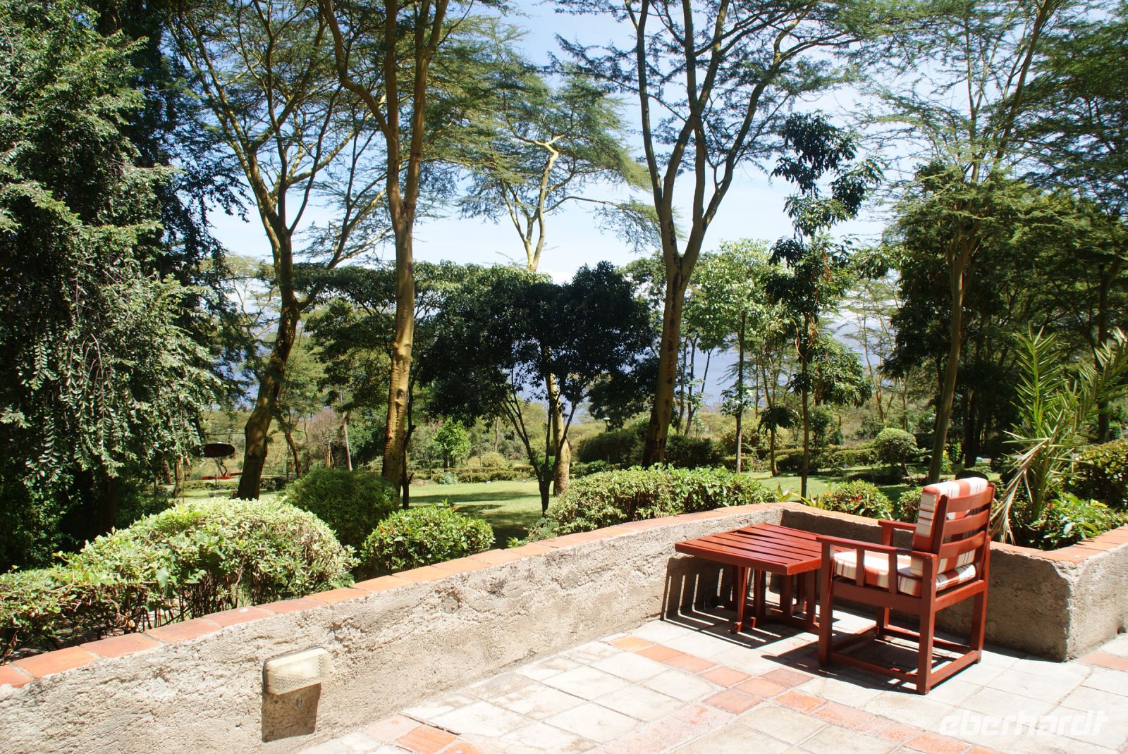 Nur ungern verlassen wir das schöne Camp, die unvergleichbare Masai Mara… Gut gestärkt geht es in Richtung Lake Naivasha. Kurz nach Verlassen des Camps treffen wir auf eine Elefantenherde mit Müttern und Jungtieren-eine wunderbar friedliche Morgenstimmung und ein gutes Omen für den Tag. Das Reservat verlassend sehen wir abschließend noch die drei Gepardenbrüder, die wir Eingangs schon getroffen haben. Diese liegen genüsslich im Schatten einer Akazie und lassen sich nicht aus der Ruhe bringen. Welch gelungener Abschluss unserer Zeit hier, die wir sicherlich nie vergessen werden. Unsere Reise führt uns nun zum 250 Km entfernten Lake Naivasha, wo wir mittags im Naturreservat ankommen. Welch tolle Kulisse uns empfängt. Tiere wie Topis, Wasserböcke, Zebras, grüne Meerkatzen laufen in der Anlage herum, in der wir und die Tiere sich frei bewegen können. Zum See werden wir jedoch begleitet, da auch Flusspferde unterwegs sein können und Sicherheit nun einmal vorgeht. Da wir zwei Nächte hier verbringen, können wir auch diese Anlage in Ruhe an unserem freien Nachmittag genießen und uns einleben. Vom leckeren Buffet greifen wir gerne zu, denn so viele Erlebnisse des Tages machen hungrig. Zu unseren Zimmern werden wir bei Dunkelheit durch Guides der Anlage gebracht, denn so manches Tier ist inzwischen schon nah der Häuser unterwegs.