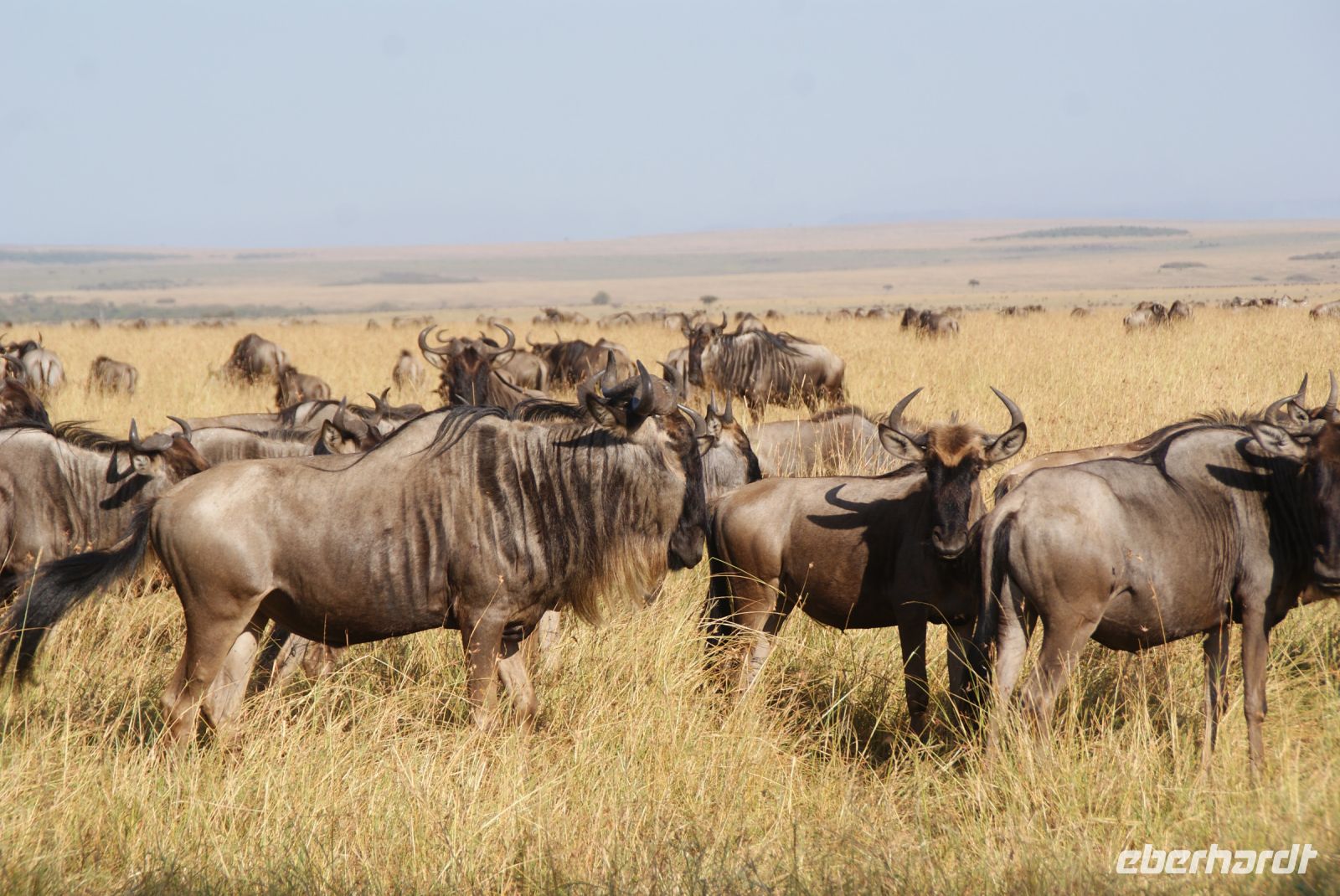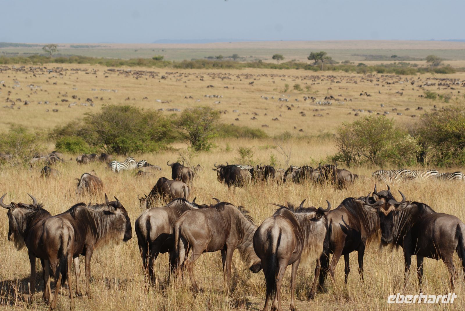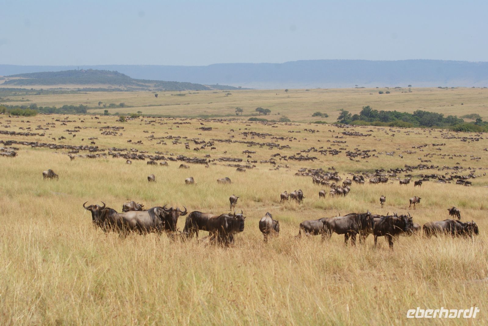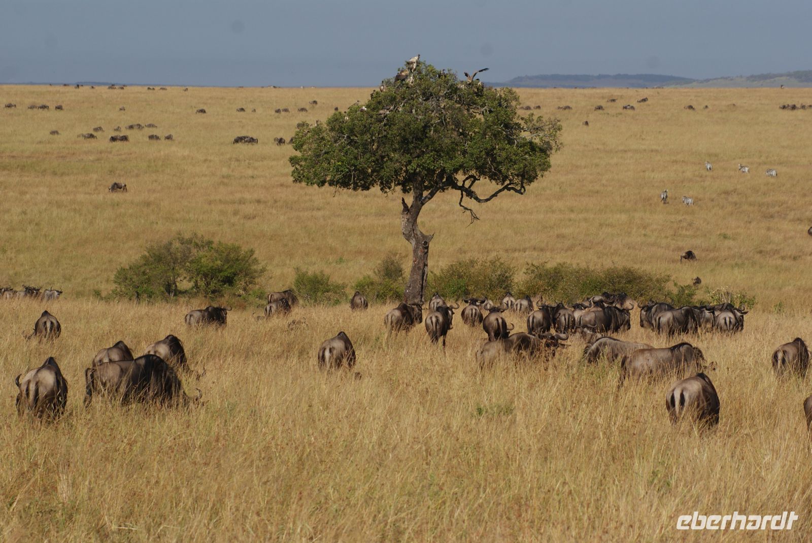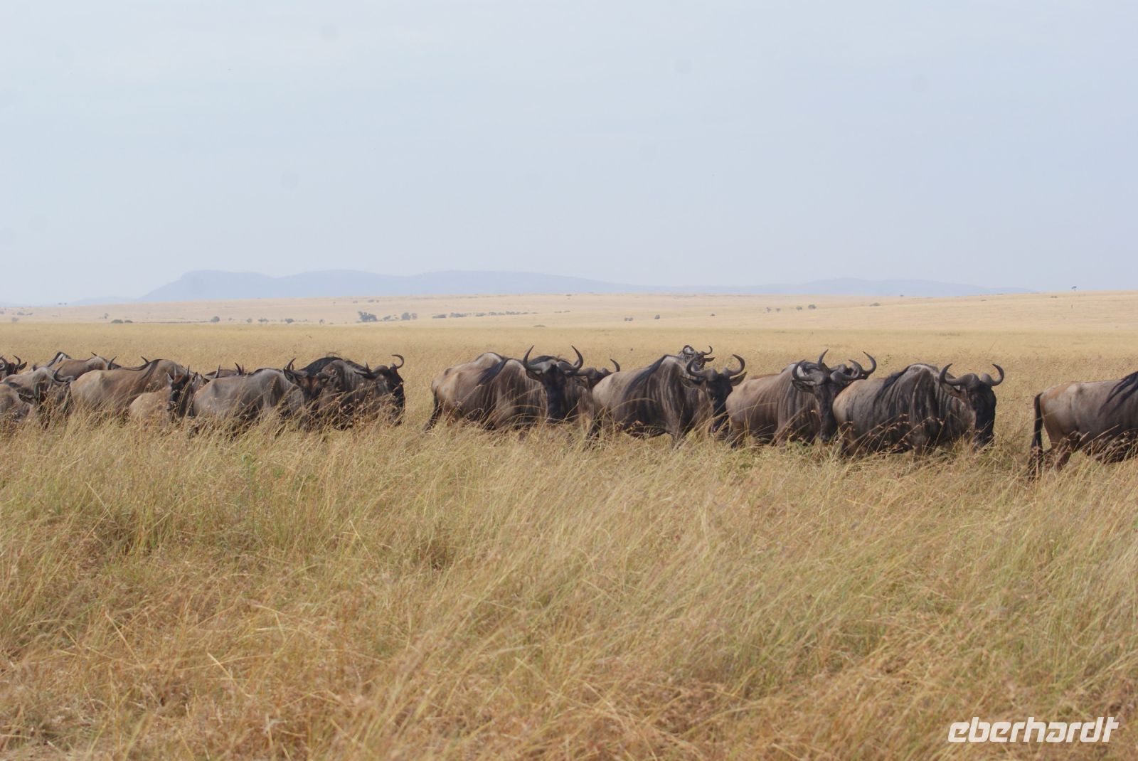 Unser Blick schweift auf den schier endlosen Horizont der Masai Mara...Die Migration der Tiere hat begonnen und tausende Gnus ziehen an uns vorbei, kreuzen den Mara Fluss. Elefantenherden begegnen uns