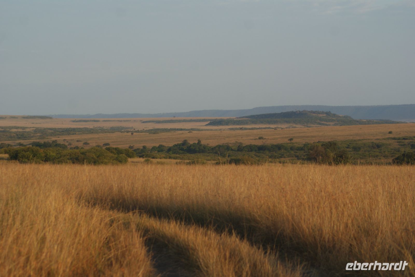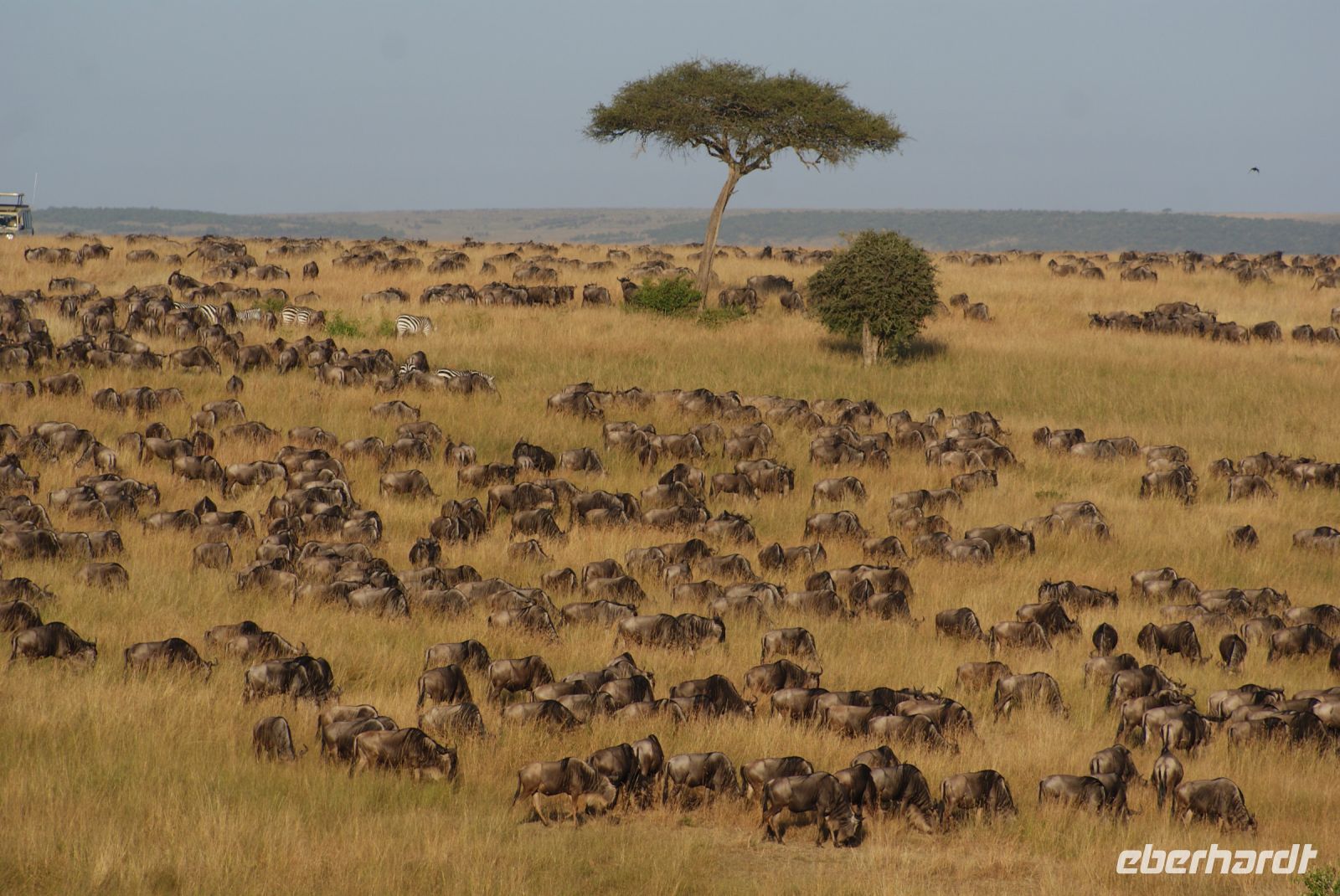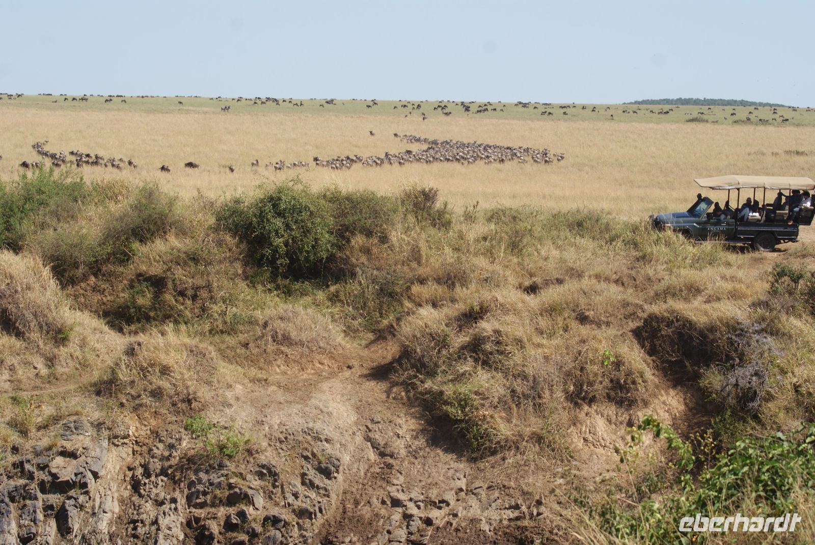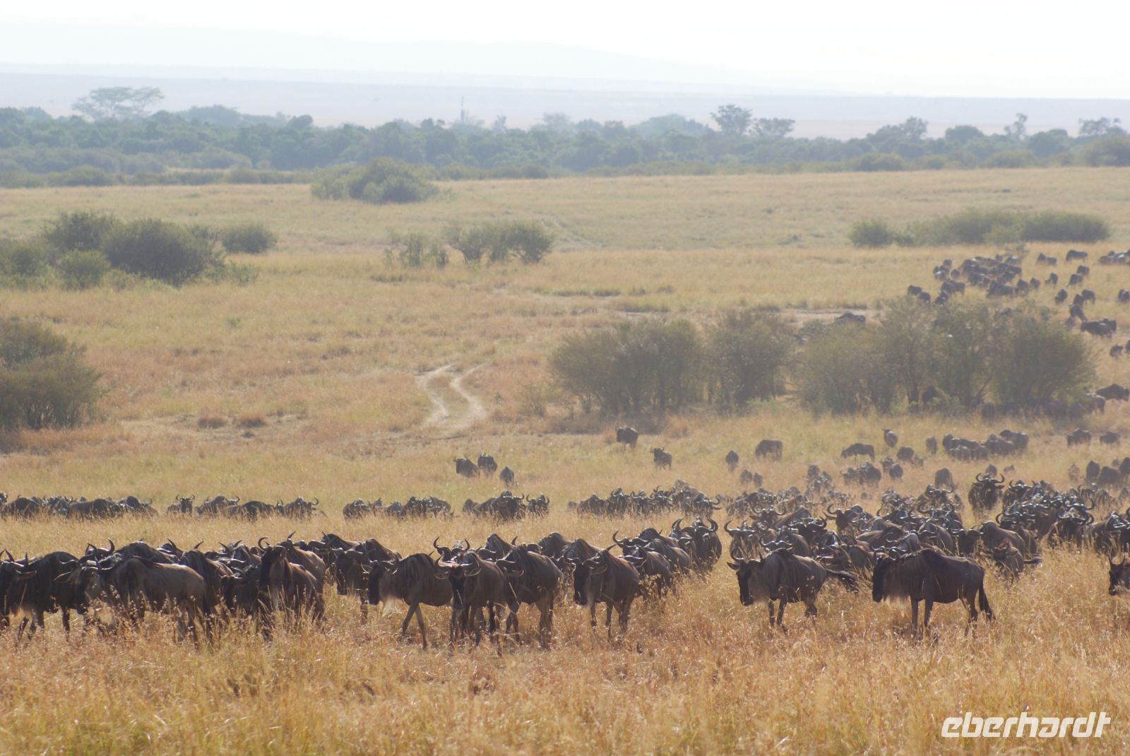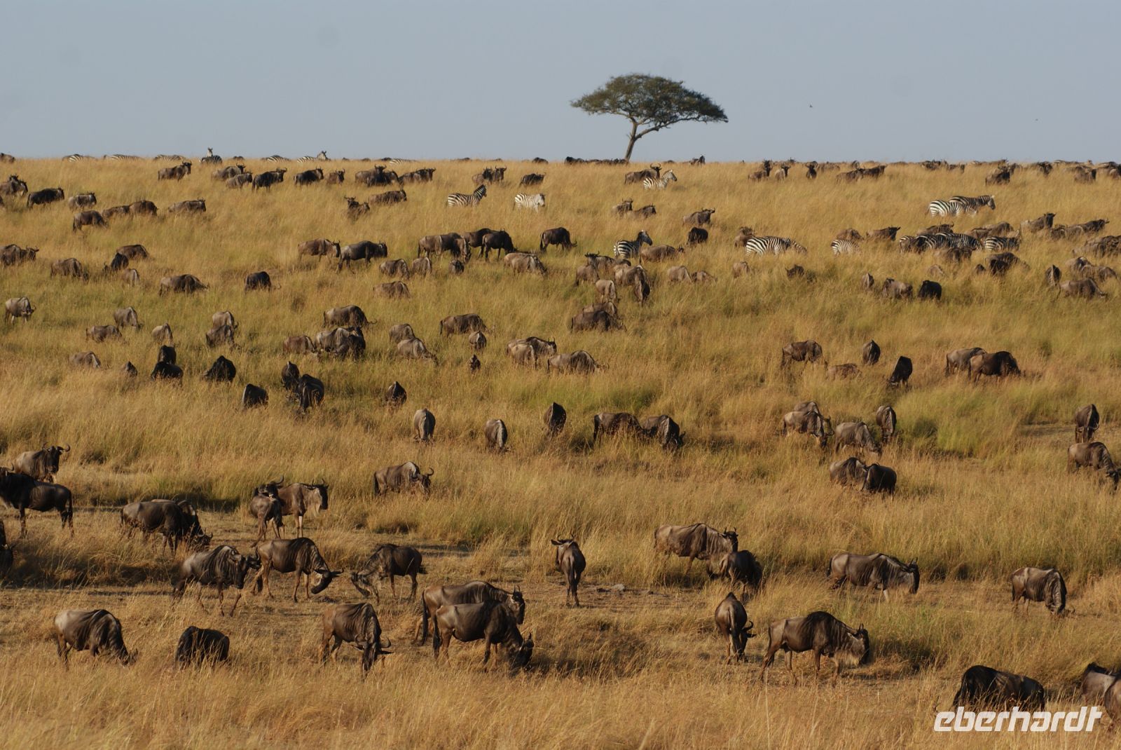 Unser Blick schweift auf den schier endlosen Horizont der Masai Mara...Die Migration der Tiere hat begonnen und tausende Gnus ziehen an uns vorbei, kreuzen den Mara Fluss. Elefantenherden begegnen uns