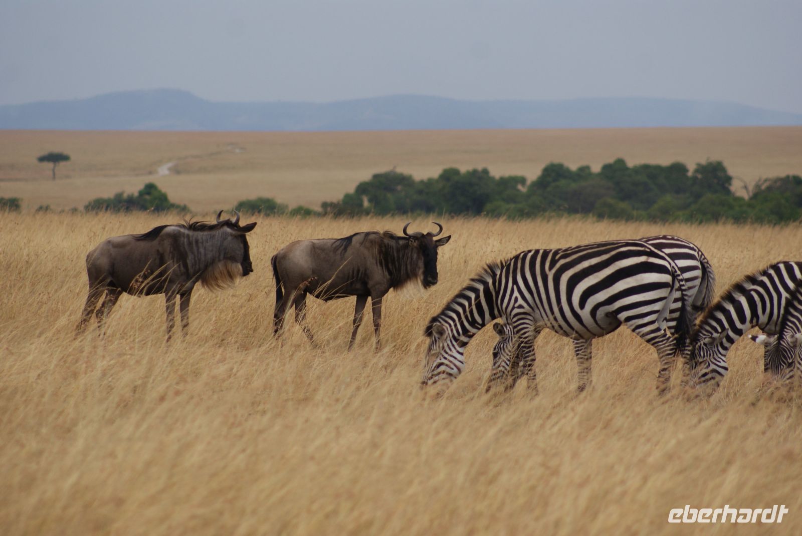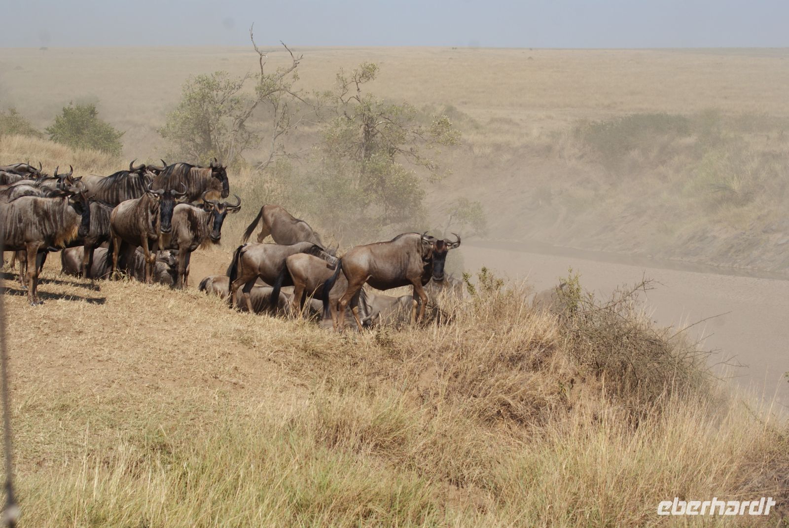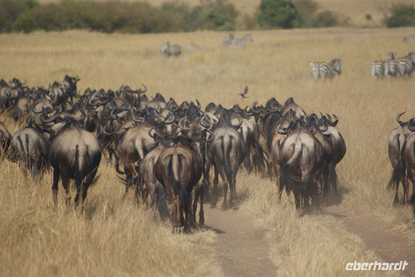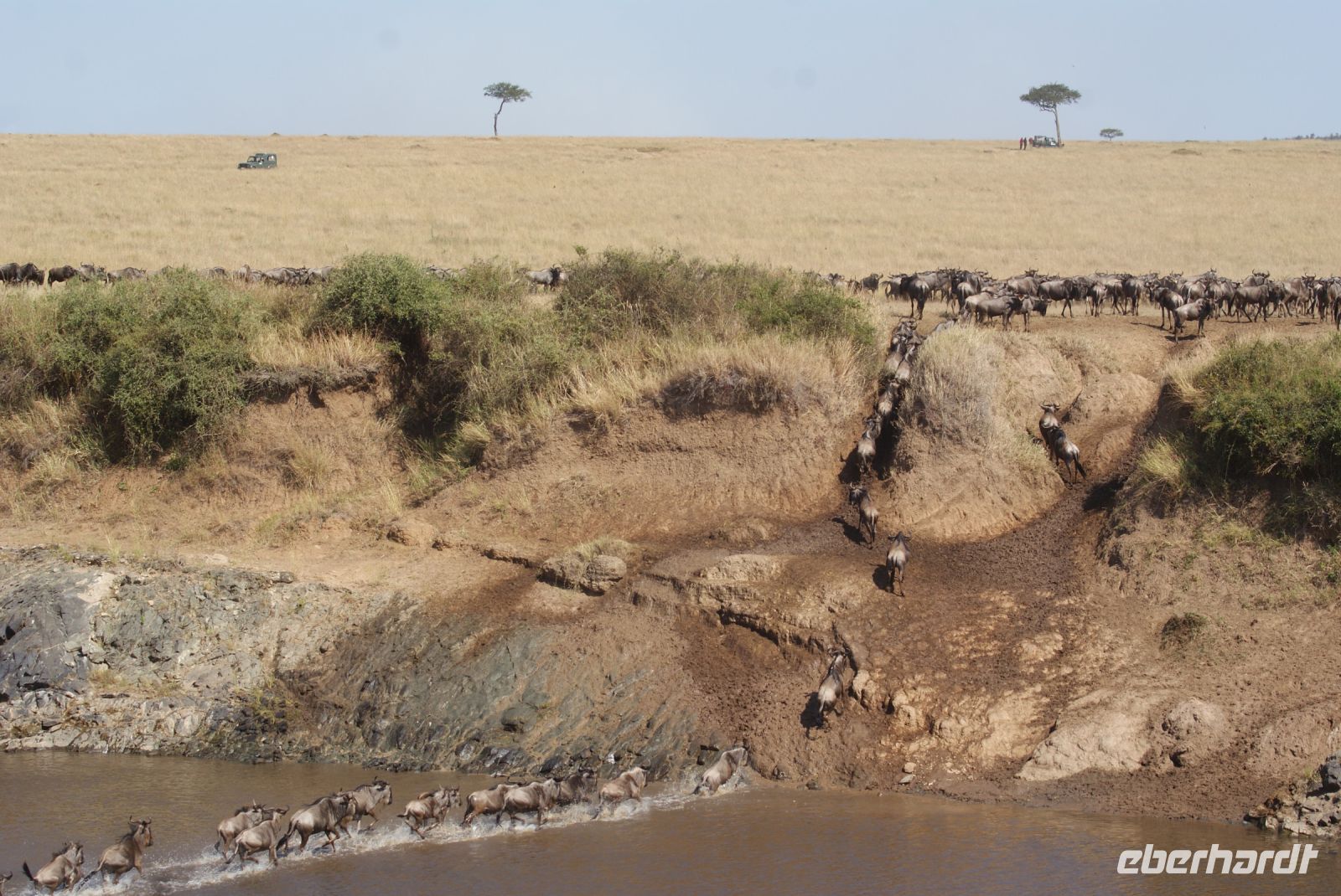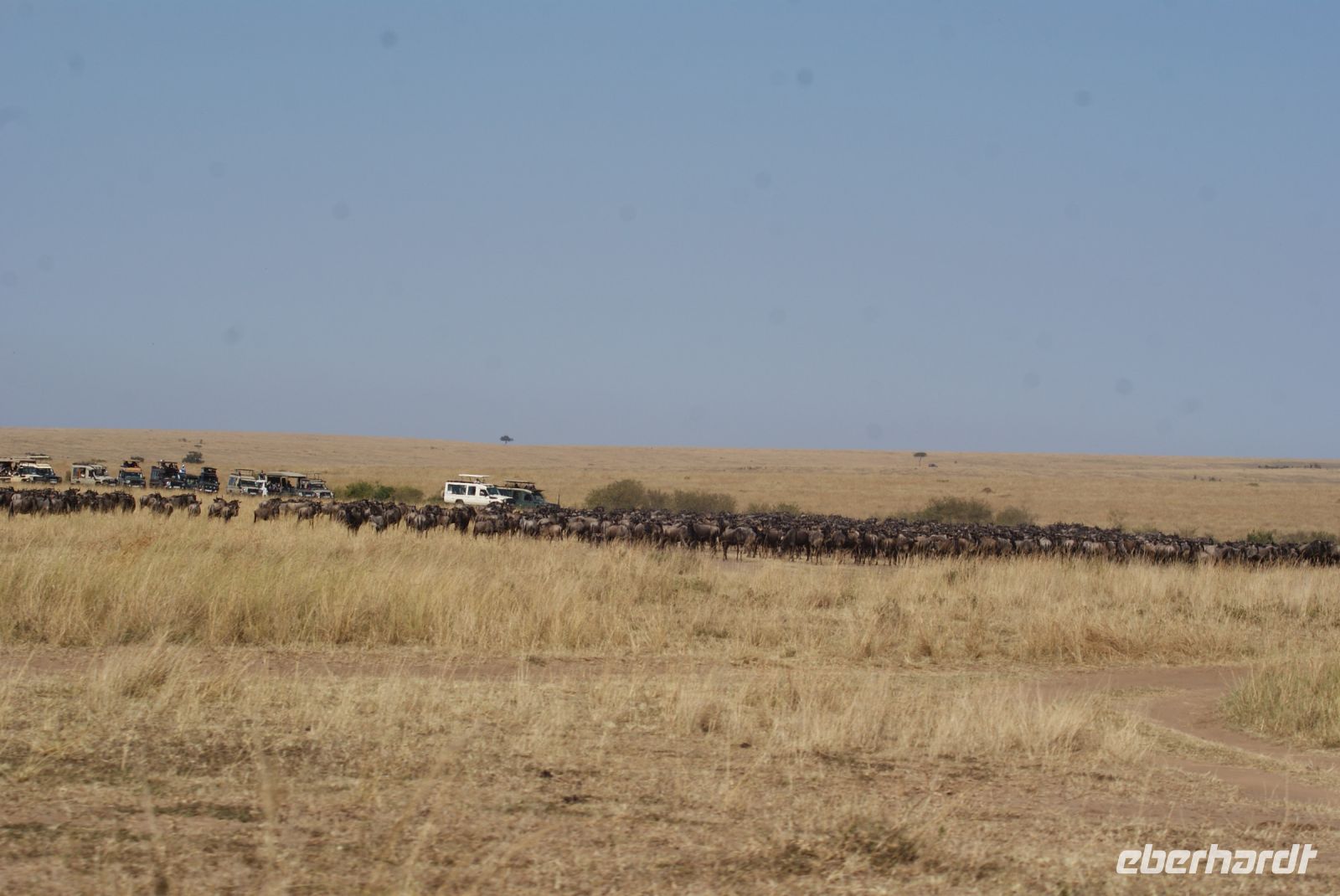 Unser Blick schweift auf den schier endlosen Horizont der Masai Mara...Die Migration der Tiere hat begonnen und tausende Gnus ziehen an uns vorbei, kreuzen den Mara Fluss. Elefantenherden begegnen uns