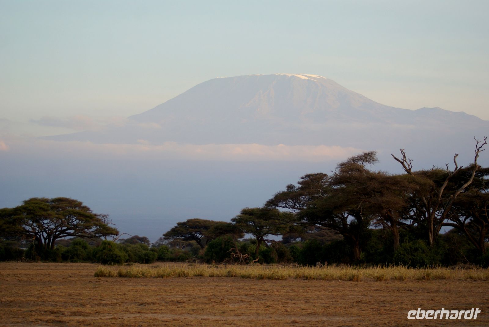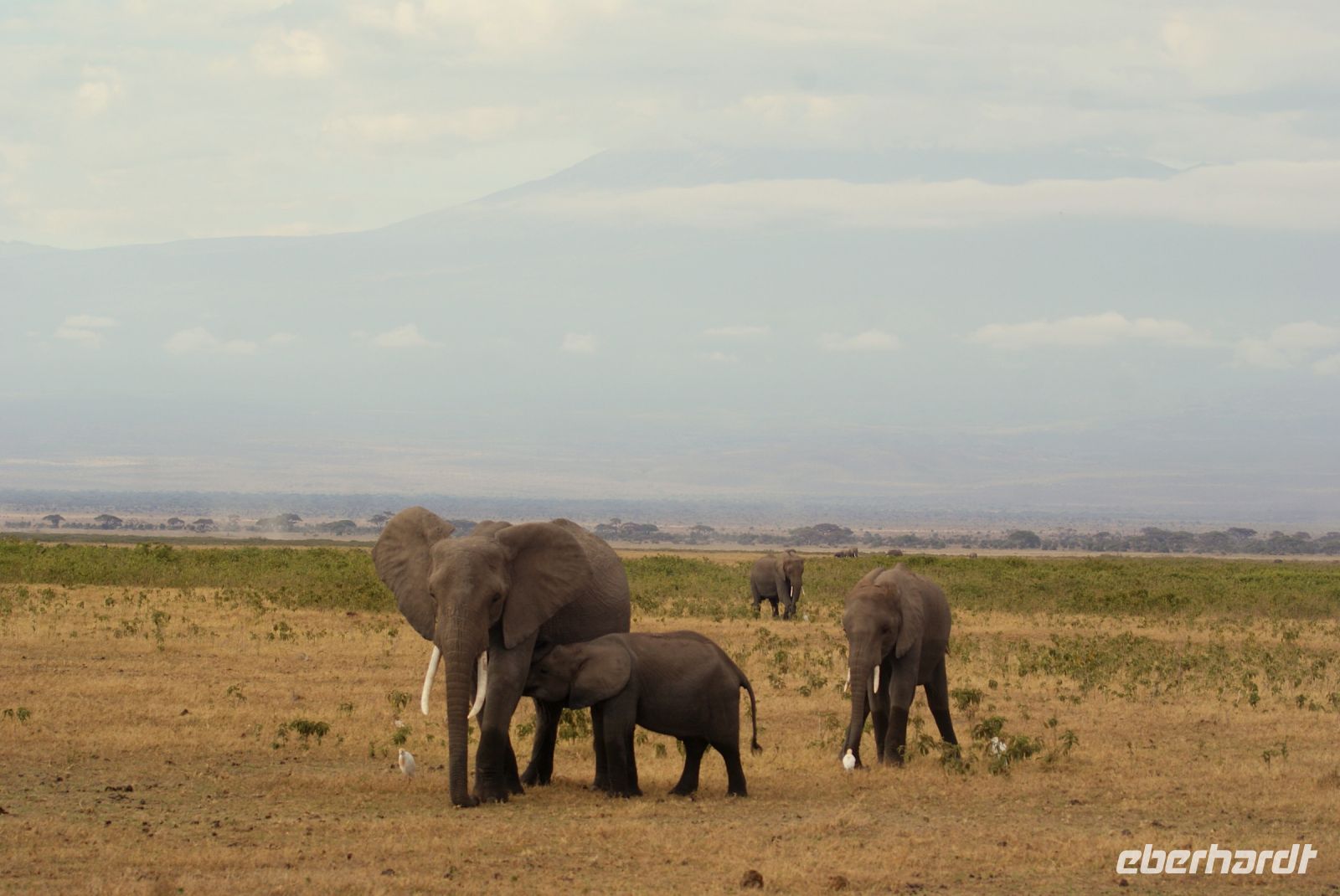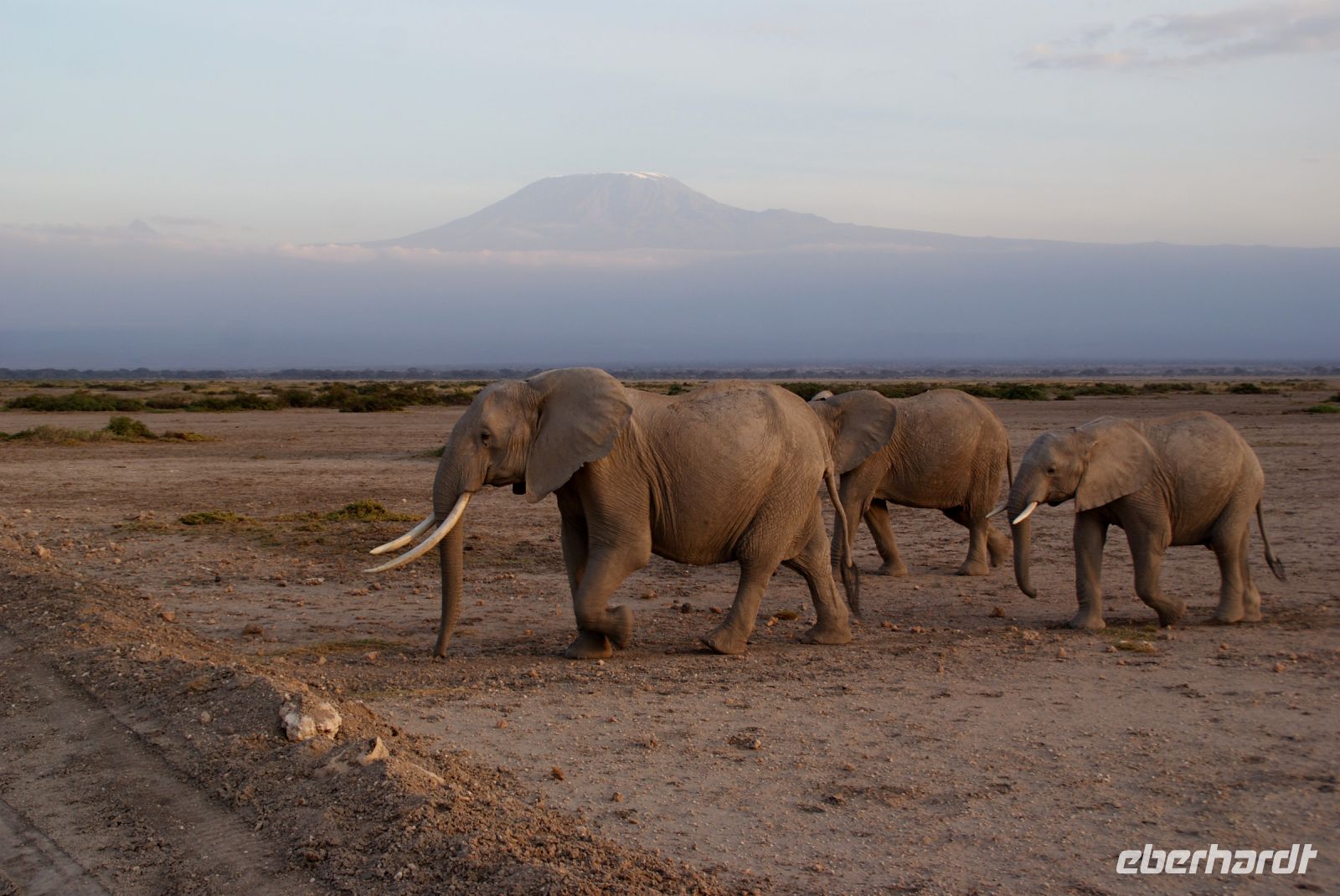 Bestens geschlafen und gefrühstückt, mit großer Auswahl, starten wir gut gelaunt zur Morgensafari in den Amboseli Nationalpark. Der Name Amboseli bedeutet so viel wie staubiger Platz oder Windhose. Von beidem sehen wir eine Menge und besonders die plötzlich auftauchenden Windhosen sind beeindruckend. Dieser kleine Park hält für uns am heutigen Morgen schon einige Überraschungen bereit. So sehen wir etliche Elefantenherden, teils in unmittelbarer Nähe, die von unserer Anwesenheit keinerlei Notiz nehmen. So können wir diese in Ruhe ausgiebig beobachten. Das Gleiche gilt für einige Zebra-und Weißbartgnuherden und die friedvolle Atmosphäre ist einfach herrlich. Mount Kilimandscharo lässt auf sich warten und ist größten Teils schon frei, die schneebedeckte Spitze jedoch noch immer hinter Wolken verschwunden. Es ist jedoch insofern von Vorteil, da hier herrlich angenehme Temperaturen herrschen und somit auch die Tiere keine Notwendigkeit sehen, sich im Schatten vor uns zu verstecken. Seit einigen Jahren haben sich ungewöhnlicher Weise Flamingos in den hier vorhandenen Sumpfgebieten niedergelassen und so haben wir nochmals eine schöne Gelegenheit, diese sehr nah zu fotografieren. Da das hier vorhandene Wasser vom Kilimandscharo herunterfließt und der Boden salzhaltig ist, finden die schönen Vögel die entsprechende Nahrung sowie Krebstiere vor. Wir halten am View Point Hill und steigen über gut ausgebaute Treppen auf den Hügel hinauf, von dem aus wir einen imposanten Blick über die Weite des Amboseli Nationalparks haben und uns nun auf 1150 m Höhe befinden. Unter uns ziehen Elefantenherden vorbei und es herrscht eine herrliche morgendliche Stimmung. Mittags kehren wir zur Siesta in unser Camp zurück, stärken uns, bevor es dann nachmittags erneut in den Park zu unserer Nachmittagssafari geht. Schon bald zeigt sich uns der Kibo, die höchste Erhebung des Kilimandscharo Massivs mit 5895 m Höhe. Welch ein Anblick, den höchsten Berg Afrikas, vor uns zum Greifen nah zu betrachten. Guide Caleb führt uns wieder mal zu den schönsten Fotomotiven, sodass wir den Berg mit Elefanten davor fotografieren können. Überhaupt haben wir wunderbare Tiersichtungen am Nachmittag, sehen so manche Elefantenherde, eine Löwin, die drei Giraffen aufschreckt, zahlreiche Hippos, den seltenen Riedbock und viele weitere Tiere der Savanne. Wir kehren zurück in unser Camp und genießen den verbleibenden Abend mit Blick auf den Kilimandscharo am Rande des Amboseli Nationalparks.