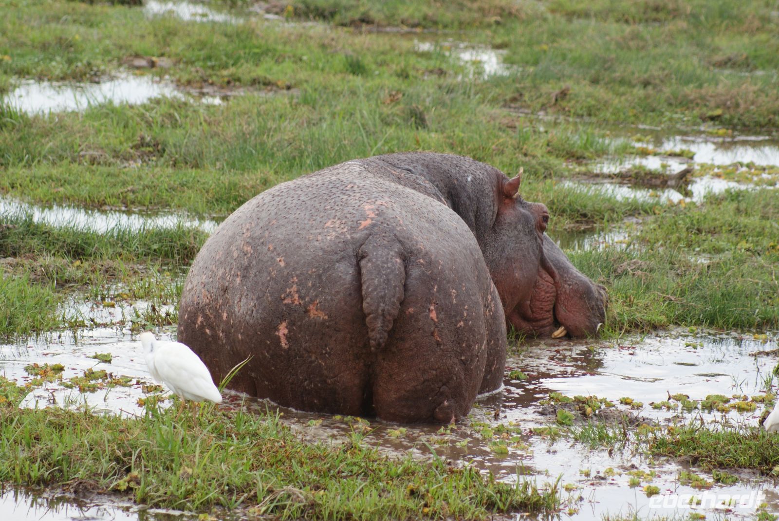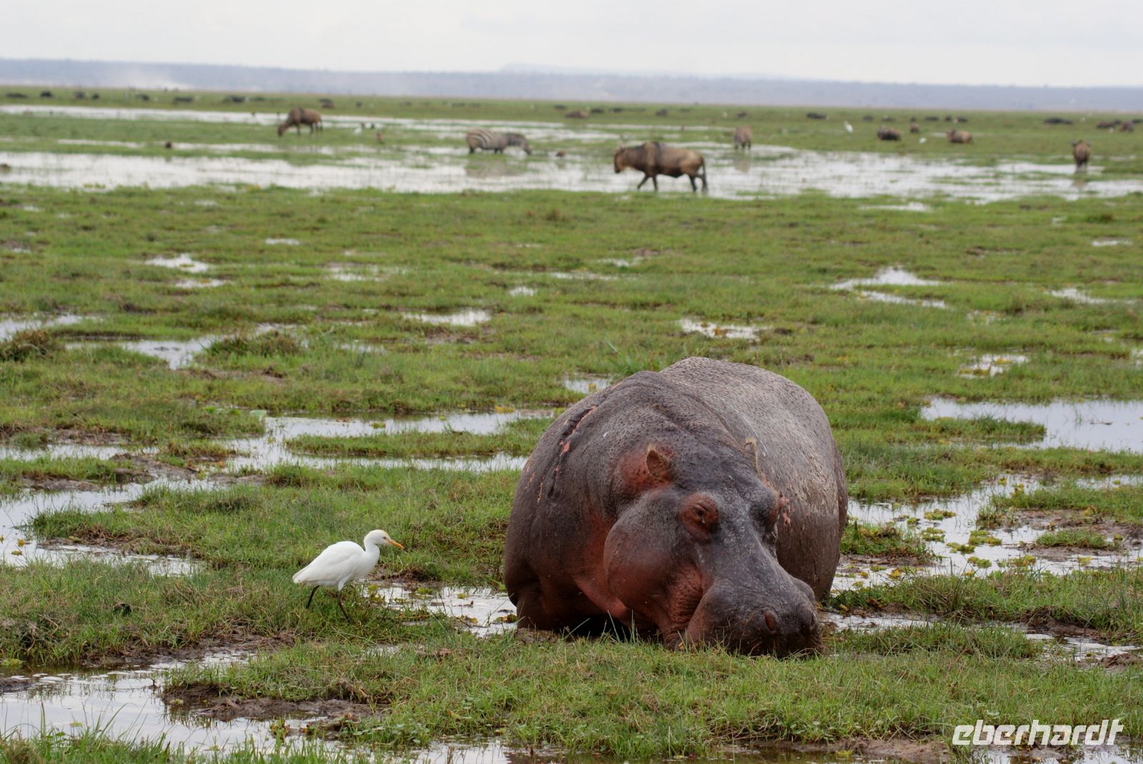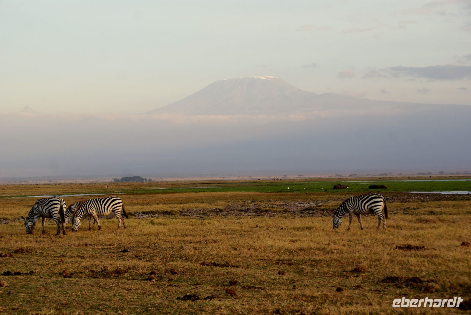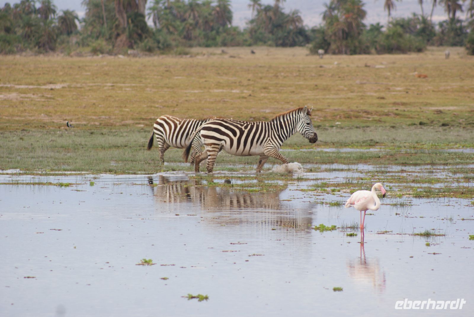 Bestens geschlafen und gefrühstückt, mit großer Auswahl, starten wir gut gelaunt zur Morgensafari in den Amboseli Nationalpark. Der Name Amboseli bedeutet so viel wie staubiger Platz oder Windhose. Von beidem sehen wir eine Menge und besonders die plötzlich auftauchenden Windhosen sind beeindruckend. Dieser kleine Park hält für uns am heutigen Morgen schon einige Überraschungen bereit. So sehen wir etliche Elefantenherden, teils in unmittelbarer Nähe, die von unserer Anwesenheit keinerlei Notiz nehmen. So können wir diese in Ruhe ausgiebig beobachten. Das Gleiche gilt für einige Zebra-und Weißbartgnuherden und die friedvolle Atmosphäre ist einfach herrlich. Mount Kilimandscharo lässt auf sich warten und ist größten Teils schon frei, die schneebedeckte Spitze jedoch noch immer hinter Wolken verschwunden. Es ist jedoch insofern von Vorteil, da hier herrlich angenehme Temperaturen herrschen und somit auch die Tiere keine Notwendigkeit sehen, sich im Schatten vor uns zu verstecken. Seit einigen Jahren haben sich ungewöhnlicher Weise Flamingos in den hier vorhandenen Sumpfgebieten niedergelassen und so haben wir nochmals eine schöne Gelegenheit, diese sehr nah zu fotografieren. Da das hier vorhandene Wasser vom Kilimandscharo herunterfließt und der Boden salzhaltig ist, finden die schönen Vögel die entsprechende Nahrung sowie Krebstiere vor. Wir halten am View Point Hill und steigen über gut ausgebaute Treppen auf den Hügel hinauf, von dem aus wir einen imposanten Blick über die Weite des Amboseli Nationalparks haben und uns nun auf 1150 m Höhe befinden. Unter uns ziehen Elefantenherden vorbei und es herrscht eine herrliche morgendliche Stimmung. Mittags kehren wir zur Siesta in unser Camp zurück, stärken uns, bevor es dann nachmittags erneut in den Park zu unserer Nachmittagssafari geht. Schon bald zeigt sich uns der Kibo, die höchste Erhebung des Kilimandscharo Massivs mit 5895 m Höhe. Welch ein Anblick, den höchsten Berg Afrikas, vor uns zum Greifen nah zu betrachten. Guide Caleb führt uns wieder mal zu den schönsten Fotomotiven, sodass wir den Berg mit Elefanten davor fotografieren können. Überhaupt haben wir wunderbare Tiersichtungen am Nachmittag, sehen so manche Elefantenherde, eine Löwin, die drei Giraffen aufschreckt, zahlreiche Hippos, den seltenen Riedbock und viele weitere Tiere der Savanne. Wir kehren zurück in unser Camp und genießen den verbleibenden Abend mit Blick auf den Kilimandscharo am Rande des Amboseli Nationalparks.