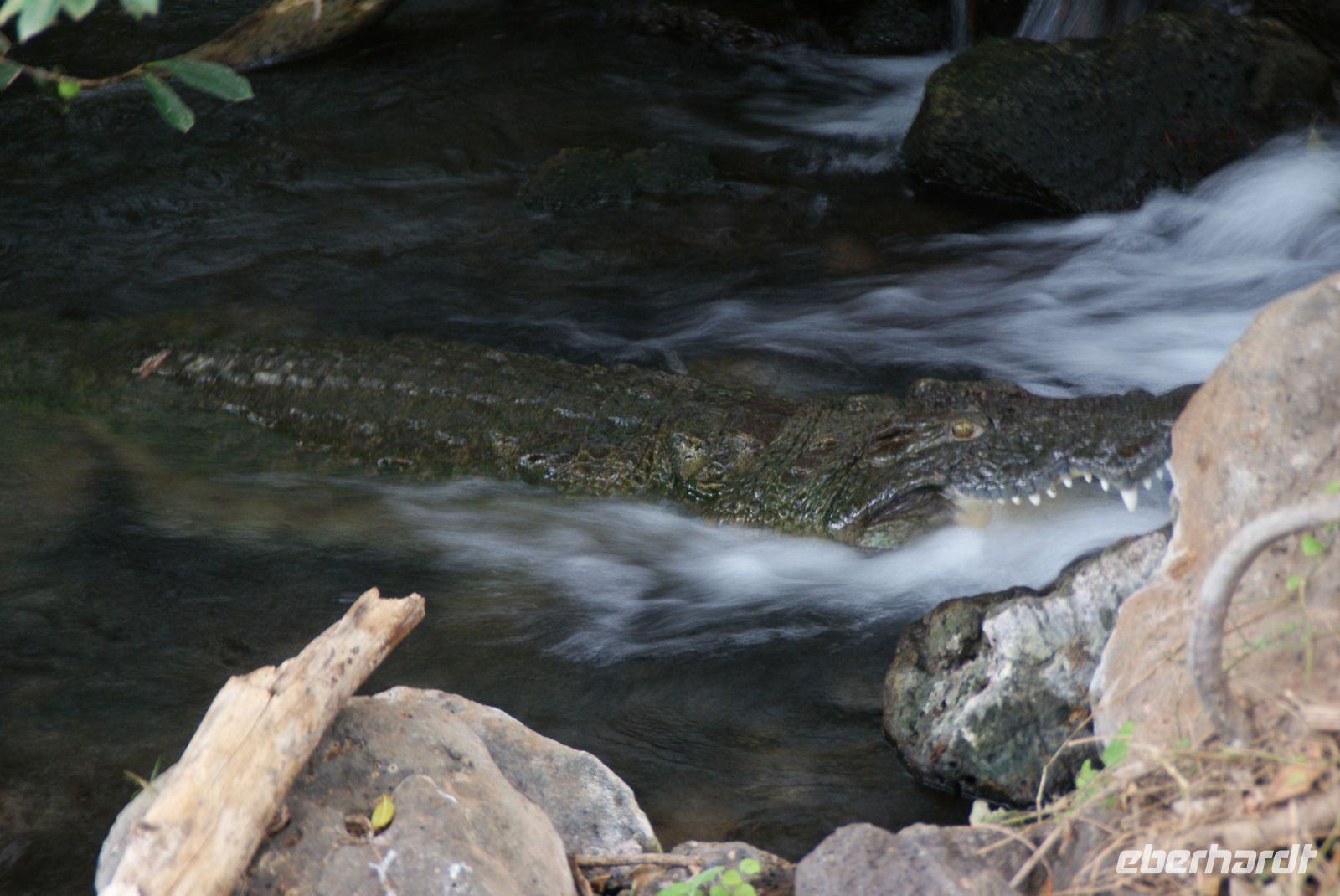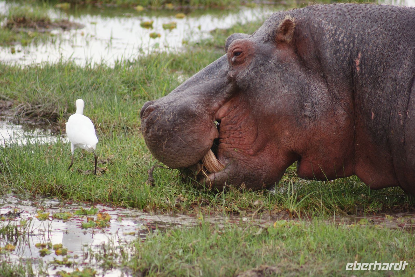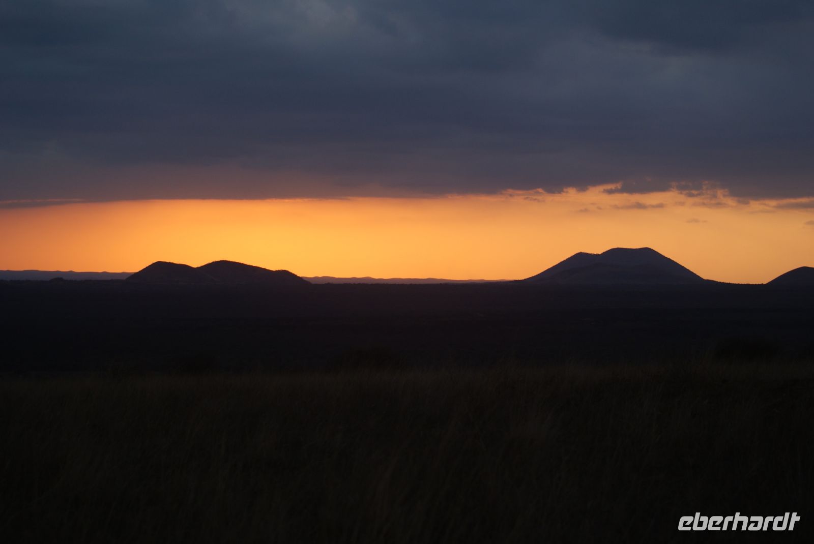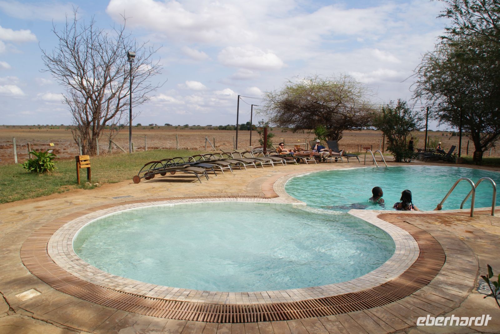 Unsere heutige recht kurze Fahrt führt uns in den, in der Nähe gelegenen 9000 Km² großen Tsavo West Nationalpark, der neben dem Tsavo Ost Nationalpark der 2.älteste Nationalpark Kenias ist und 1948 gegründet wurde. Der „Kili“ begleitet uns noch ein ganzes Stück in all seiner Pracht und schon bald verändert sich das Landschaftsbild. Die sogenannten Chyulu Hills und Buschlandschaft ziehen auf, rote Erde um uns herum. Nach Durchfahrt des Chyulu Tors und somit Einfahrt in den Nationalpark sehen wir nach kurzer Zeit bereits die ersten berühmten roten Elefanten, die durch die rote Erde ihre prägnante Farbe erhalten. Giraffen stehen unmittelbar am Wegesrand, Rotschnabeltokos werden gesichtet und bald passieren wir das Shentani Lavafeld, welches aufgrund eines Vulkanausbruchs vor ca. 200 Jahren entstanden ist. Ein imposantes Landschaftsbild, diesen breiten, erstarrten Lavastrom zu sehen, durch den sich unsere rote Straße schlängelt. Mittags erreichen wir die Kilaguni Serena Safari Lodge und können unseren Augen nicht trauen. Der Blick vom Restaurant und den Zimmern ist einfach unbeschreiblich. Jenseits von Afrika grüßt in vollen Zügen- eine Wahnsinnskulisse, die uns die afrikanische Savanne bietet, liegt direkt zu unseren Füßen. Zwei Wasserlöcher laden die Tiere zum Trinken ein und schon bald zeigen sich Büffelherden, Zebras, Impalas und die ersten roten Elefanten. Das alles direkt vor unseren Balkonen. Ein Traum, der nun wahr geworden ist. Wie aus dem Nichts taucht kurzer Hand eine Elefantenherde auf, die mit dreißig Tieren zum Wasserloch zieht-wir sind nur noch sprachlos. Nach einer Mittagsrast mit besagter wunderschönen Kulisse geht es auf zur Nachmittagssafari durch den Busch von Tsavo West. Ein Teil von uns bleibt in der Lodge und genießt den Ausblick von hier aus auf die endlos ankommenden Elefantenherden. Der andere Teil zieht mit Guide Caleb und mir erneut in die Savanne. Wir sehen ebenfalls einige Elefantenherden, dazu Kudus, Oryxantilopen, Dik Diks und einige Giraffen. Es erfolgt ein Spaziergang an den Mzima Springs, den Mzima Quellen, dessen Wasser vom Kilimandscharo kommend die Bewohner Mombasas mit Trinkwasser versorgt. Ranger Mustafa führt uns bewaffnet, um uns vor wilden Tieren zu schützen und die Waffe dient gleichzeitig auch dazu, das Trinkwasserdepot, welches sich dort befindet, vor Verunreinigung durch Übeltäter zu beschützen. Die Mzima Quellen fließen in den Tsavo Fluss, der das Wasser durch ein natürliches Gefälle bis nach Mombasa trägt. Hier an den Quellen entlang sehen wir grüne Meerkatzen, Flusspferde und auch ein großes Krokodil, welches in der Strömung mit offenem Maul auf Fische wartet. Alles in allem ist es ein schöner Spaziergang und wir sind dankbar, uns in so schöner Natur die Beine vertreten zu dürfen. Begleitet von einem wunderschönen Sonnenuntergang schließen wir die Nachmittagssafari ab und zurück in der Lodge ist das Wasserloch noch immer gut mit Elefanten bevölkert, selbst die untergehende Sonne hat noch auf unser Eintreffen gewartet. Das Abendessen nehmen wir mit Blick auf das beleuchtete Wasserloch ein und staunen noch immer, dass das Kommen und Gehen der Tiere nicht abreißt. Unzählige Elefanten, dazu Büffel, sogar Hyänen finden sich ein. Mal sehen, ob wir heute Nacht mit solchem Ausblick überhaupt schlafen werden.