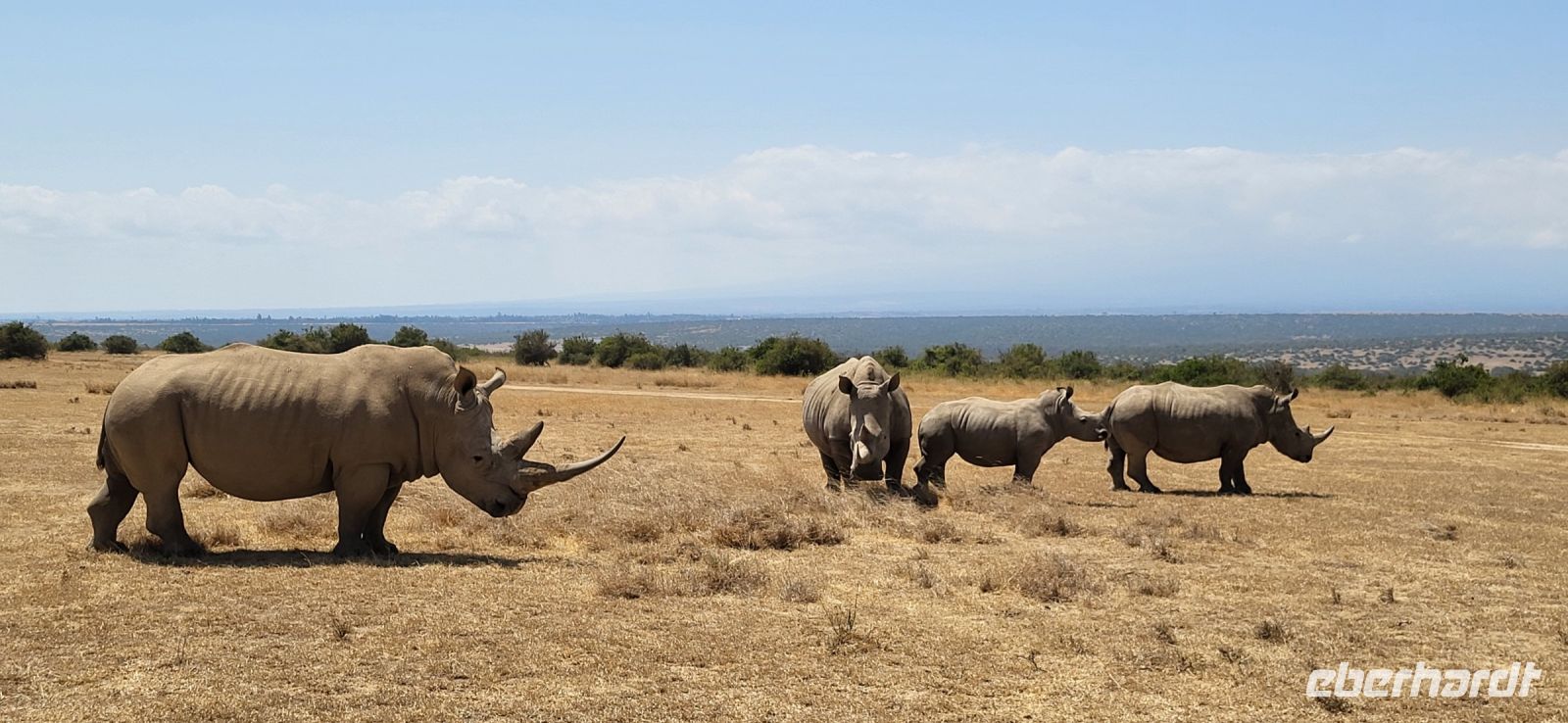 Nach einer kühlen und geruhsamen Nacht starten wir am frühen Morgen mit Nick und Caleb zum Solio Game Reserve, einem bekannten, kenianischen Nashorn Schutzgebiet. Dank unserer strategisch guten Lage der Lodge, haben wir dieses nach wenigen Fahrminuten erreicht, noch kurz die Registrierung und schon geht’s los und unsere erste Safari beginnt. Wir bewegen uns gefühlt alleine auf dem 17.500 Hektar großen Areal und lassen die afrikanische Landschaft mit Aberdere Gebirge zur einen Seite und Mount Kenya in Wolken verhangen, auf der anderen Seite, dazu links und rechts wunderbar goldfarbenen Gelbrindenakazien auch Fieberbäume genannt, auf uns wirken. Schon sehr bald zeigen sich die ersten Tiere und wir erleben eine tolle Pirschfahrt im Schutzgebiet mit der weltweit größten Population an Breitmaulnashörnern sowie an die einhundert Spitzmaulnashörnern. Von unseren Guides erfahren wir viel Wissenswertes über diese bedrohten Tiere. Beispielsweise laufen bei Breitmaulnashörnern die Jungtiere immer vor der Mutter, Spitzmaulnashörner führen den Nachwuchs immer hinter sich. Dies beruht darauf, dass Breitmaulnashörner in der offenen Savanne und Spitzmaulnashörner im dichten Busch unterwegs sind. Im Laufe des Tages sehen wir folgende Tiere: ca. 50 Breitmaulnashörner, Rotschildgiraffen, Oryxantilopen, Steenbock, Pumbas (Warzenschweine), Schwarzfersenantilopen (Impalas), Thomson Gazellen, Zebras, Paviane, grüne Meerkatzen, etliche Wasserböcke sowie diverse Vögel: Sekretärvogel, Waffenkibitz, Ibis, Gabelracke, heilige Ibisse, Glanzstare, Frankoline, und viele mehr. Ein gelungener Auftakt unserer Keniareise mit bereits sehr vielen Tierbegegnungen, auf die noch viele in den nächsten Tagen folgen sollen. Am frühen Nachmittag geht es zu einem späten Mittagessen zurück zur Rhino Lodge und im Anschluss genießen wir den freien Nachmittag, lassen das Erlebte sacken, sichten unsere jetzt schon unzähligen Fotos, bis wir uns zu einem schmackhaften Abendessen wiedersehen.