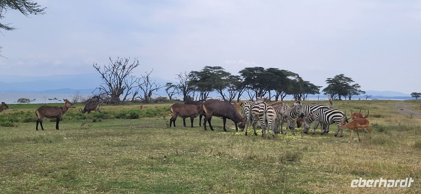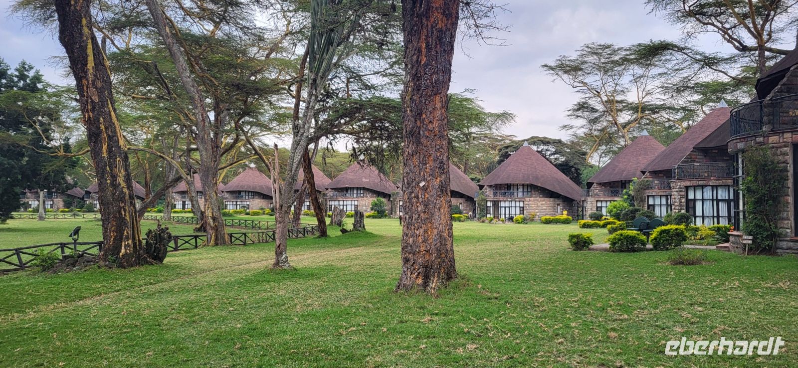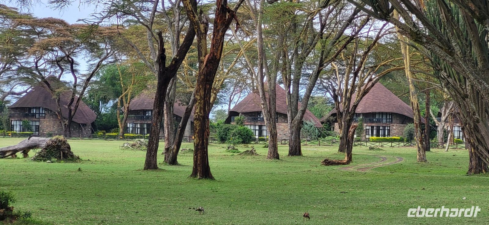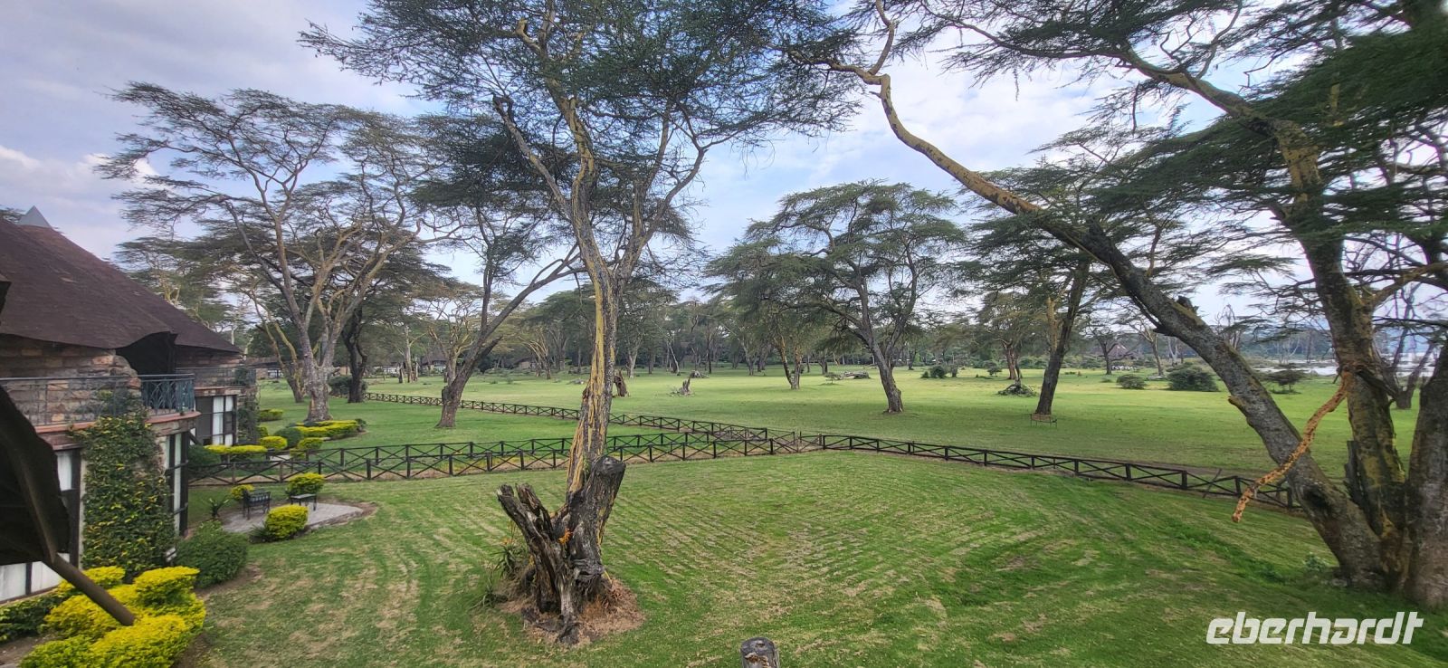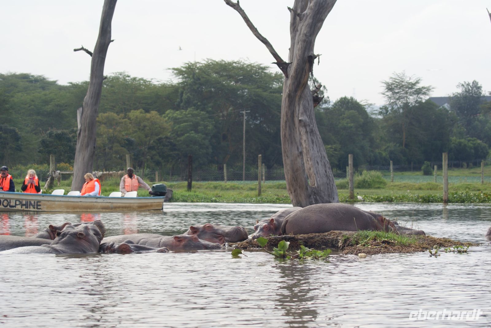 Am frühen Morgen übernehmen Schreiseeadler und weitere schöne Vogelstimmen meinen morgendlichen Weckruf, Hagedasch Ibise geben ebenfalls ihren Kommentar dazu. Nach einem reichhaltigen Frühstück fahren wir mit unseren Jeeps zur Bootsanlegestelle. Von dort starten wir alle mit Schwimmwesten ausgestattet zu unserem Ausflug auf dem Naivasha See, der übersetzt „unruhiges Wasser“ bedeutet. Bootsführer Edward und Kollege fahren uns eine ganze Weile am Ufer entlang, zeigen uns die ersten Hippogruppen, diverse Reiher, Schreiseeadler, Pelikane, Kormorane, etc. Am Horizont entdecken wir den Mount Longonot Vulkan, der letztmalig 1860 ausgebrochen und für die Entstehung der Insel verantwortlich ist. Noch heute befinden sich zahlreiche Lavateilchen auf der Insel. Freundlich empfängt uns Inselguide David, dessen wirklichen kenianischen Namen wir leider weder aussprechen noch uns diesen merken können. Hier sehen wir bereits Zebras, Impalas und Wasserböcke grasen und es bietet sich uns eine herrliche Kulisse. Wir befinden uns nun an einem der original Drehplätze von Filmen wie „Jenseits von Afrika“, „Die Löwin Elsa“ oder „Tomb Raider“, deren Sequenzen einst hier entstanden sind. Wir können uns nun an Land unbeschwert bewegen und Guide David führt uns nun sehr informativ zwei Stunden zu Fuß über die Insel. So genießen wir die ruhige Atmosphäre und sind im Grunde beinahe alleine auf der knapp 40 Hektar großen Insel. Leider sehen wir dieses Jahr keine Giraffen, da sich diese auf einen hinteren Teil der Insel zurückgezogen haben. Aber auch so ist es ein wahres Vergnügen, hier zu spazieren, die friedlichen Tiere in unmittelbarer Nähe zu bestaunen. So kommen wir Wasserböcken, Zebras, Meerkatzen sehr nah und beobachten diese an einem Futterplatz. Zum Schluss fahren wir wieder mit unseren Booten zurück und werden nochmals Zeugen, wie die Bootsführer mit frischen Fischen die bereits wartenden Schreisseeadler anlocken und füttern. Ein erlebnisreicher Programmpunkt geht zu Ende und den Nachmittag verbringt jeder nach Lust und Laune in unserer schönen Anlage. Hier erwarten uns erneut unsere Hausgiraffen und auch der ein oder andere Affe ist auf dem Gelände unterwegs. Mal sehen, ob wir den Pool genießen oder dem Treiben der grünen Meerkatzen und den anderen Bewohnern zuschauen. Abends rundet ein letztes schmackhaftes Abendessen unseren Aufenthalt ab und pünktlich zur Schlafenszeit finden sich erneut Hippos vor unseren Unterkünften zum nächtlichen Grasen ein.