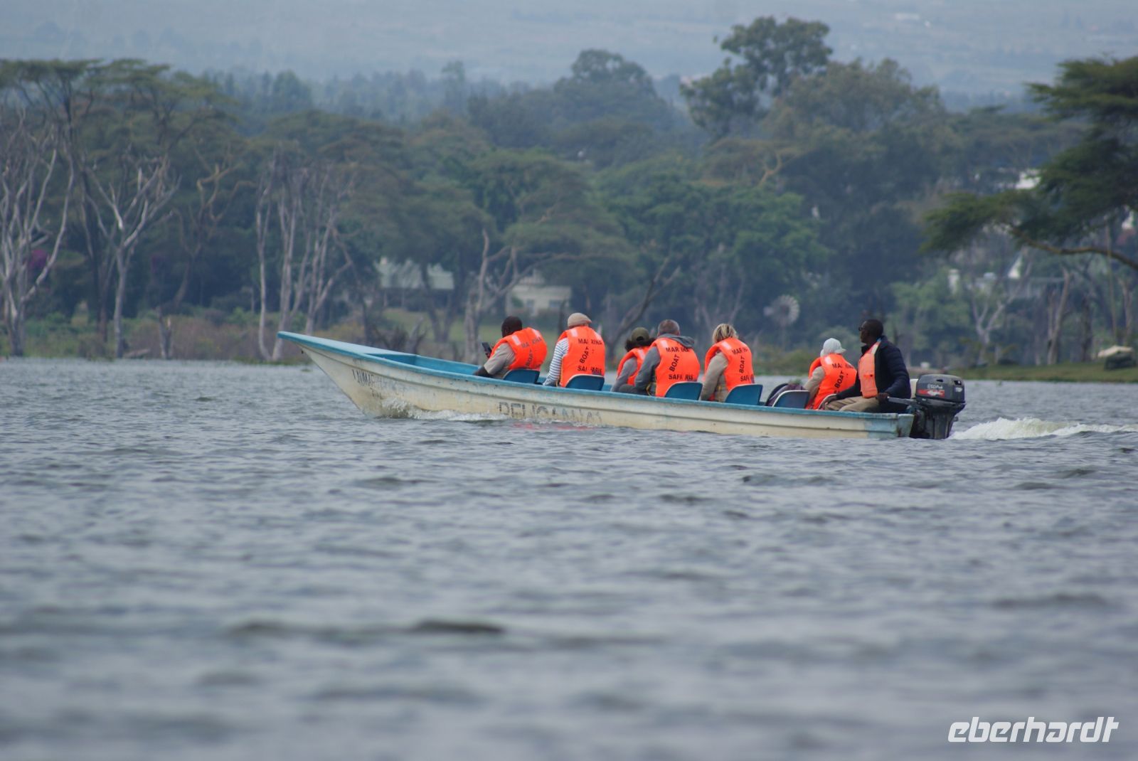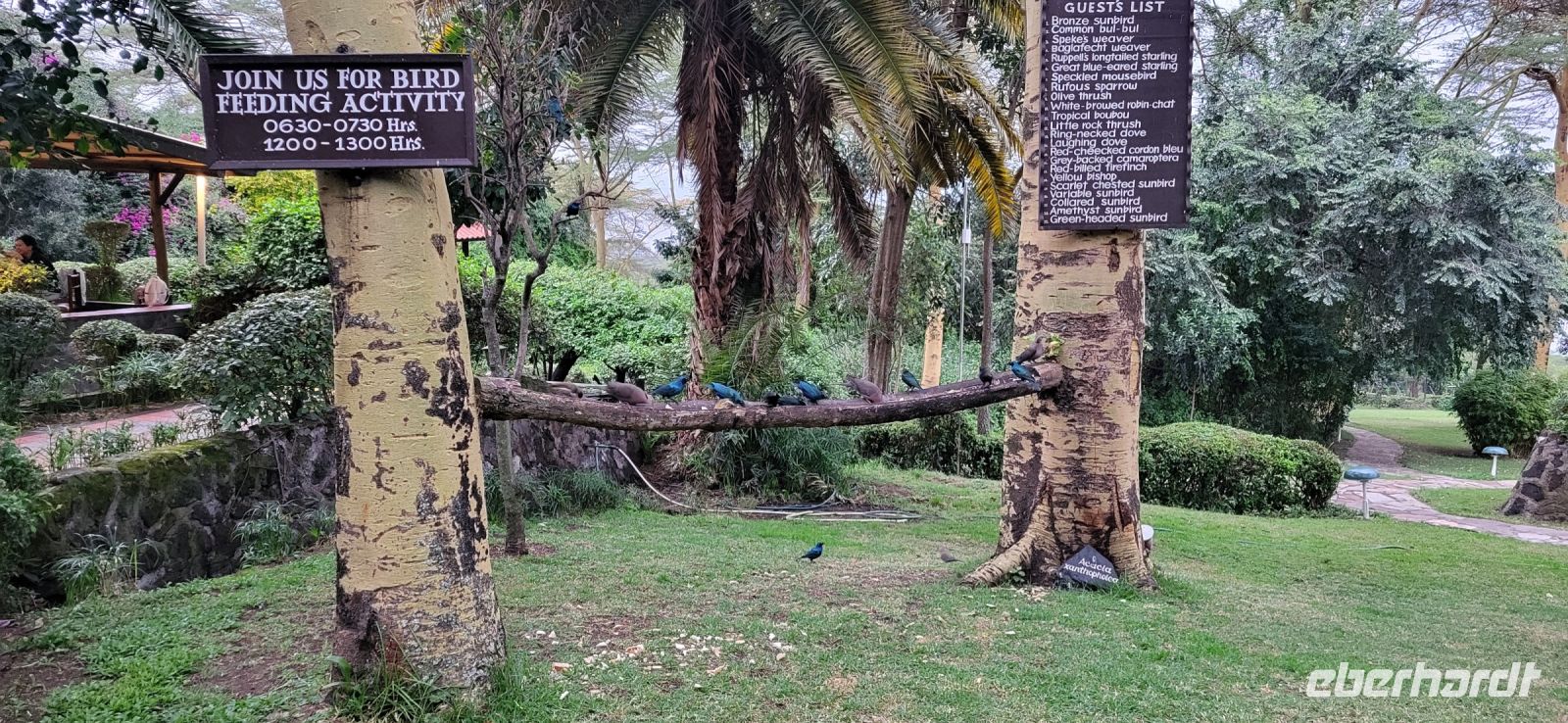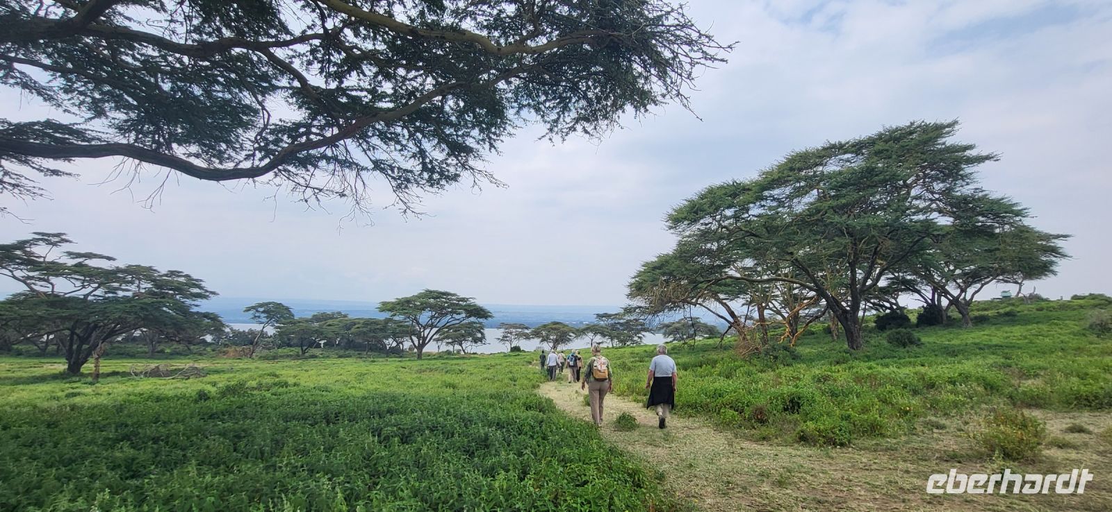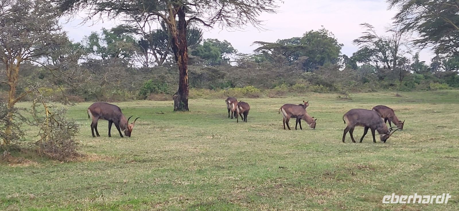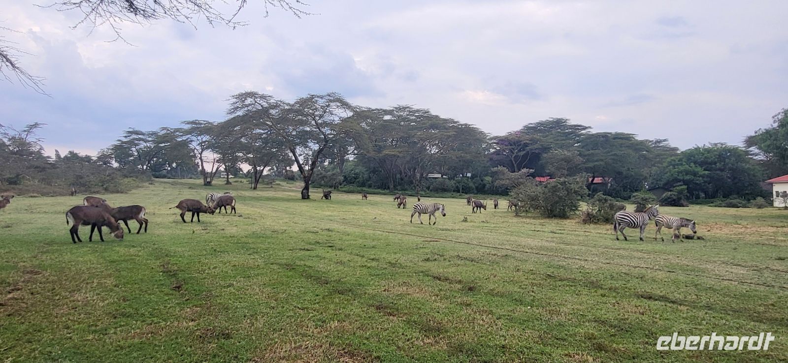 Am frühen Morgen übernehmen Schreiseeadler und weitere schöne Vogelstimmen meinen morgendlichen Weckruf, Hagedasch Ibise geben ebenfalls ihren Kommentar dazu. Nach einem reichhaltigen Frühstück fahren wir mit unseren Jeeps zur Bootsanlegestelle. Von dort starten wir alle mit Schwimmwesten ausgestattet zu unserem Ausflug auf dem Naivasha See, der übersetzt „unruhiges Wasser“ bedeutet. Bootsführer Edward und Kollege fahren uns eine ganze Weile am Ufer entlang, zeigen uns die ersten Hippogruppen, diverse Reiher, Schreiseeadler, Pelikane, Kormorane, etc. Am Horizont entdecken wir den Mount Longonot Vulkan, der letztmalig 1860 ausgebrochen und für die Entstehung der Insel verantwortlich ist. Noch heute befinden sich zahlreiche Lavateilchen auf der Insel. Freundlich empfängt uns Inselguide David, dessen wirklichen kenianischen Namen wir leider weder aussprechen noch uns diesen merken können. Hier sehen wir bereits Zebras, Impalas und Wasserböcke grasen und es bietet sich uns eine herrliche Kulisse. Wir befinden uns nun an einem der original Drehplätze von Filmen wie „Jenseits von Afrika“, „Die Löwin Elsa“ oder „Tomb Raider“, deren Sequenzen einst hier entstanden sind. Wir können uns nun an Land unbeschwert bewegen und Guide David führt uns nun sehr informativ zwei Stunden zu Fuß über die Insel. So genießen wir die ruhige Atmosphäre und sind im Grunde beinahe alleine auf der knapp 40 Hektar großen Insel. Leider sehen wir dieses Jahr keine Giraffen, da sich diese auf einen hinteren Teil der Insel zurückgezogen haben. Aber auch so ist es ein wahres Vergnügen, hier zu spazieren, die friedlichen Tiere in unmittelbarer Nähe zu bestaunen. So kommen wir Wasserböcken, Zebras, Meerkatzen sehr nah und beobachten diese an einem Futterplatz. Zum Schluss fahren wir wieder mit unseren Booten zurück und werden nochmals Zeugen, wie die Bootsführer mit frischen Fischen die bereits wartenden Schreisseeadler anlocken und füttern. Ein erlebnisreicher Programmpunkt geht zu Ende und den Nachmittag verbringt jeder nach Lust und Laune in unserer schönen Anlage. Hier erwarten uns erneut unsere Hausgiraffen und auch der ein oder andere Affe ist auf dem Gelände unterwegs. Mal sehen, ob wir den Pool genießen oder dem Treiben der grünen Meerkatzen und den anderen Bewohnern zuschauen. Abends rundet ein letztes schmackhaftes Abendessen unseren Aufenthalt ab und pünktlich zur Schlafenszeit finden sich erneut Hippos vor unseren Unterkünften zum nächtlichen Grasen ein.