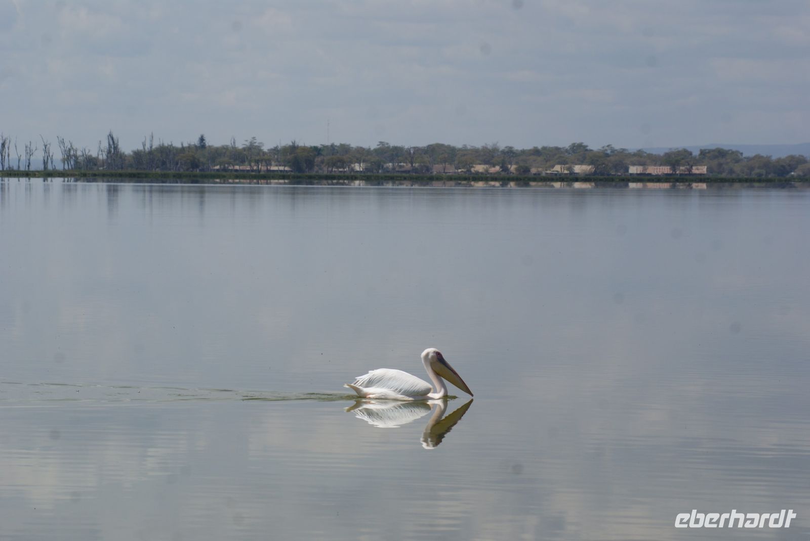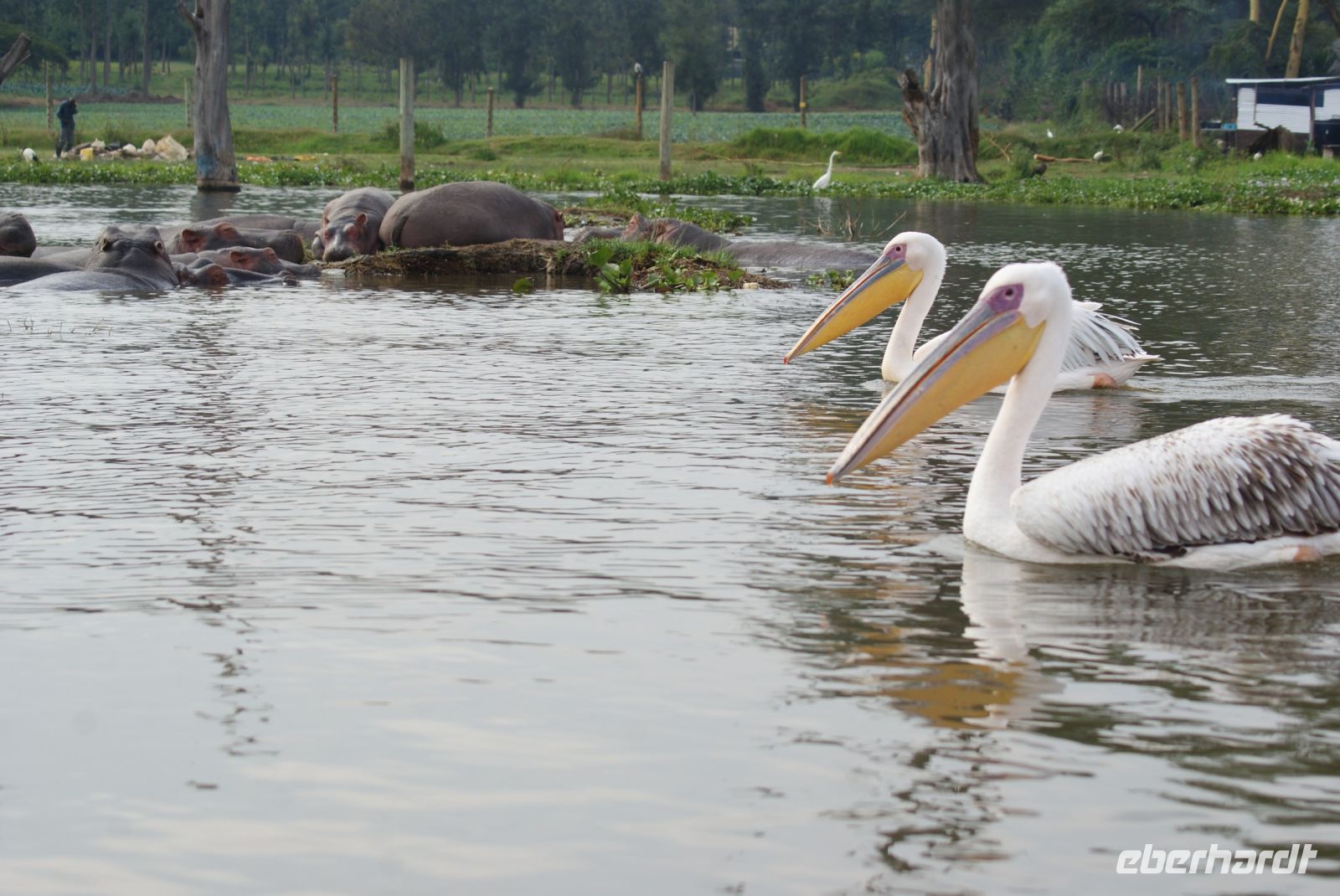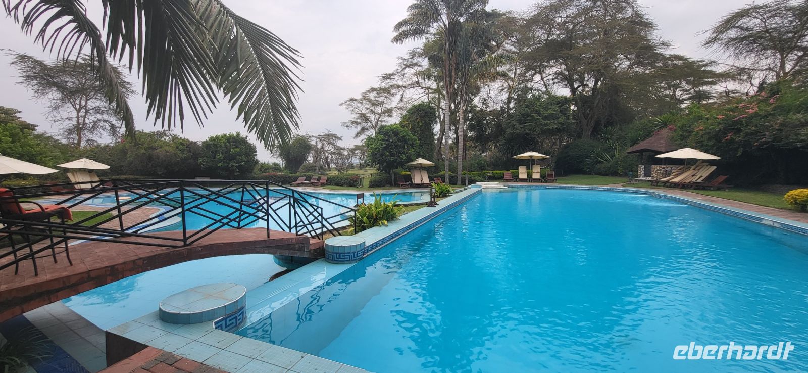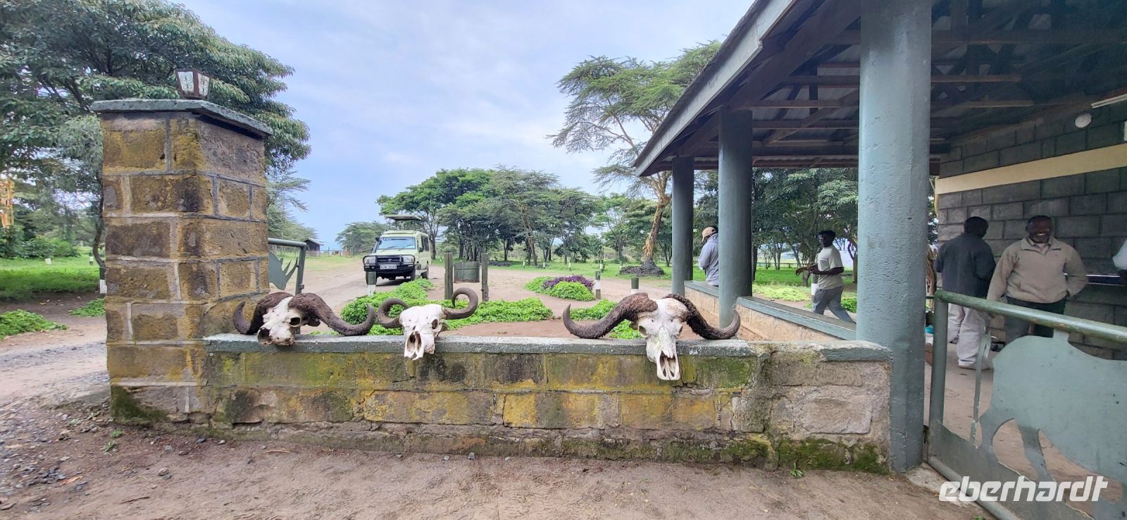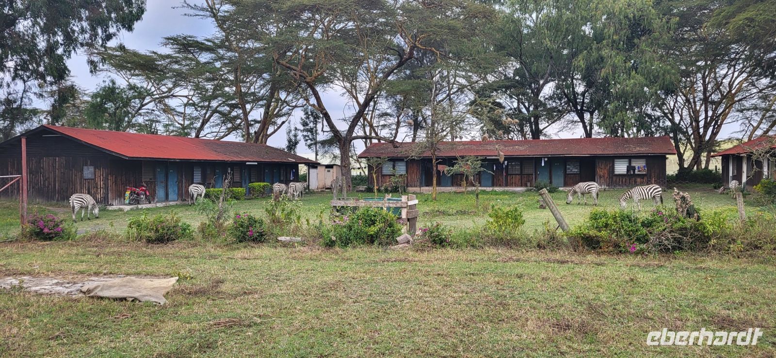 Am frühen Morgen übernehmen Schreiseeadler und weitere schöne Vogelstimmen meinen morgendlichen Weckruf, Hagedasch Ibise geben ebenfalls ihren Kommentar dazu. Nach einem reichhaltigen Frühstück fahren wir mit unseren Jeeps zur Bootsanlegestelle. Von dort starten wir alle mit Schwimmwesten ausgestattet zu unserem Ausflug auf dem Naivasha See, der übersetzt „unruhiges Wasser“ bedeutet. Bootsführer Edward und Kollege fahren uns eine ganze Weile am Ufer entlang, zeigen uns die ersten Hippogruppen, diverse Reiher, Schreiseeadler, Pelikane, Kormorane, etc. Am Horizont entdecken wir den Mount Longonot Vulkan, der letztmalig 1860 ausgebrochen und für die Entstehung der Insel verantwortlich ist. Noch heute befinden sich zahlreiche Lavateilchen auf der Insel. Freundlich empfängt uns Inselguide David, dessen wirklichen kenianischen Namen wir leider weder aussprechen noch uns diesen merken können. Hier sehen wir bereits Zebras, Impalas und Wasserböcke grasen und es bietet sich uns eine herrliche Kulisse. Wir befinden uns nun an einem der original Drehplätze von Filmen wie „Jenseits von Afrika“, „Die Löwin Elsa“ oder „Tomb Raider“, deren Sequenzen einst hier entstanden sind. Wir können uns nun an Land unbeschwert bewegen und Guide David führt uns nun sehr informativ zwei Stunden zu Fuß über die Insel. So genießen wir die ruhige Atmosphäre und sind im Grunde beinahe alleine auf der knapp 40 Hektar großen Insel. Leider sehen wir dieses Jahr keine Giraffen, da sich diese auf einen hinteren Teil der Insel zurückgezogen haben. Aber auch so ist es ein wahres Vergnügen, hier zu spazieren, die friedlichen Tiere in unmittelbarer Nähe zu bestaunen. So kommen wir Wasserböcken, Zebras, Meerkatzen sehr nah und beobachten diese an einem Futterplatz. Zum Schluss fahren wir wieder mit unseren Booten zurück und werden nochmals Zeugen, wie die Bootsführer mit frischen Fischen die bereits wartenden Schreisseeadler anlocken und füttern. Ein erlebnisreicher Programmpunkt geht zu Ende und den Nachmittag verbringt jeder nach Lust und Laune in unserer schönen Anlage. Hier erwarten uns erneut unsere Hausgiraffen und auch der ein oder andere Affe ist auf dem Gelände unterwegs. Mal sehen, ob wir den Pool genießen oder dem Treiben der grünen Meerkatzen und den anderen Bewohnern zuschauen. Abends rundet ein letztes schmackhaftes Abendessen unseren Aufenthalt ab und pünktlich zur Schlafenszeit finden sich erneut Hippos vor unseren Unterkünften zum nächtlichen Grasen ein.