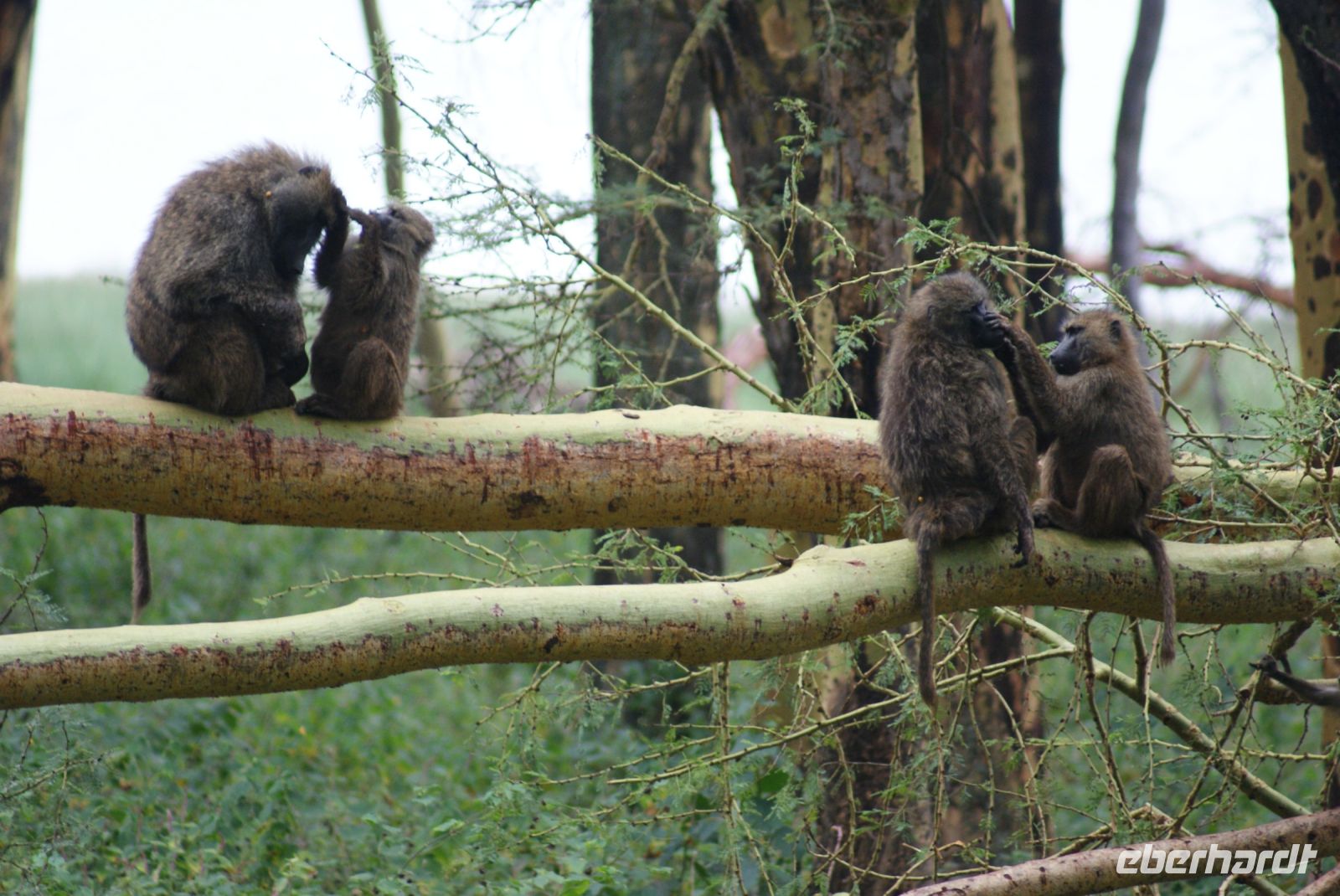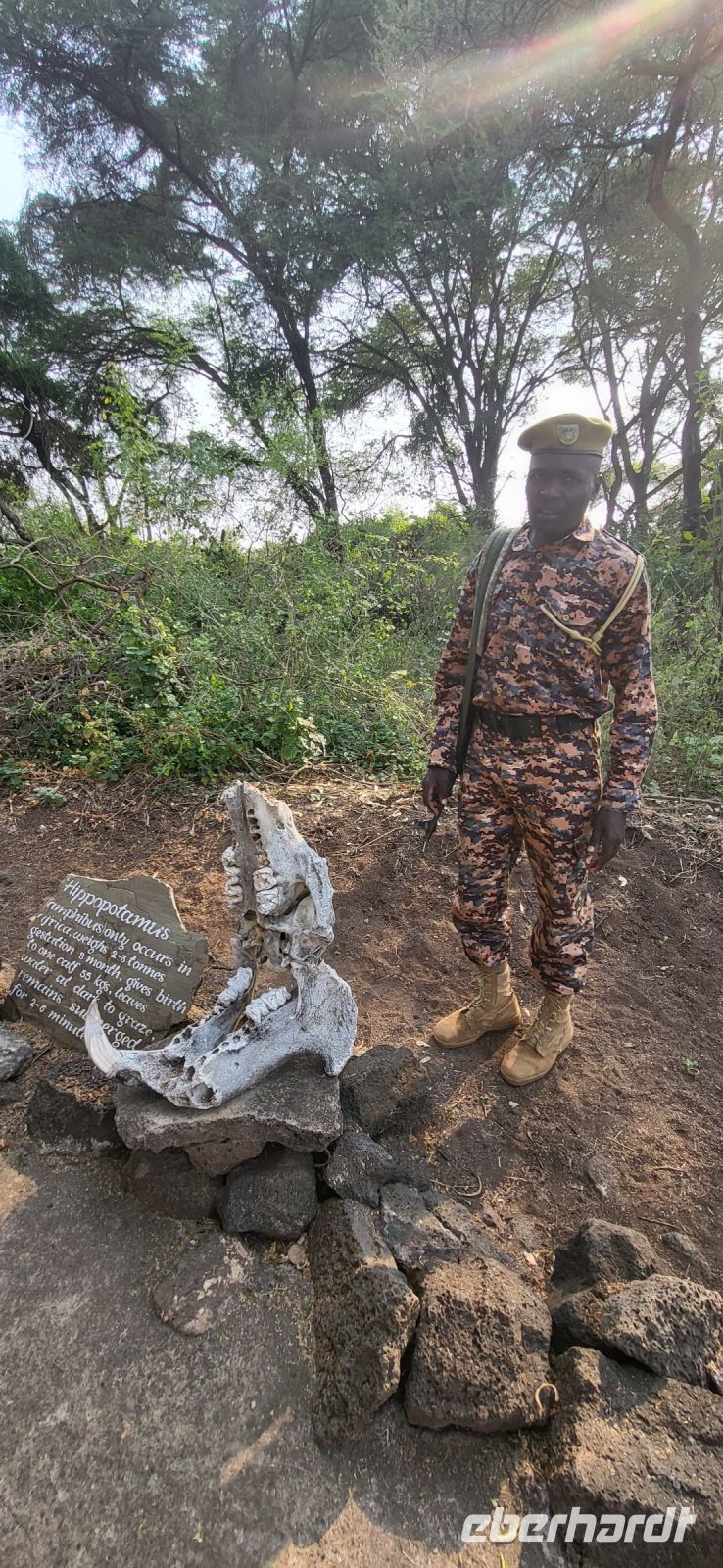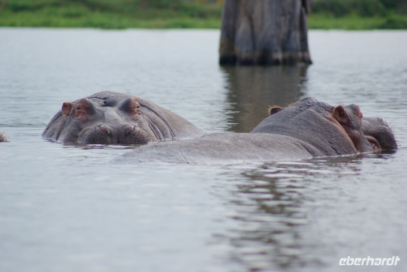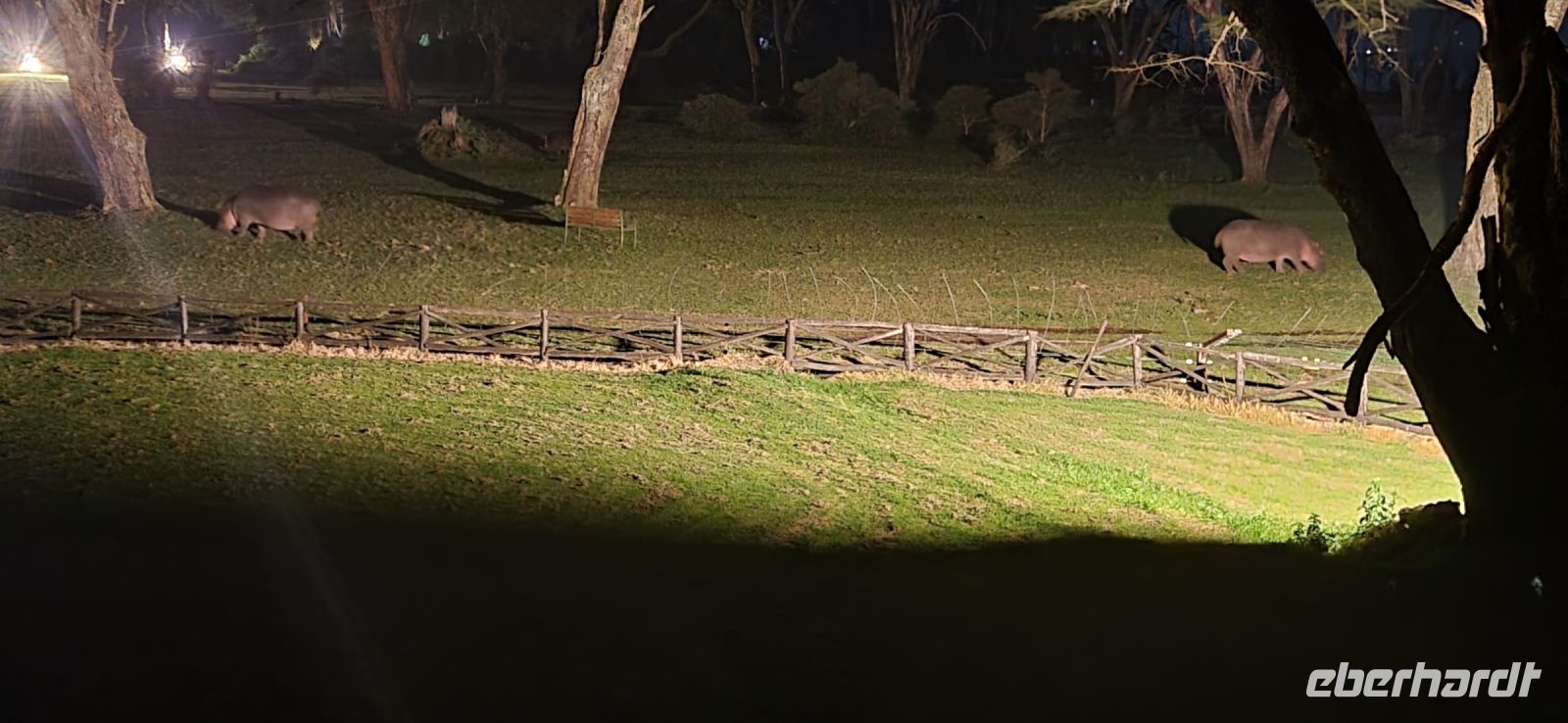 Am frühen Morgen übernehmen Schreiseeadler und weitere schöne Vogelstimmen meinen morgendlichen Weckruf, Hagedasch Ibise geben ebenfalls ihren Kommentar dazu. Nach einem reichhaltigen Frühstück fahren wir mit unseren Jeeps zur Bootsanlegestelle. Von dort starten wir alle mit Schwimmwesten ausgestattet zu unserem Ausflug auf dem Naivasha See, der übersetzt „unruhiges Wasser“ bedeutet. Bootsführer Edward und Kollege fahren uns eine ganze Weile am Ufer entlang, zeigen uns die ersten Hippogruppen, diverse Reiher, Schreiseeadler, Pelikane, Kormorane, etc. Am Horizont entdecken wir den Mount Longonot Vulkan, der letztmalig 1860 ausgebrochen und für die Entstehung der Insel verantwortlich ist. Noch heute befinden sich zahlreiche Lavateilchen auf der Insel. Freundlich empfängt uns Inselguide David, dessen wirklichen kenianischen Namen wir leider weder aussprechen noch uns diesen merken können. Hier sehen wir bereits Zebras, Impalas und Wasserböcke grasen und es bietet sich uns eine herrliche Kulisse. Wir befinden uns nun an einem der original Drehplätze von Filmen wie „Jenseits von Afrika“, „Die Löwin Elsa“ oder „Tomb Raider“, deren Sequenzen einst hier entstanden sind. Wir können uns nun an Land unbeschwert bewegen und Guide David führt uns nun sehr informativ zwei Stunden zu Fuß über die Insel. So genießen wir die ruhige Atmosphäre und sind im Grunde beinahe alleine auf der knapp 40 Hektar großen Insel. Leider sehen wir dieses Jahr keine Giraffen, da sich diese auf einen hinteren Teil der Insel zurückgezogen haben. Aber auch so ist es ein wahres Vergnügen, hier zu spazieren, die friedlichen Tiere in unmittelbarer Nähe zu bestaunen. So kommen wir Wasserböcken, Zebras, Meerkatzen sehr nah und beobachten diese an einem Futterplatz. Zum Schluss fahren wir wieder mit unseren Booten zurück und werden nochmals Zeugen, wie die Bootsführer mit frischen Fischen die bereits wartenden Schreisseeadler anlocken und füttern. Ein erlebnisreicher Programmpunkt geht zu Ende und den Nachmittag verbringt jeder nach Lust und Laune in unserer schönen Anlage. Hier erwarten uns erneut unsere Hausgiraffen und auch der ein oder andere Affe ist auf dem Gelände unterwegs. Mal sehen, ob wir den Pool genießen oder dem Treiben der grünen Meerkatzen und den anderen Bewohnern zuschauen. Abends rundet ein letztes schmackhaftes Abendessen unseren Aufenthalt ab und pünktlich zur Schlafenszeit finden sich erneut Hippos vor unseren Unterkünften zum nächtlichen Grasen ein.