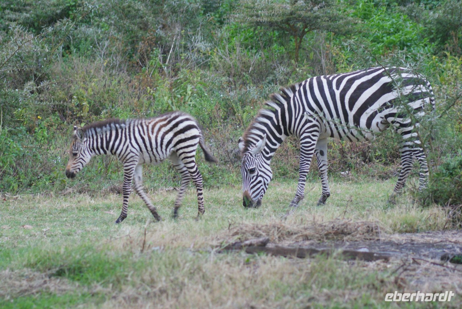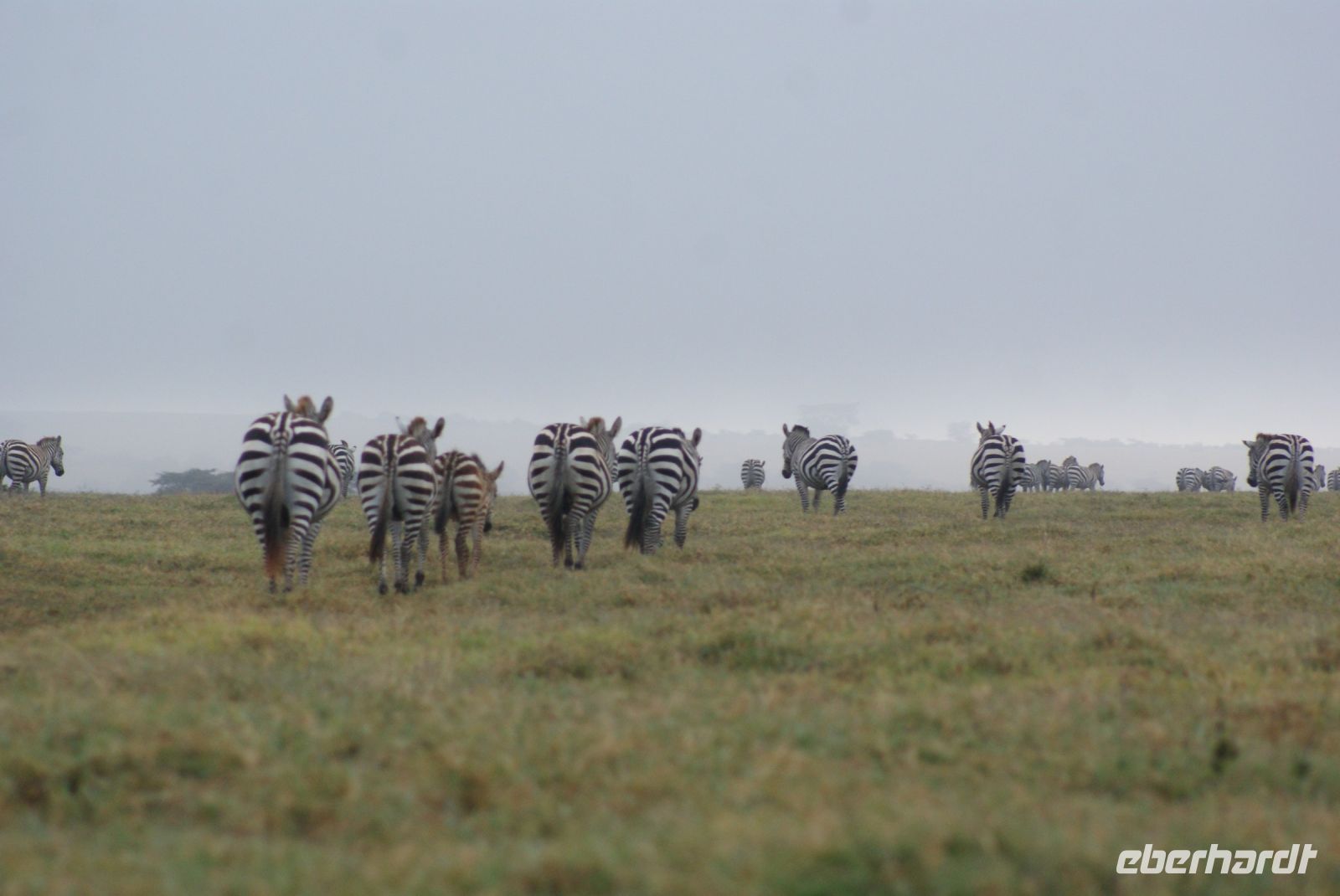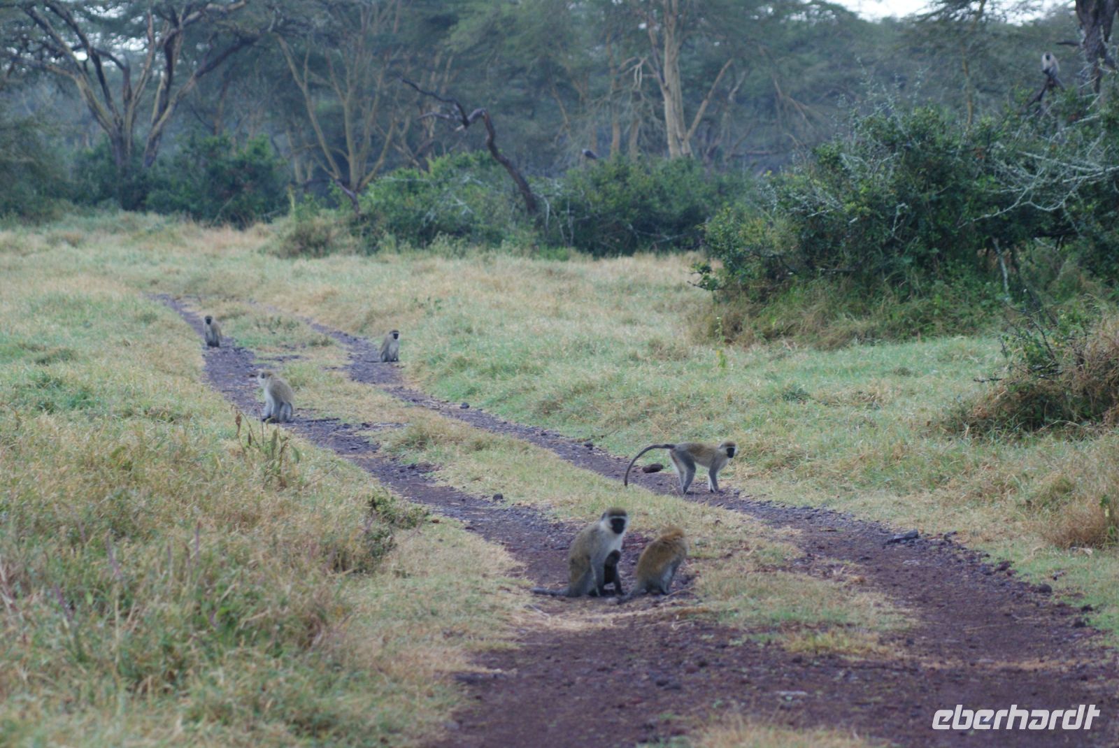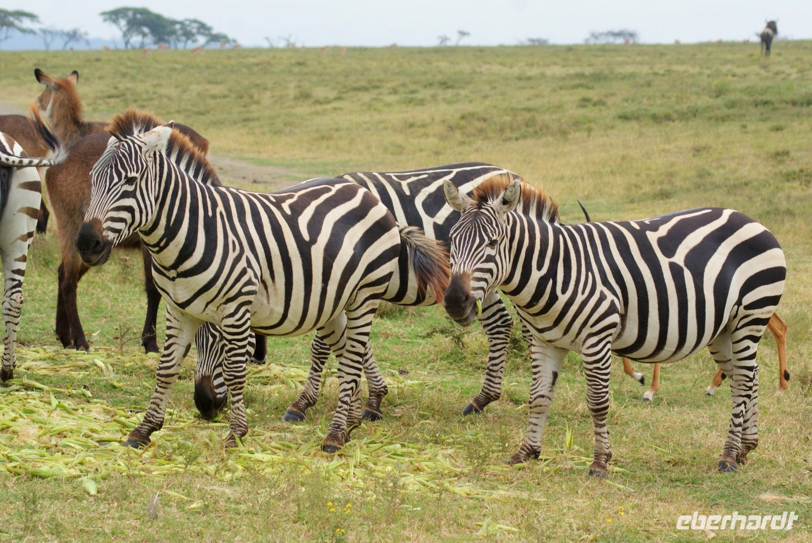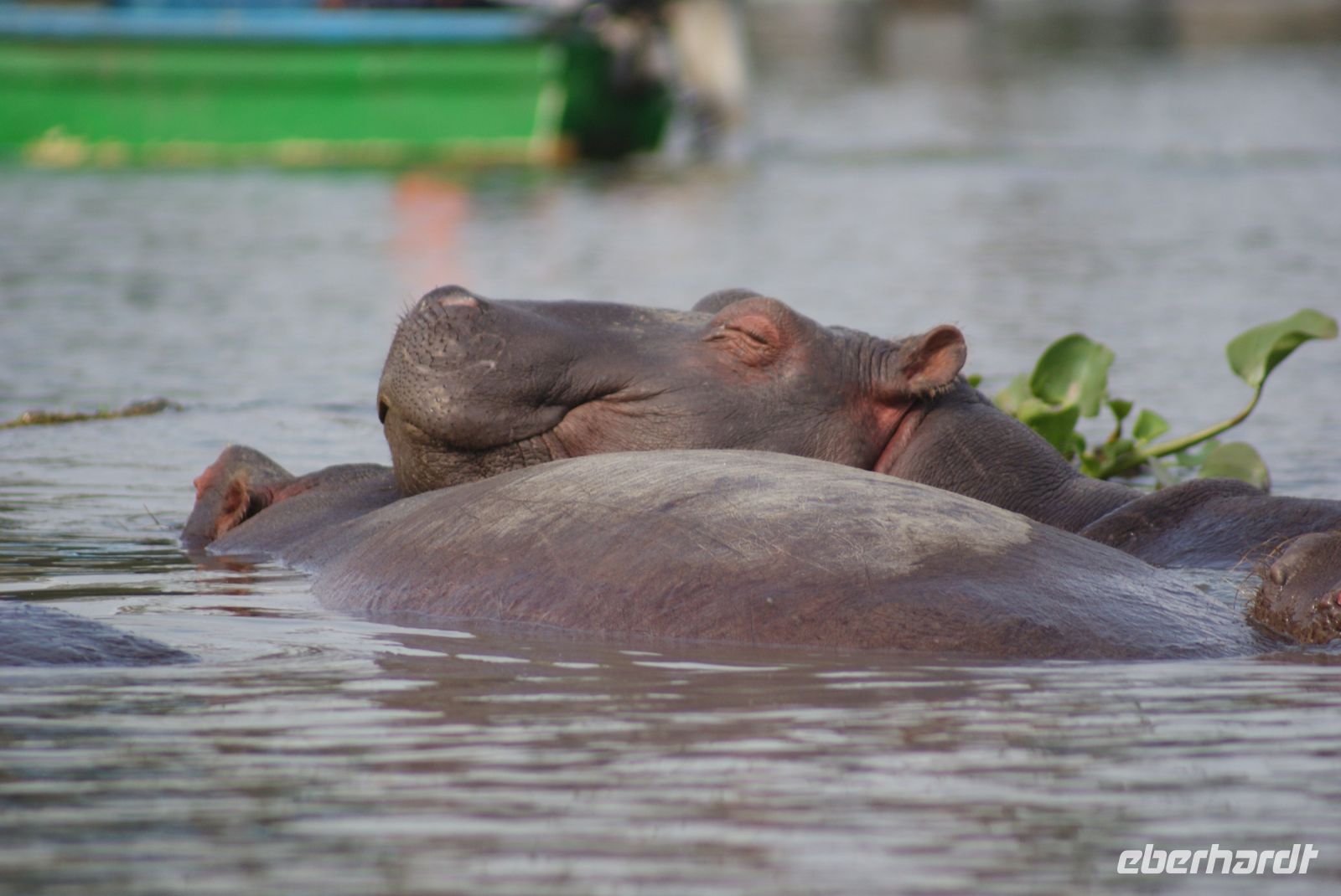 Am frühen Morgen übernehmen Schreiseeadler und weitere schöne Vogelstimmen meinen morgendlichen Weckruf, Hagedasch Ibise geben ebenfalls ihren Kommentar dazu. Nach einem reichhaltigen Frühstück fahren wir mit unseren Jeeps zur Bootsanlegestelle. Von dort starten wir alle mit Schwimmwesten ausgestattet zu unserem Ausflug auf dem Naivasha See, der übersetzt „unruhiges Wasser“ bedeutet. Bootsführer Edward und Kollege fahren uns eine ganze Weile am Ufer entlang, zeigen uns die ersten Hippogruppen, diverse Reiher, Schreiseeadler, Pelikane, Kormorane, etc. Am Horizont entdecken wir den Mount Longonot Vulkan, der letztmalig 1860 ausgebrochen und für die Entstehung der Insel verantwortlich ist. Noch heute befinden sich zahlreiche Lavateilchen auf der Insel. Freundlich empfängt uns Inselguide David, dessen wirklichen kenianischen Namen wir leider weder aussprechen noch uns diesen merken können. Hier sehen wir bereits Zebras, Impalas und Wasserböcke grasen und es bietet sich uns eine herrliche Kulisse. Wir befinden uns nun an einem der original Drehplätze von Filmen wie „Jenseits von Afrika“, „Die Löwin Elsa“ oder „Tomb Raider“, deren Sequenzen einst hier entstanden sind. Wir können uns nun an Land unbeschwert bewegen und Guide David führt uns nun sehr informativ zwei Stunden zu Fuß über die Insel. So genießen wir die ruhige Atmosphäre und sind im Grunde beinahe alleine auf der knapp 40 Hektar großen Insel. Leider sehen wir dieses Jahr keine Giraffen, da sich diese auf einen hinteren Teil der Insel zurückgezogen haben. Aber auch so ist es ein wahres Vergnügen, hier zu spazieren, die friedlichen Tiere in unmittelbarer Nähe zu bestaunen. So kommen wir Wasserböcken, Zebras, Meerkatzen sehr nah und beobachten diese an einem Futterplatz. Zum Schluss fahren wir wieder mit unseren Booten zurück und werden nochmals Zeugen, wie die Bootsführer mit frischen Fischen die bereits wartenden Schreisseeadler anlocken und füttern. Ein erlebnisreicher Programmpunkt geht zu Ende und den Nachmittag verbringt jeder nach Lust und Laune in unserer schönen Anlage. Hier erwarten uns erneut unsere Hausgiraffen und auch der ein oder andere Affe ist auf dem Gelände unterwegs. Mal sehen, ob wir den Pool genießen oder dem Treiben der grünen Meerkatzen und den anderen Bewohnern zuschauen. Abends rundet ein letztes schmackhaftes Abendessen unseren Aufenthalt ab und pünktlich zur Schlafenszeit finden sich erneut Hippos vor unseren Unterkünften zum nächtlichen Grasen ein.