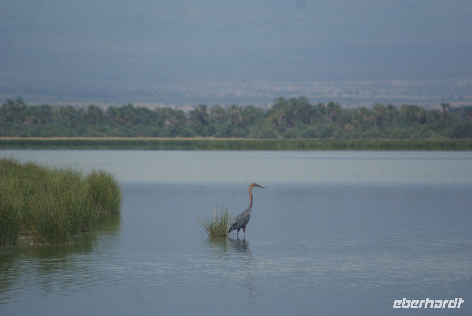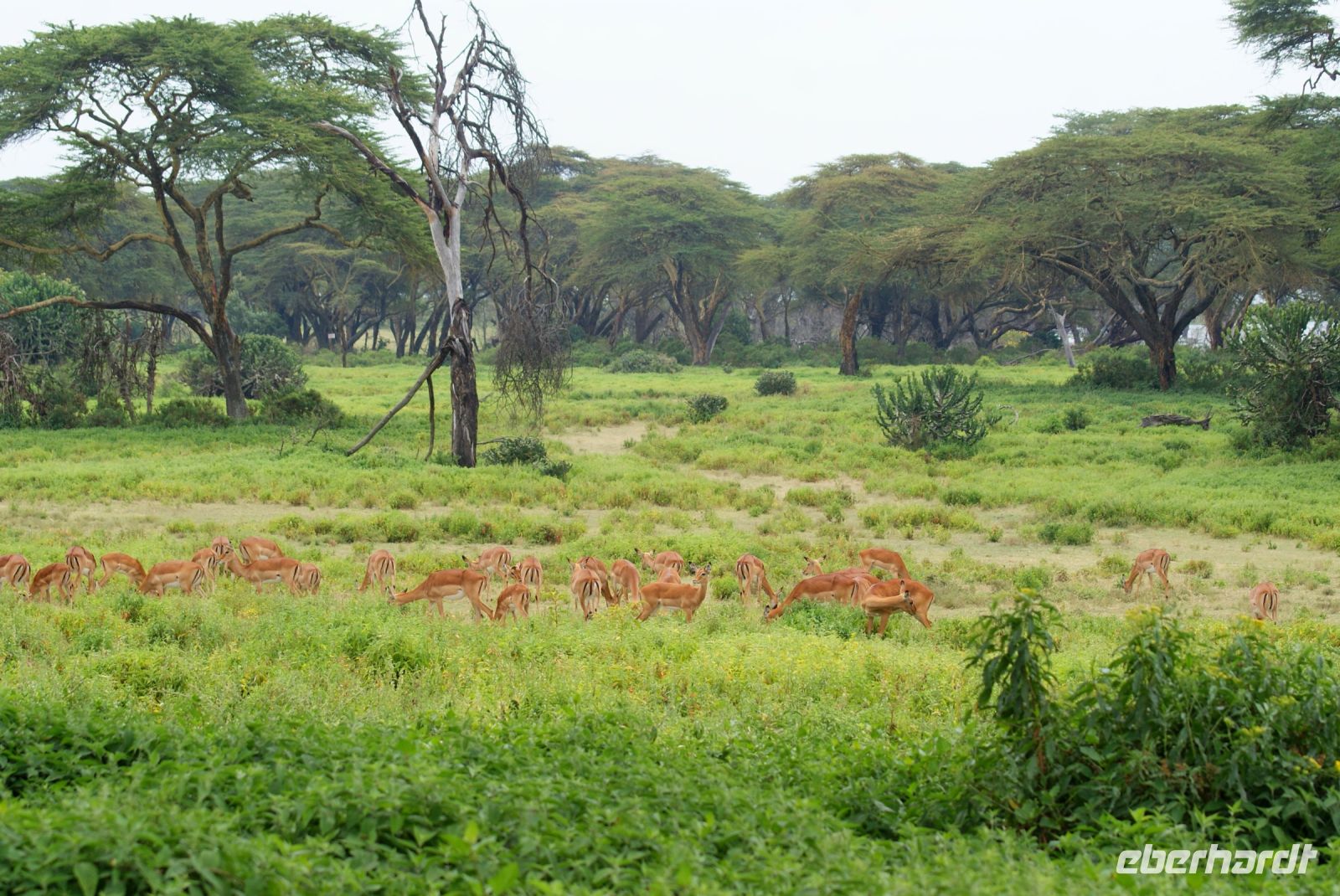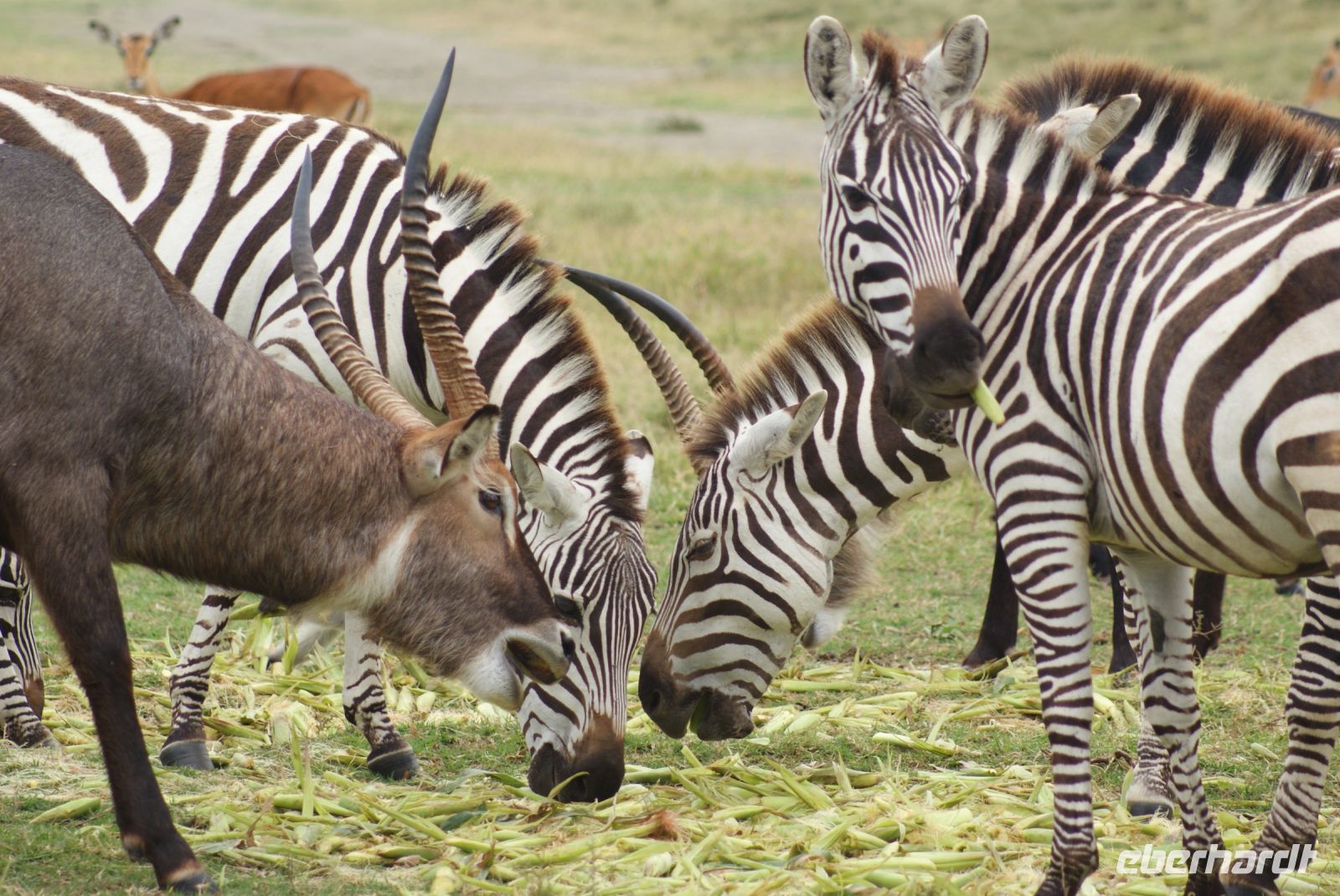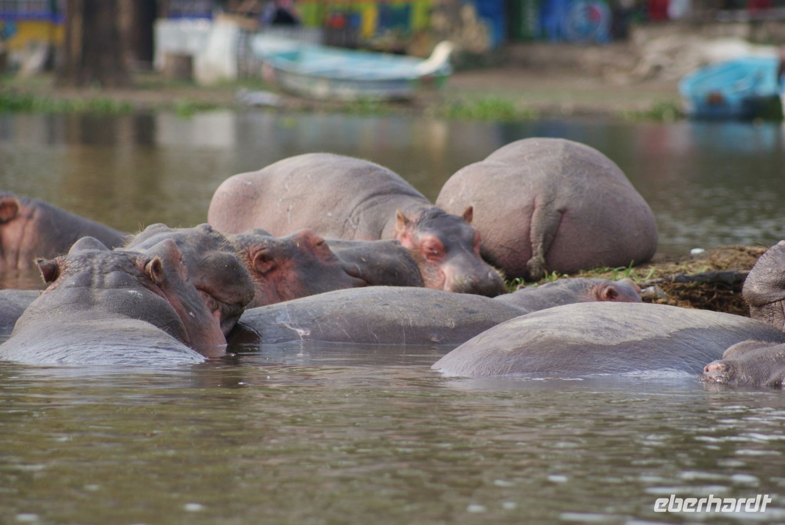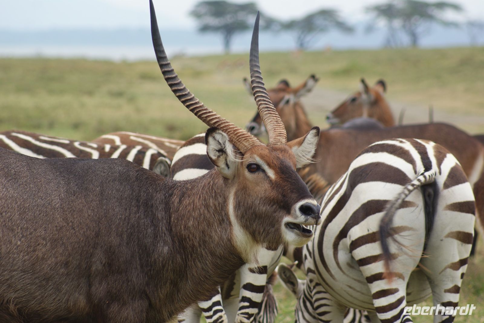 Am frühen Morgen übernehmen Schreiseeadler und weitere schöne Vogelstimmen meinen morgendlichen Weckruf, Hagedasch Ibise geben ebenfalls ihren Kommentar dazu. Nach einem reichhaltigen Frühstück fahren wir mit unseren Jeeps zur Bootsanlegestelle. Von dort starten wir alle mit Schwimmwesten ausgestattet zu unserem Ausflug auf dem Naivasha See, der übersetzt „unruhiges Wasser“ bedeutet. Bootsführer Edward und Kollege fahren uns eine ganze Weile am Ufer entlang, zeigen uns die ersten Hippogruppen, diverse Reiher, Schreiseeadler, Pelikane, Kormorane, etc. Am Horizont entdecken wir den Mount Longonot Vulkan, der letztmalig 1860 ausgebrochen und für die Entstehung der Insel verantwortlich ist. Noch heute befinden sich zahlreiche Lavateilchen auf der Insel. Freundlich empfängt uns Inselguide David, dessen wirklichen kenianischen Namen wir leider weder aussprechen noch uns diesen merken können. Hier sehen wir bereits Zebras, Impalas und Wasserböcke grasen und es bietet sich uns eine herrliche Kulisse. Wir befinden uns nun an einem der original Drehplätze von Filmen wie „Jenseits von Afrika“, „Die Löwin Elsa“ oder „Tomb Raider“, deren Sequenzen einst hier entstanden sind. Wir können uns nun an Land unbeschwert bewegen und Guide David führt uns nun sehr informativ zwei Stunden zu Fuß über die Insel. So genießen wir die ruhige Atmosphäre und sind im Grunde beinahe alleine auf der knapp 40 Hektar großen Insel. Leider sehen wir dieses Jahr keine Giraffen, da sich diese auf einen hinteren Teil der Insel zurückgezogen haben. Aber auch so ist es ein wahres Vergnügen, hier zu spazieren, die friedlichen Tiere in unmittelbarer Nähe zu bestaunen. So kommen wir Wasserböcken, Zebras, Meerkatzen sehr nah und beobachten diese an einem Futterplatz. Zum Schluss fahren wir wieder mit unseren Booten zurück und werden nochmals Zeugen, wie die Bootsführer mit frischen Fischen die bereits wartenden Schreisseeadler anlocken und füttern. Ein erlebnisreicher Programmpunkt geht zu Ende und den Nachmittag verbringt jeder nach Lust und Laune in unserer schönen Anlage. Hier erwarten uns erneut unsere Hausgiraffen und auch der ein oder andere Affe ist auf dem Gelände unterwegs. Mal sehen, ob wir den Pool genießen oder dem Treiben der grünen Meerkatzen und den anderen Bewohnern zuschauen. Abends rundet ein letztes schmackhaftes Abendessen unseren Aufenthalt ab und pünktlich zur Schlafenszeit finden sich erneut Hippos vor unseren Unterkünften zum nächtlichen Grasen ein.