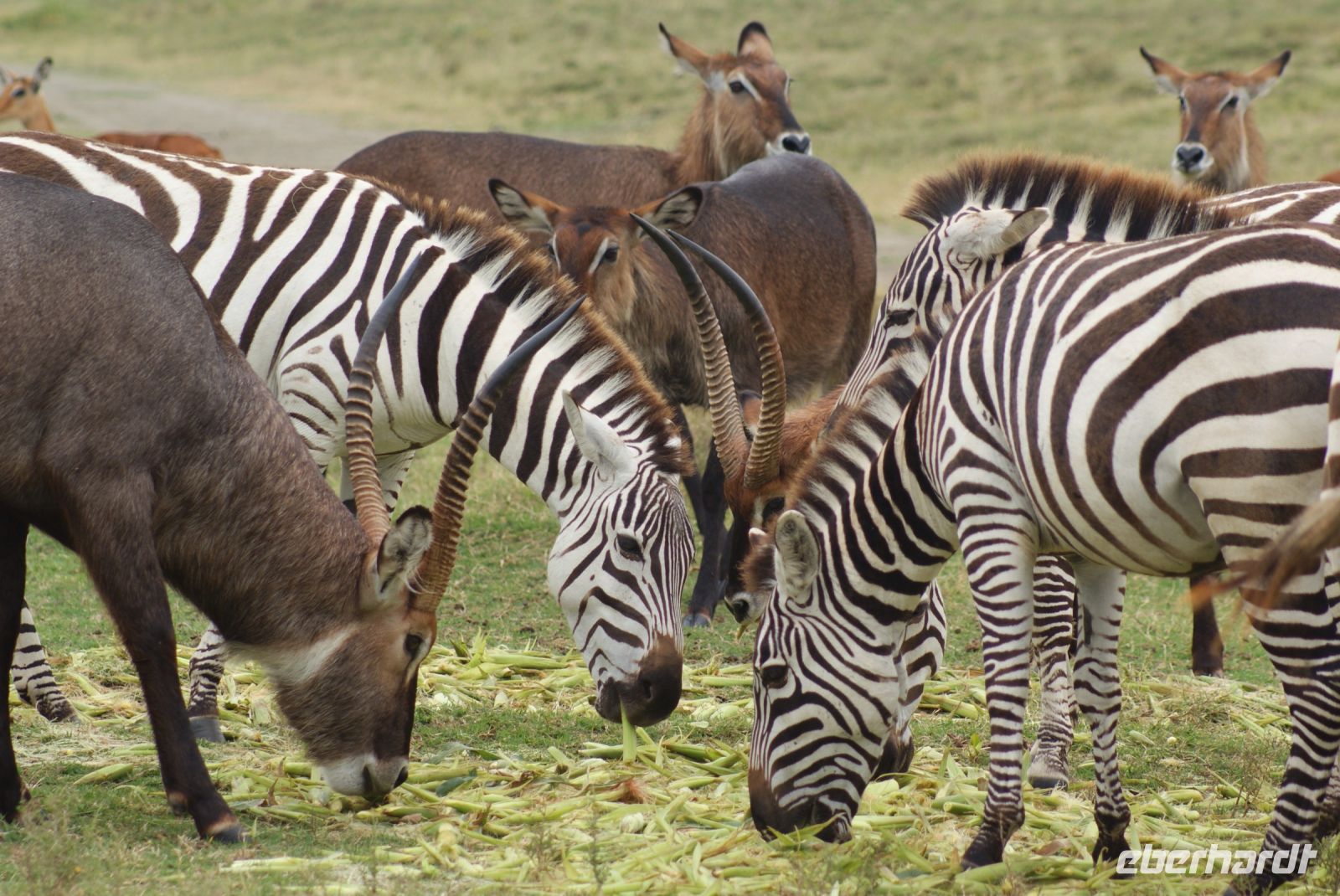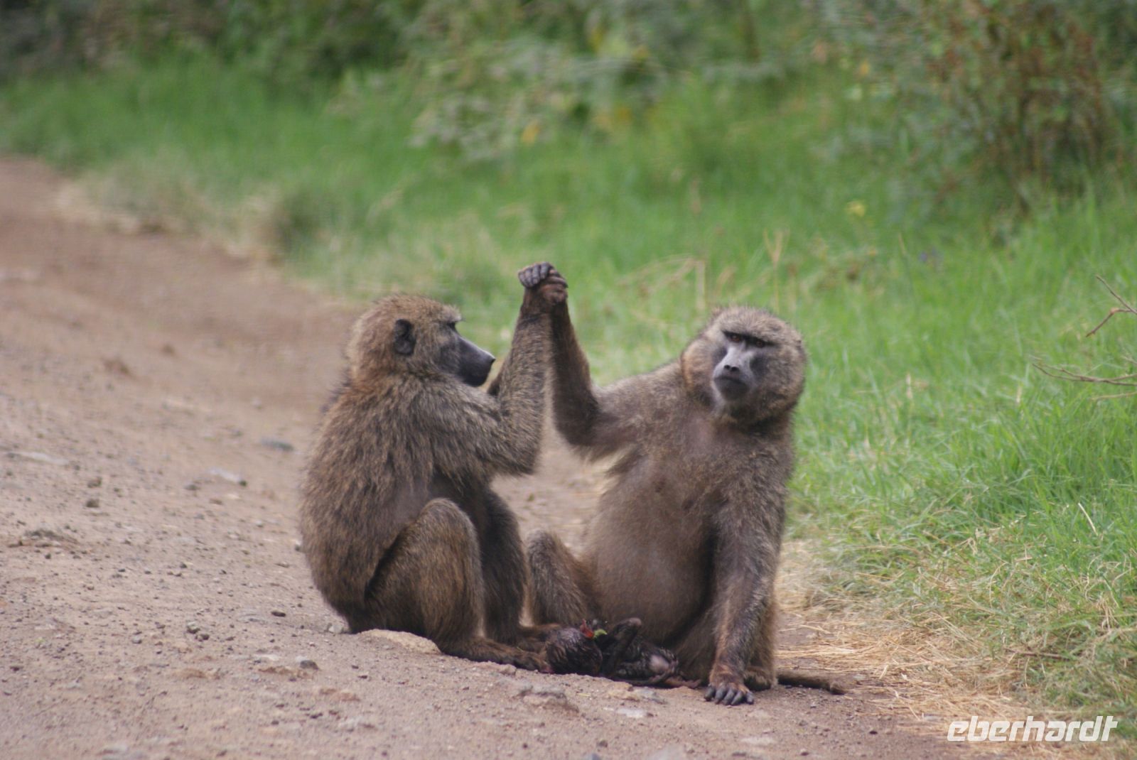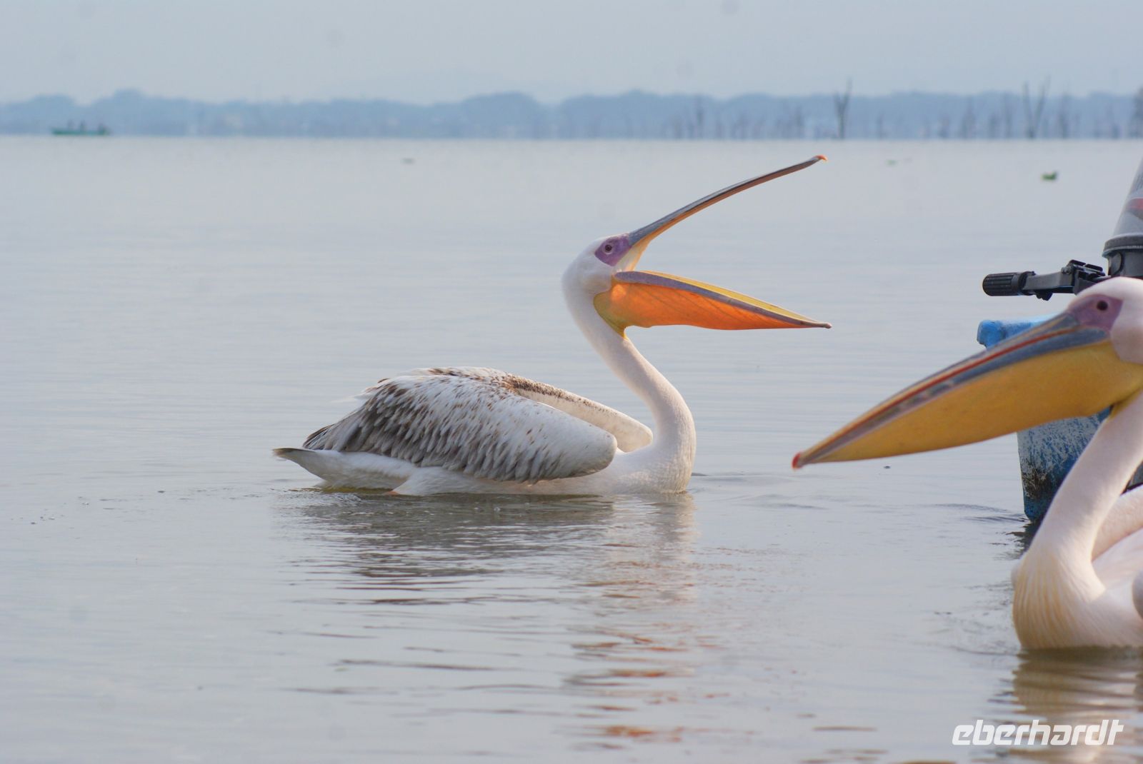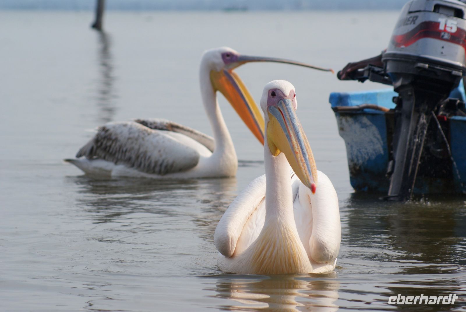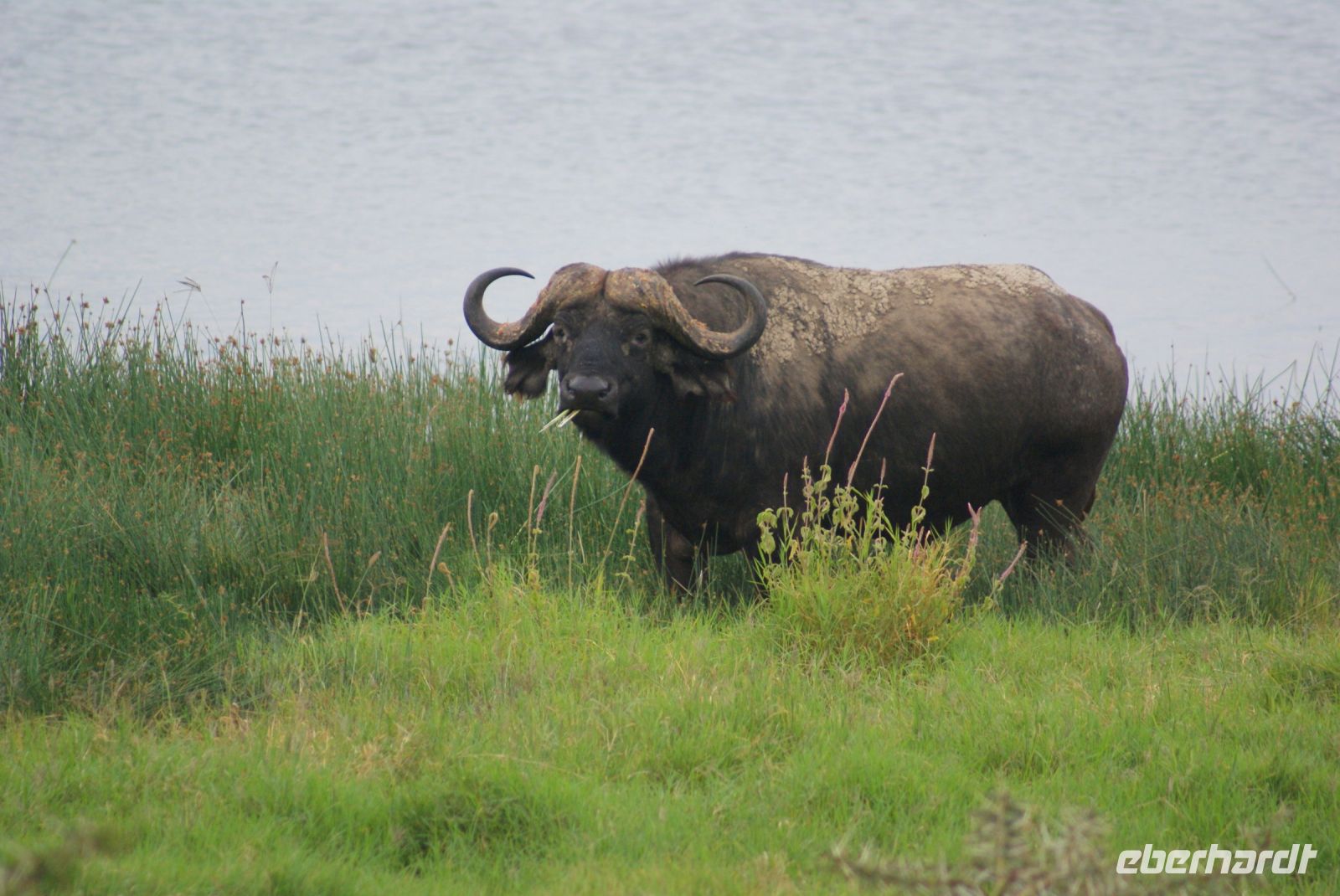Am frühen Morgen übernehmen Schreiseeadler und weitere schöne Vogelstimmen meinen morgendlichen Weckruf, Hagedasch Ibise geben ebenfalls ihren Kommentar dazu. Nach einem reichhaltigen Frühstück fahren wir mit unseren Jeeps zur Bootsanlegestelle. Von dort starten wir alle mit Schwimmwesten ausgestattet zu unserem Ausflug auf dem Naivasha See, der übersetzt „unruhiges Wasser“ bedeutet. Bootsführer Edward und Kollege fahren uns eine ganze Weile am Ufer entlang, zeigen uns die ersten Hippogruppen, diverse Reiher, Schreiseeadler, Pelikane, Kormorane, etc. Am Horizont entdecken wir den Mount Longonot Vulkan, der letztmalig 1860 ausgebrochen und für die Entstehung der Insel verantwortlich ist. Noch heute befinden sich zahlreiche Lavateilchen auf der Insel. Freundlich empfängt uns Inselguide David, dessen wirklichen kenianischen Namen wir leider weder aussprechen noch uns diesen merken können. Hier sehen wir bereits Zebras, Impalas und Wasserböcke grasen und es bietet sich uns eine herrliche Kulisse. Wir befinden uns nun an einem der original Drehplätze von Filmen wie „Jenseits von Afrika“, „Die Löwin Elsa“ oder „Tomb Raider“, deren Sequenzen einst hier entstanden sind. Wir können uns nun an Land unbeschwert bewegen und Guide David führt uns nun sehr informativ zwei Stunden zu Fuß über die Insel. So genießen wir die ruhige Atmosphäre und sind im Grunde beinahe alleine auf der knapp 40 Hektar großen Insel. Leider sehen wir dieses Jahr keine Giraffen, da sich diese auf einen hinteren Teil der Insel zurückgezogen haben. Aber auch so ist es ein wahres Vergnügen, hier zu spazieren, die friedlichen Tiere in unmittelbarer Nähe zu bestaunen. So kommen wir Wasserböcken, Zebras, Meerkatzen sehr nah und beobachten diese an einem Futterplatz. Zum Schluss fahren wir wieder mit unseren Booten zurück und werden nochmals Zeugen, wie die Bootsführer mit frischen Fischen die bereits wartenden Schreisseeadler anlocken und füttern. Ein erlebnisreicher Programmpunkt geht zu Ende und den Nachmittag verbringt jeder nach Lust und Laune in unserer schönen Anlage. Hier erwarten uns erneut unsere Hausgiraffen und auch der ein oder andere Affe ist auf dem Gelände unterwegs. Mal sehen, ob wir den Pool genießen oder dem Treiben der grünen Meerkatzen und den anderen Bewohnern zuschauen. Abends rundet ein letztes schmackhaftes Abendessen unseren Aufenthalt ab und pünktlich zur Schlafenszeit finden sich erneut Hippos vor unseren Unterkünften zum nächtlichen Grasen ein.