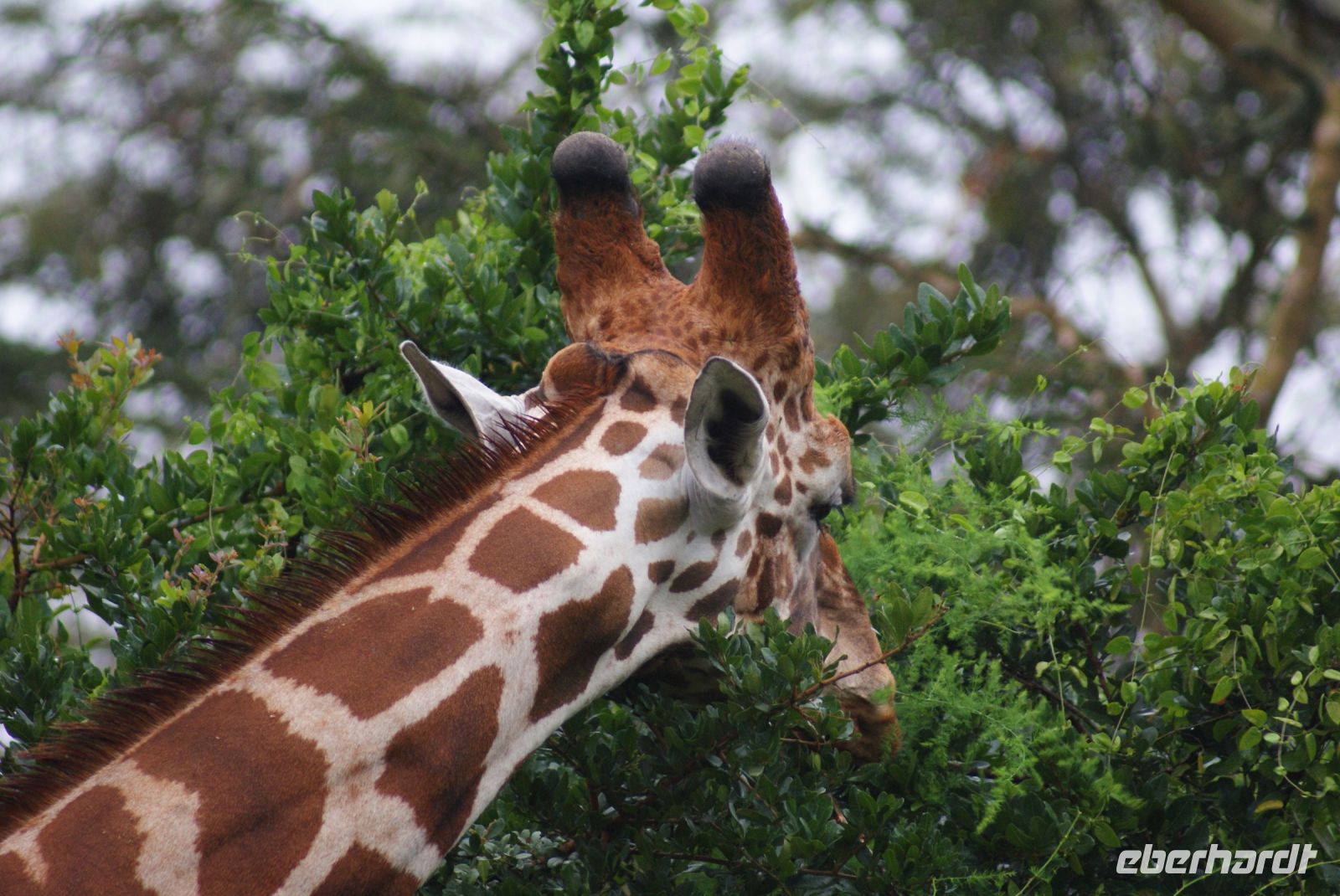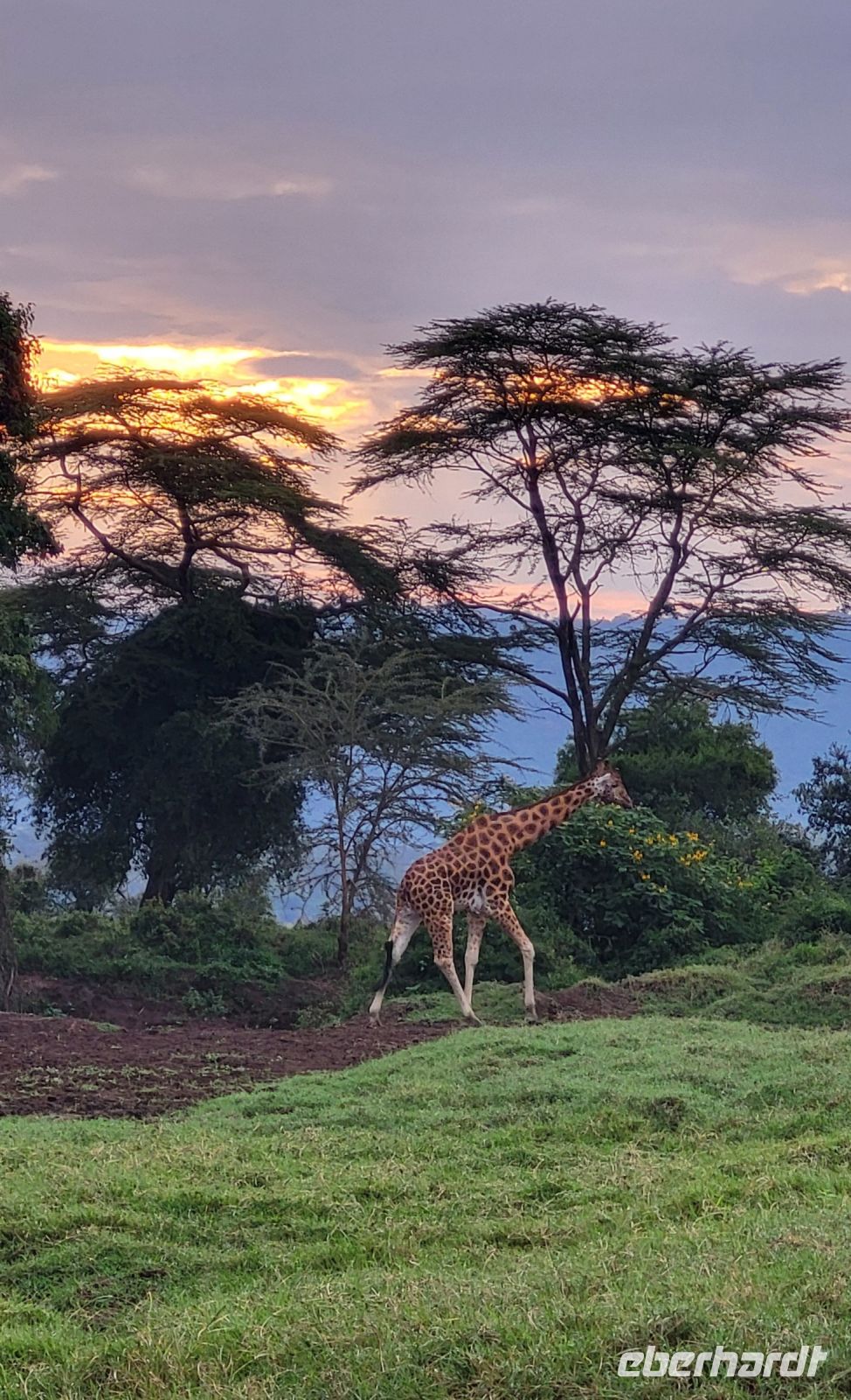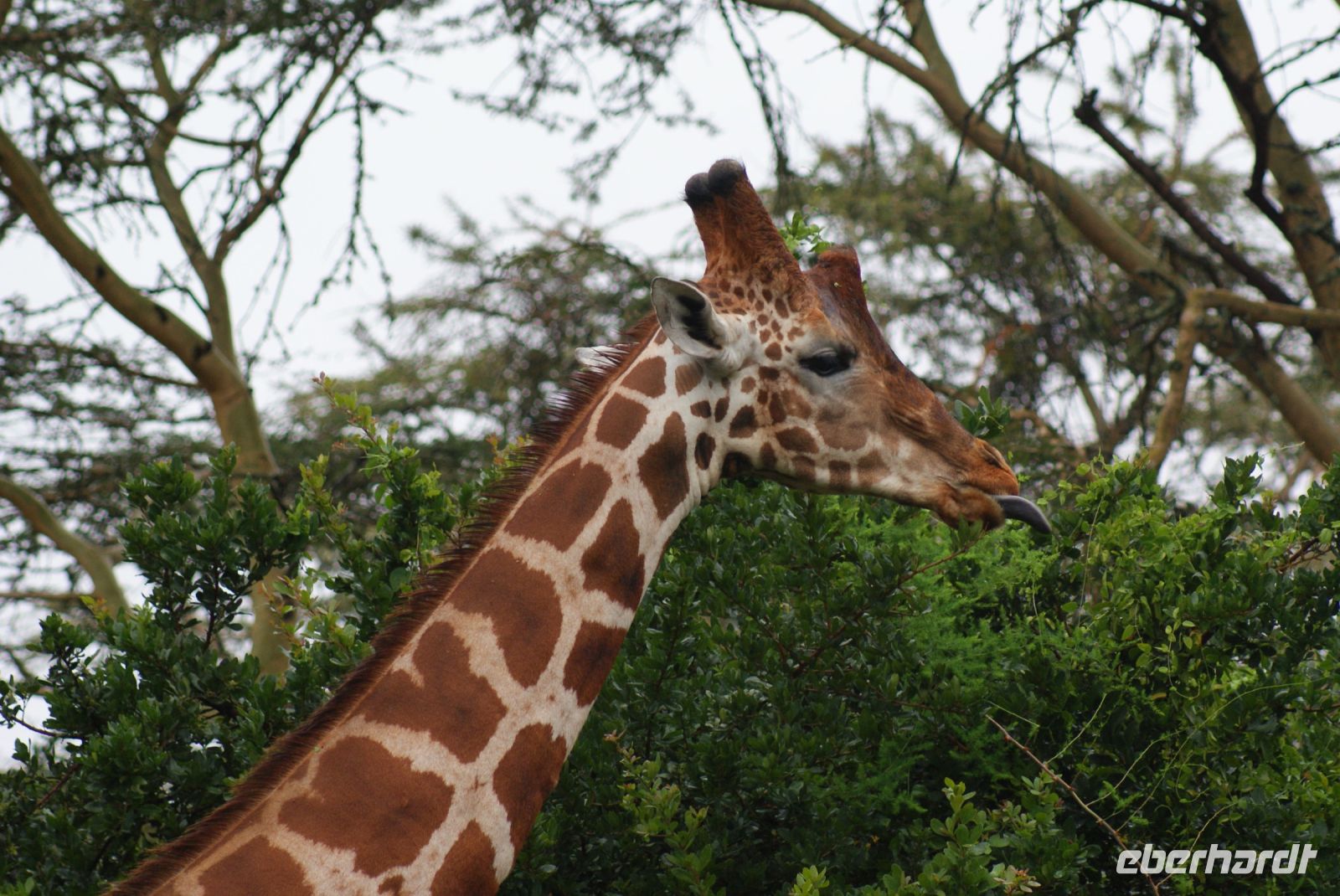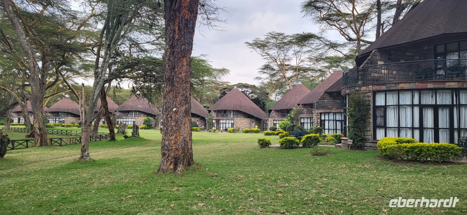 Heute Nacht hören wir erneut einige Hyänen und Löwen im Busch. Es erwartet uns vor unserer Abreise ein letztes köstliches Frühstück im Camp und herzlich erfolgt die Verabschiedung durch Campmanager Nelson. Ein letztes Mal fahren wir durch die Masai Mara, lassen nochmals die Weite sowie deren einzigartige Bewohner auf uns wirken. Eine wunderschöne Elefantenherde, die wie in einer Filmkulisse grast, dahinter Hunderte von Gnus, die sich auf den Weg über den Fluss machen, bieten wieder mal eine unglaubliche Kulisse. Über das Sekenani Gate verlassen wir die „getupfte Savanne der Masai“, unsere so einzigartige Masai Mara. Einige Stopps und 250 Km später erreichen wir mittags unser neues Domizil, das „Lake Naivasha Sopa Resort“, welches mit 21 Cottages und 84 Zimmern direkt am Wasser liegt. Der Naivasha See ist ebenfalls ein Naturreservat von 139 Km², auf 1880 m gelegen. Somit ist er einer der zwei höchsten Süßwasserseen Afrikas und Teil des Rift Valleys, des afrikanischen Grabenbruchs. Nachdem wir das Eingangstor passieren, zeigen sich bereits Zebras und Wasserböcke in der umliegenden Parkanlage. Seitens der Lodge werden wir wieder sehr freundlich willkommen geheißen und nach einem schmackhaften Mittagessen beziehen wir unsere schönen Zimmer mit Blick in den idyllischen Garten der Anlage. Später treffen wir Guide Henry zu einem einstündigen Rundgang und werden von diesem zu den hier lebenden Giraffen gebracht. Wir finden diese bei der Futtersuche im Gebüsch und können aus nur wenigen Metern Entfernung in Ruhe zuschauen. Fern von scheu zeigen sich Mütter mit Jungtieren, das kleinste gerade sechs Monate alt. Einfach nur schön. Schreiseeadler machen ihrem Namen alle Ehre, Hippos beäugen uns aus der Ferne, Hagedasch Ibisse sowie Eisvögel auf Nahrungssuche, Wasserböcke äsen im Gras, Zebras streifen umher-wir sind erneut in der Idylle angekommen. Bereits kurz nachdem wir vom Abendessen zurück sind, sehen wir die ersten Hippos auf der Wiese grasen, die jedoch durch einen Elektrozaun von unseren Häusern getrennt sind… Welch eine unwirkliche Kulisse als dann noch im Dunkeln eine Giraffe in direkter Nähe unseres Weges ruht und wir diese zunächst nur als Silhouette wahrnehmen.