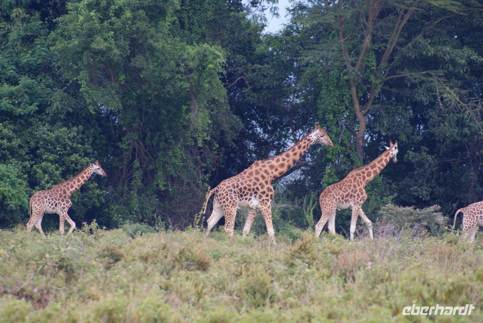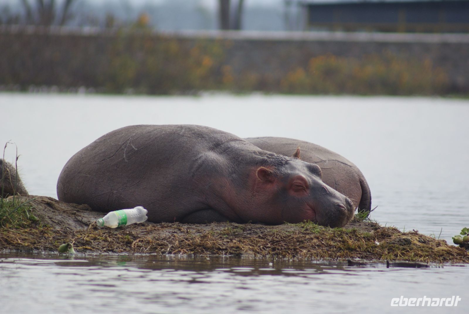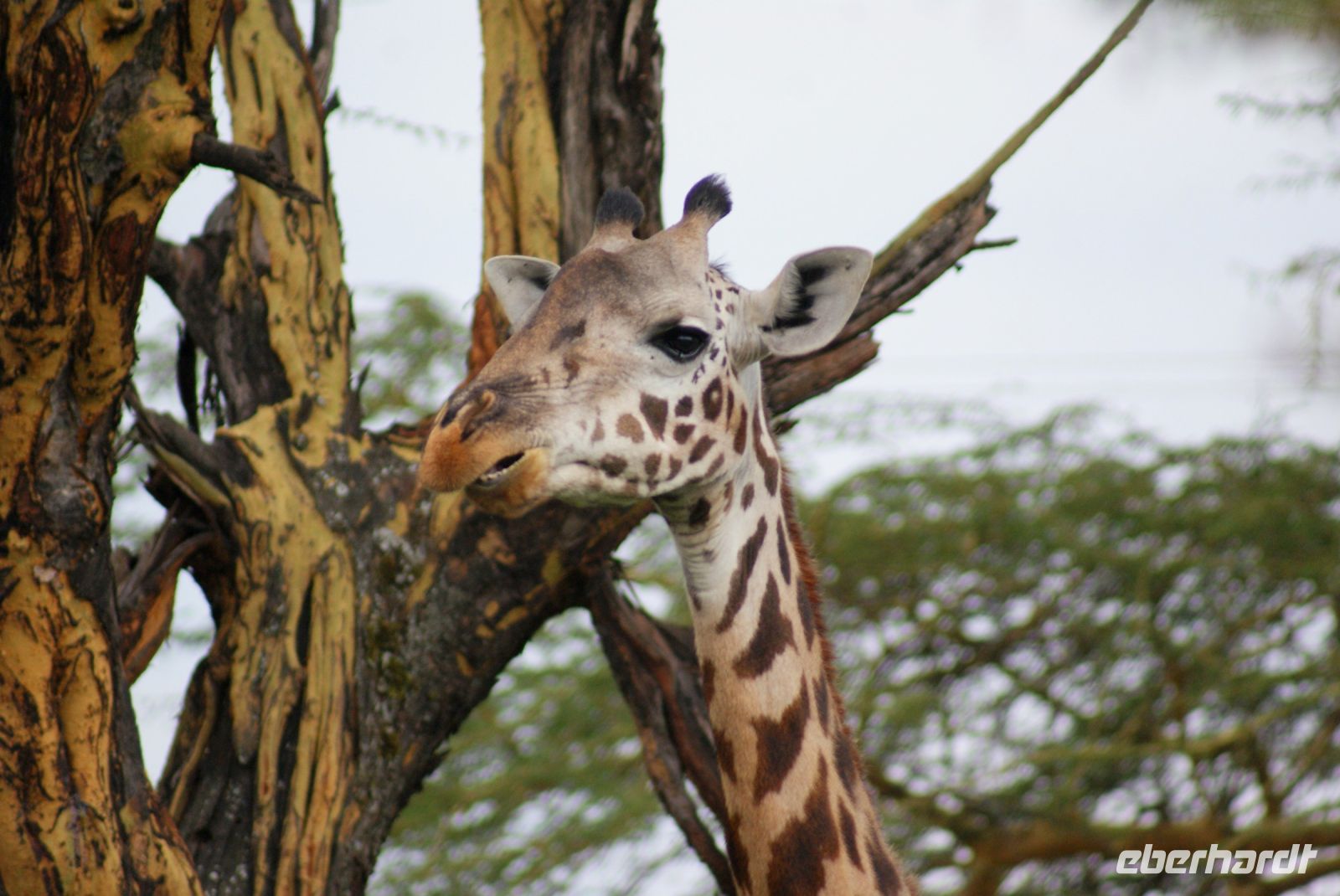 Heute Nacht hören wir erneut einige Hyänen und Löwen im Busch. Es erwartet uns vor unserer Abreise ein letztes köstliches Frühstück im Camp und herzlich erfolgt die Verabschiedung durch Campmanager Nelson. Ein letztes Mal fahren wir durch die Masai Mara, lassen nochmals die Weite sowie deren einzigartige Bewohner auf uns wirken. Eine wunderschöne Elefantenherde, die wie in einer Filmkulisse grast, dahinter Hunderte von Gnus, die sich auf den Weg über den Fluss machen, bieten wieder mal eine unglaubliche Kulisse. Über das Sekenani Gate verlassen wir die „getupfte Savanne der Masai“, unsere so einzigartige Masai Mara. Einige Stopps und 250 Km später erreichen wir mittags unser neues Domizil, das „Lake Naivasha Sopa Resort“, welches mit 21 Cottages und 84 Zimmern direkt am Wasser liegt. Der Naivasha See ist ebenfalls ein Naturreservat von 139 Km², auf 1880 m gelegen. Somit ist er einer der zwei höchsten Süßwasserseen Afrikas und Teil des Rift Valleys, des afrikanischen Grabenbruchs. Nachdem wir das Eingangstor passieren, zeigen sich bereits Zebras und Wasserböcke in der umliegenden Parkanlage. Seitens der Lodge werden wir wieder sehr freundlich willkommen geheißen und nach einem schmackhaften Mittagessen beziehen wir unsere schönen Zimmer mit Blick in den idyllischen Garten der Anlage. Später treffen wir Guide Henry zu einem einstündigen Rundgang und werden von diesem zu den hier lebenden Giraffen gebracht. Wir finden diese bei der Futtersuche im Gebüsch und können aus nur wenigen Metern Entfernung in Ruhe zuschauen. Fern von scheu zeigen sich Mütter mit Jungtieren, das kleinste gerade sechs Monate alt. Einfach nur schön. Schreiseeadler machen ihrem Namen alle Ehre, Hippos beäugen uns aus der Ferne, Hagedasch Ibisse sowie Eisvögel auf Nahrungssuche, Wasserböcke äsen im Gras, Zebras streifen umher-wir sind erneut in der Idylle angekommen. Bereits kurz nachdem wir vom Abendessen zurück sind, sehen wir die ersten Hippos auf der Wiese grasen, die jedoch durch einen Elektrozaun von unseren Häusern getrennt sind… Welch eine unwirkliche Kulisse als dann noch im Dunkeln eine Giraffe in direkter Nähe unseres Weges ruht und wir diese zunächst nur als Silhouette wahrnehmen.
