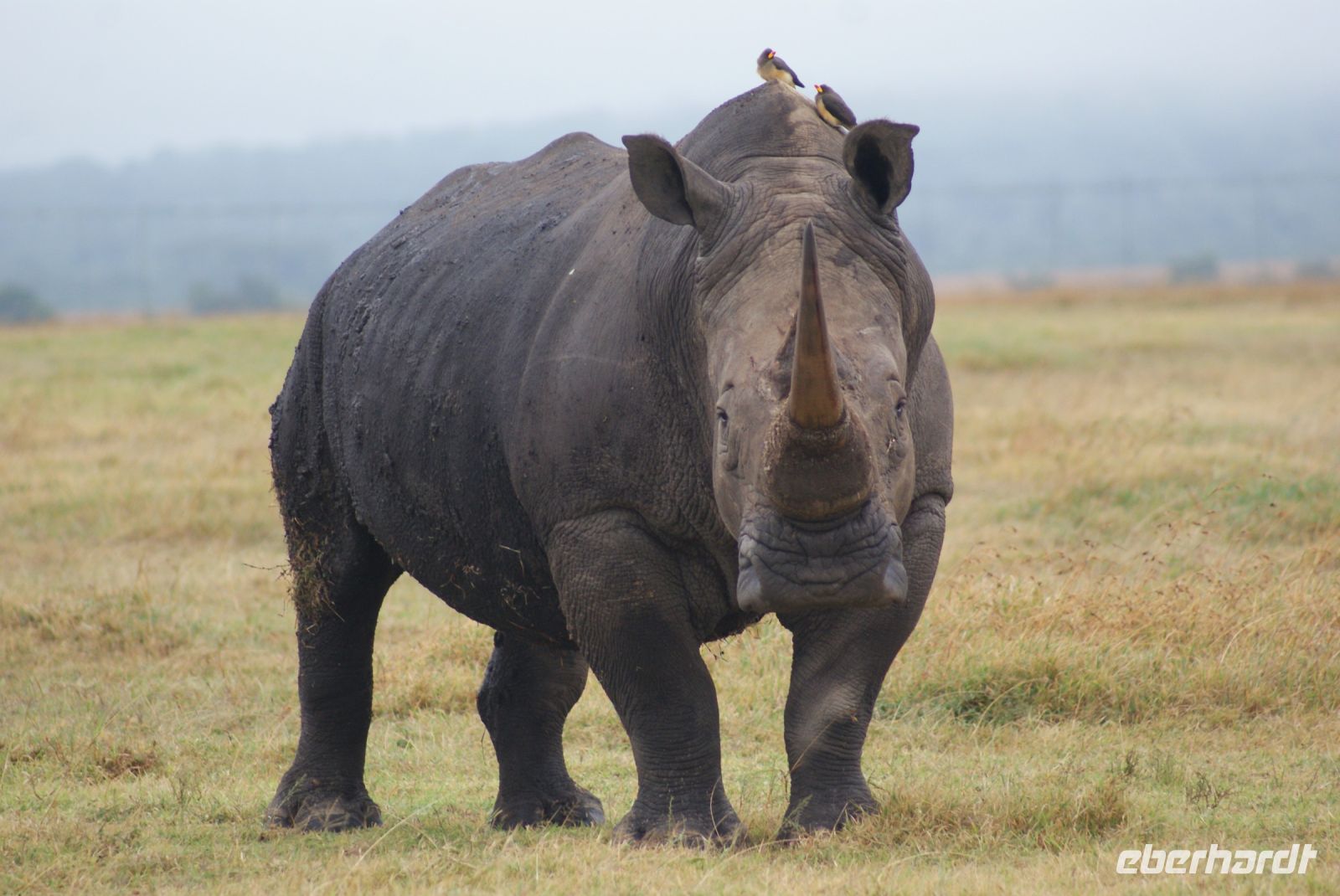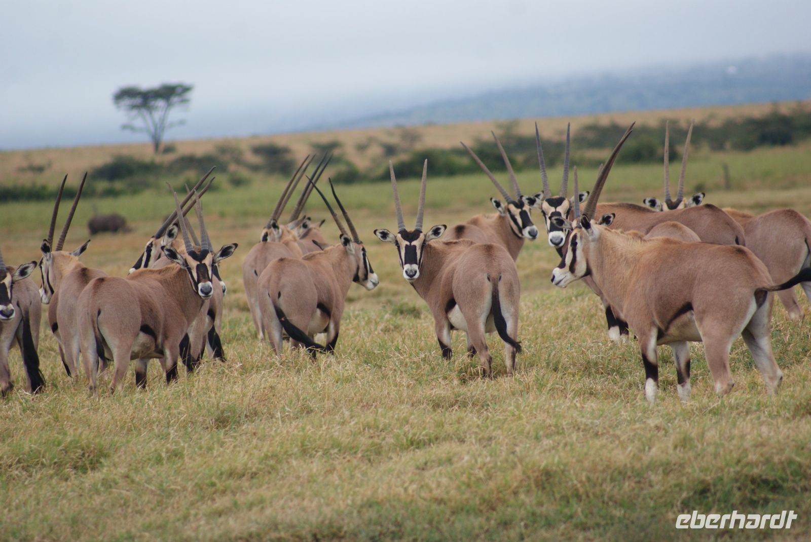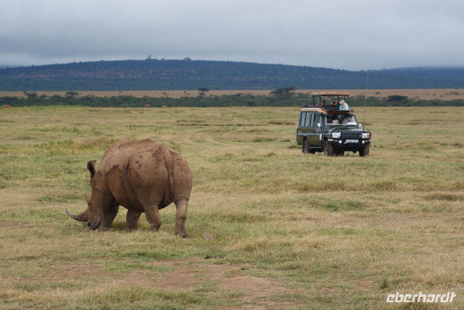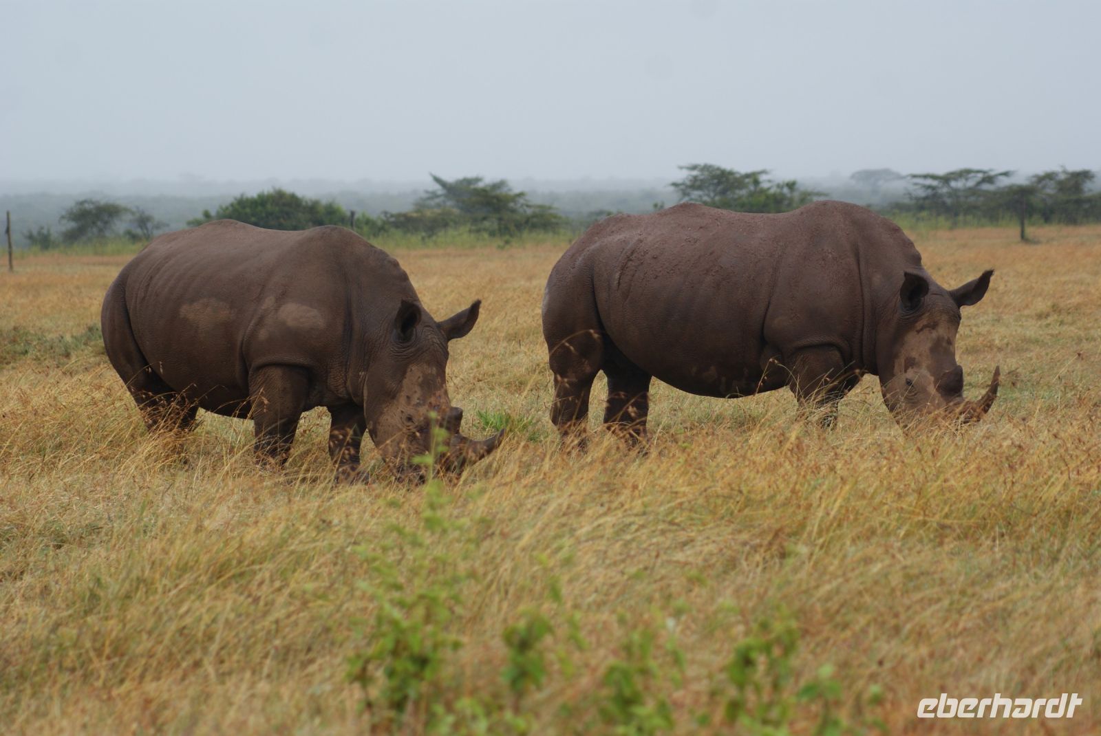 Nach einer kühlen und etwas regnerischen Nacht starten wir am frühen Morgen mit unseren Guides Nick und Caleb zum Solio Game Reserve, einem bekannten, kenianischen Nashorn Schutzgebiet. Dank der strategisch guten Lage der Lodge, haben wir dieses nach wenigen Fahrminuten erreicht, noch kurz folgt die Registrierung und schon geht’s los- unsere erste Safari beginnt. Wir bewegen uns so ziemlich alleine auf dem 17.500 Hektar großen Areal. Lassen die afrikanische Landschaft mit Aberdere Gebirge zur einen Seite und Mount Kenya in Wolken verhangen, auf der anderen Seite, links und rechts wunderbar goldfarbene Gelbrindenakazien auch Fieberakazien genannt, auf uns wirken. Schon sehr bald zeigen sich die ersten Tiere und wir erleben eine tolle Pirschfahrt im Schutzgebiet mit der weltweit größten Population an Breitmaulnashörnern sowie an die einhundert Spitzmaulnashörnern. Von unseren Guides erfahren wir viel Wissenswertes über diese bedrohten Tiere. Beispielsweise laufen bei Breitmaulnashörnern die Jungtiere immer vor der Mutter, Spitzmaulnashörner führen den Nachwuchs immer hinter sich. Dies beruht darauf, dass Breitmaulnashörner in der offenen Savanne und Spitzmaulnashörner im dichten Busch unterwegs sind. Im Laufe des Vormittags sehen wir folgende Tiere: ca. 80 Breitmaulnashörner (oder mehr), Rotschildgiraffen, Oryxantilopen, Elandantilopen, die somit größte Antilopenart, Schwarzfersenantilopen (Impalas), Thomson Gazellen, Zebras, Paviane, grüne Meerkatzen, etliche Wasserböcke sowie diverse Vögel: Kronenkraniche, die Nationalvögel Ugandas, Waffenkibitz, Hagedasch Ibis, Glanzstare, Frankoline, Perlhühner, Geier und viele mehr. Da leider der am späten Vormittag eingesetzte Regen nicht aufhört, beenden wir unseren Aufenthalt hier. Die Wege werden schlammig/rutschig und wir möchten nicht Gefahr laufen, doch noch irgendwo in der Savanne stecken zu bleiben. Nichtsdestotrotz ein gelungener Auftakt unserer Keniareise mit bereits sehr vielen Tierbegegnungen, auf die noch viele in den nächsten Tagen folgen sollen. Wir kehren zu einem späten Mittagessen zurück zur Rhino Lodge und im Anschluss genießen wir den freien Nachmittag, lassen das Erlebte sacken, sichten unsere jetzt schon unzähligen Fotos bis wir uns an der Kaminbar zu einem schmackhaften Abendessen wiedersehen.