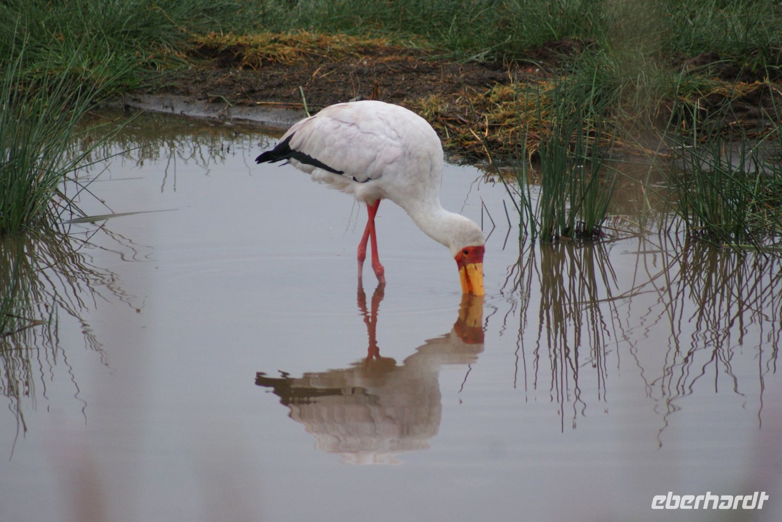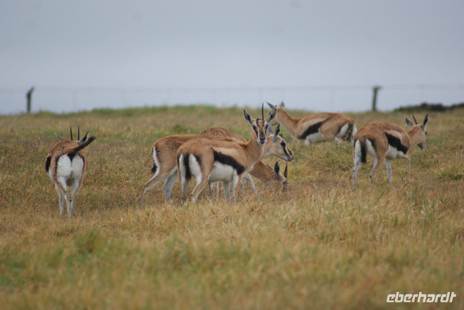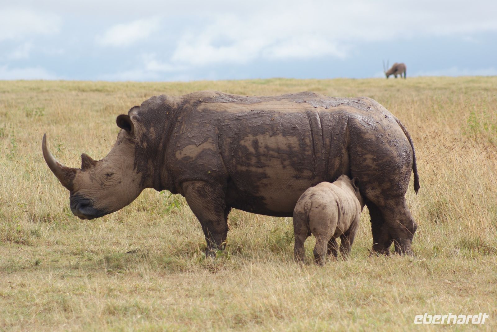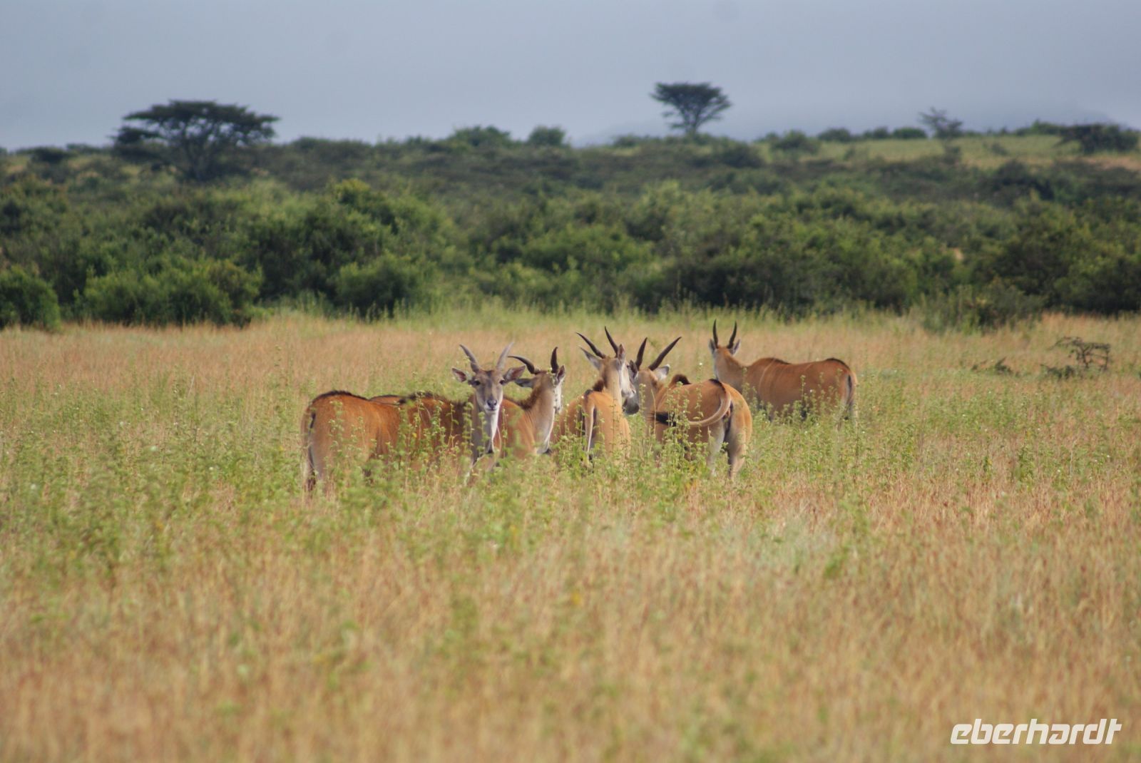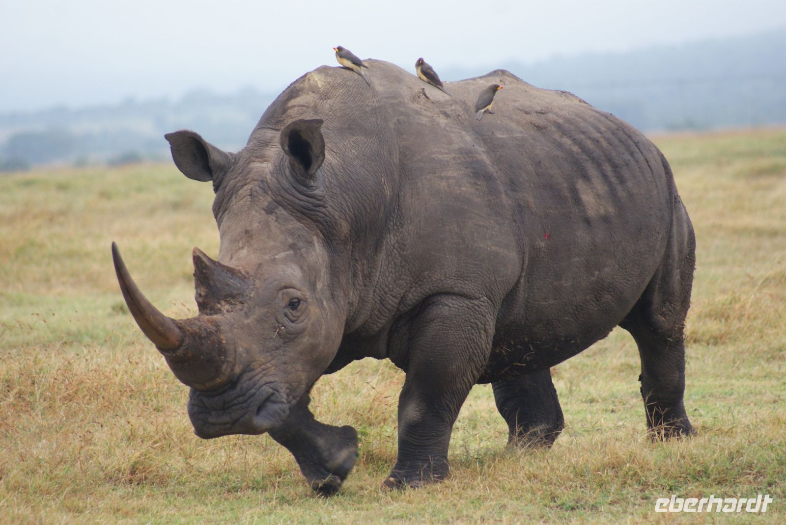 Nach einer kühlen und etwas regnerischen Nacht starten wir am frühen Morgen mit unseren Guides Nick und Caleb zum Solio Game Reserve, einem bekannten, kenianischen Nashorn Schutzgebiet. Dank der strategisch guten Lage der Lodge, haben wir dieses nach wenigen Fahrminuten erreicht, noch kurz folgt die Registrierung und schon geht’s los- unsere erste Safari beginnt. Wir bewegen uns so ziemlich alleine auf dem 17.500 Hektar großen Areal. Lassen die afrikanische Landschaft mit Aberdere Gebirge zur einen Seite und Mount Kenya in Wolken verhangen, auf der anderen Seite, links und rechts wunderbar goldfarbene Gelbrindenakazien auch Fieberakazien genannt, auf uns wirken. Schon sehr bald zeigen sich die ersten Tiere und wir erleben eine tolle Pirschfahrt im Schutzgebiet mit der weltweit größten Population an Breitmaulnashörnern sowie an die einhundert Spitzmaulnashörnern. Von unseren Guides erfahren wir viel Wissenswertes über diese bedrohten Tiere. Beispielsweise laufen bei Breitmaulnashörnern die Jungtiere immer vor der Mutter, Spitzmaulnashörner führen den Nachwuchs immer hinter sich. Dies beruht darauf, dass Breitmaulnashörner in der offenen Savanne und Spitzmaulnashörner im dichten Busch unterwegs sind. Im Laufe des Vormittags sehen wir folgende Tiere: ca. 80 Breitmaulnashörner (oder mehr), Rotschildgiraffen, Oryxantilopen, Elandantilopen, die somit größte Antilopenart, Schwarzfersenantilopen (Impalas), Thomson Gazellen, Zebras, Paviane, grüne Meerkatzen, etliche Wasserböcke sowie diverse Vögel: Kronenkraniche, die Nationalvögel Ugandas, Waffenkibitz, Hagedasch Ibis, Glanzstare, Frankoline, Perlhühner, Geier und viele mehr. Da leider der am späten Vormittag eingesetzte Regen nicht aufhört, beenden wir unseren Aufenthalt hier. Die Wege werden schlammig/rutschig und wir möchten nicht Gefahr laufen, doch noch irgendwo in der Savanne stecken zu bleiben. Nichtsdestotrotz ein gelungener Auftakt unserer Keniareise mit bereits sehr vielen Tierbegegnungen, auf die noch viele in den nächsten Tagen folgen sollen. Wir kehren zu einem späten Mittagessen zurück zur Rhino Lodge und im Anschluss genießen wir den freien Nachmittag, lassen das Erlebte sacken, sichten unsere jetzt schon unzähligen Fotos bis wir uns an der Kaminbar zu einem schmackhaften Abendessen wiedersehen.