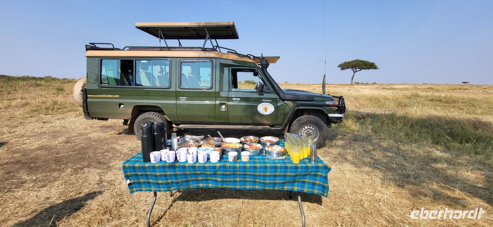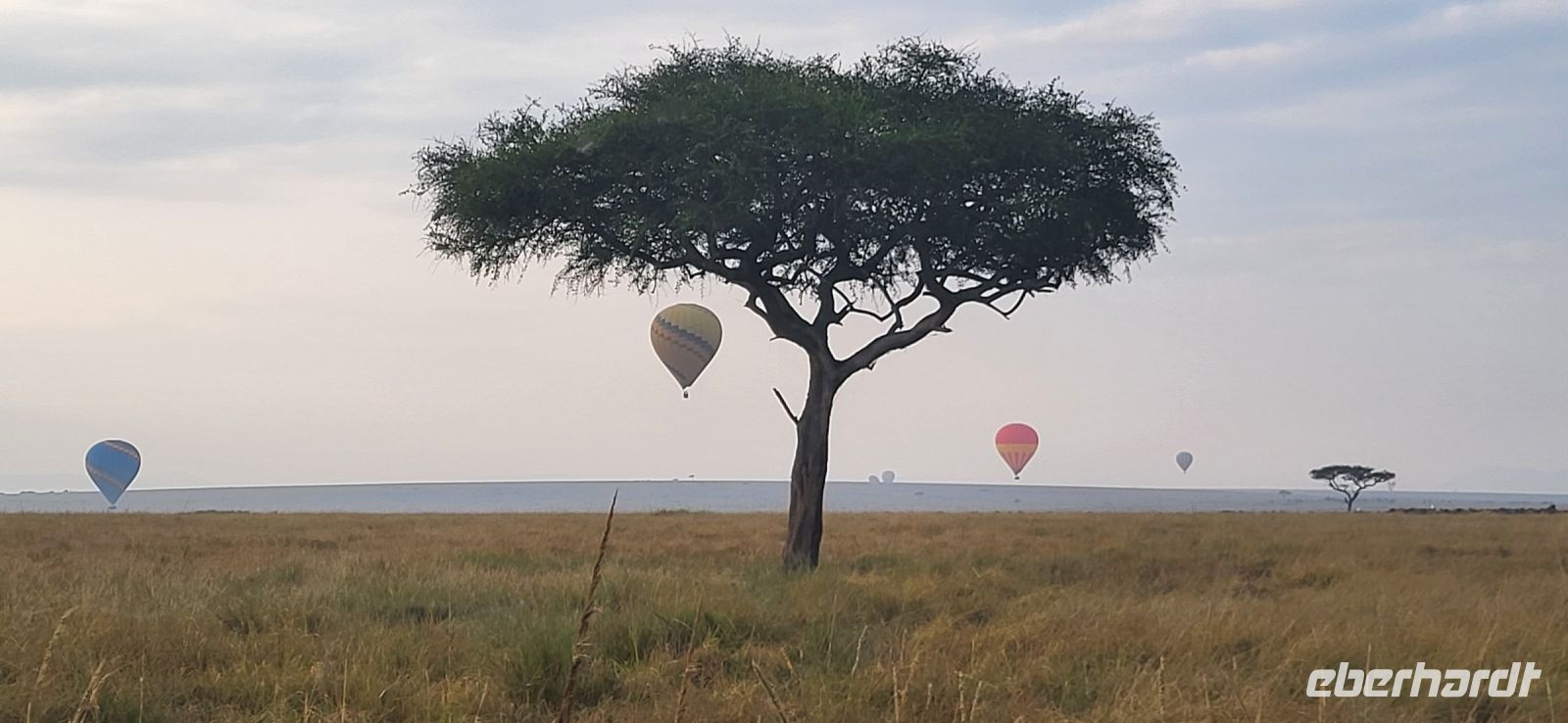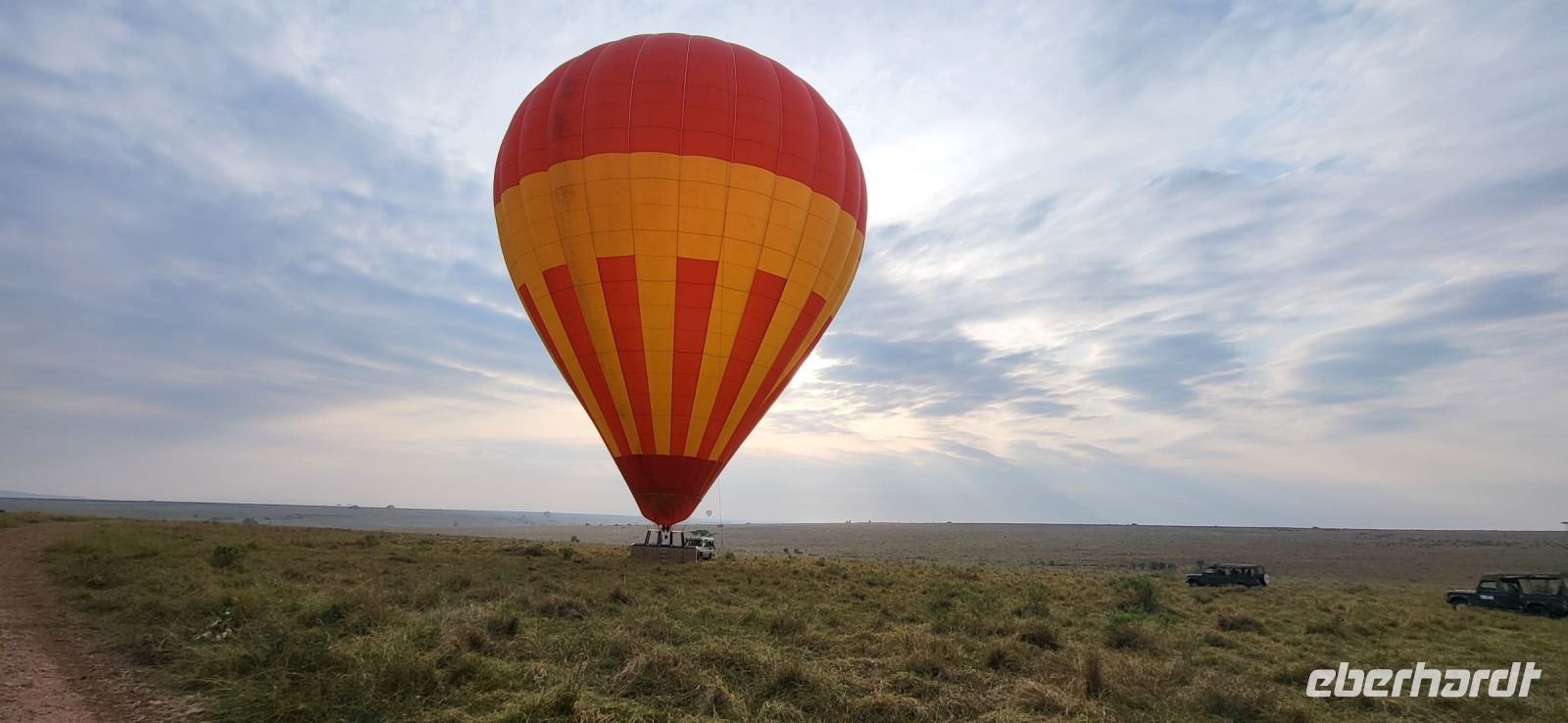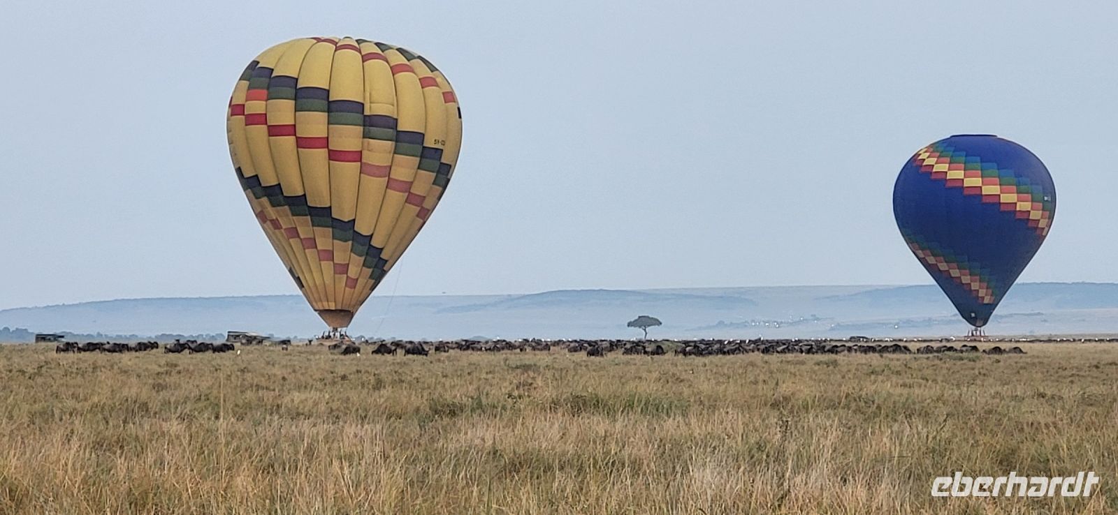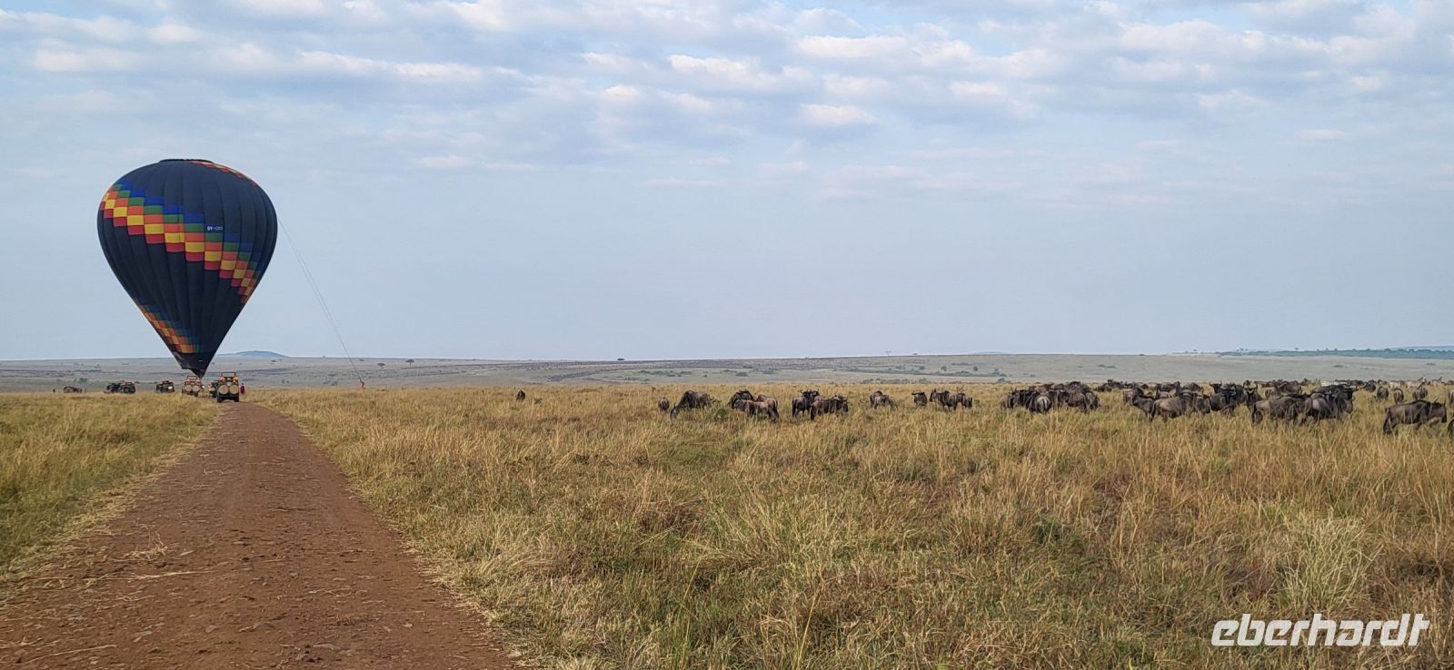Nach einer erholsamen Nacht, die die meisten von uns erstmalig im Luxuszelt verbringen, werden wir zur bestellten Uhrzeit von Askari mit Kaffee/Tee/Kakao vor dem Zelt geweckt. Diese bringen uns dann später, da immer noch düster, zum Jeep. Pünktlich um 06.30 Uhr begeben wir uns auf Morgensafari und nehmen das vom Camp bereitgestellte Frühstück mit. Wenn man möglichst viele Tiere sehen möchte, sollten die frühen Morgenstunden genutzt werden. So sehen wir nach kurzer Zeit bereits eine Elefantenherde, die sich durch uns nicht stören lässt und sich genüsslich vom frischen, jetzt sehr grünen Gras bedient. Kurz darauf entdecken wir einen Geparden auf einer Anhöhe sitzend und nach Beute Ausschau haltend, welch ein Einstieg in den heutigen Tag. Dank unserer Guides genau zur richtigen Zeit am richtigen Ort, können wir wieder wunderbare Fotos erhaschen und das stattliche Tier bestaunen. Wir ziehen weiter und das nächste Highlight sollte folgen. Bereits schon sehr viele Gnuherden und Zebras gesichtet, wissen wir, dass die Migration der Tiere beginnt. Am Horizont und kurz darauf in unmittelbarer Nähe bestaunen wir zwanzig Heißluftballons, die ihren morgendlichen Ausflug durchführen. Ein unwirkliches Bild am Himmel, mit Gnuherden davor und die Weite der Savanne der Masai Mara. Wir besuchen den Sandriver, wo eine riesige Gnuherde gegenüber wartet. Da sich zunächst nichts tut, finden wir erstmal ein schönes Plätzchen, bereiten unser erstes Frühstück in der Masai Mara vor. Hierzu hat uns unser Camp einiges an Köstlichkeiten mitgegeben und so genießen wir die leckeren Speisen unter einem sogenannten Balanite tree, der wir eine Akazie aussieht. Mit Blick in die Weite der Masai Mara ist all dies einfach nur ein Genuss und ein unvergesslicher Augenblick. Danach geht es weiter Richtung Sand River, wo sich bereits unendlich viele Gnus tummeln, um von hier aus in fruchtbarere Gebiete umzusiedeln. Was man sonst nur aus Dokumentationen kennt, erleben wir hier hautnah, einfach unglaublich und für nun zahlreiche Jeeps um uns herum ein riesiges Ereignis. Auf dem Weg zum Mittagsstopp sehen wir nochmals eine Löwin, die gemächlich vor uns spaziert und die wir lange beobachten können. Im Anschluss in der Nähe ein junger Leopard, der ebenfalls entlang des Weges unterwegs ist. Was für Erlebnisse bereits am Vormittag, wir können unser Glück kaum fassen. Mittags kehren wir zum Camp zurück, genießen ein erneut schmackhaftes Mittagessen und halten etwas Siesta, bevor es am Nachmittag nochmals auf Pirschfahrt geht.