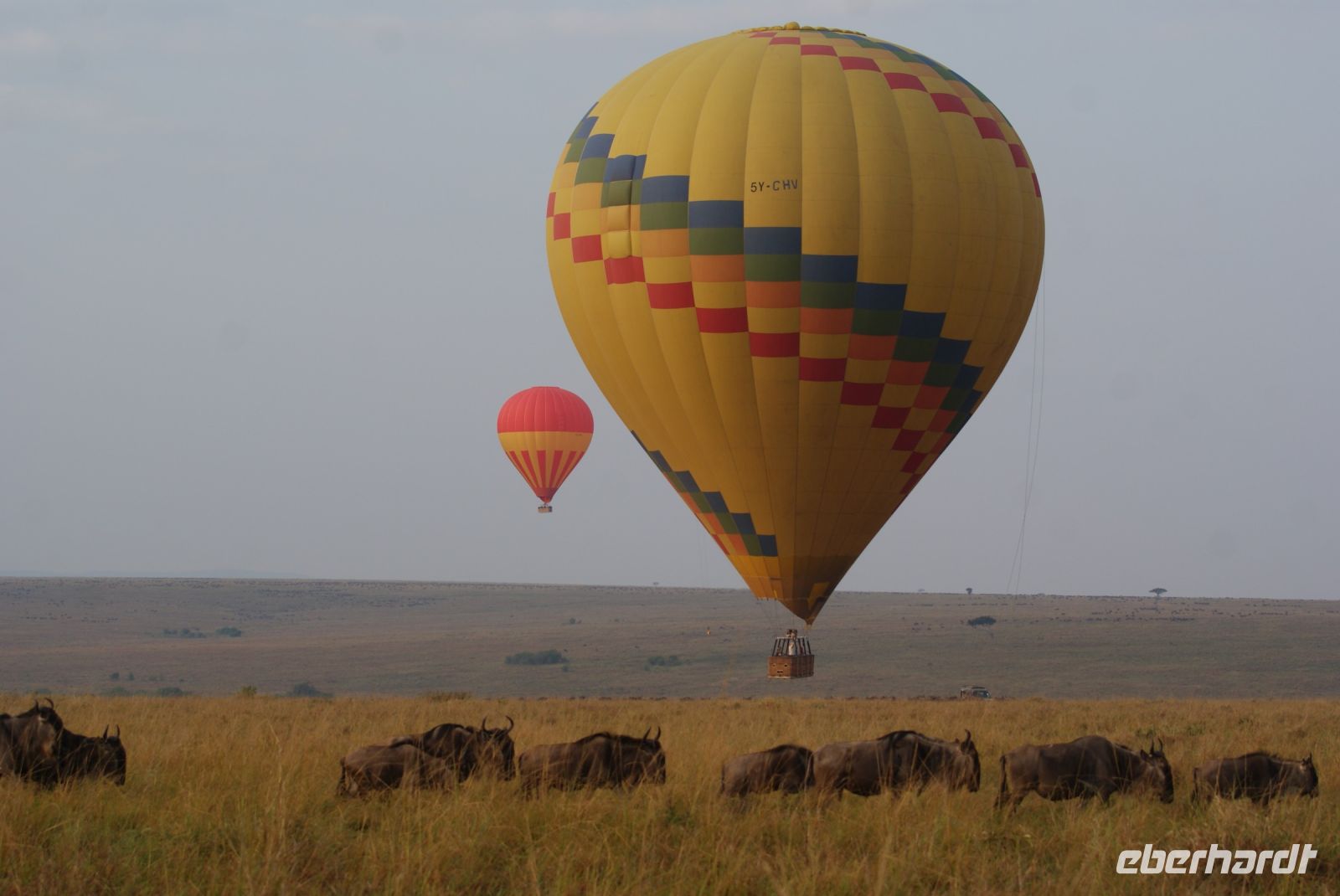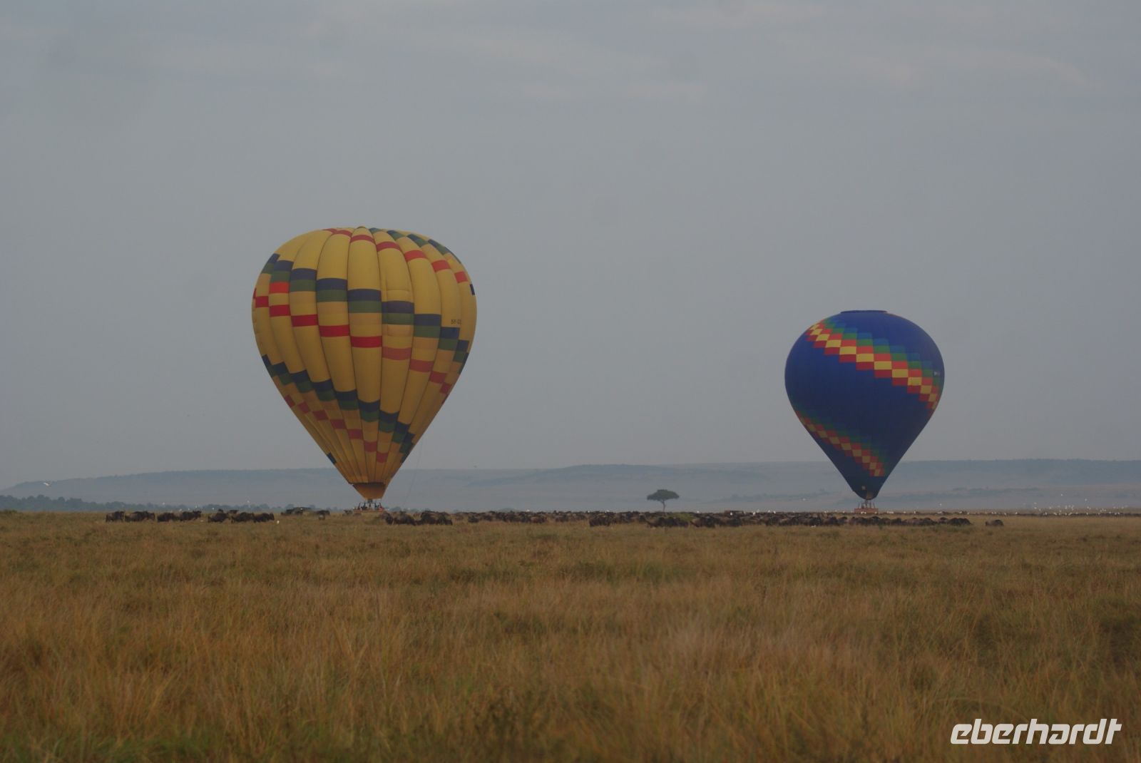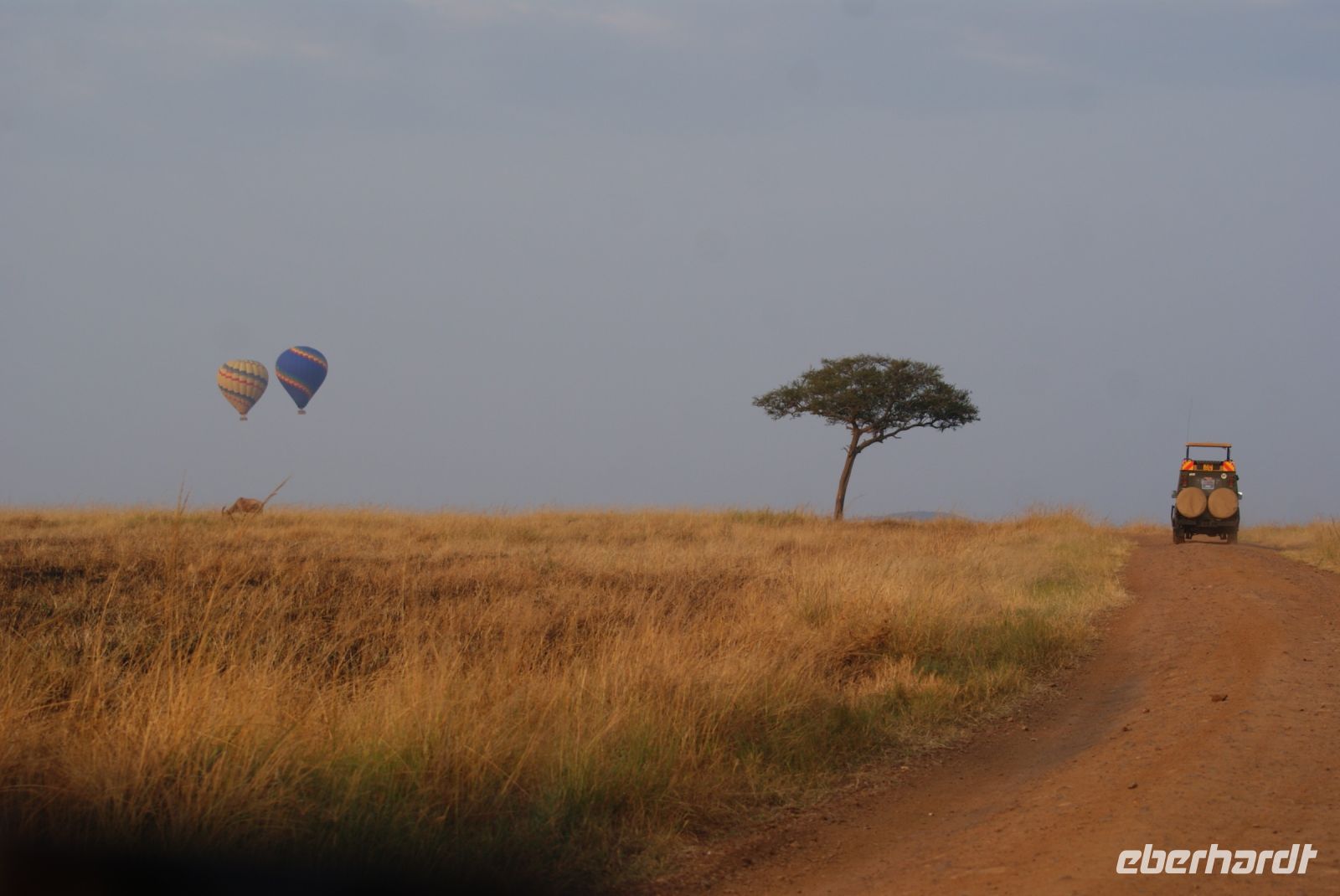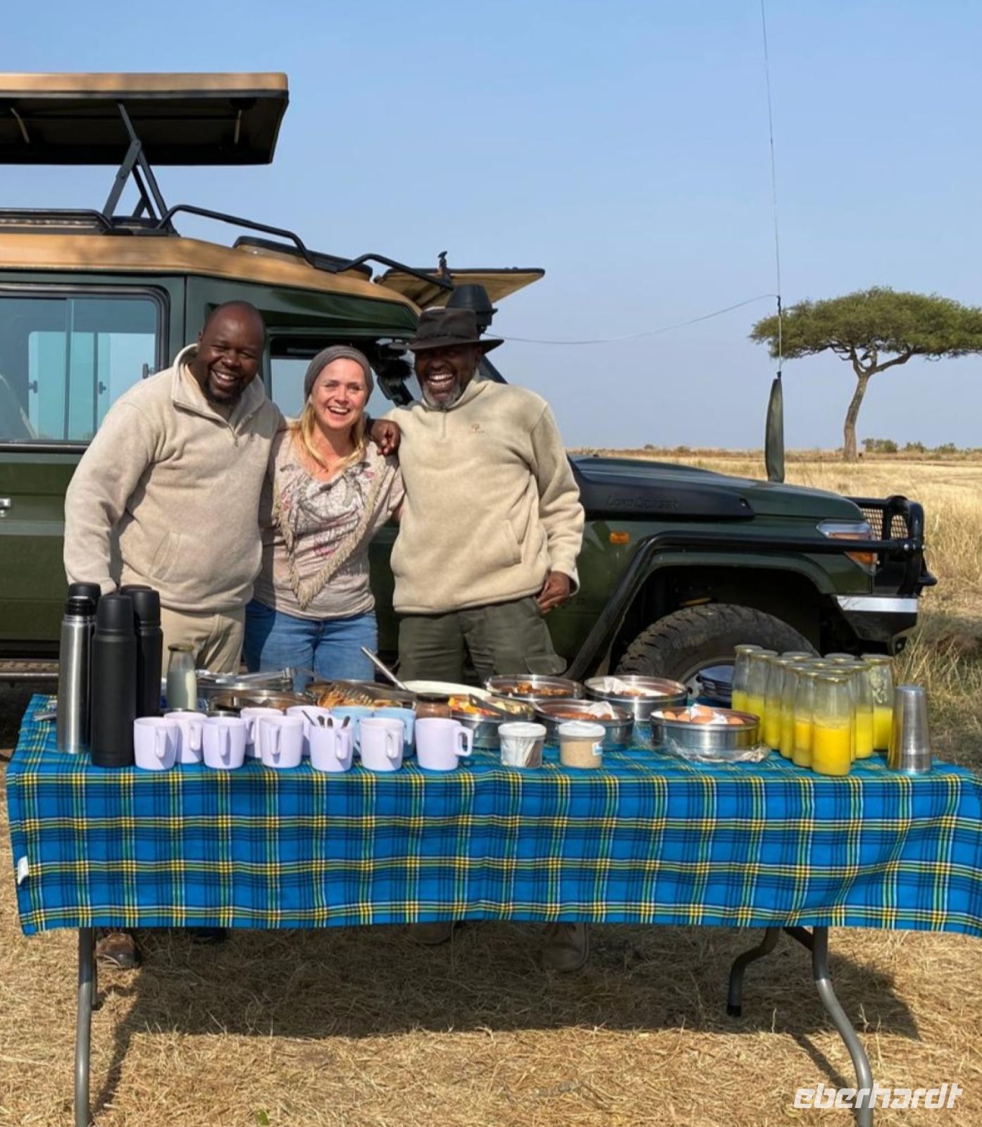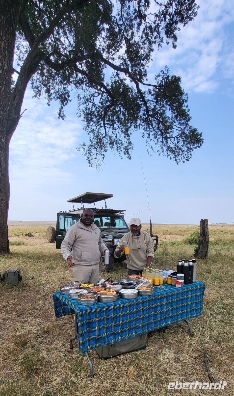 Nach einer erholsamen Nacht, die die meisten von uns erstmalig im Luxuszelt verbringen, werden wir zur bestellten Uhrzeit von Askari mit Kaffee/Tee/Kakao vor dem Zelt geweckt. Diese bringen uns dann später, da immer noch düster, zum Jeep. Pünktlich um 06.30 Uhr begeben wir uns auf Morgensafari und nehmen das vom Camp bereitgestellte Frühstück mit. Wenn man möglichst viele Tiere sehen möchte, sollten die frühen Morgenstunden genutzt werden. So sehen wir nach kurzer Zeit bereits eine Elefantenherde, die sich durch uns nicht stören lässt und sich genüsslich vom frischen, jetzt sehr grünen Gras bedient. Kurz darauf entdecken wir einen Geparden auf einer Anhöhe sitzend und nach Beute Ausschau haltend, welch ein Einstieg in den heutigen Tag. Dank unserer Guides genau zur richtigen Zeit am richtigen Ort, können wir wieder wunderbare Fotos erhaschen und das stattliche Tier bestaunen. Wir ziehen weiter und das nächste Highlight sollte folgen. Bereits schon sehr viele Gnuherden und Zebras gesichtet, wissen wir, dass die Migration der Tiere beginnt. Am Horizont und kurz darauf in unmittelbarer Nähe bestaunen wir zwanzig Heißluftballons, die ihren morgendlichen Ausflug durchführen. Ein unwirkliches Bild am Himmel, mit Gnuherden davor und die Weite der Savanne der Masai Mara. Wir besuchen den Sandriver, wo eine riesige Gnuherde gegenüber wartet. Da sich zunächst nichts tut, finden wir erstmal ein schönes Plätzchen, bereiten unser erstes Frühstück in der Masai Mara vor. Hierzu hat uns unser Camp einiges an Köstlichkeiten mitgegeben und so genießen wir die leckeren Speisen unter einem sogenannten Balanite tree, der wir eine Akazie aussieht. Mit Blick in die Weite der Masai Mara ist all dies einfach nur ein Genuss und ein unvergesslicher Augenblick. Danach geht es weiter Richtung Sand River, wo sich bereits unendlich viele Gnus tummeln, um von hier aus in fruchtbarere Gebiete umzusiedeln. Was man sonst nur aus Dokumentationen kennt, erleben wir hier hautnah, einfach unglaublich und für nun zahlreiche Jeeps um uns herum ein riesiges Ereignis. Auf dem Weg zum Mittagsstopp sehen wir nochmals eine Löwin, die gemächlich vor uns spaziert und die wir lange beobachten können. Im Anschluss in der Nähe ein junger Leopard, der ebenfalls entlang des Weges unterwegs ist. Was für Erlebnisse bereits am Vormittag, wir können unser Glück kaum fassen. Mittags kehren wir zum Camp zurück, genießen ein erneut schmackhaftes Mittagessen und halten etwas Siesta, bevor es am Nachmittag nochmals auf Pirschfahrt geht.