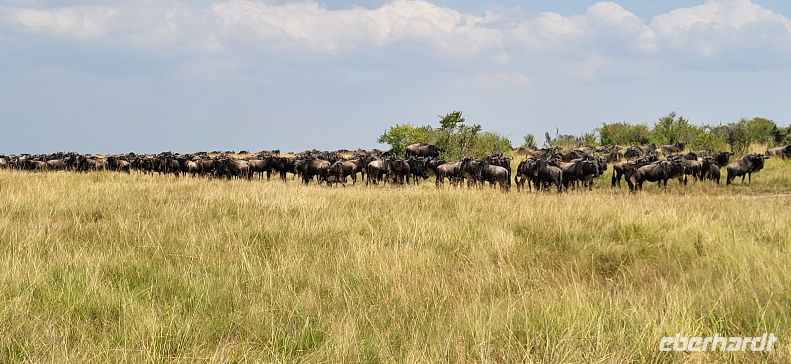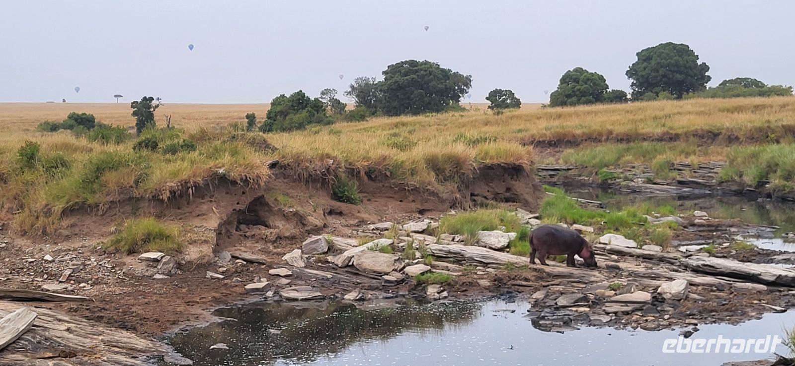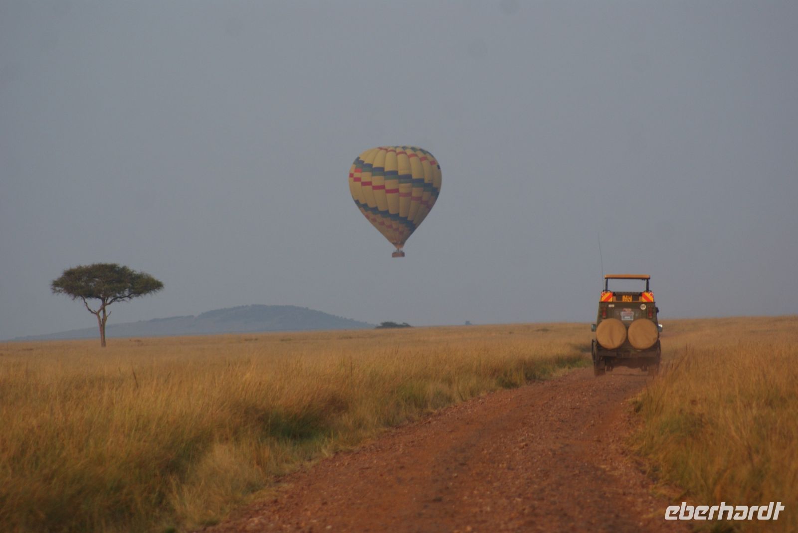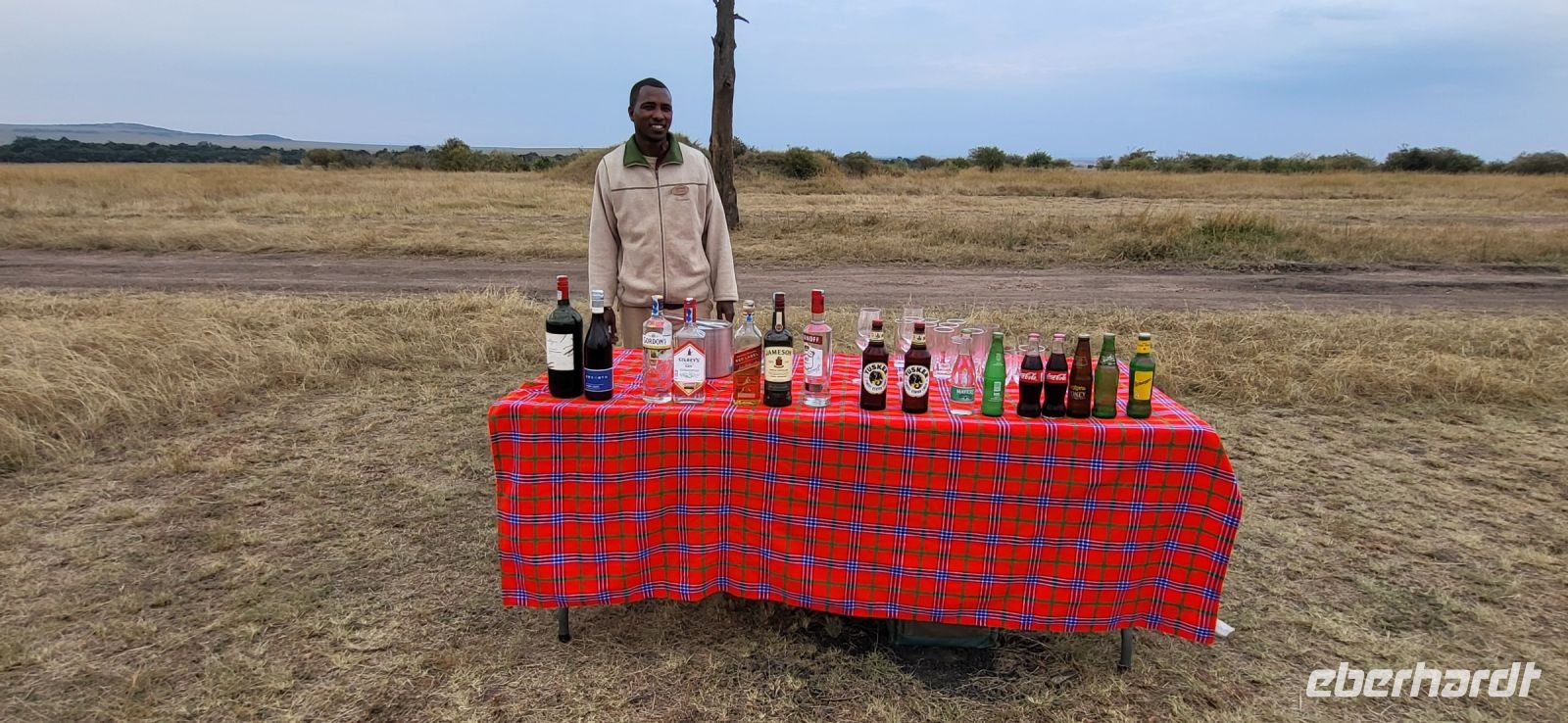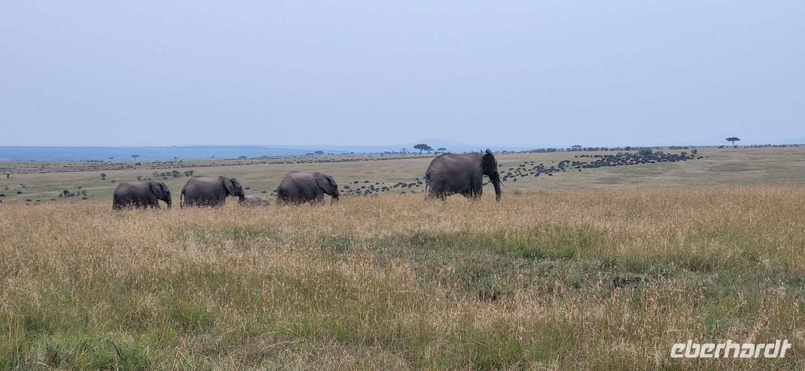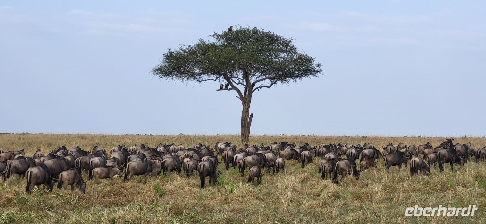 Nach einer erholsamen Nacht, die die meisten von uns erstmalig im Luxuszelt verbringen, werden wir zur bestellten Uhrzeit von Askari mit Kaffee/Tee/Kakao vor dem Zelt geweckt. Diese bringen uns dann später, da immer noch düster, zum Jeep. Pünktlich um 06.30 Uhr begeben wir uns auf Morgensafari und nehmen das vom Camp bereitgestellte Frühstück mit. Wenn man möglichst viele Tiere sehen möchte, sollten die frühen Morgenstunden genutzt werden. So sehen wir nach kurzer Zeit bereits eine Elefantenherde, die sich durch uns nicht stören lässt und sich genüsslich vom frischen, jetzt sehr grünen Gras bedient. Kurz darauf entdecken wir einen Geparden auf einer Anhöhe sitzend und nach Beute Ausschau haltend, welch ein Einstieg in den heutigen Tag. Dank unserer Guides genau zur richtigen Zeit am richtigen Ort, können wir wieder wunderbare Fotos erhaschen und das stattliche Tier bestaunen. Wir ziehen weiter und das nächste Highlight sollte folgen. Bereits schon sehr viele Gnuherden und Zebras gesichtet, wissen wir, dass die Migration der Tiere beginnt. Am Horizont und kurz darauf in unmittelbarer Nähe bestaunen wir zwanzig Heißluftballons, die ihren morgendlichen Ausflug durchführen. Ein unwirkliches Bild am Himmel, mit Gnuherden davor und die Weite der Savanne der Masai Mara. Wir besuchen den Sandriver, wo eine riesige Gnuherde gegenüber wartet. Da sich zunächst nichts tut, finden wir erstmal ein schönes Plätzchen, bereiten unser erstes Frühstück in der Masai Mara vor. Hierzu hat uns unser Camp einiges an Köstlichkeiten mitgegeben und so genießen wir die leckeren Speisen unter einem sogenannten Balanite tree, der wir eine Akazie aussieht. Mit Blick in die Weite der Masai Mara ist all dies einfach nur ein Genuss und ein unvergesslicher Augenblick. Danach geht es weiter Richtung Sand River, wo sich bereits unendlich viele Gnus tummeln, um von hier aus in fruchtbarere Gebiete umzusiedeln. Was man sonst nur aus Dokumentationen kennt, erleben wir hier hautnah, einfach unglaublich und für nun zahlreiche Jeeps um uns herum ein riesiges Ereignis. Auf dem Weg zum Mittagsstopp sehen wir nochmals eine Löwin, die gemächlich vor uns spaziert und die wir lange beobachten können. Im Anschluss in der Nähe ein junger Leopard, der ebenfalls entlang des Weges unterwegs ist. Was für Erlebnisse bereits am Vormittag, wir können unser Glück kaum fassen. Mittags kehren wir zum Camp zurück, genießen ein erneut schmackhaftes Mittagessen und halten etwas Siesta, bevor es am Nachmittag nochmals auf Pirschfahrt geht.