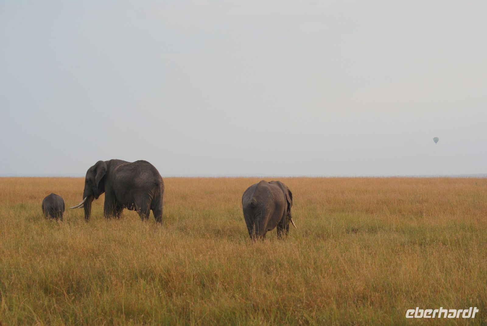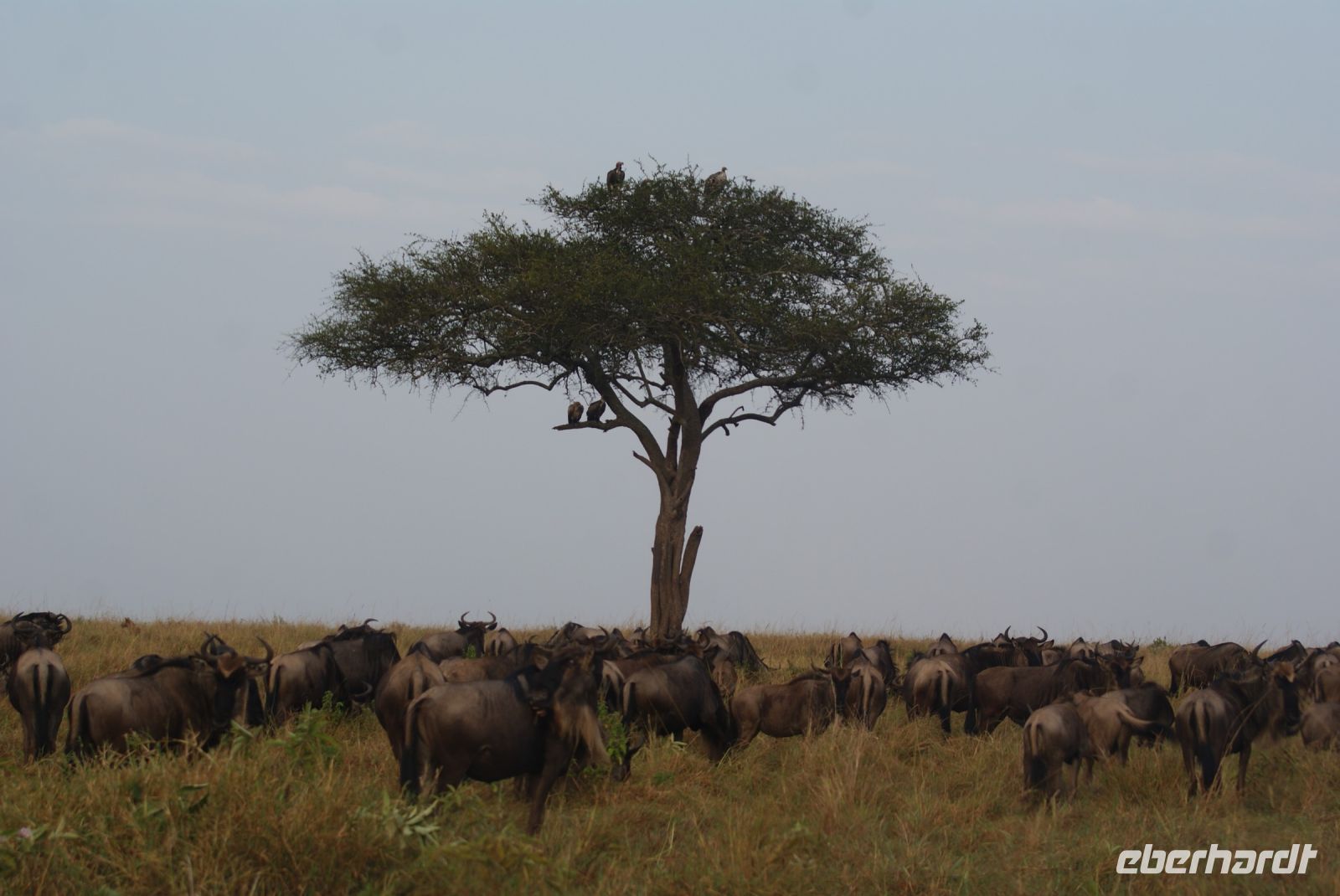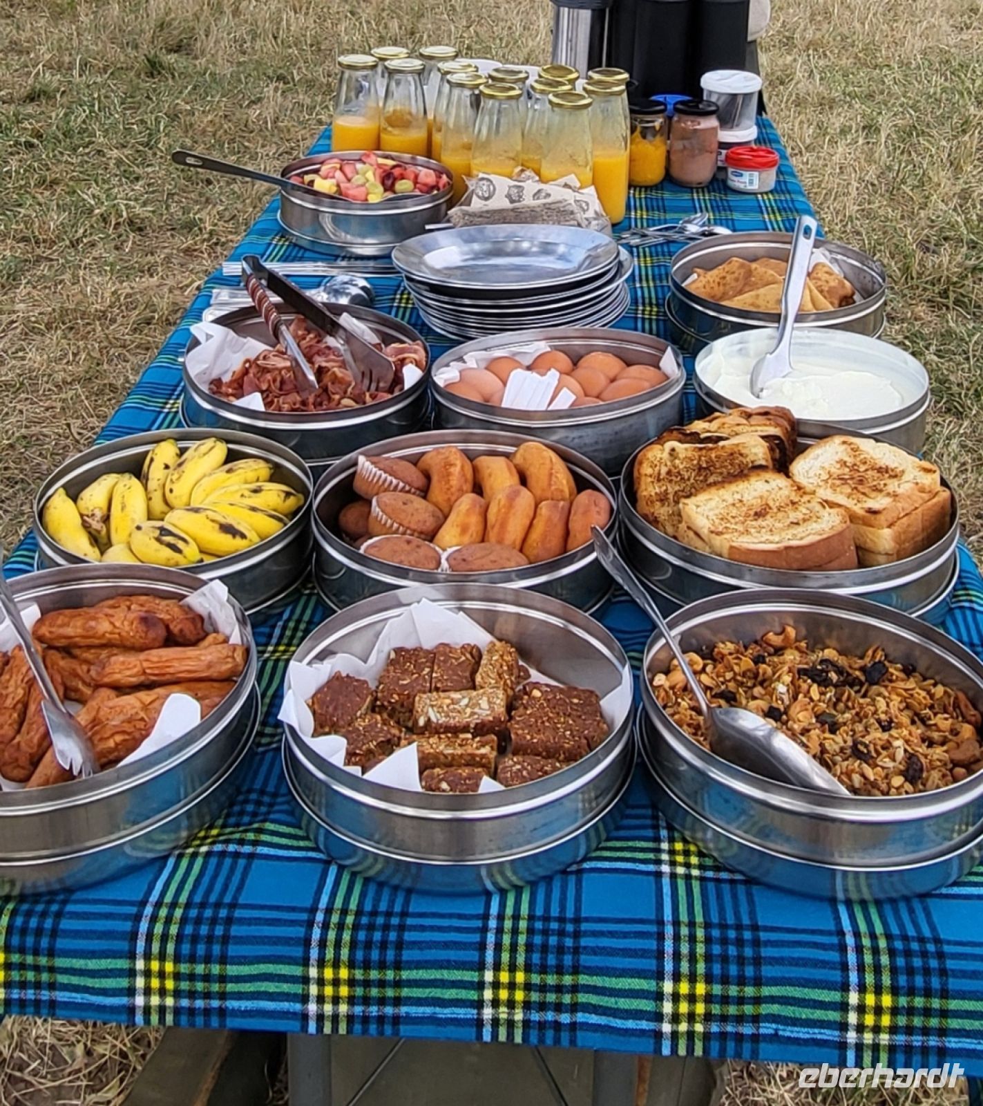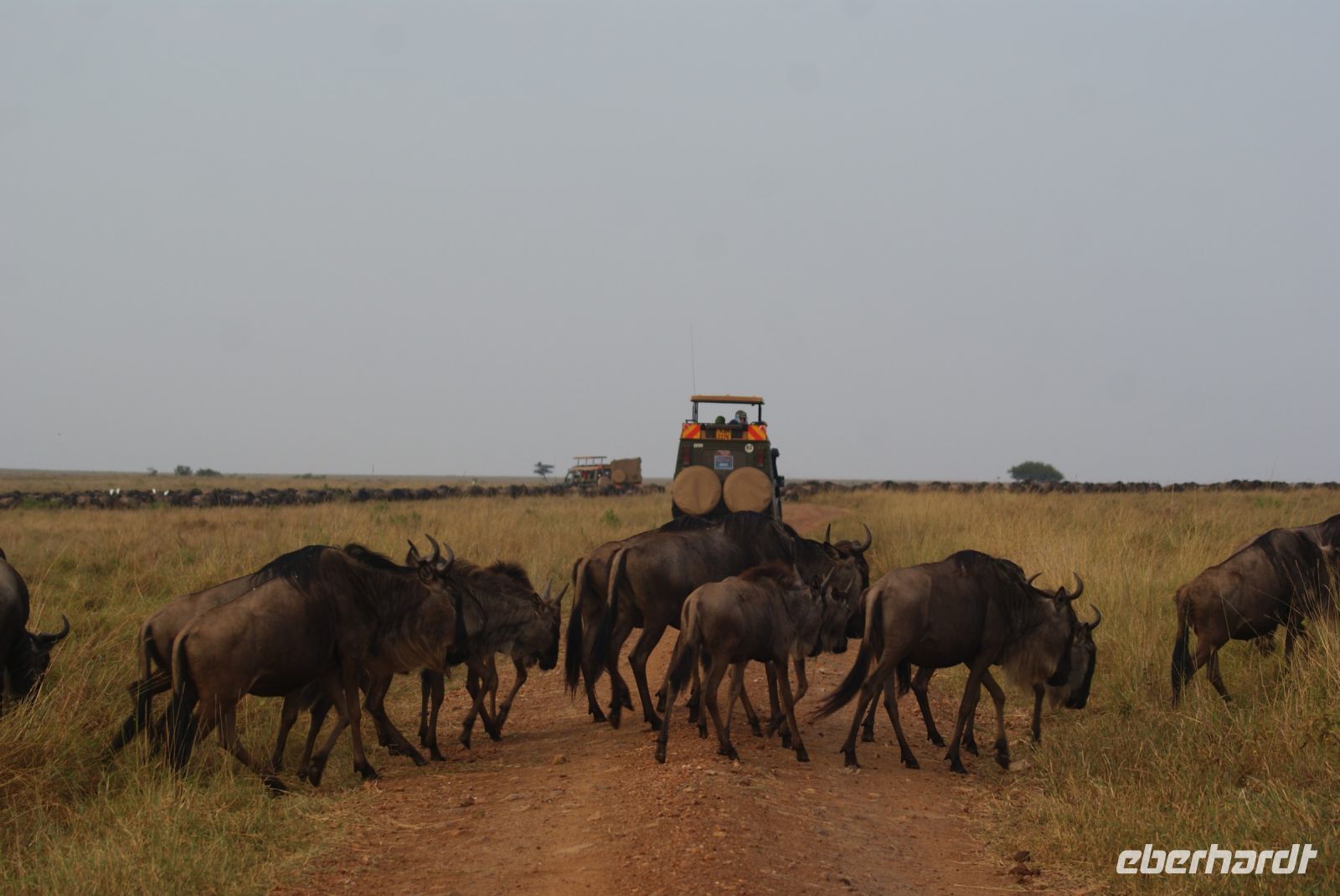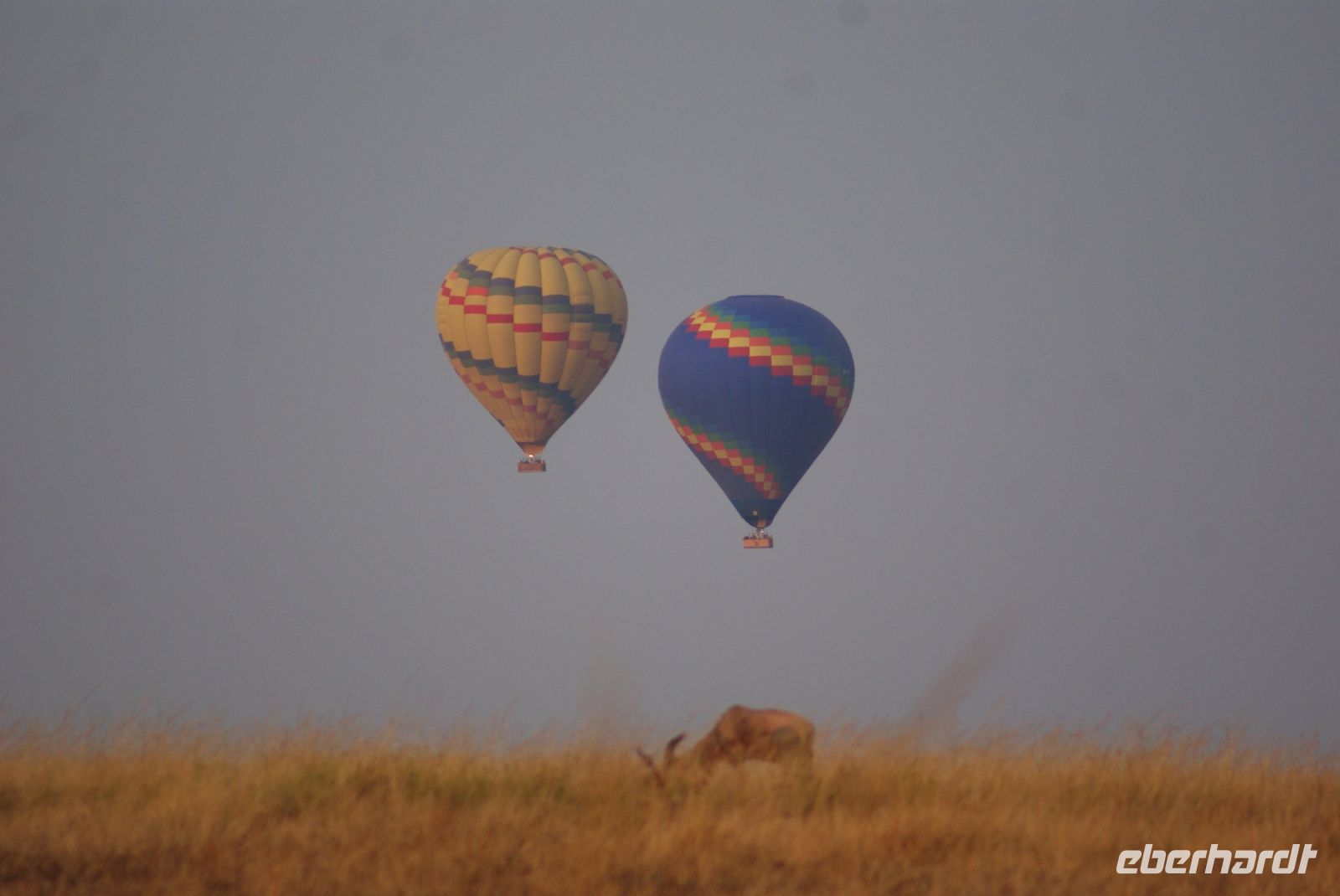 Nach einer erholsamen Nacht, die die meisten von uns erstmalig im Luxuszelt verbringen, werden wir zur bestellten Uhrzeit von Askari mit Kaffee/Tee/Kakao vor dem Zelt geweckt. Diese bringen uns dann später, da immer noch düster, zum Jeep. Pünktlich um 06.30 Uhr begeben wir uns auf Morgensafari und nehmen das vom Camp bereitgestellte Frühstück mit. Wenn man möglichst viele Tiere sehen möchte, sollten die frühen Morgenstunden genutzt werden. So sehen wir nach kurzer Zeit bereits eine Elefantenherde, die sich durch uns nicht stören lässt und sich genüsslich vom frischen, jetzt sehr grünen Gras bedient. Kurz darauf entdecken wir einen Geparden auf einer Anhöhe sitzend und nach Beute Ausschau haltend, welch ein Einstieg in den heutigen Tag. Dank unserer Guides genau zur richtigen Zeit am richtigen Ort, können wir wieder wunderbare Fotos erhaschen und das stattliche Tier bestaunen. Wir ziehen weiter und das nächste Highlight sollte folgen. Bereits schon sehr viele Gnuherden und Zebras gesichtet, wissen wir, dass die Migration der Tiere beginnt. Am Horizont und kurz darauf in unmittelbarer Nähe bestaunen wir zwanzig Heißluftballons, die ihren morgendlichen Ausflug durchführen. Ein unwirkliches Bild am Himmel, mit Gnuherden davor und die Weite der Savanne der Masai Mara. Wir besuchen den Sandriver, wo eine riesige Gnuherde gegenüber wartet. Da sich zunächst nichts tut, finden wir erstmal ein schönes Plätzchen, bereiten unser erstes Frühstück in der Masai Mara vor. Hierzu hat uns unser Camp einiges an Köstlichkeiten mitgegeben und so genießen wir die leckeren Speisen unter einem sogenannten Balanite tree, der wir eine Akazie aussieht. Mit Blick in die Weite der Masai Mara ist all dies einfach nur ein Genuss und ein unvergesslicher Augenblick. Danach geht es weiter Richtung Sand River, wo sich bereits unendlich viele Gnus tummeln, um von hier aus in fruchtbarere Gebiete umzusiedeln. Was man sonst nur aus Dokumentationen kennt, erleben wir hier hautnah, einfach unglaublich und für nun zahlreiche Jeeps um uns herum ein riesiges Ereignis. Auf dem Weg zum Mittagsstopp sehen wir nochmals eine Löwin, die gemächlich vor uns spaziert und die wir lange beobachten können. Im Anschluss in der Nähe ein junger Leopard, der ebenfalls entlang des Weges unterwegs ist. Was für Erlebnisse bereits am Vormittag, wir können unser Glück kaum fassen. Mittags kehren wir zum Camp zurück, genießen ein erneut schmackhaftes Mittagessen und halten etwas Siesta, bevor es am Nachmittag nochmals auf Pirschfahrt geht.
