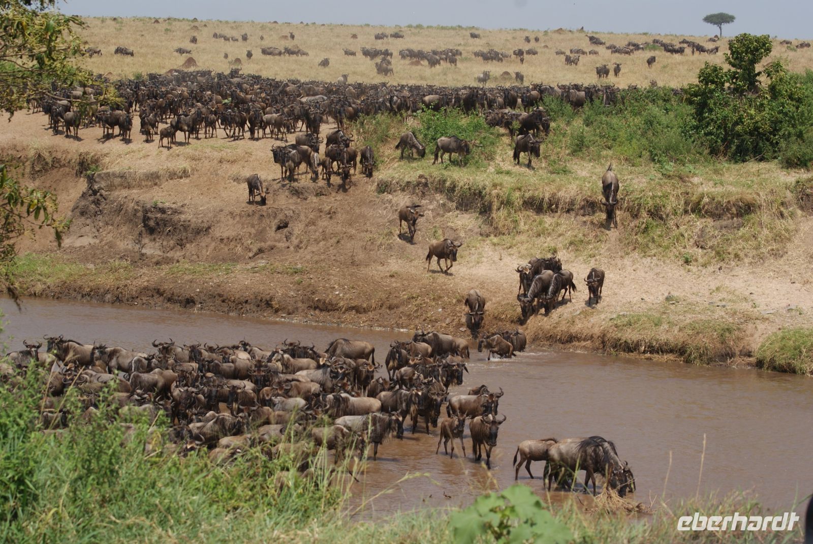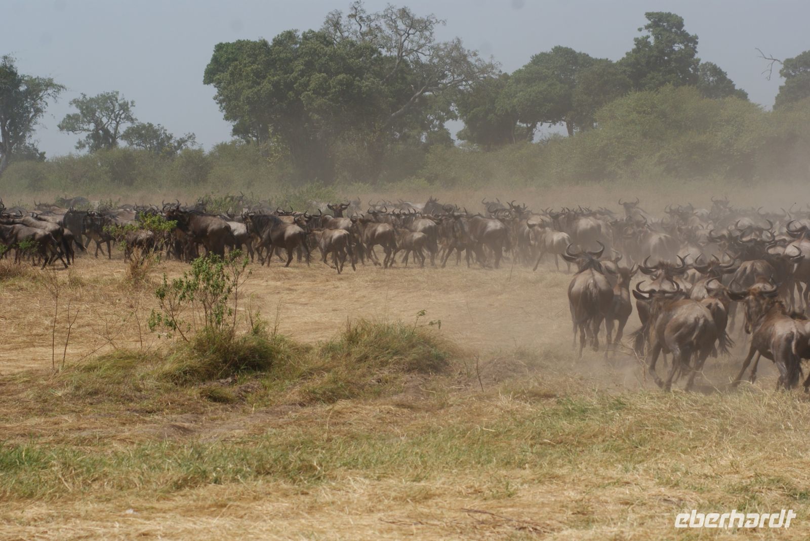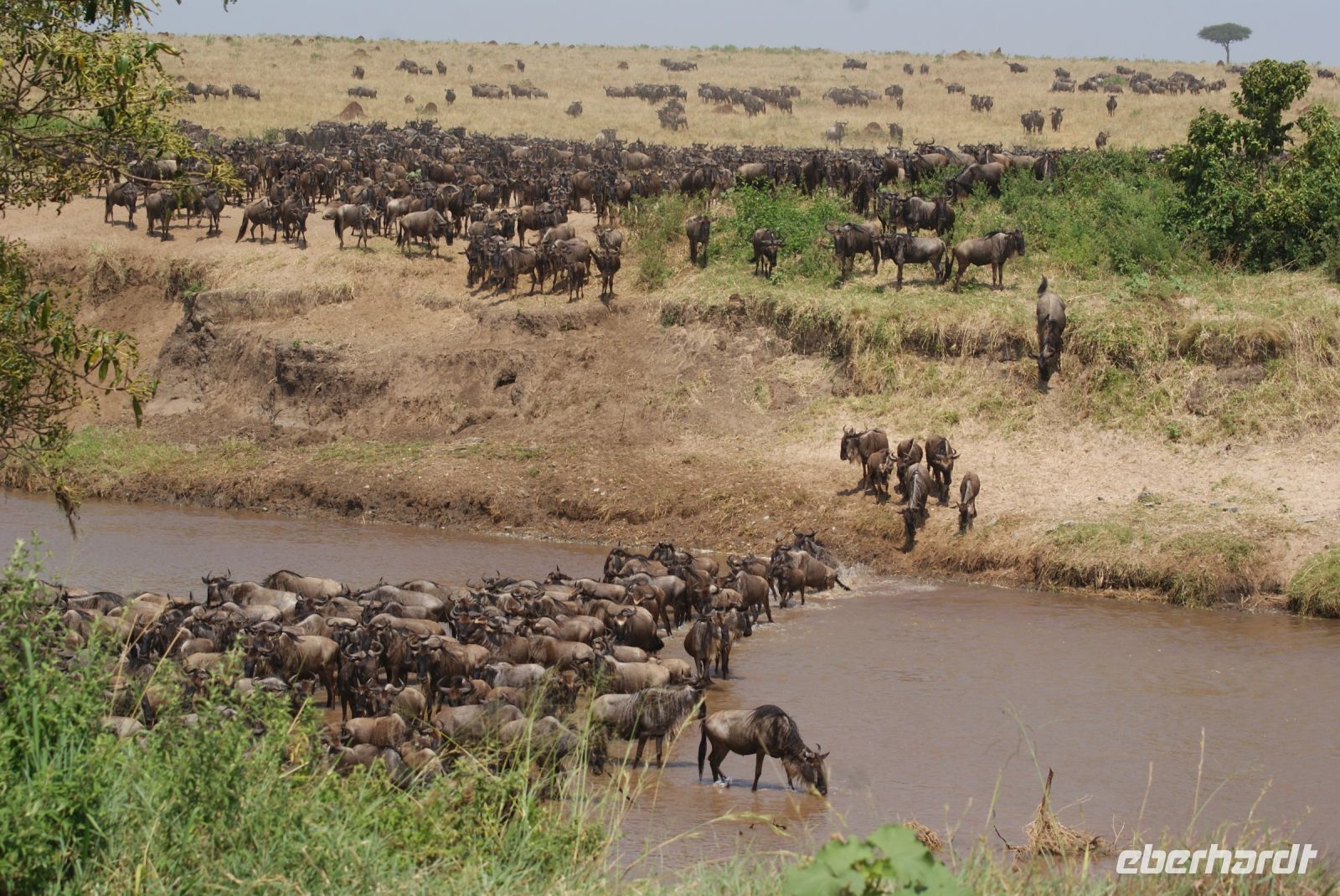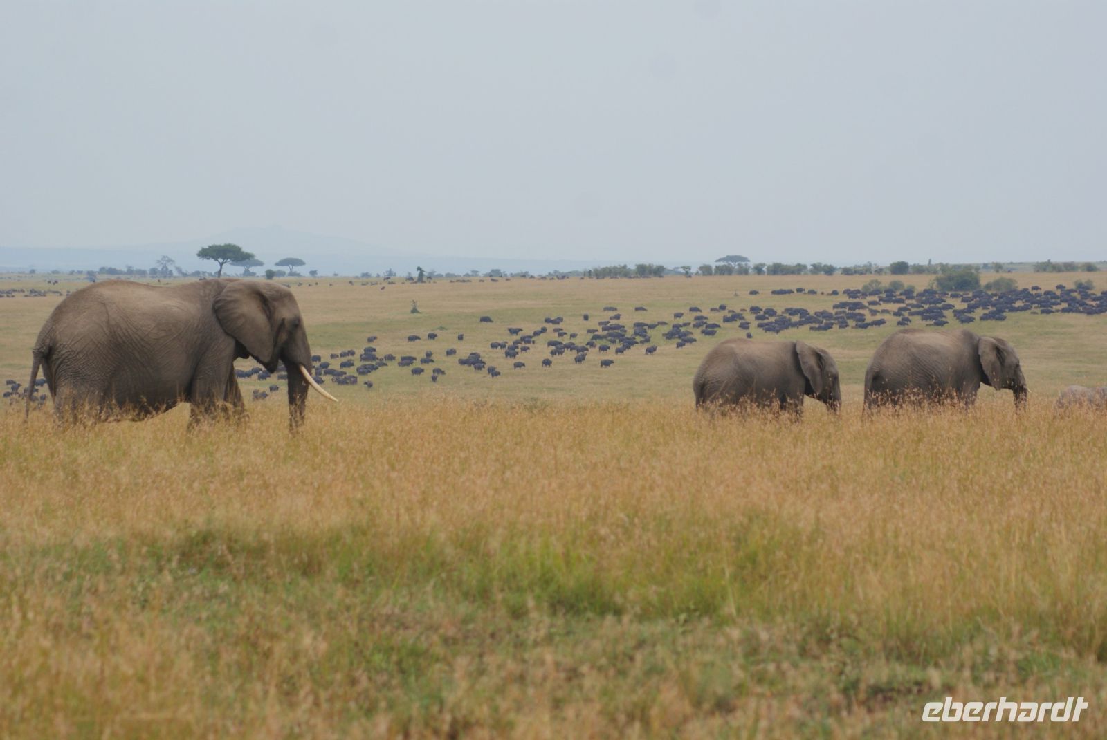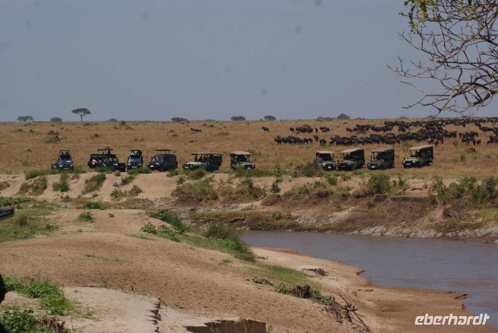 Nach einer erholsamen Nacht, die die meisten von uns erstmalig im Luxuszelt verbringen, werden wir zur bestellten Uhrzeit von Askari mit Kaffee/Tee/Kakao vor dem Zelt geweckt. Diese bringen uns dann später, da immer noch düster, zum Jeep. Pünktlich um 06.30 Uhr begeben wir uns auf Morgensafari und nehmen das vom Camp bereitgestellte Frühstück mit. Wenn man möglichst viele Tiere sehen möchte, sollten die frühen Morgenstunden genutzt werden. So sehen wir nach kurzer Zeit bereits eine Elefantenherde, die sich durch uns nicht stören lässt und sich genüsslich vom frischen, jetzt sehr grünen Gras bedient. Kurz darauf entdecken wir einen Geparden auf einer Anhöhe sitzend und nach Beute Ausschau haltend, welch ein Einstieg in den heutigen Tag. Dank unserer Guides genau zur richtigen Zeit am richtigen Ort, können wir wieder wunderbare Fotos erhaschen und das stattliche Tier bestaunen. Wir ziehen weiter und das nächste Highlight sollte folgen. Bereits schon sehr viele Gnuherden und Zebras gesichtet, wissen wir, dass die Migration der Tiere beginnt. Am Horizont und kurz darauf in unmittelbarer Nähe bestaunen wir zwanzig Heißluftballons, die ihren morgendlichen Ausflug durchführen. Ein unwirkliches Bild am Himmel, mit Gnuherden davor und die Weite der Savanne der Masai Mara. Wir besuchen den Sandriver, wo eine riesige Gnuherde gegenüber wartet. Da sich zunächst nichts tut, finden wir erstmal ein schönes Plätzchen, bereiten unser erstes Frühstück in der Masai Mara vor. Hierzu hat uns unser Camp einiges an Köstlichkeiten mitgegeben und so genießen wir die leckeren Speisen unter einem sogenannten Balanite tree, der wir eine Akazie aussieht. Mit Blick in die Weite der Masai Mara ist all dies einfach nur ein Genuss und ein unvergesslicher Augenblick. Danach geht es weiter Richtung Sand River, wo sich bereits unendlich viele Gnus tummeln, um von hier aus in fruchtbarere Gebiete umzusiedeln. Was man sonst nur aus Dokumentationen kennt, erleben wir hier hautnah, einfach unglaublich und für nun zahlreiche Jeeps um uns herum ein riesiges Ereignis. Auf dem Weg zum Mittagsstopp sehen wir nochmals eine Löwin, die gemächlich vor uns spaziert und die wir lange beobachten können. Im Anschluss in der Nähe ein junger Leopard, der ebenfalls entlang des Weges unterwegs ist. Was für Erlebnisse bereits am Vormittag, wir können unser Glück kaum fassen. Mittags kehren wir zum Camp zurück, genießen ein erneut schmackhaftes Mittagessen und halten etwas Siesta, bevor es am Nachmittag nochmals auf Pirschfahrt geht.