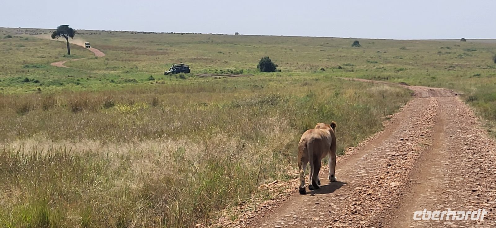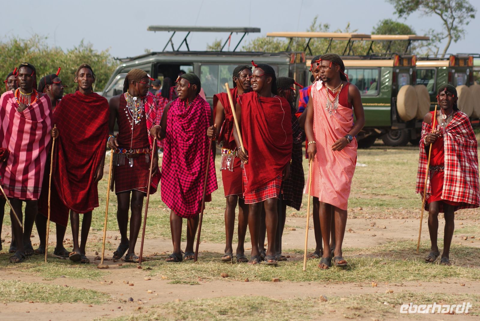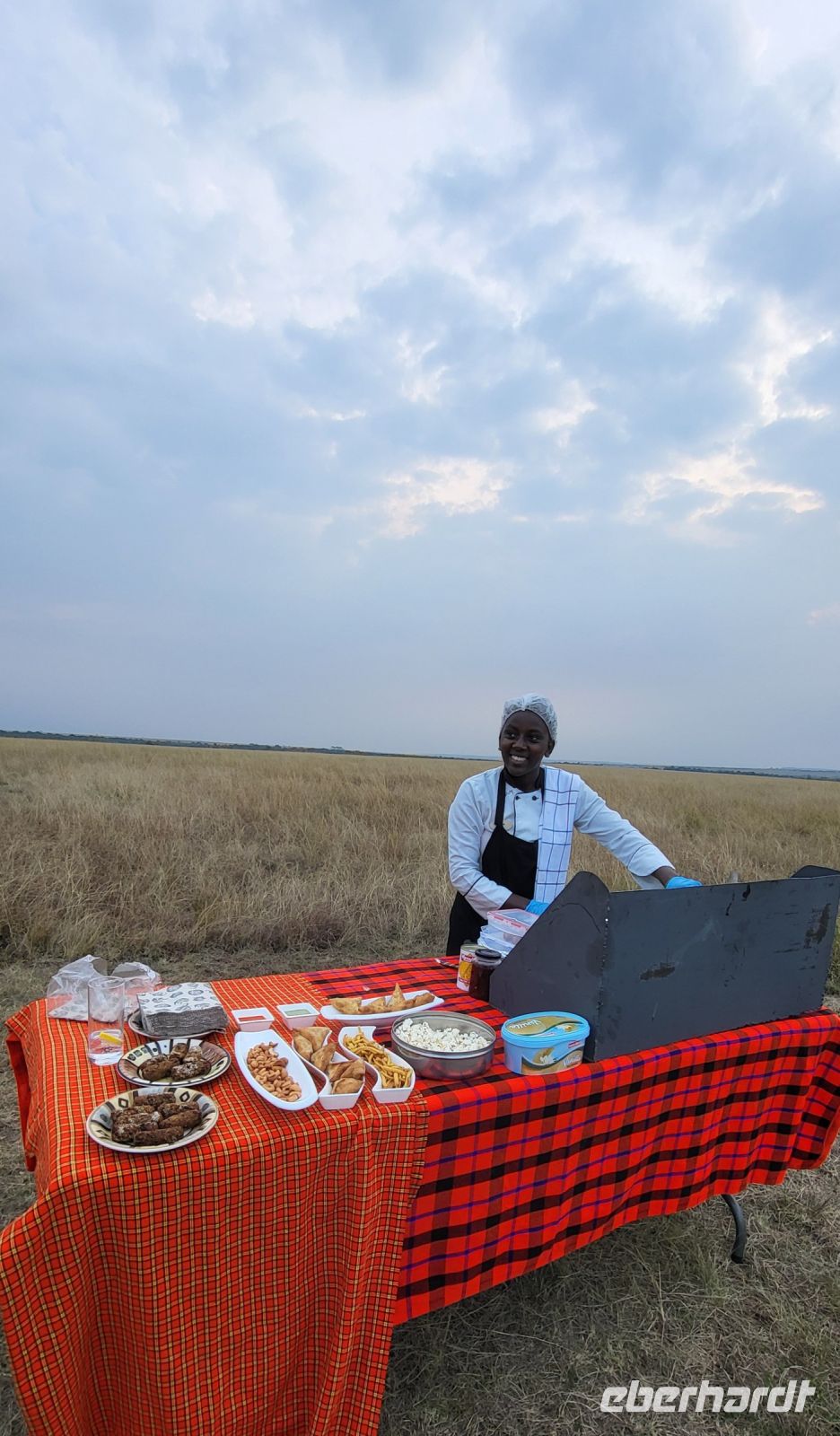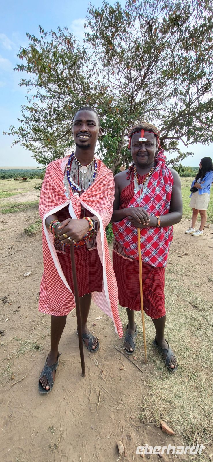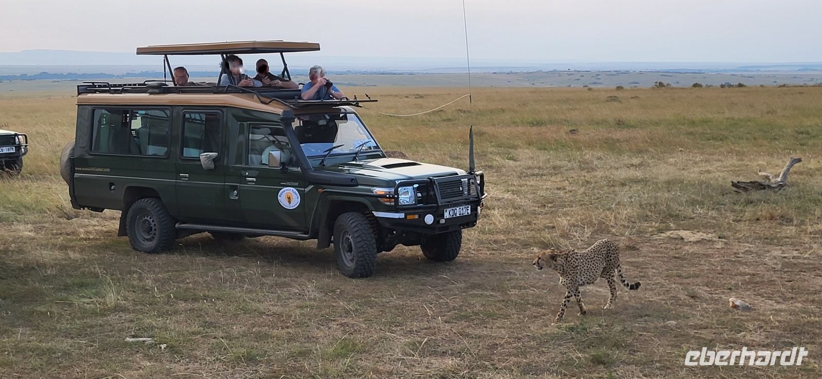Wir sichten erneut viele Tiere, darunter einen Geparden, zwei Löwinnen, die ein Gnu erlegt haben und dies verspeisten. Auf der Weiterfahrt erreicht uns die Meldung, dass eine Leopardin gesichtet wurde, natürlich sind wir (leider) nicht die einzigen, die dieses besondere Tier sehen möchten und so versammeln sich zu viele Fahrzeuge, deren Guides ebenso die best möglichste Sicht bieten möchten. Nach längerer Suche erscheint das Tier unmittelbar neben unserem Jeep, sodass wir nur noch 2-3 m entfernt sind. Zurück im Camp gibt es wieder ein schmackhaftes Abendessen für uns. Das heutige Thema: Afrikanische Spezialitäten mit viel Gemüse, dazu Lamm, Huhn und Rind. Wir kosten u.a.die typisch kenianische Sättigungsbeilage „Ugali“, eine Art Maispolenta, die hier das absolute Grundnahrungsmittel ist, dazu Kochbananenbeilagen, Spinat-Kartoffel-Püree, etc. Nach dem Essen tanzen die Masaikrieger für uns, wir erkennen viele unserer Wächter darunter wieder. Auch die berühmten Sprünge und Gesänge dürfen natürlich nicht fehlen. So endet ein weiterer erlebnisreicher Tag in der Masai Mara und wir dürfen gespannt sein, was der morgige Tag uns bringt.