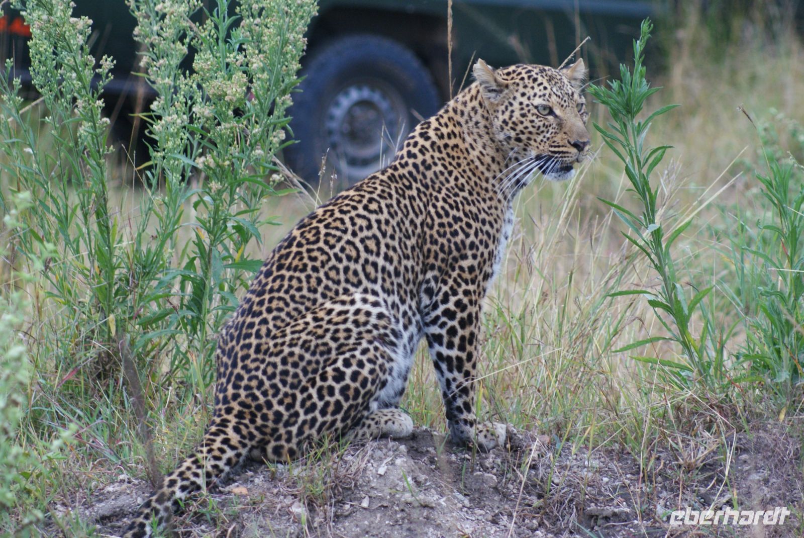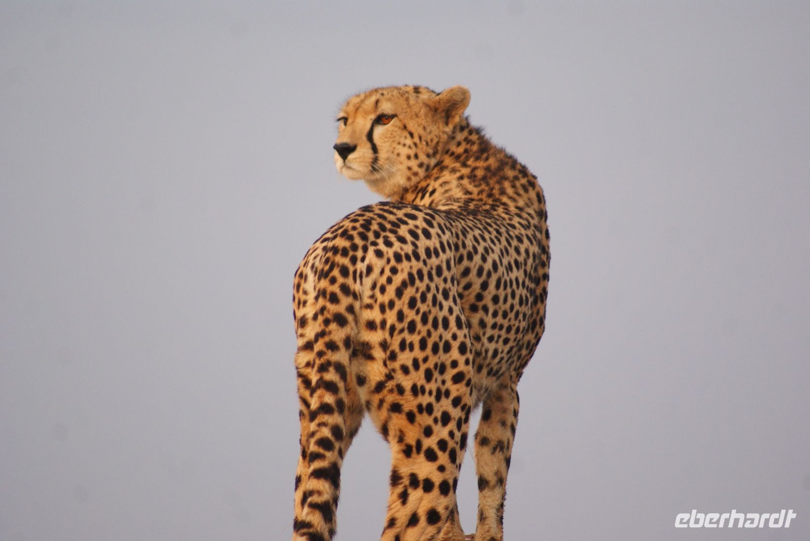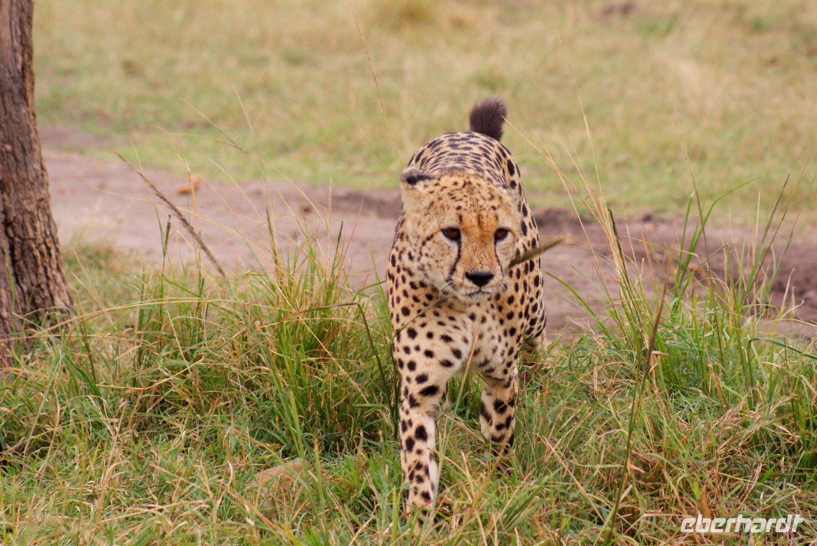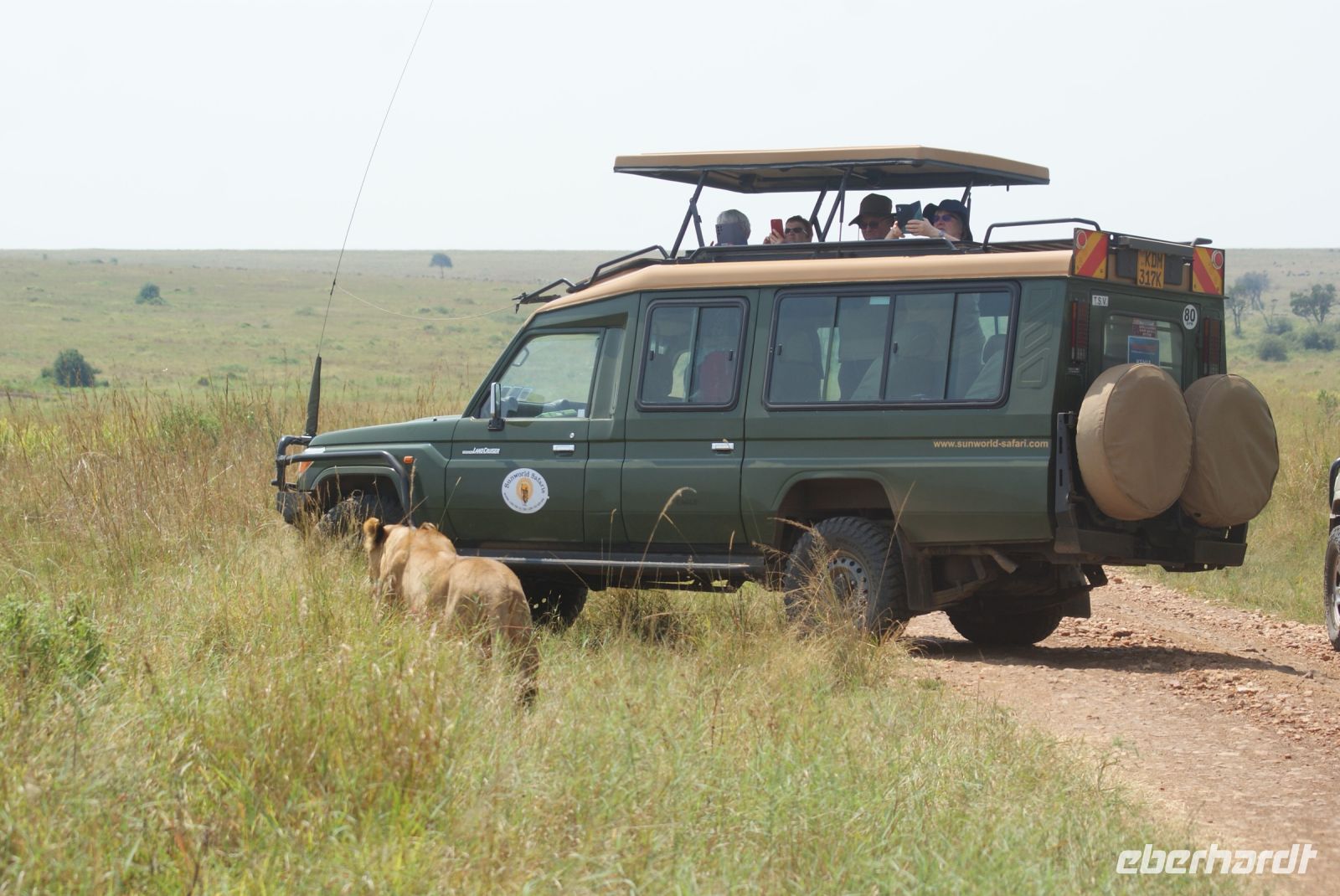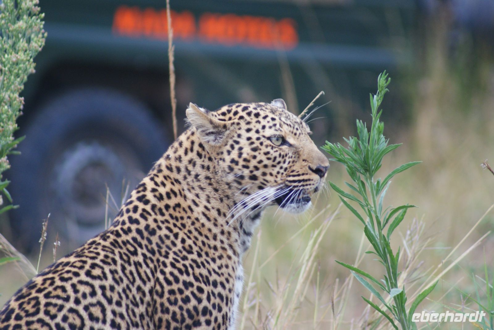 Wir sichten erneut viele Tiere, darunter einen Geparden, zwei Löwinnen, die ein Gnu erlegt haben und dies verspeisten. Auf der Weiterfahrt erreicht uns die Meldung, dass eine Leopardin gesichtet wurde, natürlich sind wir (leider) nicht die einzigen, die dieses besondere Tier sehen möchten und so versammeln sich zu viele Fahrzeuge, deren Guides ebenso die best möglichste Sicht bieten möchten. Nach längerer Suche erscheint das Tier unmittelbar neben unserem Jeep, sodass wir nur noch 2-3 m entfernt sind. Zurück im Camp gibt es wieder ein schmackhaftes Abendessen für uns. Das heutige Thema: Afrikanische Spezialitäten mit viel Gemüse, dazu Lamm, Huhn und Rind. Wir kosten u.a.die typisch kenianische Sättigungsbeilage „Ugali“, eine Art Maispolenta, die hier das absolute Grundnahrungsmittel ist, dazu Kochbananenbeilagen, Spinat-Kartoffel-Püree, etc. Nach dem Essen tanzen die Masaikrieger für uns, wir erkennen viele unserer Wächter darunter wieder. Auch die berühmten Sprünge und Gesänge dürfen natürlich nicht fehlen. So endet ein weiterer erlebnisreicher Tag in der Masai Mara und wir dürfen gespannt sein, was der morgige Tag uns bringt.