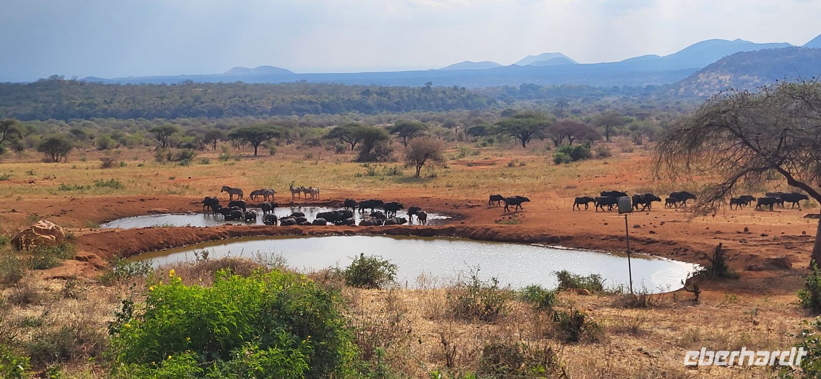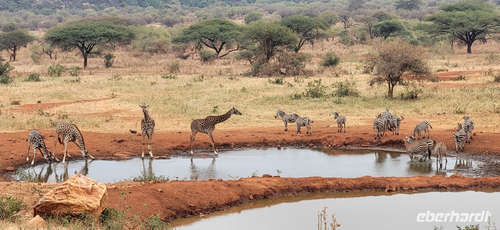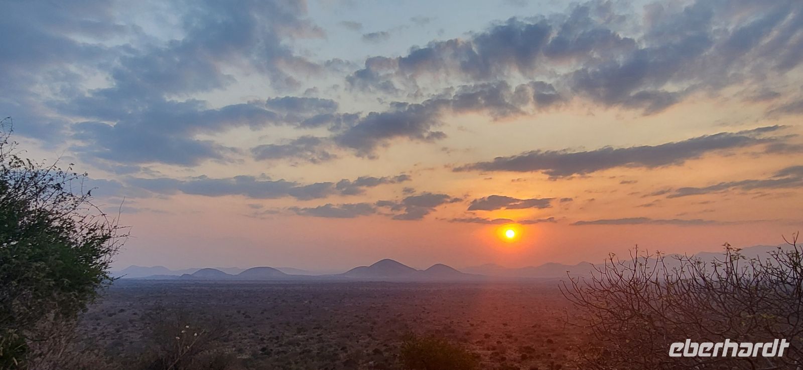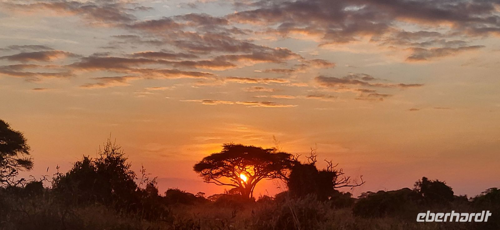 Wir treffen uns für eine frühmorgendliche Safari vor dem Frühstück, da die meisten Tiere zu dieser Zeit besonders aktiv sind und es normalerweise in Tsavo schnell heiß wird. Somit starten wir bereits kurz vor Sonnenaufgang. Nach wenigen Minuten ist es schon hell und die erste Elefantenherde lässt nicht lange auf sich warten. Wir genießen die Ruhe im Nationalpark und die friedliche Atmosphäre mit den Dickhäutern. Apropops: die Haut des Elefanten ist ca. 3 cm dick und macht es Parasiten und Mücken schwer. Bis zur Frühstückspause haben wir noch einige schöne Tiersichtungen, darunter Klippschliefer, Giraffen, eine Herde brauner Oryxantilopen, die gemächlich in der Savanne äsen, so manch schöner Vogel zeigt sich, darunter ein Gaukler und ein Raubadler im Baum. Zurück in unserer Lodge frühstücken wir in Ruhe und haben die nun schon so gewohnte und sehr geschätzte Traumkulisse frei Haus und so ziemlich für uns alleine. Viele Zebras, Gnus und auch Elefanten kommen zu unserem Wasserloch, versüßen uns nochmals die schönen Morgenstunden. Herrlich freie Stunden am Tag gilt es nun zu genießen, die jeder nach Lust und Laune nutzt. Ein Spaziergang im Garten, Beobachten der Tiere am Wasserloch, jeder wie er mag. Einfach nur schön, mal viel Freizeit zu haben. Nachmittags starten wir nochmals zur Jeepsafari mit allen Gästen. Wir erleben nochmals eine schöne Naturfahrt und spazieren zum Sonnenuntergang den Roaring Rock hinauf. Von hier haben wir eine unglaubliche Kulisse in die Savanne. Sogar der Kilimandscharo in 100 km Entfernung ist zu sehen. So endet ein weiterer schöner Tag mit einem fantastischen Sonnenuntergang in der kenianischen Savanne. Auf unserer Rückfahrt zur Lodge begegnen wir drei Elefantenherden, die mit Abendrot im Hintergrund die Sandpiste passieren. Welch eine magische Begegnung. Beim schmackhaften Abendessen haben wir uns erneut viel zum Tag zu erzählen.