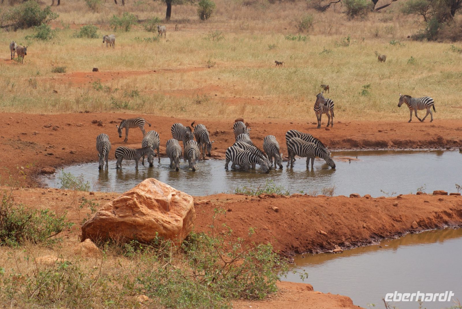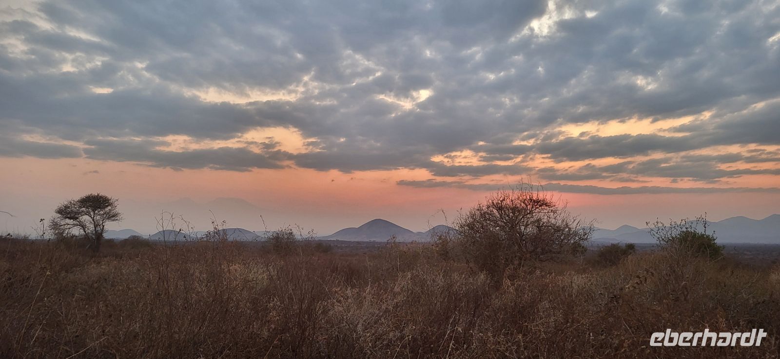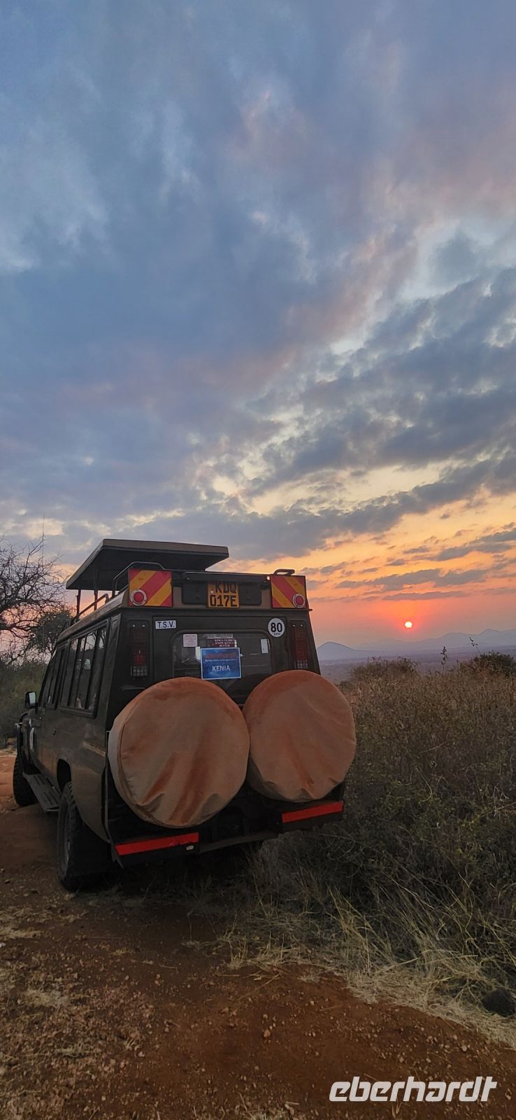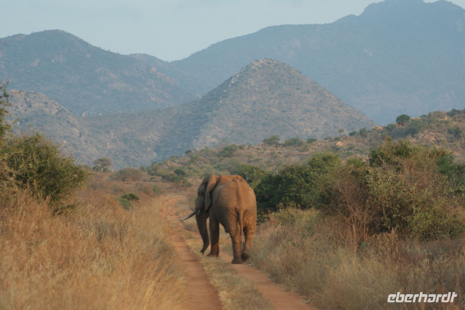 Wir treffen uns für eine frühmorgendliche Safari vor dem Frühstück, da die meisten Tiere zu dieser Zeit besonders aktiv sind und es normalerweise in Tsavo schnell heiß wird. Somit starten wir bereits kurz vor Sonnenaufgang. Nach wenigen Minuten ist es schon hell und die erste Elefantenherde lässt nicht lange auf sich warten. Wir genießen die Ruhe im Nationalpark und die friedliche Atmosphäre mit den Dickhäutern. Apropops: die Haut des Elefanten ist ca. 3 cm dick und macht es Parasiten und Mücken schwer. Bis zur Frühstückspause haben wir noch einige schöne Tiersichtungen, darunter Klippschliefer, Giraffen, eine Herde brauner Oryxantilopen, die gemächlich in der Savanne äsen, so manch schöner Vogel zeigt sich, darunter ein Gaukler und ein Raubadler im Baum. Zurück in unserer Lodge frühstücken wir in Ruhe und haben die nun schon so gewohnte und sehr geschätzte Traumkulisse frei Haus und so ziemlich für uns alleine. Viele Zebras, Gnus und auch Elefanten kommen zu unserem Wasserloch, versüßen uns nochmals die schönen Morgenstunden. Herrlich freie Stunden am Tag gilt es nun zu genießen, die jeder nach Lust und Laune nutzt. Ein Spaziergang im Garten, Beobachten der Tiere am Wasserloch, jeder wie er mag. Einfach nur schön, mal viel Freizeit zu haben. Nachmittags starten wir nochmals zur Jeepsafari mit allen Gästen. Wir erleben nochmals eine schöne Naturfahrt und spazieren zum Sonnenuntergang den Roaring Rock hinauf. Von hier haben wir eine unglaubliche Kulisse in die Savanne. Sogar der Kilimandscharo in 100 km Entfernung ist zu sehen. So endet ein weiterer schöner Tag mit einem fantastischen Sonnenuntergang in der kenianischen Savanne. Auf unserer Rückfahrt zur Lodge begegnen wir drei Elefantenherden, die mit Abendrot im Hintergrund die Sandpiste passieren. Welch eine magische Begegnung. Beim schmackhaften Abendessen haben wir uns erneut viel zum Tag zu erzählen.