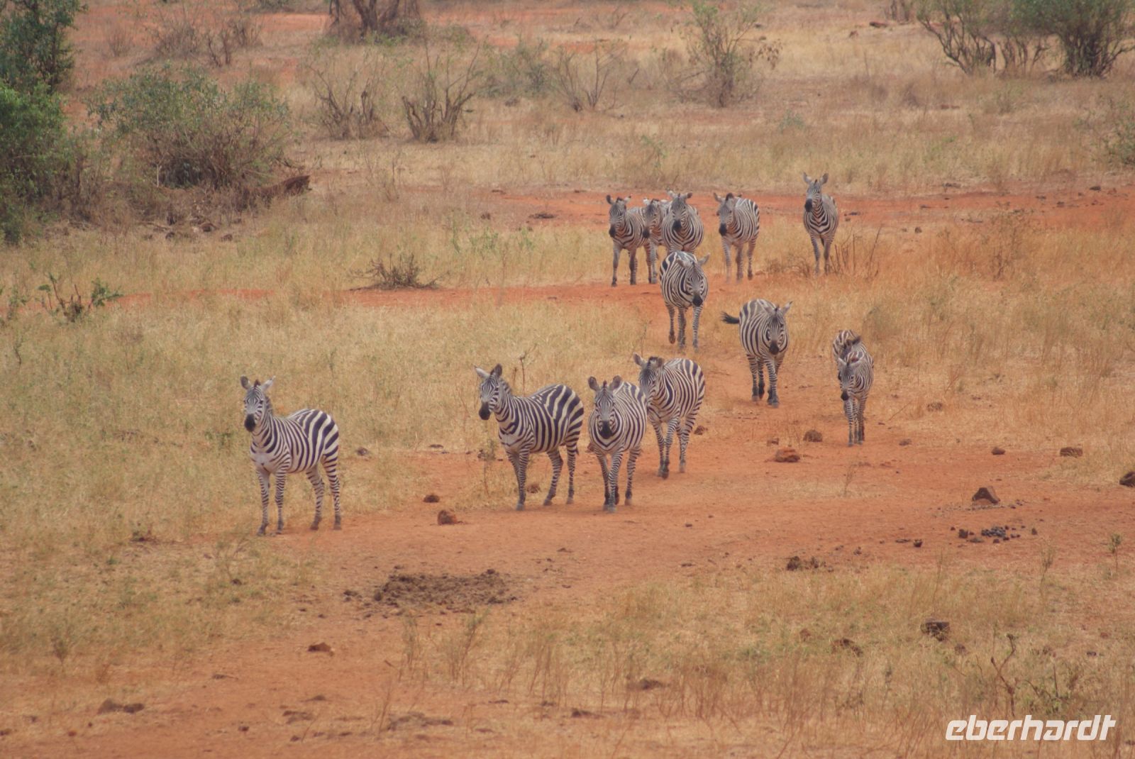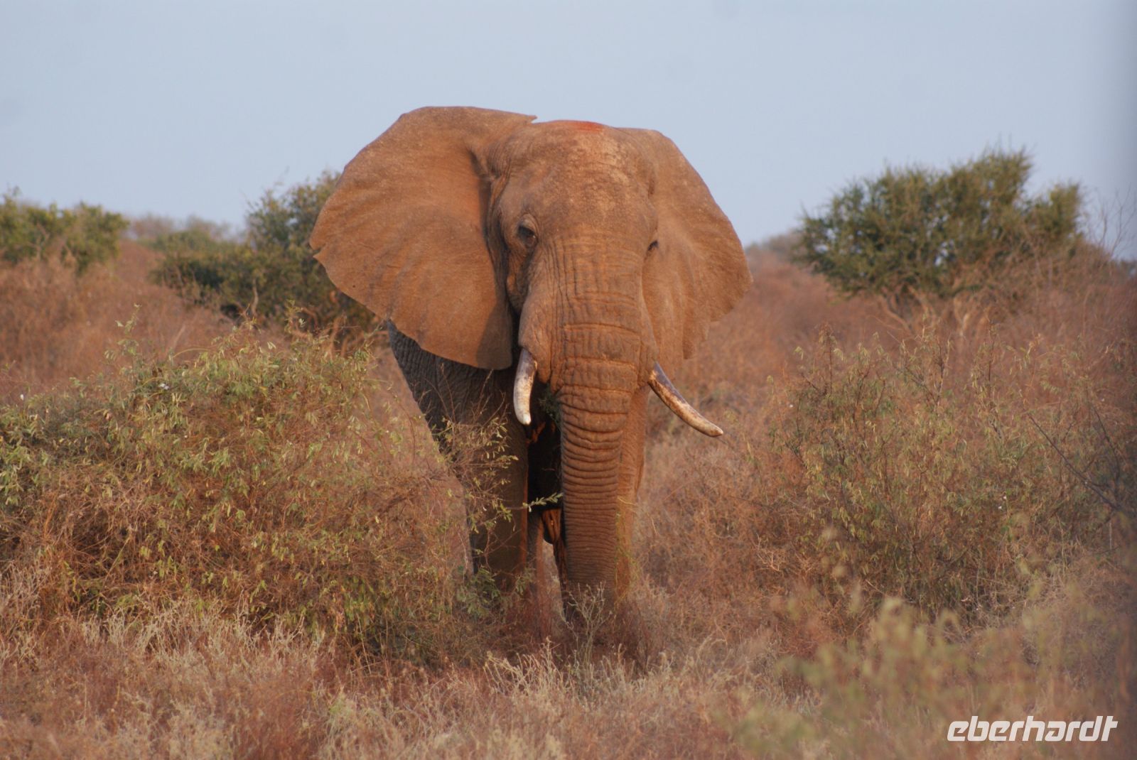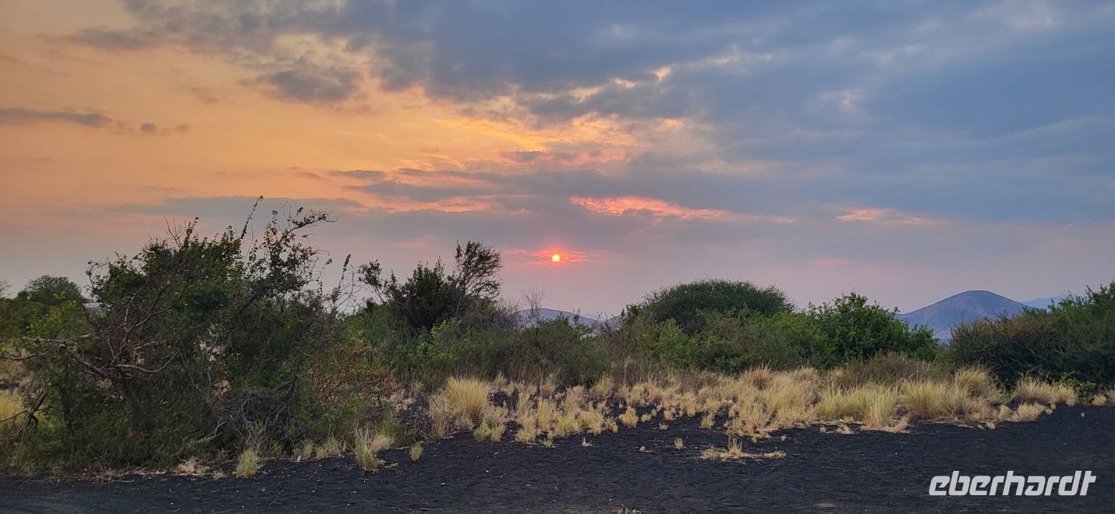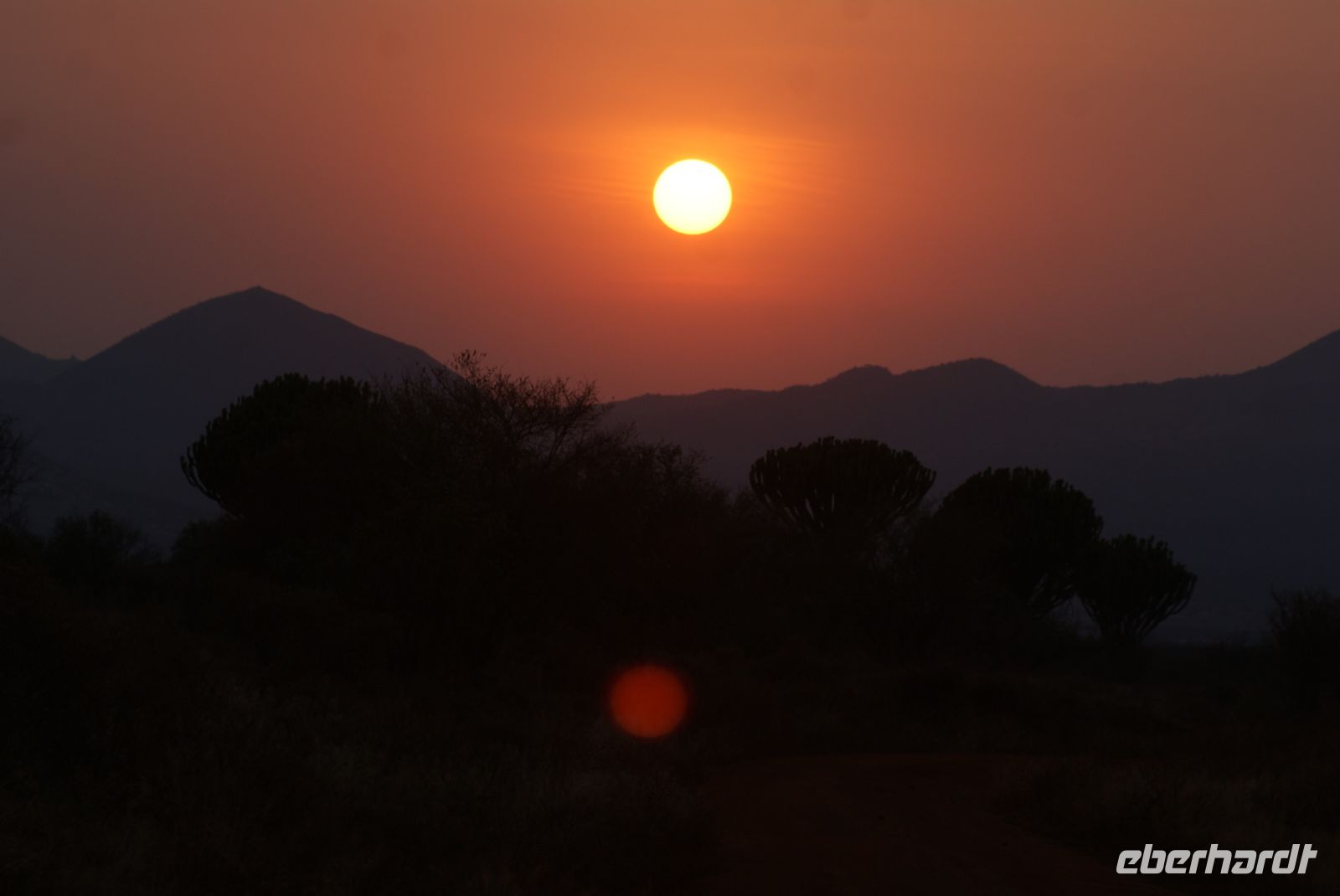 Wir treffen uns für eine frühmorgendliche Safari vor dem Frühstück, da die meisten Tiere zu dieser Zeit besonders aktiv sind und es normalerweise in Tsavo schnell heiß wird. Somit starten wir bereits kurz vor Sonnenaufgang. Nach wenigen Minuten ist es schon hell und die erste Elefantenherde lässt nicht lange auf sich warten. Wir genießen die Ruhe im Nationalpark und die friedliche Atmosphäre mit den Dickhäutern. Apropops: die Haut des Elefanten ist ca. 3 cm dick und macht es Parasiten und Mücken schwer. Bis zur Frühstückspause haben wir noch einige schöne Tiersichtungen, darunter Klippschliefer, Giraffen, eine Herde brauner Oryxantilopen, die gemächlich in der Savanne äsen, so manch schöner Vogel zeigt sich, darunter ein Gaukler und ein Raubadler im Baum. Zurück in unserer Lodge frühstücken wir in Ruhe und haben die nun schon so gewohnte und sehr geschätzte Traumkulisse frei Haus und so ziemlich für uns alleine. Viele Zebras, Gnus und auch Elefanten kommen zu unserem Wasserloch, versüßen uns nochmals die schönen Morgenstunden. Herrlich freie Stunden am Tag gilt es nun zu genießen, die jeder nach Lust und Laune nutzt. Ein Spaziergang im Garten, Beobachten der Tiere am Wasserloch, jeder wie er mag. Einfach nur schön, mal viel Freizeit zu haben. Nachmittags starten wir nochmals zur Jeepsafari mit allen Gästen. Wir erleben nochmals eine schöne Naturfahrt und spazieren zum Sonnenuntergang den Roaring Rock hinauf. Von hier haben wir eine unglaubliche Kulisse in die Savanne. Sogar der Kilimandscharo in 100 km Entfernung ist zu sehen. So endet ein weiterer schöner Tag mit einem fantastischen Sonnenuntergang in der kenianischen Savanne. Auf unserer Rückfahrt zur Lodge begegnen wir drei Elefantenherden, die mit Abendrot im Hintergrund die Sandpiste passieren. Welch eine magische Begegnung. Beim schmackhaften Abendessen haben wir uns erneut viel zum Tag zu erzählen.