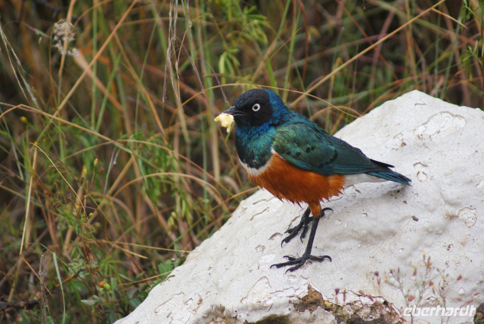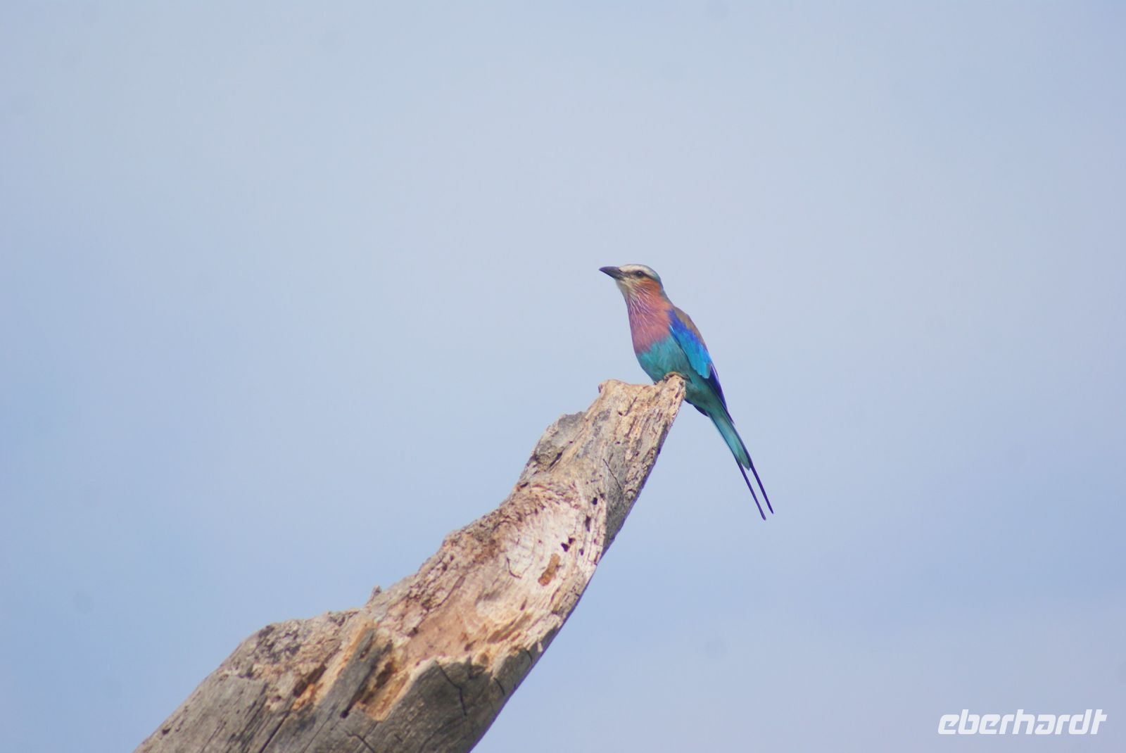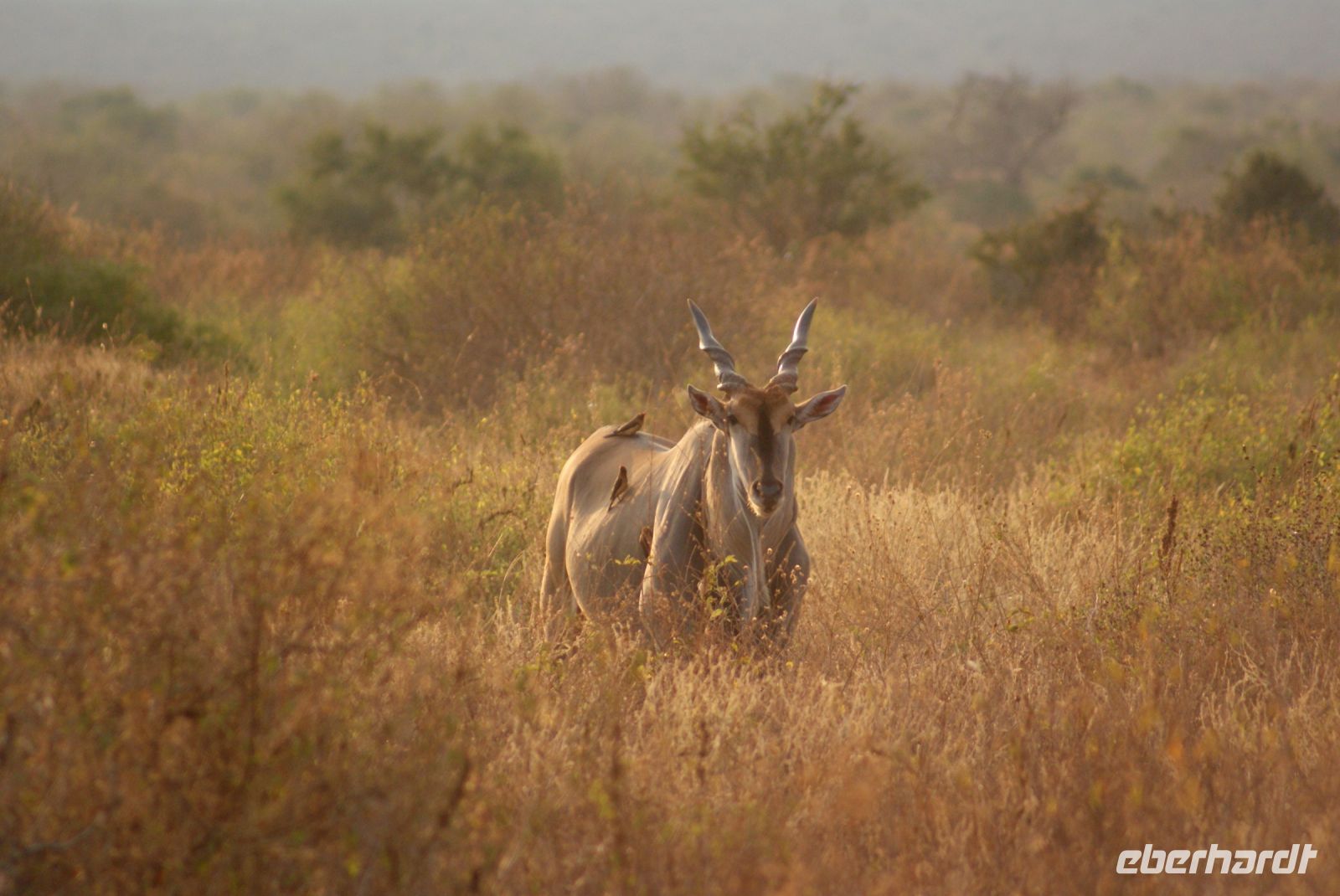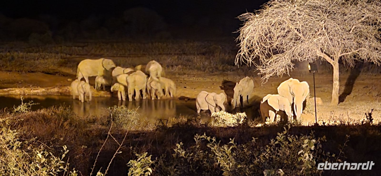 Wir treffen uns für eine frühmorgendliche Safari vor dem Frühstück, da die meisten Tiere zu dieser Zeit besonders aktiv sind und es normalerweise in Tsavo schnell heiß wird. Somit starten wir bereits kurz vor Sonnenaufgang. Nach wenigen Minuten ist es schon hell und die erste Elefantenherde lässt nicht lange auf sich warten. Wir genießen die Ruhe im Nationalpark und die friedliche Atmosphäre mit den Dickhäutern. Apropops: die Haut des Elefanten ist ca. 3 cm dick und macht es Parasiten und Mücken schwer. Bis zur Frühstückspause haben wir noch einige schöne Tiersichtungen, darunter Klippschliefer, Giraffen, eine Herde brauner Oryxantilopen, die gemächlich in der Savanne äsen, so manch schöner Vogel zeigt sich, darunter ein Gaukler und ein Raubadler im Baum. Zurück in unserer Lodge frühstücken wir in Ruhe und haben die nun schon so gewohnte und sehr geschätzte Traumkulisse frei Haus und so ziemlich für uns alleine. Viele Zebras, Gnus und auch Elefanten kommen zu unserem Wasserloch, versüßen uns nochmals die schönen Morgenstunden. Herrlich freie Stunden am Tag gilt es nun zu genießen, die jeder nach Lust und Laune nutzt. Ein Spaziergang im Garten, Beobachten der Tiere am Wasserloch, jeder wie er mag. Einfach nur schön, mal viel Freizeit zu haben. Nachmittags starten wir nochmals zur Jeepsafari mit allen Gästen. Wir erleben nochmals eine schöne Naturfahrt und spazieren zum Sonnenuntergang den Roaring Rock hinauf. Von hier haben wir eine unglaubliche Kulisse in die Savanne. Sogar der Kilimandscharo in 100 km Entfernung ist zu sehen. So endet ein weiterer schöner Tag mit einem fantastischen Sonnenuntergang in der kenianischen Savanne. Auf unserer Rückfahrt zur Lodge begegnen wir drei Elefantenherden, die mit Abendrot im Hintergrund die Sandpiste passieren. Welch eine magische Begegnung. Beim schmackhaften Abendessen haben wir uns erneut viel zum Tag zu erzählen.