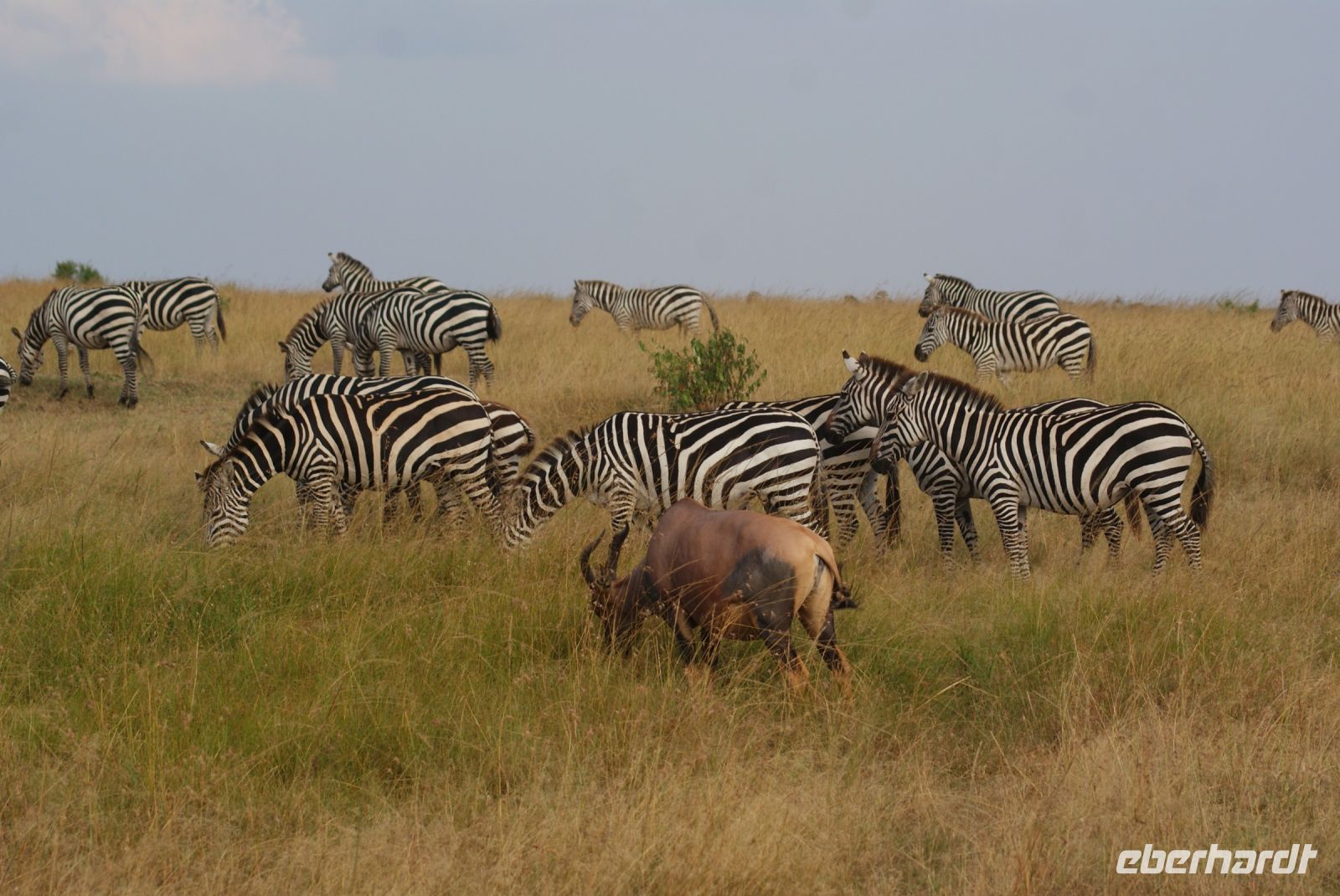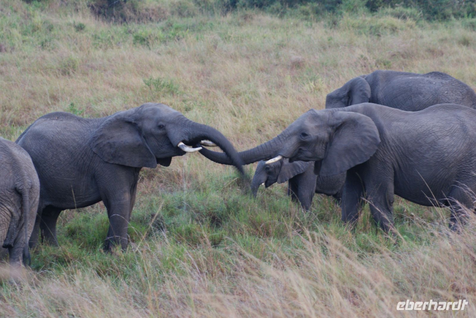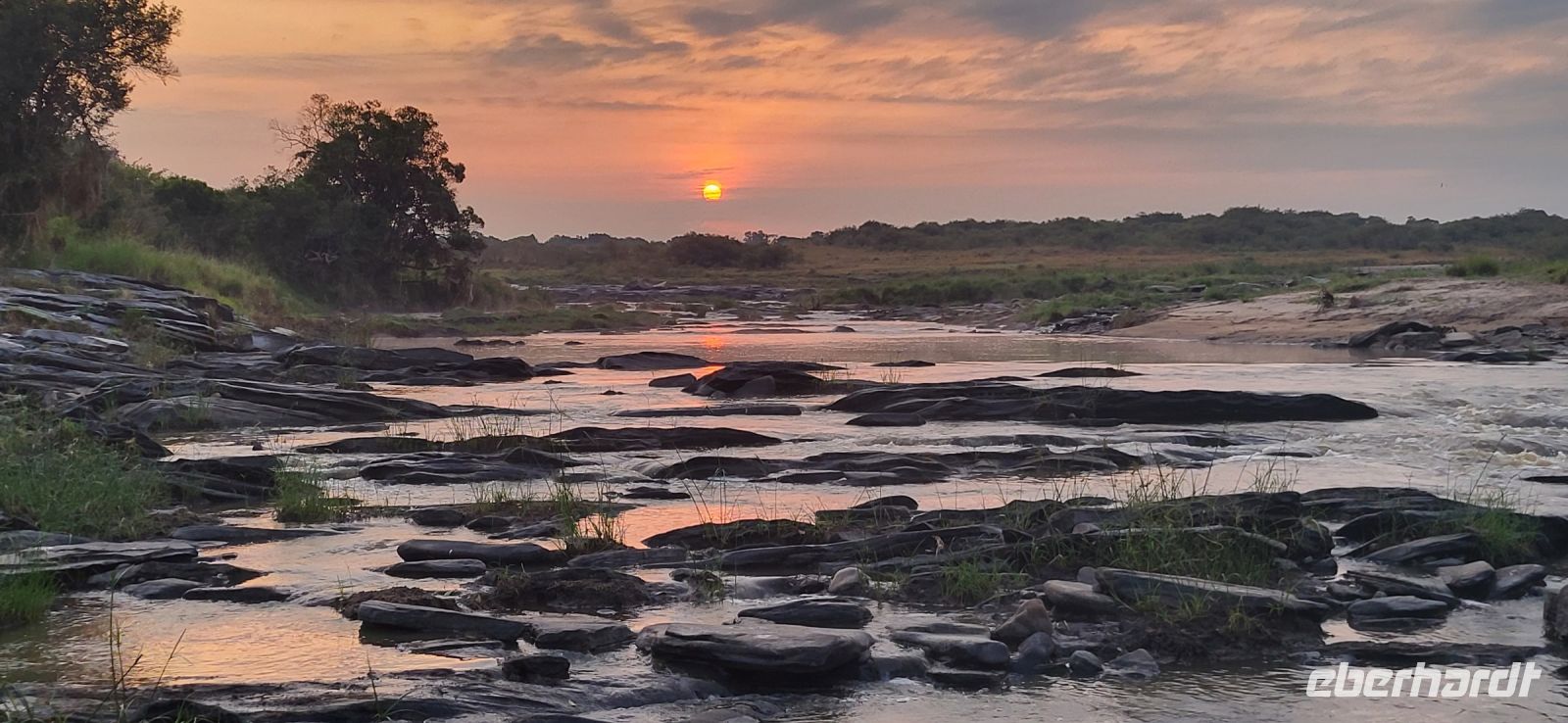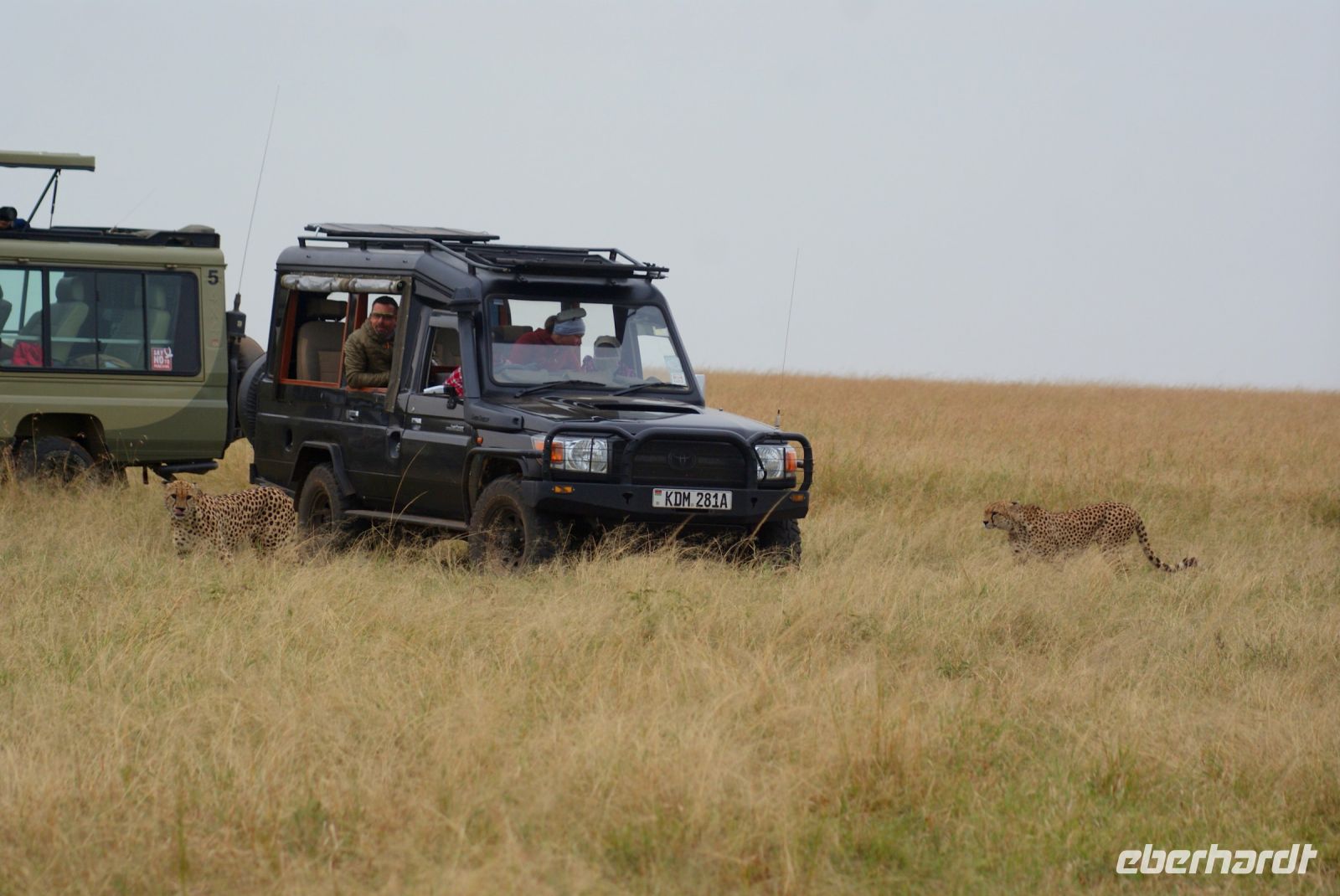 Wir verlassen den Lake Nakuru und über eine gut ausgebaute Überlandstraße geht es weiter durch Kenia Richtung Masai Mara. Hierzu benötigen wir fünf Stunden und haben eine Strecke von etwa 240 Km vor uns, die sich jedoch sehr interessant gestaltet mit herrlicher Landschaft, interessanten Dörfern, Landwirtschaft und typisch afrikanischer Musik in unserem Jeep. Unterwegs halten wir für einen Toilettenstopp an einem Souvenirladen, wo wir nochmals über so manches Mitbringsel verhandeln. Mittags erreichen wir das Sekenani Gate und während unsere Guides das Einreiseprozedere erledigen, beobachten wir das geschäftige Treiben der Masai Frauen, die vehement versuchen, ihre Waren an Mann und Frau zu bringen. Nun heißt es schnellstmöglich in die 1500 Km² große Masai Mara zu gelangen. Schnell ist es geschafft und wir dürfen in die „getupfte Savanne der Masai“, wie diese übersetzt heißt, eintreten. Schon kurz nach unserer Ankunft werden wir in unmittelbarer Nähe von der ersten Gnuherde mit Elefanten begrüßt, welch ein Empfang. Da das Mittagessen und der Check-in im Mara Bush Camp auf uns wartet, belassen wir es mit einem schnellen Foto. Bei Ankunft werden wir von Manager Nelson herzlich empfangen und per kurzem Briefing über die Besonderheiten des Camps aufgeklärt. Wir befinden uns jetzt mitten im Busch, keine Zäune schützen das Camp, sodass wir vor und nach Sonnenuntergang nur noch in Begleitung von Askaris, den einheimischen Wächtern unterwegs sein dürfen. Hier leben außer uns für die kommenden drei Tage auch Hippos, Krokodile und vielleicht auch der ein oder andere Elefant. Nach einem schmackhaften Mittagsmenü beziehen wir unsere neuen Herbergen und starten dann am Nachmittag erneut mit frischer Kraft zur Nachmittagspirschfahrt. Wir sehen Topiantilopen, Hyänen, Zebras, Strauße und zur Krönung einen Geparden in unmittelbarer Nähe vor uns. Ein rundum gelungenen Ankunftstag in der berühmten Masai Mara und wir freuen uns schon auf die kommenden Tage, in denen wir sicherlich Dank des Engagements unserer tollen Guides Caleb und Nick, unendlich viele schöne Tierbegegnungen haben werden. Am Abend speisen wir vom schmackhaften „Mongolischem Buffet“, von dem wir die Zutaten aussuchen und die beiden Köche diese vor unseren Augen fertigstellen. So sitzen wir bei Vollmond unterm Sternenhimmel und sind einfach nur voller schöner erster Eindrücke dieser besonderen Umgebung.
