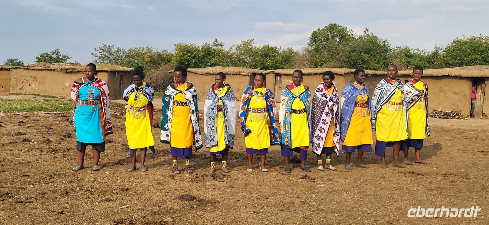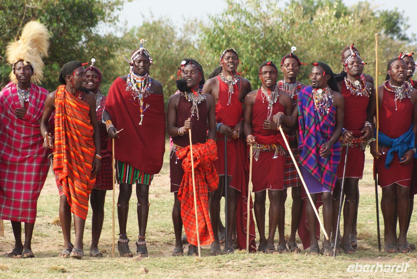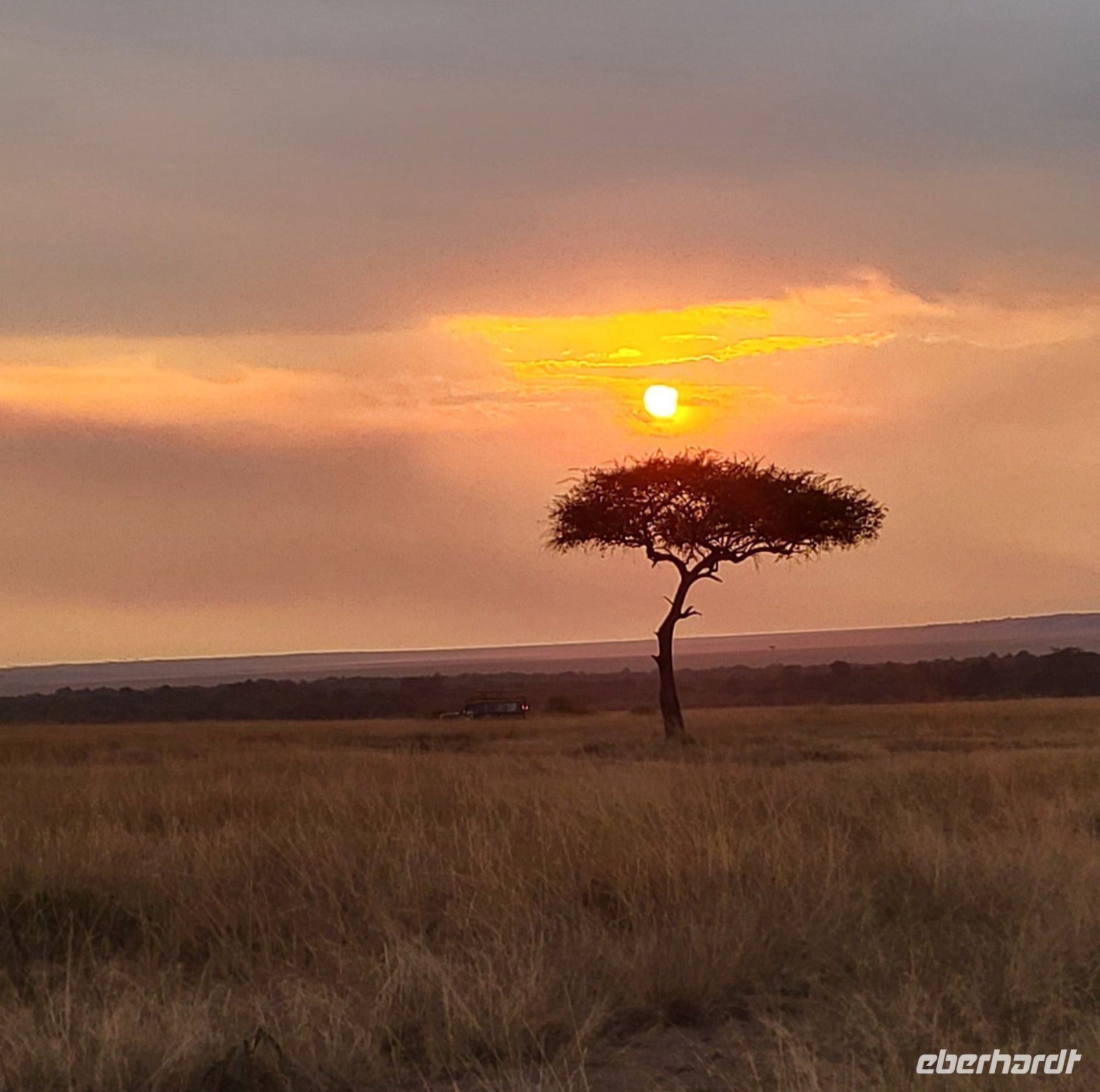 Nach Ankunft im Masai Dorf werden wir von Chief Robin und Guide Edward in Empfang genommen sowie 40 weiteren Dorfmitgliedern begrüßt und mit zwei Liedern der Masaifrauen und den Masai Kriegern willkommen heißen. Danach tanzen die Masai Krieger für uns und zeigen ihre enorme Sprungkraft. Anschließend demonstriert man uns, wie ohne moderne Hilfsmittel mit Reibung und verschiedenen Hölzern, dazu Elefantendung, Feuer gemacht wird. Wer möchte, darf einen Blick in eine Masai Hütte werfen. Diese wird von den Frauen mit Kuhdung und Erde gefertigt. Innen angekommen, besteht diese aus drei Räumen. Elternschlafzimmer, Kinder-und Gästezimmer. In der Mitte der Kochbereich und ein kleines Fenster, dass dem Tageslicht und Rauchabzug dient. Wir hören, dass das Dorf 250 Personen fasst, es 46 Häuser gibt, in denen 46 Frauen, deren Kinder und teilweise auch deren Ehemänner anwesend sind. Ein Masai Mann kann bis zu 11 Frauen heiraten, wenn er für jede Frau 10 Kühe aufbringt…Das Leben findet tagsüber eher außerhalb der Hütten statt und abends wird zur Sicherheit das Vieh in den Kral, also in das Innere der Community getrieben. Abschließend verteilen wir unsere Gaben an die sich brav aufreihenden Kinder, für die wir sicherlich mit unseren Geschenken ebenfalls eine Attraktion sind. Wir verlassen die Masai und kehren zurück in die Masai Mara. Das Bushcamp überrascht uns mit einem Sundowner in der Savanne und dazu noch mit kleinen Köstlichkeiten, die in der Savanne frisch für uns durch eine Köchin zubereitet werden. Welch ein Luxus, welch eine wunderbare Atmosphäre. Gemeinsam stimmen wir ein schönes Lied an und singen aus Leibeskräften: „Jambo, Jambo Bwana….“ Einfach nur schön! Am Abend erleben wir ein Bushdinner und werden zu einem Platz außerhalb des Camps gebracht. Es erfolgt ein Abendessen unterm Himmelszelt mit Lagerfeuer und nächtlicher Atmosphäre. Über uns ist der Vollmond hell erleuchtet und wirft ein zartes Licht über die Savanne. Schon sehr bald werden wir dieses traumhafte Camp und Campmanager Nelson mit wunderbarem Team schmerzlich vermissen, die uns beispiellos betreut und verwöhnt haben. Es war ein einmaliger Aufenthalt im Herzen Kenias, den niemand von uns missen möchte. Noch viel weniger gerne reisen wir von hier morgen ab….