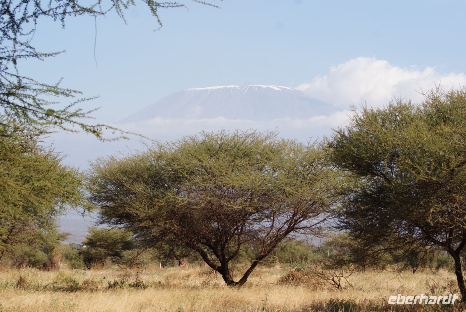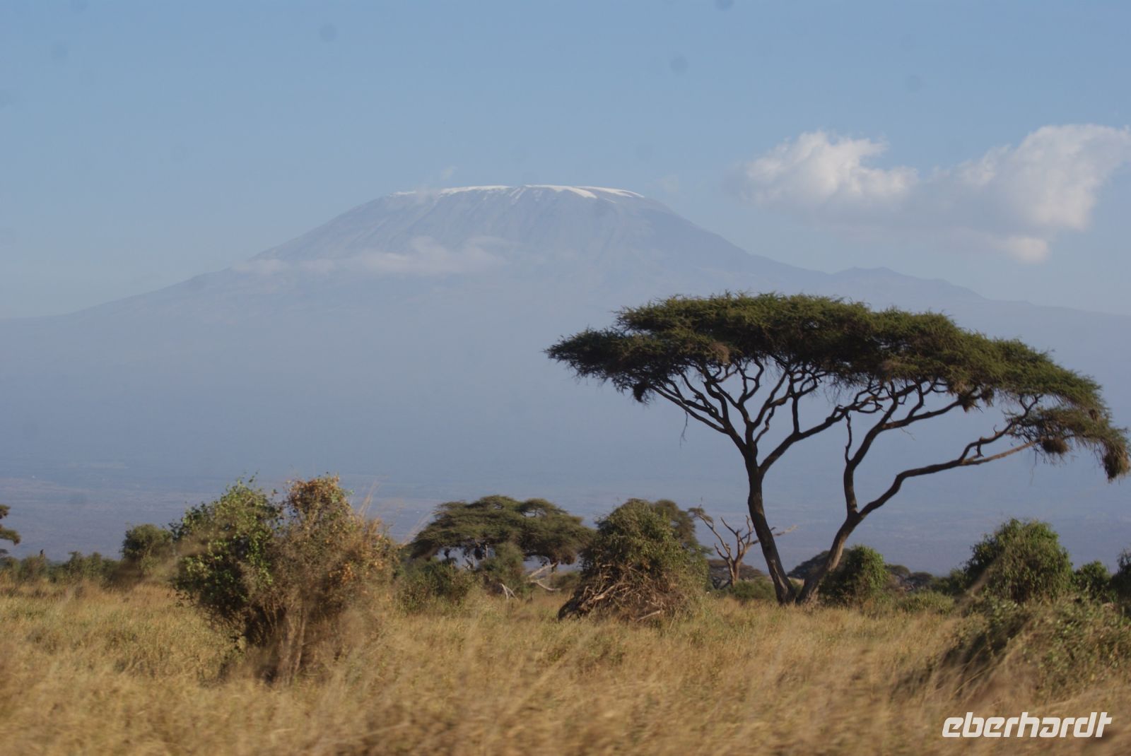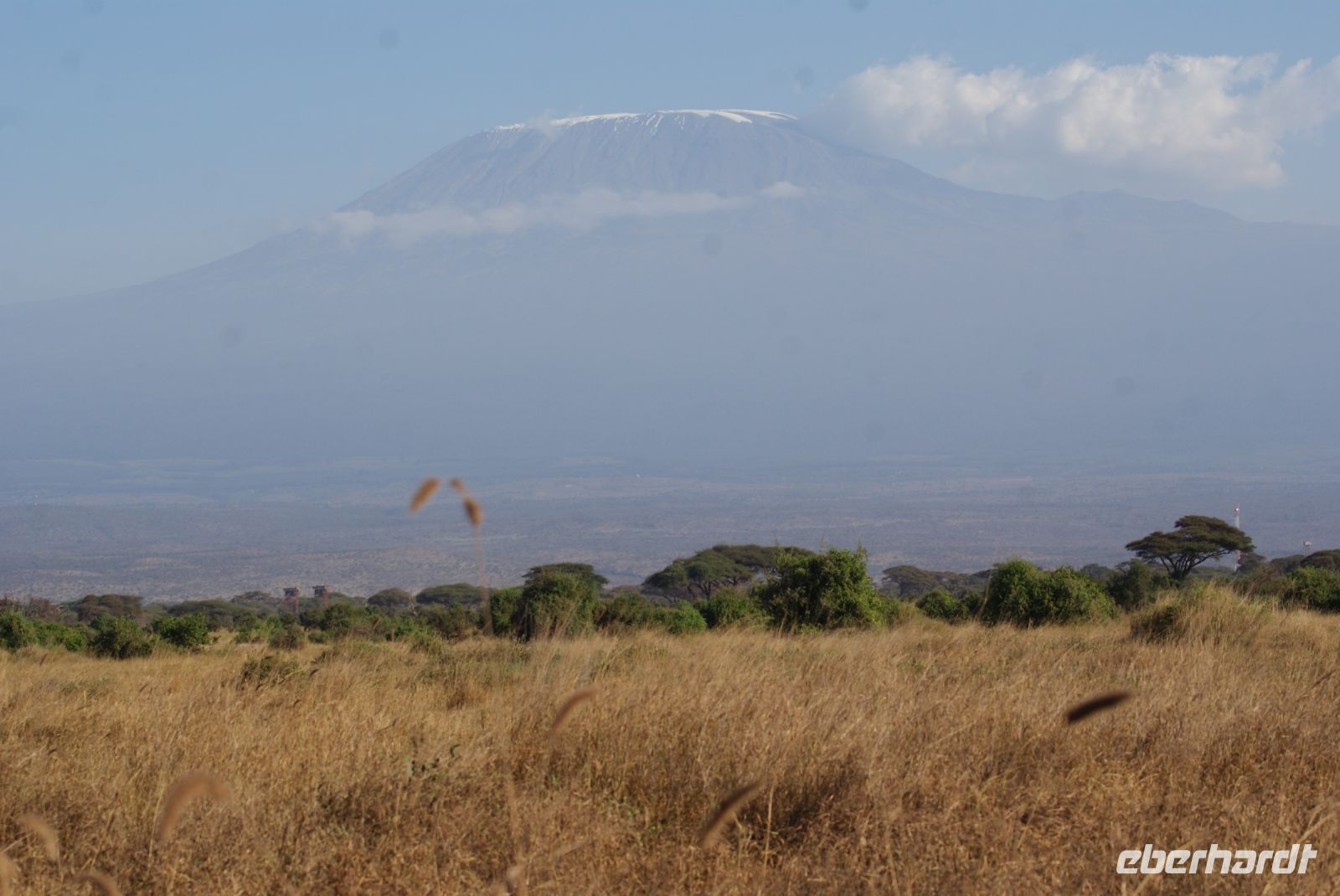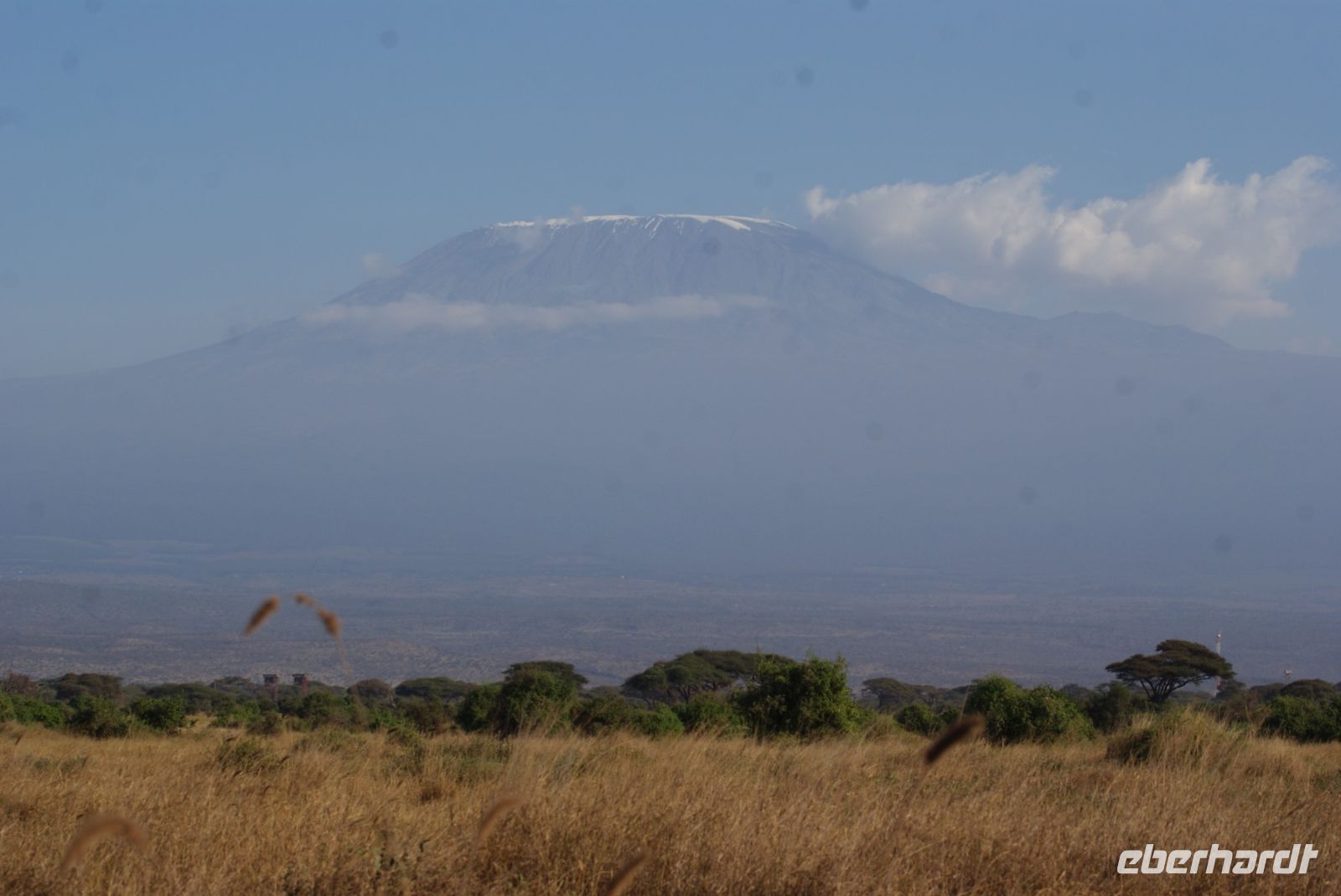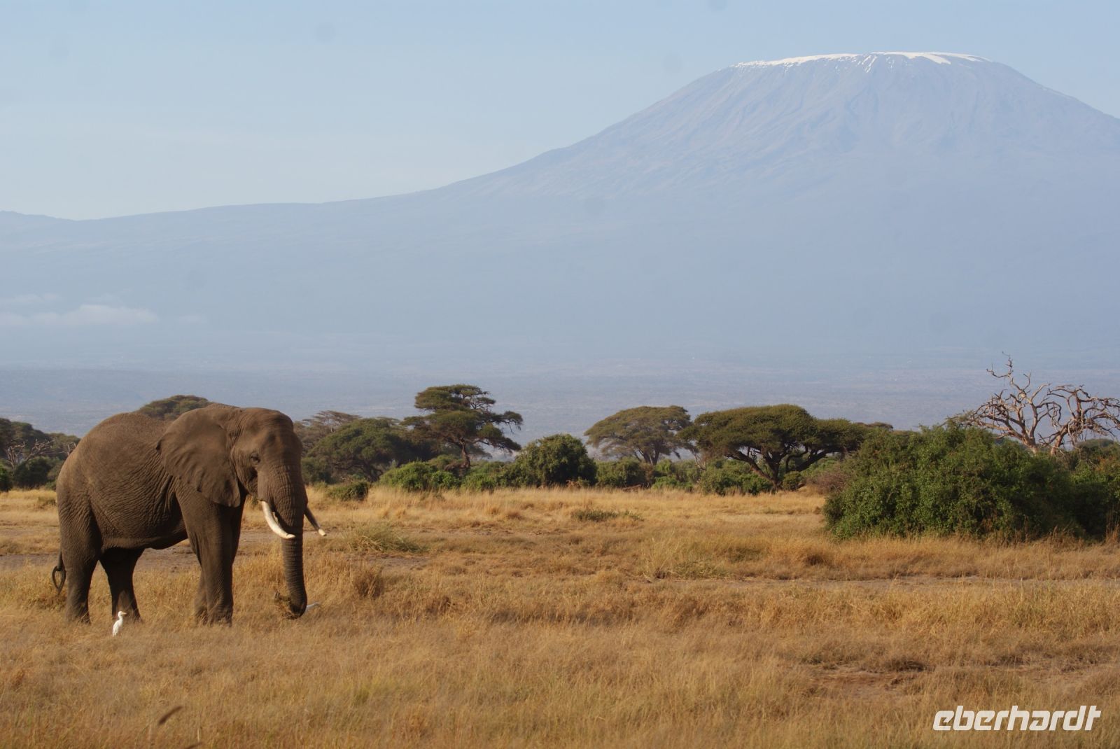 Aufgrund der aktuellen politischen Ereignisse in Kenia müssen wir den heutigen Tag etwas umstrukturieren. Da für Nairobi wieder Demonstrationen angekündigt und wir die Hauptstadt Kenias passieren müssen, entscheiden wir uns dafür, direkt am sehr frühen Morgen zum Amboseli Nationalpark aufzubrechen. Den Museumbesuch bei Karen Blixen verschieben wir auf unseren Abreisetag und verpassen somit nichts. Dank der tollen Ortskenntnisse unserer beiden Guides Caleb und Nick kommen wir gut durch den Transitverkehr auf der Hauptverkehrsader zwischen Mombasa und Nairobi und erreichen am Mittag den Rand des Amboseli Nationalparks. Schon von der Landstraße aus lässt sich ein Blick auf den schneebedeckten Gipfel des höchsten Berg Afrikas, den mit 5895 m hohen Kilimandscharo, erahnen. Heute sehen wir diesen bereits in voller Pracht und einen besseren Willkommensgruß hätte es nicht geben können. Im Kibo Safari Camp beziehen wir unsere Luxuszelte und speisen genüsslich vom reichhaltigen Buffet. Nachmittags geht es auf zu einer ersten Pirschfahrt in den Amboseli Nationalpark. Dieser macht seinem Namen alle Ehre und so sehen wir schon so manche Windhose und der Trockenheit geschuldet, eine Menge Staub. Unschlagbar jedoch die Kulisse, die sich uns bietet. Das Kilimandscharo-Massiv in vollem Umfang wolkenlos, davor Elefanten, eine unglaubliche Szenerie, die sich jeder Keniareisende wünscht. Zurück im Camp runden wir den Abend mit einem gemeinsamen Essen vom sehr reichhaltigen Buffet ab. Gefühlt das gesamte Restaurantpersonal macht sich zu einem Tänzchen auf und wir staunen erneut über die kenianische Fröhlichkeit und deren Hüftschwung. Am Lagerfeuer hat sich eine Gruppe Masai Krieger versammelt, die abschließend noch Tänze, Gesang und Sprünge für die Campgäste vorführen.