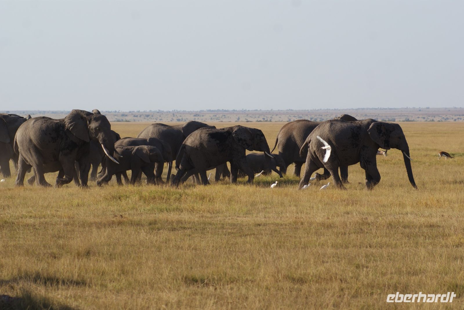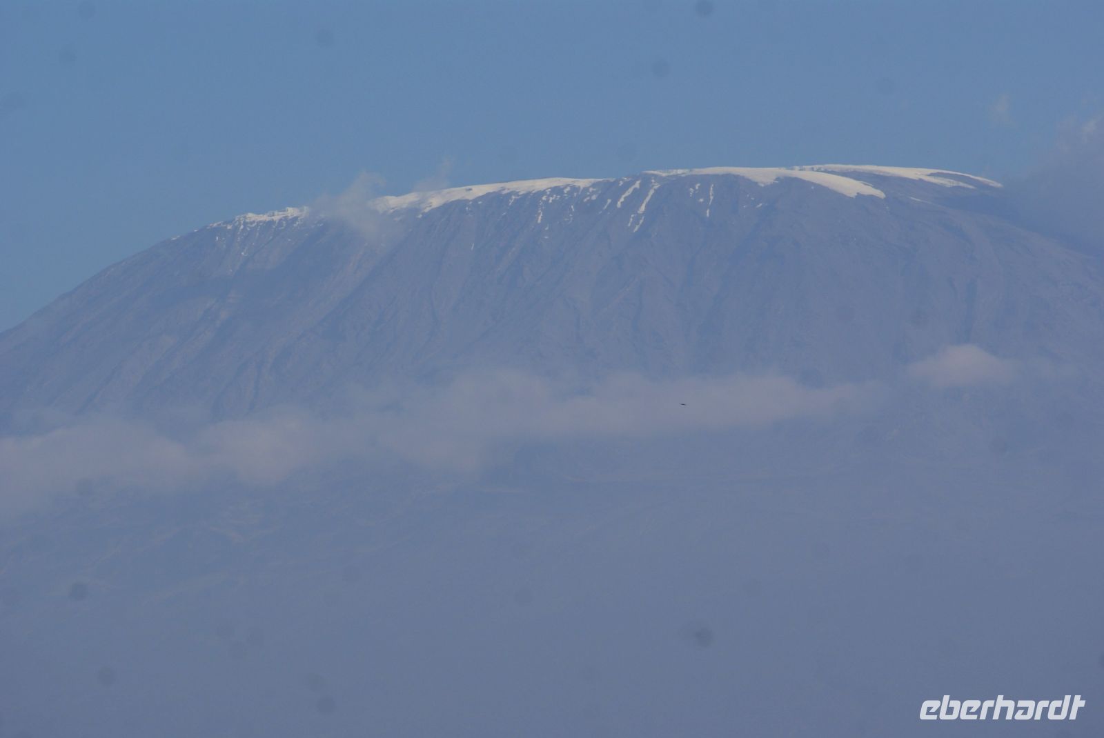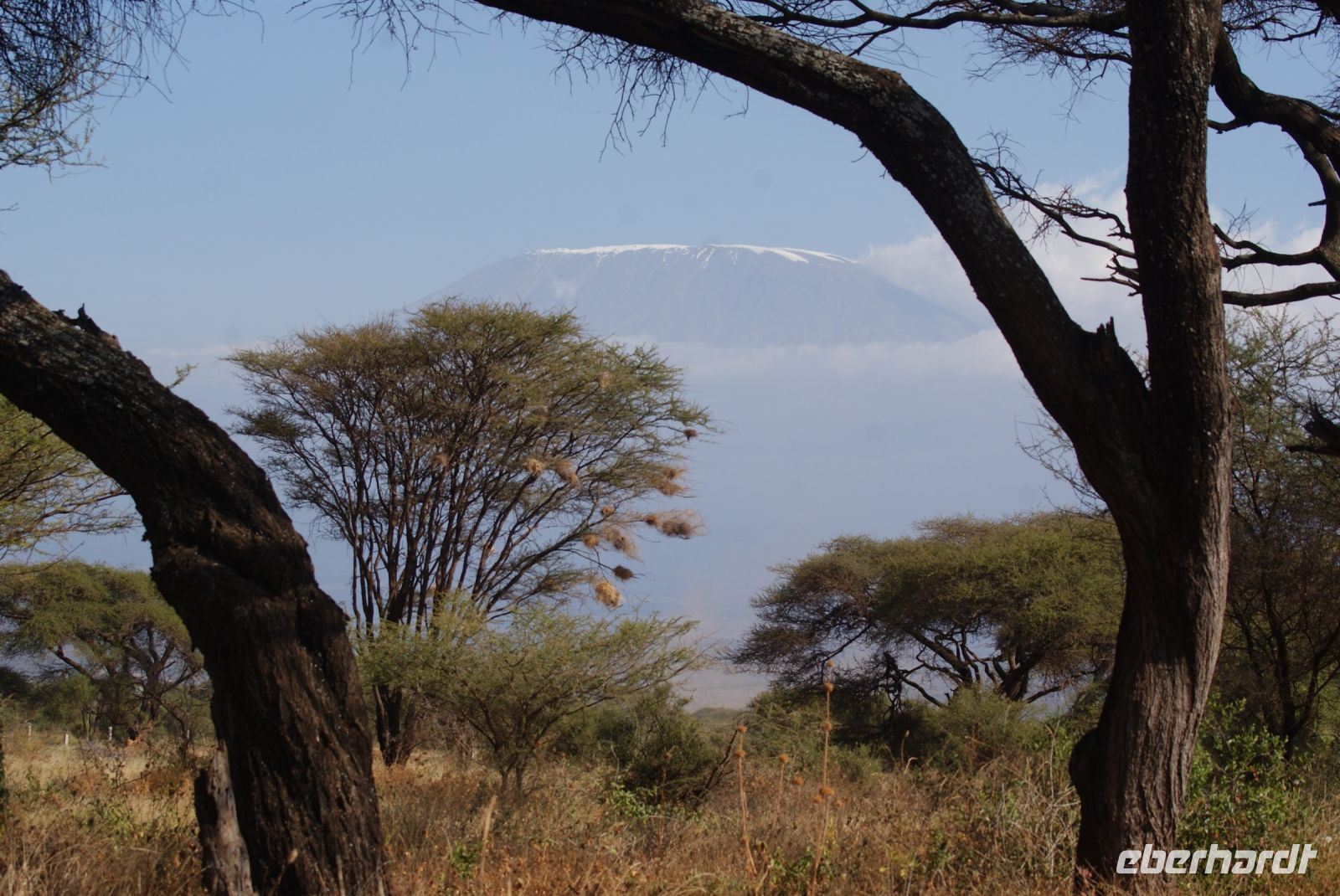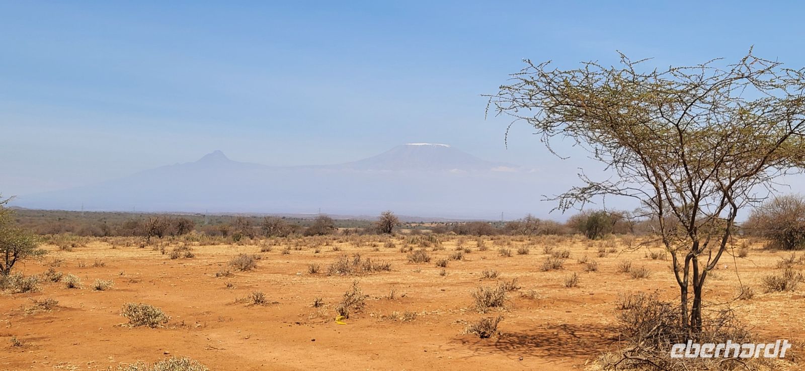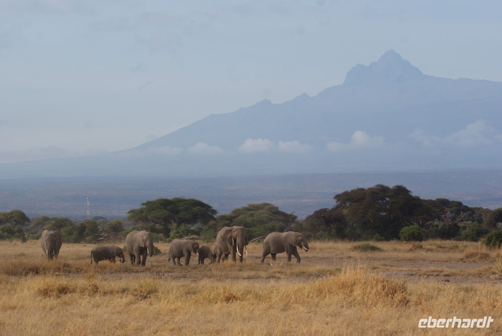 Aufgrund der aktuellen politischen Ereignisse in Kenia müssen wir den heutigen Tag etwas umstrukturieren. Da für Nairobi wieder Demonstrationen angekündigt und wir die Hauptstadt Kenias passieren müssen, entscheiden wir uns dafür, direkt am sehr frühen Morgen zum Amboseli Nationalpark aufzubrechen. Den Museumbesuch bei Karen Blixen verschieben wir auf unseren Abreisetag und verpassen somit nichts. Dank der tollen Ortskenntnisse unserer beiden Guides Caleb und Nick kommen wir gut durch den Transitverkehr auf der Hauptverkehrsader zwischen Mombasa und Nairobi und erreichen am Mittag den Rand des Amboseli Nationalparks. Schon von der Landstraße aus lässt sich ein Blick auf den schneebedeckten Gipfel des höchsten Berg Afrikas, den mit 5895 m hohen Kilimandscharo, erahnen. Heute sehen wir diesen bereits in voller Pracht und einen besseren Willkommensgruß hätte es nicht geben können. Im Kibo Safari Camp beziehen wir unsere Luxuszelte und speisen genüsslich vom reichhaltigen Buffet. Nachmittags geht es auf zu einer ersten Pirschfahrt in den Amboseli Nationalpark. Dieser macht seinem Namen alle Ehre und so sehen wir schon so manche Windhose und der Trockenheit geschuldet, eine Menge Staub. Unschlagbar jedoch die Kulisse, die sich uns bietet. Das Kilimandscharo-Massiv in vollem Umfang wolkenlos, davor Elefanten, eine unglaubliche Szenerie, die sich jeder Keniareisende wünscht. Zurück im Camp runden wir den Abend mit einem gemeinsamen Essen vom sehr reichhaltigen Buffet ab. Gefühlt das gesamte Restaurantpersonal macht sich zu einem Tänzchen auf und wir staunen erneut über die kenianische Fröhlichkeit und deren Hüftschwung. Am Lagerfeuer hat sich eine Gruppe Masai Krieger versammelt, die abschließend noch Tänze, Gesang und Sprünge für die Campgäste vorführen.