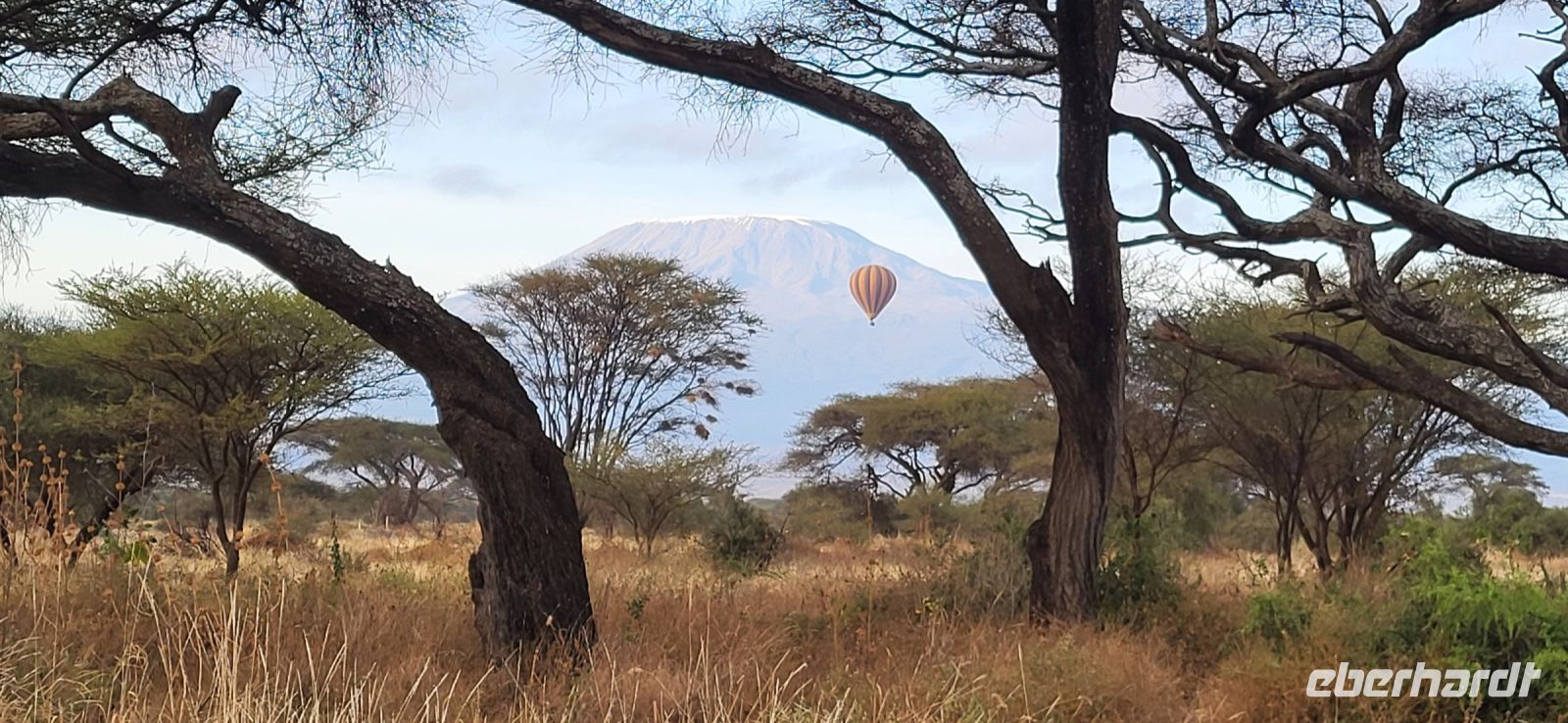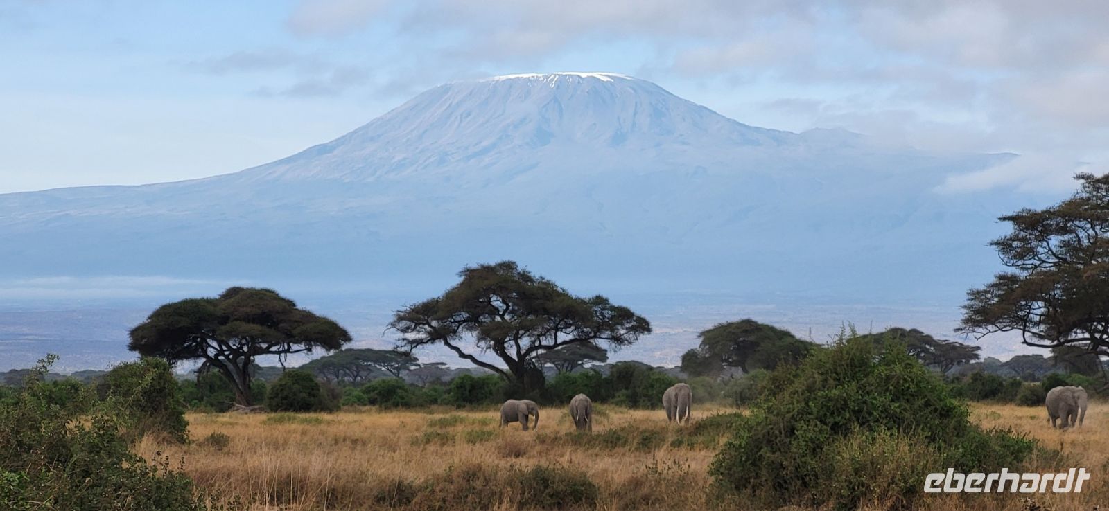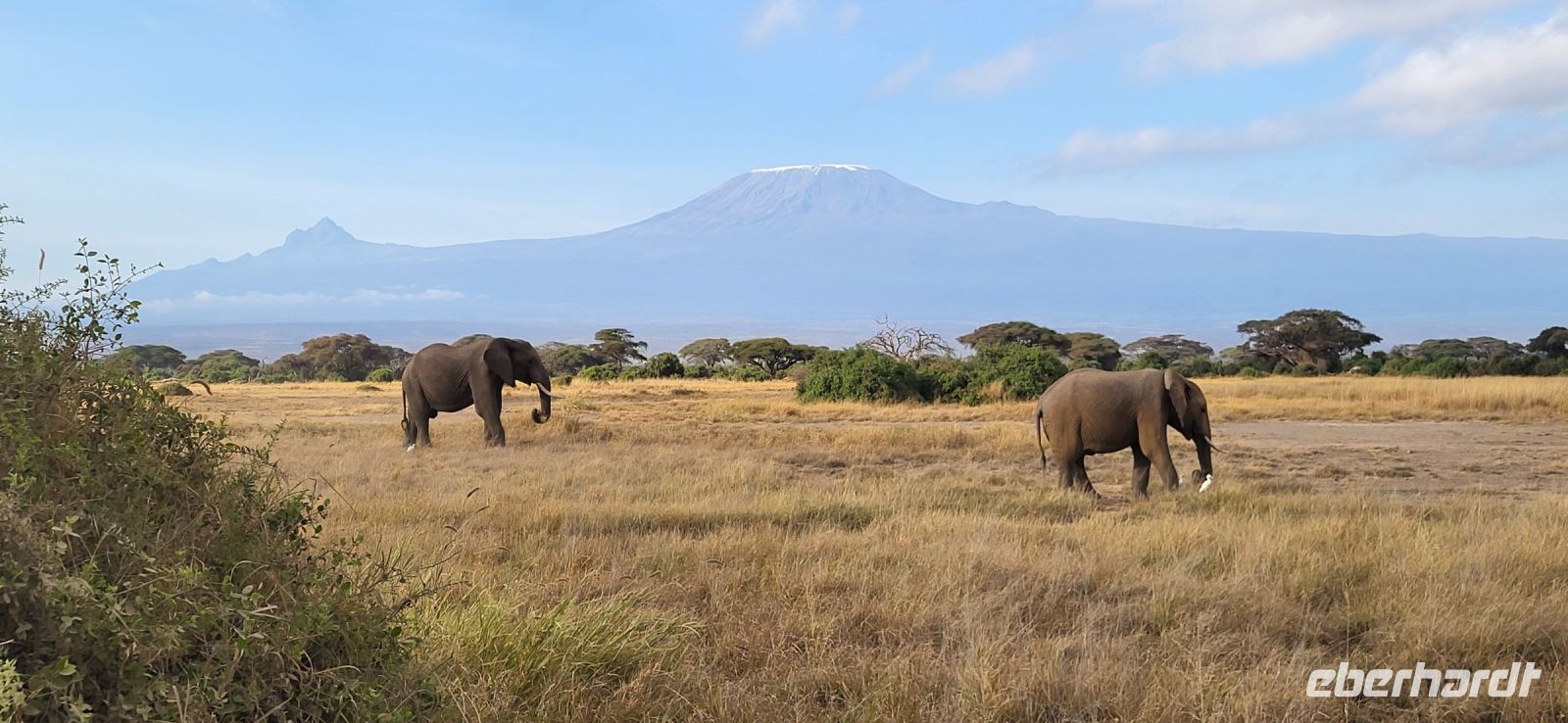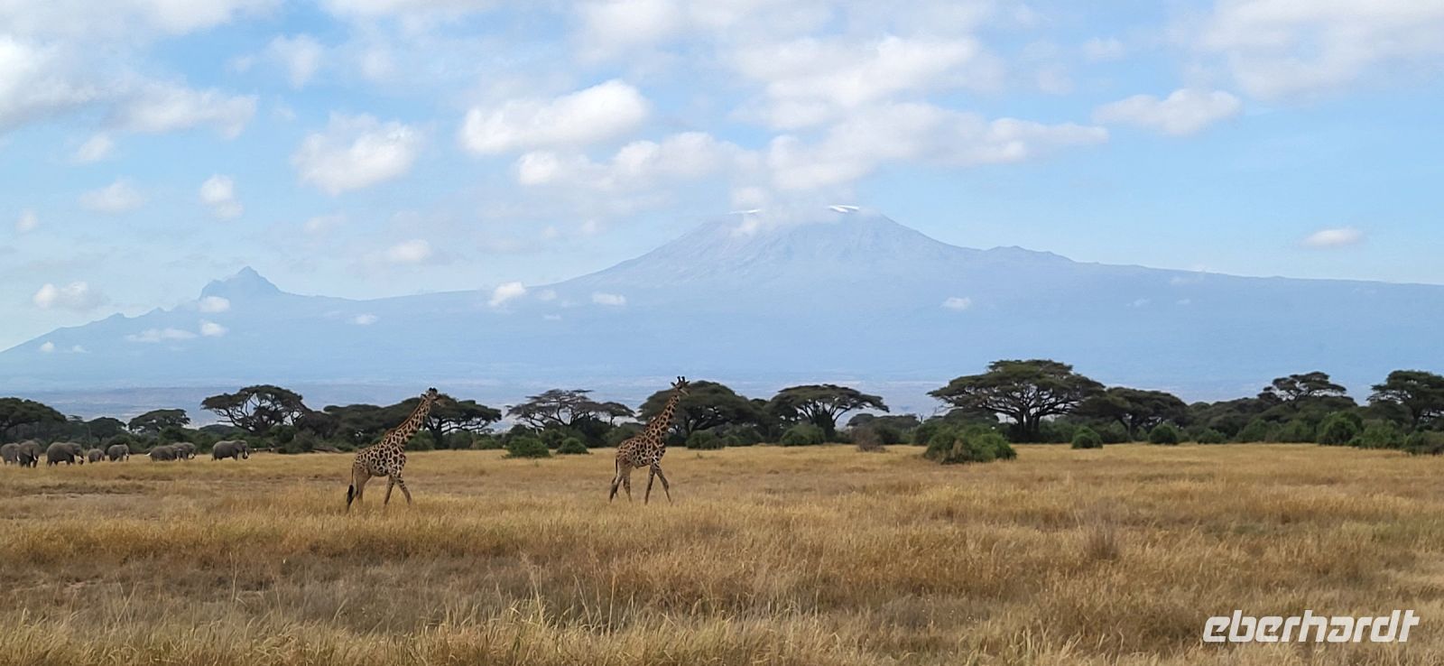 Bestens die Nacht in unseren luxuriösen Zelten verbracht, brechen wir nach einem reichhaltigen Frühstück in den 380 Km² großen Amboseli Nationalpark auf. Auf 1200 m Höhe gelegen, liegt dieser am Fuße des Kilimandscharo Massivs, welches zu Tansania gehört. Der Name Amboseli bedeutet so viel wie staubiger Platz oder Windhose. Von beidem sahen wir bereits gestern eine Menge und besonders die plötzlich auftauchenden Windhosen sind beeindruckend. Dieser kleine Park hält für uns am heutigen Morgen schon einige Überraschungen bereit. Zum einen ist der "Kili" wolkenfrei, die Strecke kaum staubig und so sehen wir etliche Elefantenherden, teils in unmittelbarer Nähe, die von unserer Anwesenheit keinerlei Notiz nehmen. Diese „posieren“ direkt vor dem Kilimandscharo und es bietet sich uns eine unwirkliche Fotokulisse. Das Gleiche gilt für einige Giraffen, die uns neugierig beäugen. Unsagbares Glück kann man es nur nennen, dass sich uns eine Gepardin mit ihren fünf Jungtieren zeigt, eine sicherlich für alle unvergessliche Erinnerung. Als diese noch versucht eine Thompson Gazelle zu jagen, stockt uns der Atem. Wir nähern uns dem Sumpfgebiet des Parks. Bereits seit einigen Jahren haben sich ungewöhnlicherweise Flamingos in den hier vorhandenen Gewässern niedergelassen und so haben wir eine schöne Gelegenheit, diese nah zu fotografieren. Da das hier vorhandene Wasser vom Kilimandscharo herunterfließt und der Boden salzhaltig ist, finden die schönen Vögel die entsprechende Nahrung sowie Krebstiere vor. Wir halten am Observation Hill, steigen über gut ausgebaute Treppen auf den Hügel hinauf, von dem aus wir einen imposanten Blick über die Weite des Amboseli Nationalparks haben und uns nun auf 1200 m Höhe befinden. Unter uns grasen Elefanten und es herrscht eine wunderschöne Morgenstimmung. Auf unserer Weiterfahrt entdecken wir ein Löwenrudel mit acht Tieren, die Ausschau nach den Gnus und Zebras in der Ferne halten. Bevor wir mittags in unser Camp zurückkehren, sehen wir nochmals die Gepardenfamilie, die im Schatten eines Baumes ruht. So viele Erlebnisse machen auch uns hungrig, so stärken wir uns am reichhaltigen Buffet, bevor es dann nachmittags erneut in den Park auf Pirschfahrt geht. Mit Blick auf den Kibo, die höchste Erhebung des Kilimandscharo Massivs, mit 5895 m Höhe beginnen wir den Nachmittag. Unsere Guides Nick und Caleb führen uns mit viel Erfahrung zu den schönsten Plätzen des Amboseli Nationalparks, sodass wir herrliche Erinnerungen mit nach Hause nehmen können. So manche wunderbare Tiersichtung am Nachmittag, mit erneut Elefantenherden sowie Giraffen, bestaunen einen Gnukampf, erfahren viel Wissenswertes über die hiesigen Antilopen und viele weitere Tiere der Savanne. Zurück im Camp genießen wir den verbleibenden Abend am Rande des Amboseli Nationalparks mit einem schmackhaften Abendessen und lauschen den Klängen der Natur.