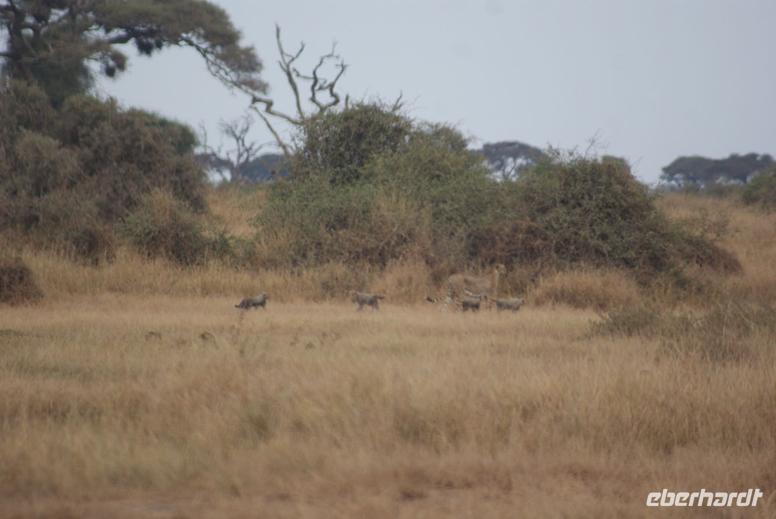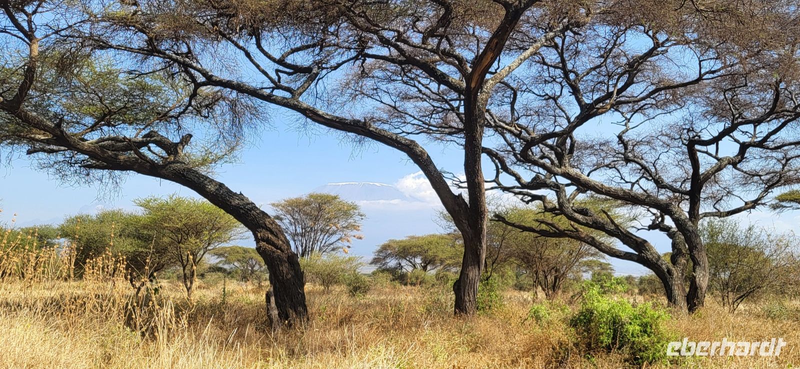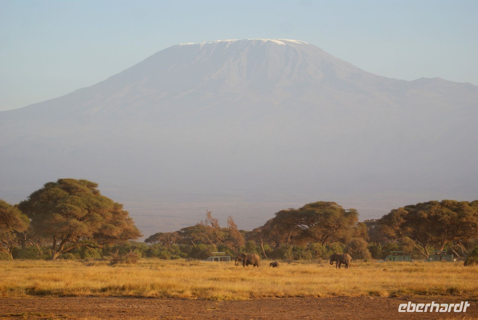 Bestens die Nacht in unseren luxuriösen Zelten verbracht, brechen wir nach einem reichhaltigen Frühstück in den 380 Km² großen Amboseli Nationalpark auf. Auf 1200 m Höhe gelegen, liegt dieser am Fuße des Kilimandscharo Massivs, welches zu Tansania gehört. Der Name Amboseli bedeutet so viel wie staubiger Platz oder Windhose. Von beidem sahen wir bereits gestern eine Menge und besonders die plötzlich auftauchenden Windhosen sind beeindruckend. Dieser kleine Park hält für uns am heutigen Morgen schon einige Überraschungen bereit. Zum einen ist der "Kili" wolkenfrei, die Strecke kaum staubig und so sehen wir etliche Elefantenherden, teils in unmittelbarer Nähe, die von unserer Anwesenheit keinerlei Notiz nehmen. Diese „posieren“ direkt vor dem Kilimandscharo und es bietet sich uns eine unwirkliche Fotokulisse. Das Gleiche gilt für einige Giraffen, die uns neugierig beäugen. Unsagbares Glück kann man es nur nennen, dass sich uns eine Gepardin mit ihren fünf Jungtieren zeigt, eine sicherlich für alle unvergessliche Erinnerung. Als diese noch versucht eine Thompson Gazelle zu jagen, stockt uns der Atem. Wir nähern uns dem Sumpfgebiet des Parks. Bereits seit einigen Jahren haben sich ungewöhnlicherweise Flamingos in den hier vorhandenen Gewässern niedergelassen und so haben wir eine schöne Gelegenheit, diese nah zu fotografieren. Da das hier vorhandene Wasser vom Kilimandscharo herunterfließt und der Boden salzhaltig ist, finden die schönen Vögel die entsprechende Nahrung sowie Krebstiere vor. Wir halten am Observation Hill, steigen über gut ausgebaute Treppen auf den Hügel hinauf, von dem aus wir einen imposanten Blick über die Weite des Amboseli Nationalparks haben und uns nun auf 1200 m Höhe befinden. Unter uns grasen Elefanten und es herrscht eine wunderschöne Morgenstimmung. Auf unserer Weiterfahrt entdecken wir ein Löwenrudel mit acht Tieren, die Ausschau nach den Gnus und Zebras in der Ferne halten. Bevor wir mittags in unser Camp zurückkehren, sehen wir nochmals die Gepardenfamilie, die im Schatten eines Baumes ruht. So viele Erlebnisse machen auch uns hungrig, so stärken wir uns am reichhaltigen Buffet, bevor es dann nachmittags erneut in den Park auf Pirschfahrt geht. Mit Blick auf den Kibo, die höchste Erhebung des Kilimandscharo Massivs, mit 5895 m Höhe beginnen wir den Nachmittag. Unsere Guides Nick und Caleb führen uns mit viel Erfahrung zu den schönsten Plätzen des Amboseli Nationalparks, sodass wir herrliche Erinnerungen mit nach Hause nehmen können. So manche wunderbare Tiersichtung am Nachmittag, mit erneut Elefantenherden sowie Giraffen, bestaunen einen Gnukampf, erfahren viel Wissenswertes über die hiesigen Antilopen und viele weitere Tiere der Savanne. Zurück im Camp genießen wir den verbleibenden Abend am Rande des Amboseli Nationalparks mit einem schmackhaften Abendessen und lauschen den Klängen der Natur.