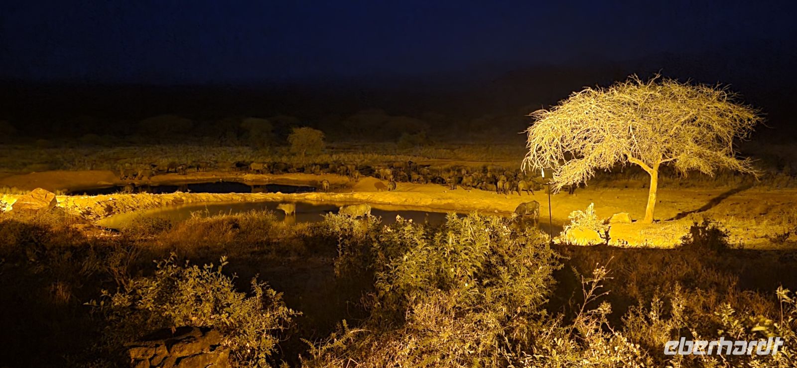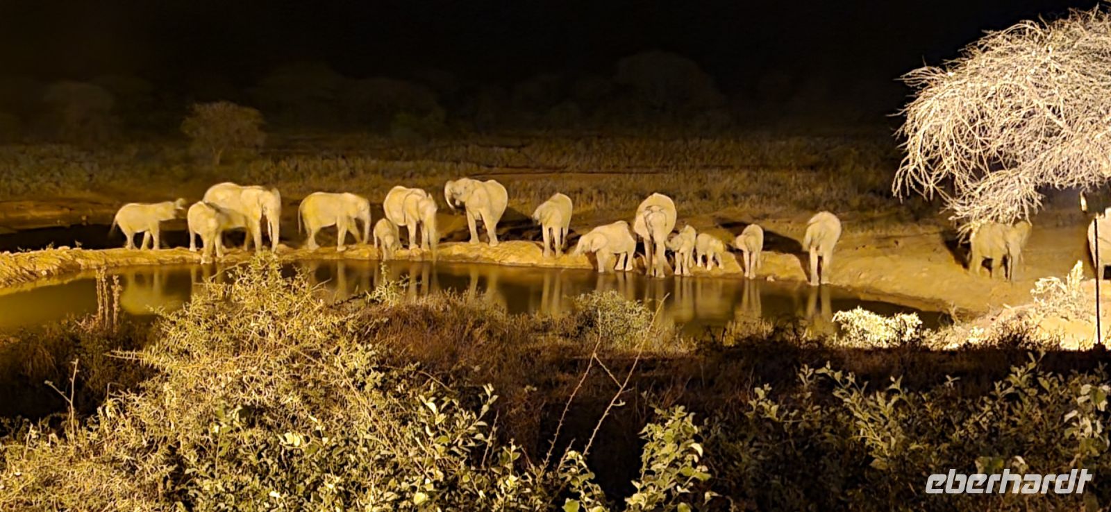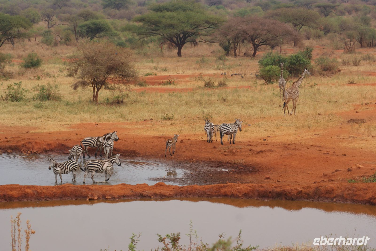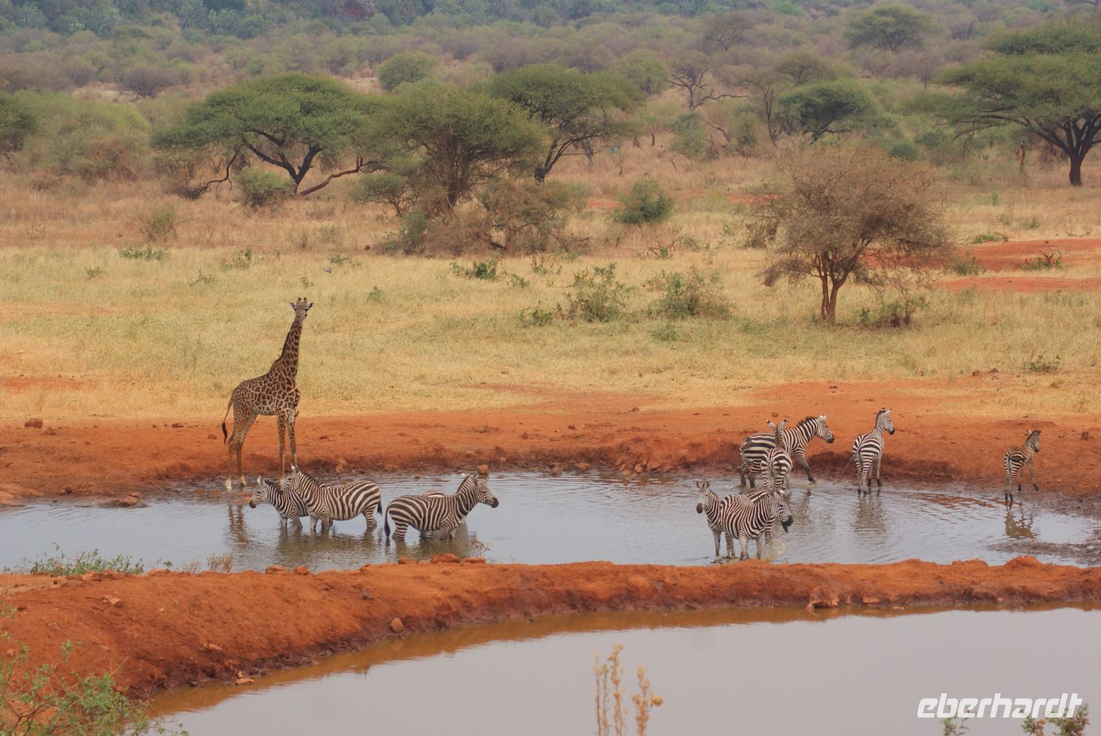 Wir verlassen den Amboseli Nationalpark und ziehen weiter durch eine wunderschöne kenianische Landschaft, die nun zusehens hügeliger wird. Unsere heutige recht kurze Fahrt führt uns in den, in der Nähe gelegenen 9000 Km² großen Tsavo West Nationalpark, der neben dem Tsavo Ost Nationalpark der 2.älteste Nationalpark Kenias ist und 1948 gegründet wurde. Die sogenannten Chyulu Hills und Buschlandschaft ziehen auf, rote Erde um uns herum. Nach Durchfahrt des Chyulu Tors und somit Einfahrt in den Nationalpark sehen wir nach kurzer Zeit bereits die ersten Tiere, die durch die rote Erde ihre prägnante Farbe erhalten. Giraffen stehen unmittelbar am Wegesrand und bald passieren wir das Shentani Lavafeld, welches aufgrund eines Vulkanausbruchs vor ca. 200 Jahren entstanden ist. Ein imposantes Landschaftsbild, diesen breiten, erstarrten Lavastrom zu sehen, durch den sich unsere rote Straße schlängelt. Mittags erreichen wir die Kilaguni Serena Safari Lodge und können unseren Augen nicht trauen. Der Blick vom Restaurant und den Zimmern in die kenianische Savanne ist einfach unbeschreiblich. Jenseits von Afrika grüßt in vollen Zügen- eine Wahnsinnskulisse, die uns die Natur hier bietet und direkt zu unseren Füßen liegt. Zwei Wasserlöcher laden die Tiere zum Trinken ein und schon bald zeigen sich Zebras und die ersten Gnus. Das alles direkt vor unseren Terrassen. Ein Traum, der nun wahr geworden ist. Nach einer Mittagsrast mit besagter wunderschönen Kulisse geht es auf zur Nachmittagssafari durch den Busch von Tsavo West. Hier genießen wir die Nachmittagsstimmung, die herrliche Landschaft und sehen noch so manche Tiere. Elandantilopen, Giraffen, Kudus entdecken wir an unserer Strecke sowie sehr viele Vögel. Am Abend genießen wir ein schmackhaftes Abendessen mit Blick auf die inzwischen beleuchteten Wasserlöcher und wir beobachten das nun nächtliche Treiben direkt vor uns, bei dem bereits ein Elefant im warmen Schweinwerferlicht des Wasserlochs vor sich hin döst und später so manche Hyäne zum Trinken vorbeischaut.