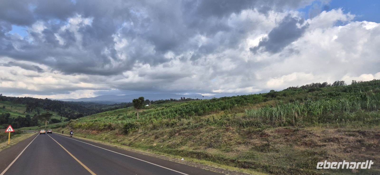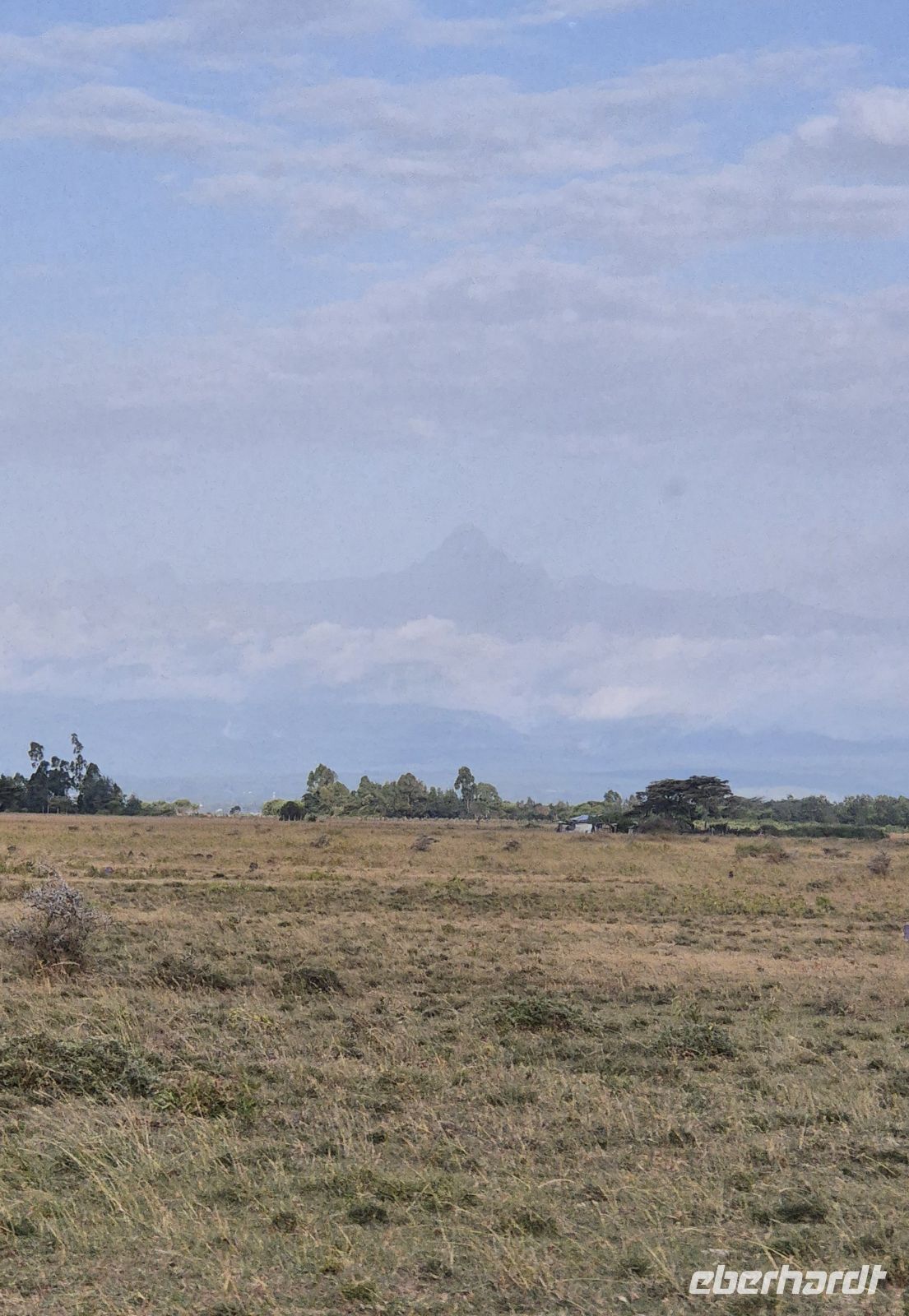 Plötzlich taucht er vor uns auf: der majestätische Mount Kenya mit 5199 m Höhe der höchste Berg Kenias. Ein erhabener Anblick – sein Gipfel schimmert im Dunst, beinahe unwirklich schön.