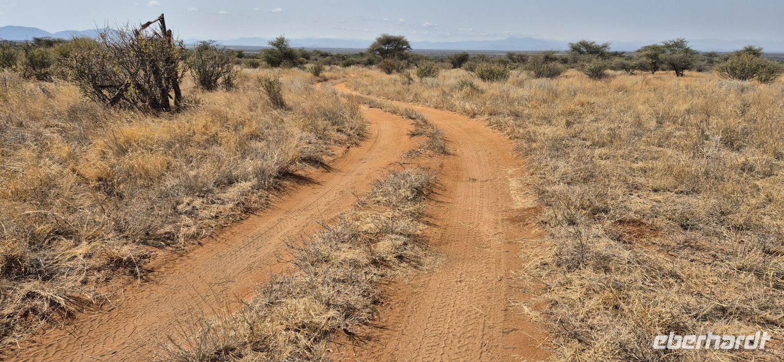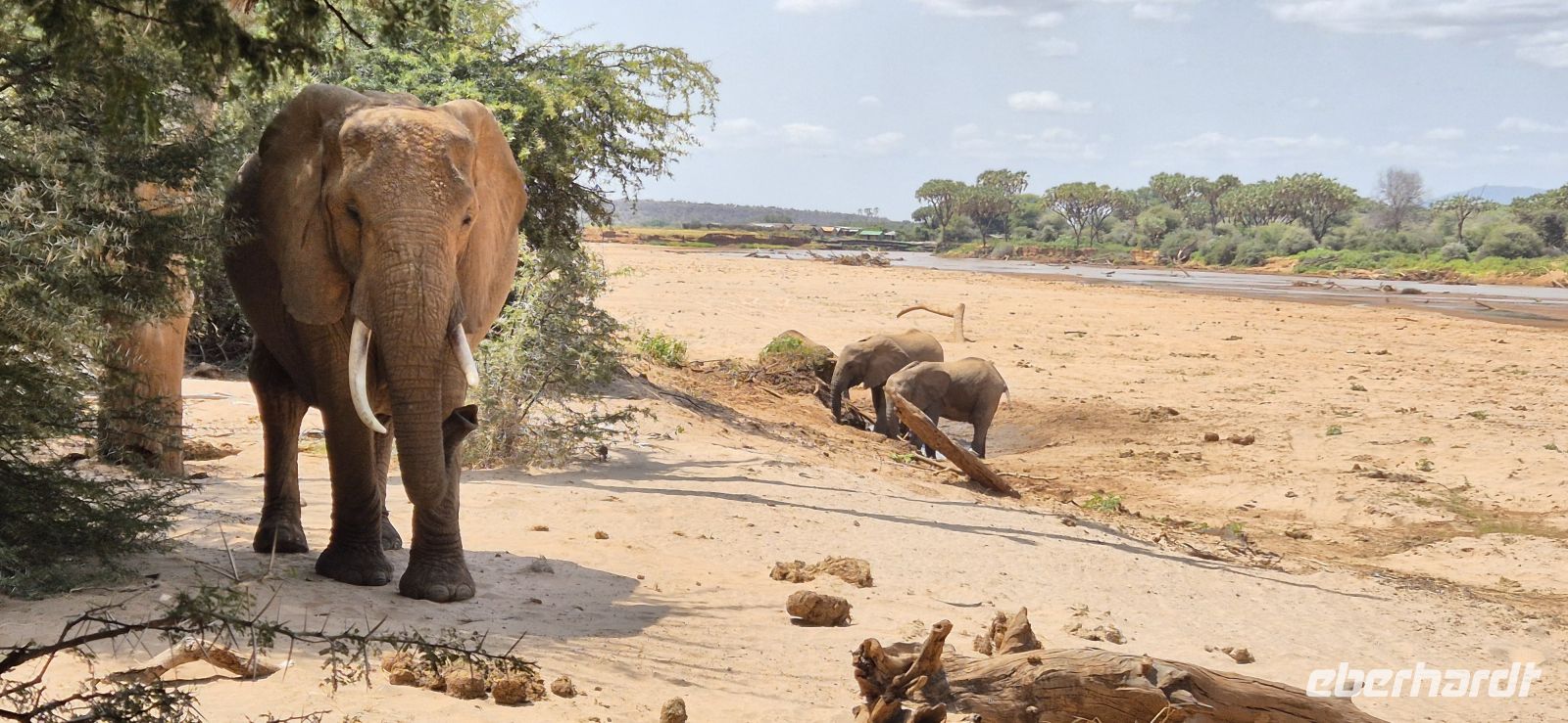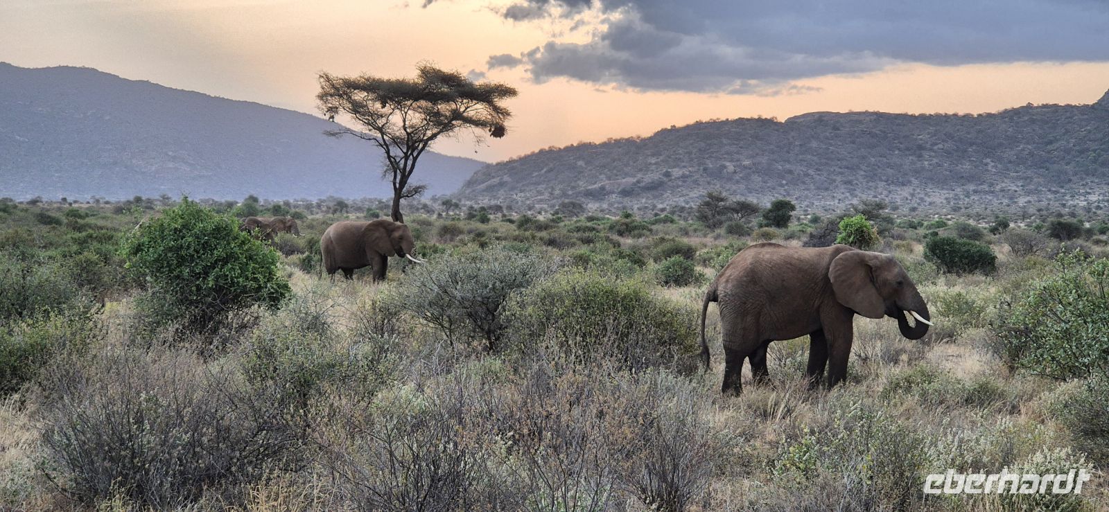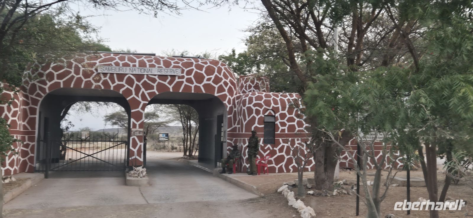 Doch es zieht uns weiter in den Norden. Unsere Lunchpakete vom Hotel sind praktisch und werden unterwegs mit Blick auf die vorbeiziehende Landschaft verzehrt. Die Route führt durch abwechslungsreiche Gegenden: saftig grüne Hochlandflächen weichen allmählich trockenerem, buschartigem Terrain. In Nanyuki legen wir einen willkommenen Stopp bei Barney’s Bar & Restaurant ein. Eine charmante Oase mit gepflegtem Garten, mit leckerem Kaffee – genau das Richtige für eine kleine Pause. Am späten Nachmittag erreichen wir das Archers Post Gate, das Tor zum Samburu National Reserve. Nick hat bereits alles organisiert, sodass wir auch nach 18 Uhr noch in den Park einfahren dürfen – normalerweise ist das nicht mehr möglich. Die Einfahrt fühlt sich direkt wie eine kleine Safari an: Grand Gazellen huschen durch das Buschwerk, ein Grevyzebra zeigt sich kurz, und dann – wie bestellt – kreuzt eine stattliche Elefantenherde unseren Weg. Ein bewegender Moment!