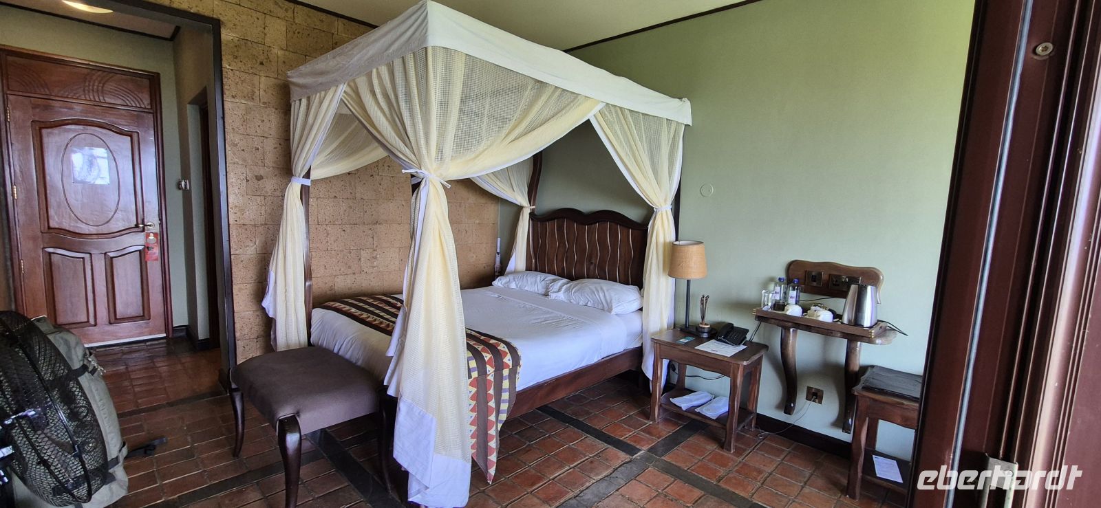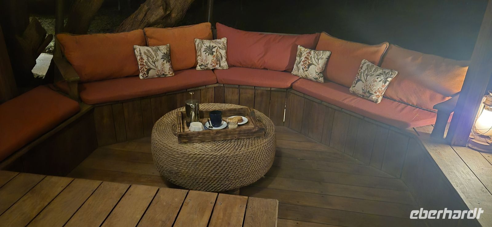 Essen? Fast zweitrangig heute Abend. Wir sitzen wie gebannt – voller Staunen, voller Ehrfurcht. Erst als wir schon die letzten Gäste im Restaurant sind, schaffen wir es, uns langsam loszureißen. Zeit, unsere Zimmer zu beziehen. Auch hier: ein kleines Stück Zuhause. Wir wohnen wieder im Nachbargebäude – ruhig, charmant, mit bester Aussicht. Elefanten trompeten in der Ferne – als wollten sie uns eine gute Nacht wünschen. Ankunft im Safariparadies. Wir freuen uns so sehr-und wie.